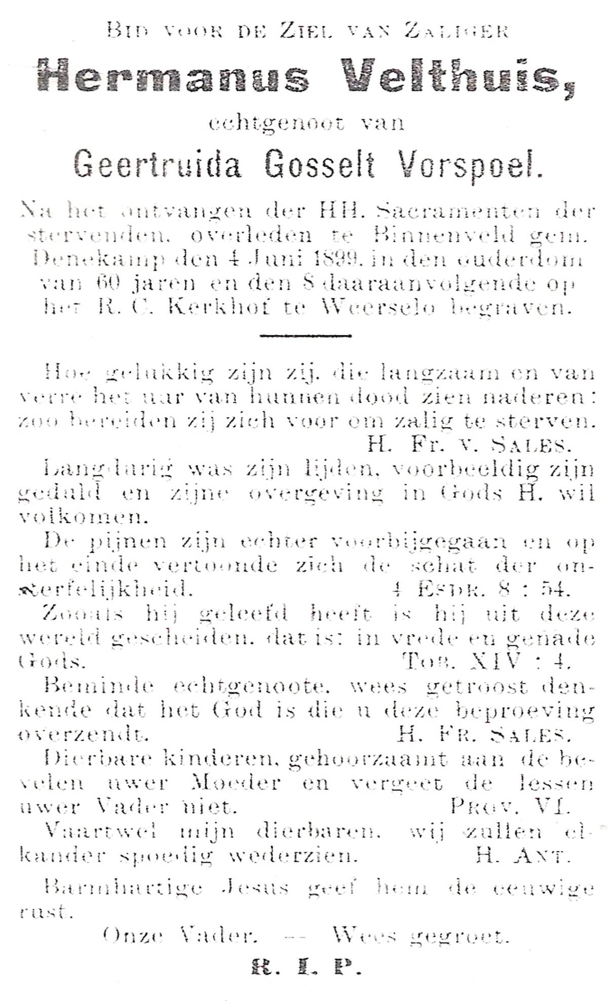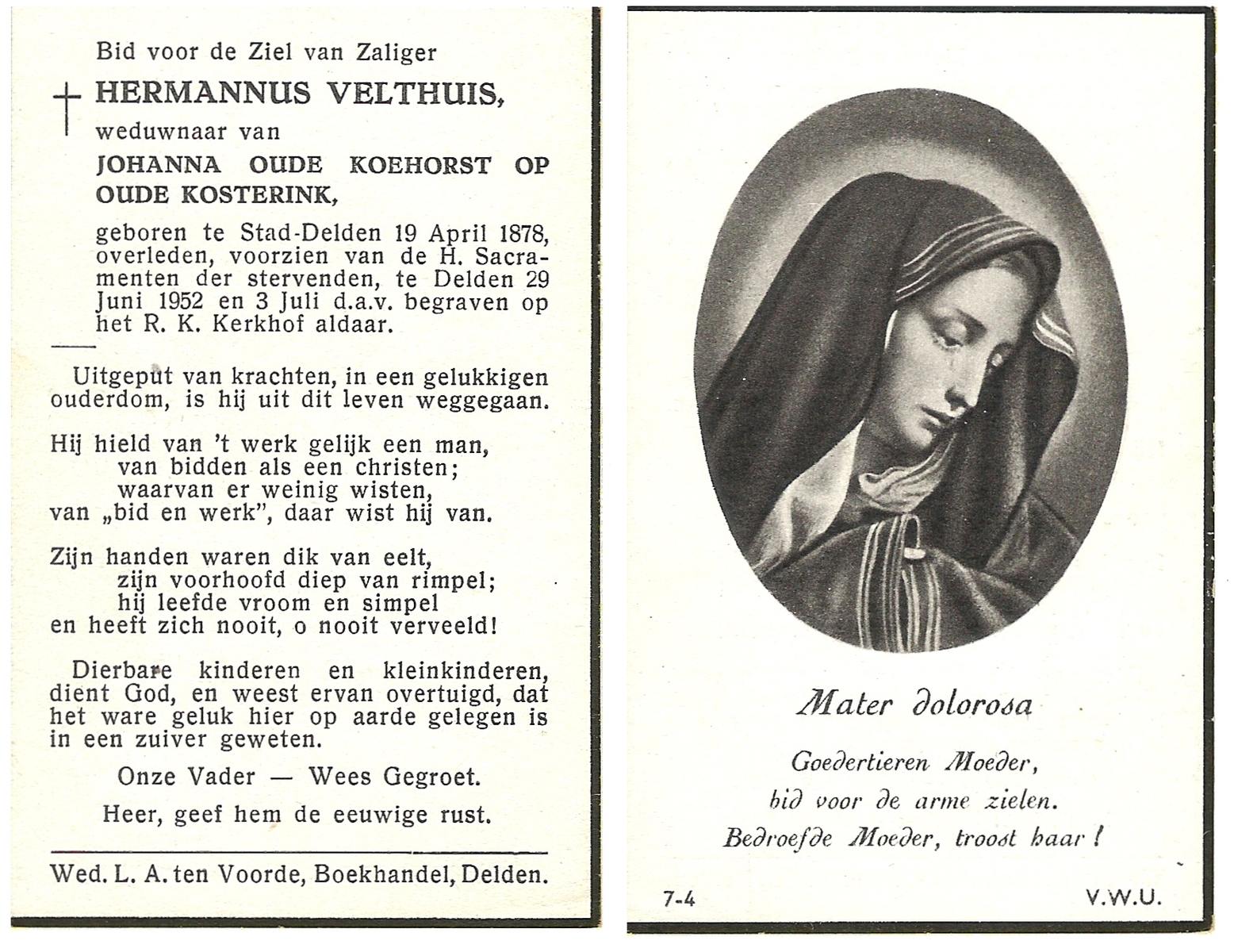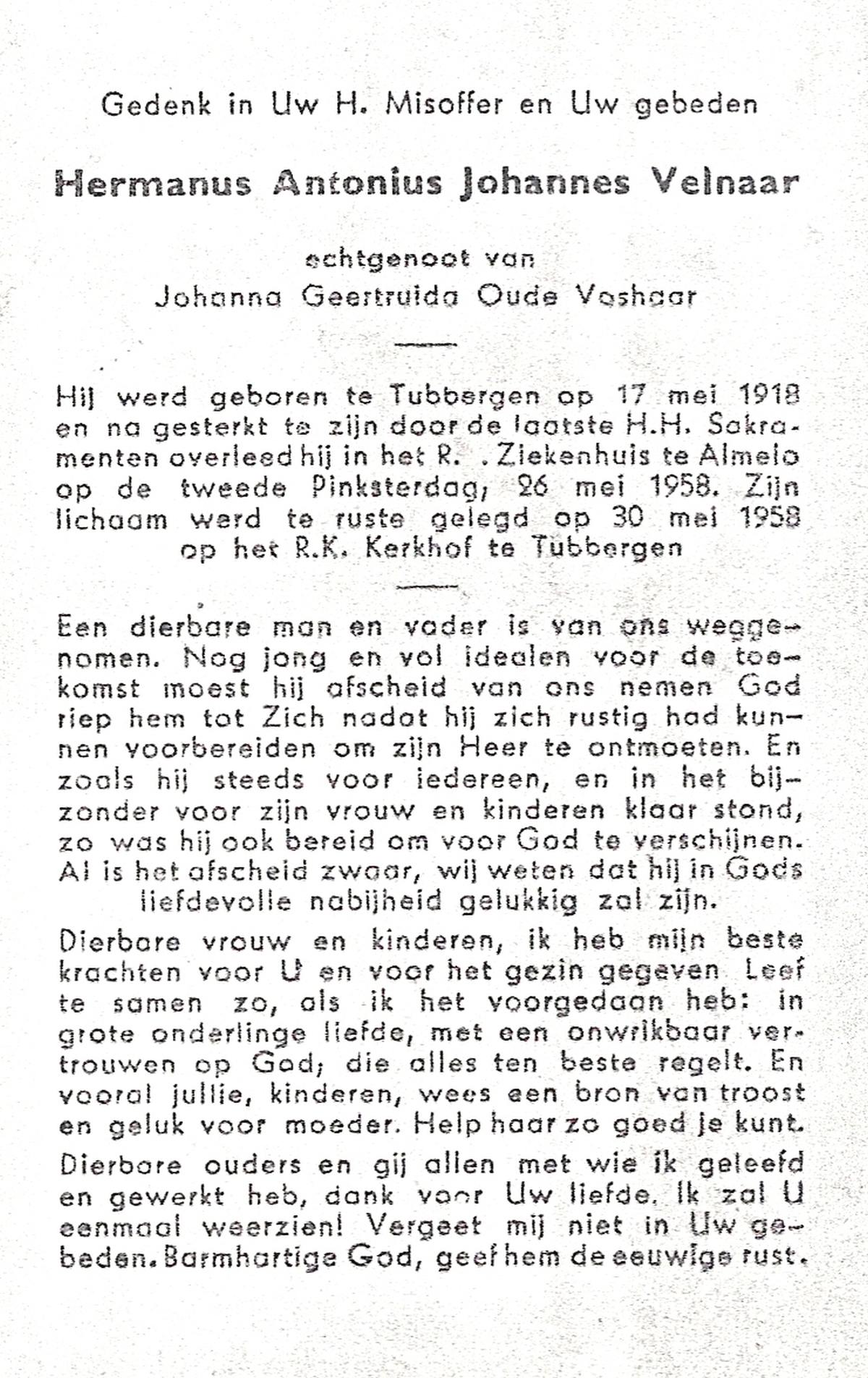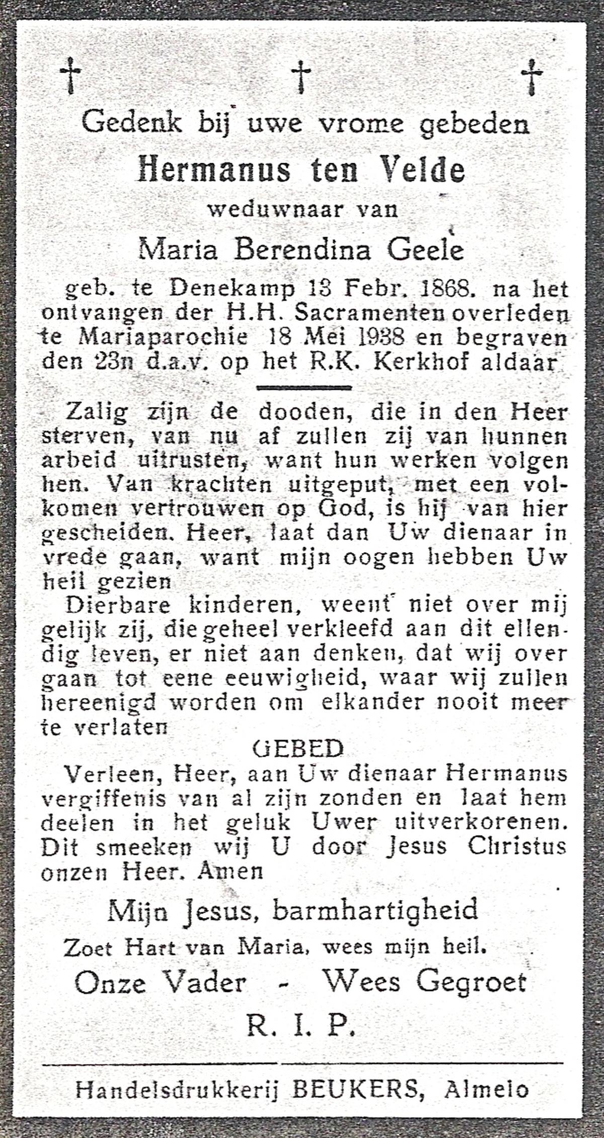 VELDE, ten, Hermanus, geboren op 13-02-1868 te Denekamp, overleden op 18-5-1938 te Mariaparochie op 70-jarige leeftijd, begraven op 23-5-1938 te Mariaparochie.