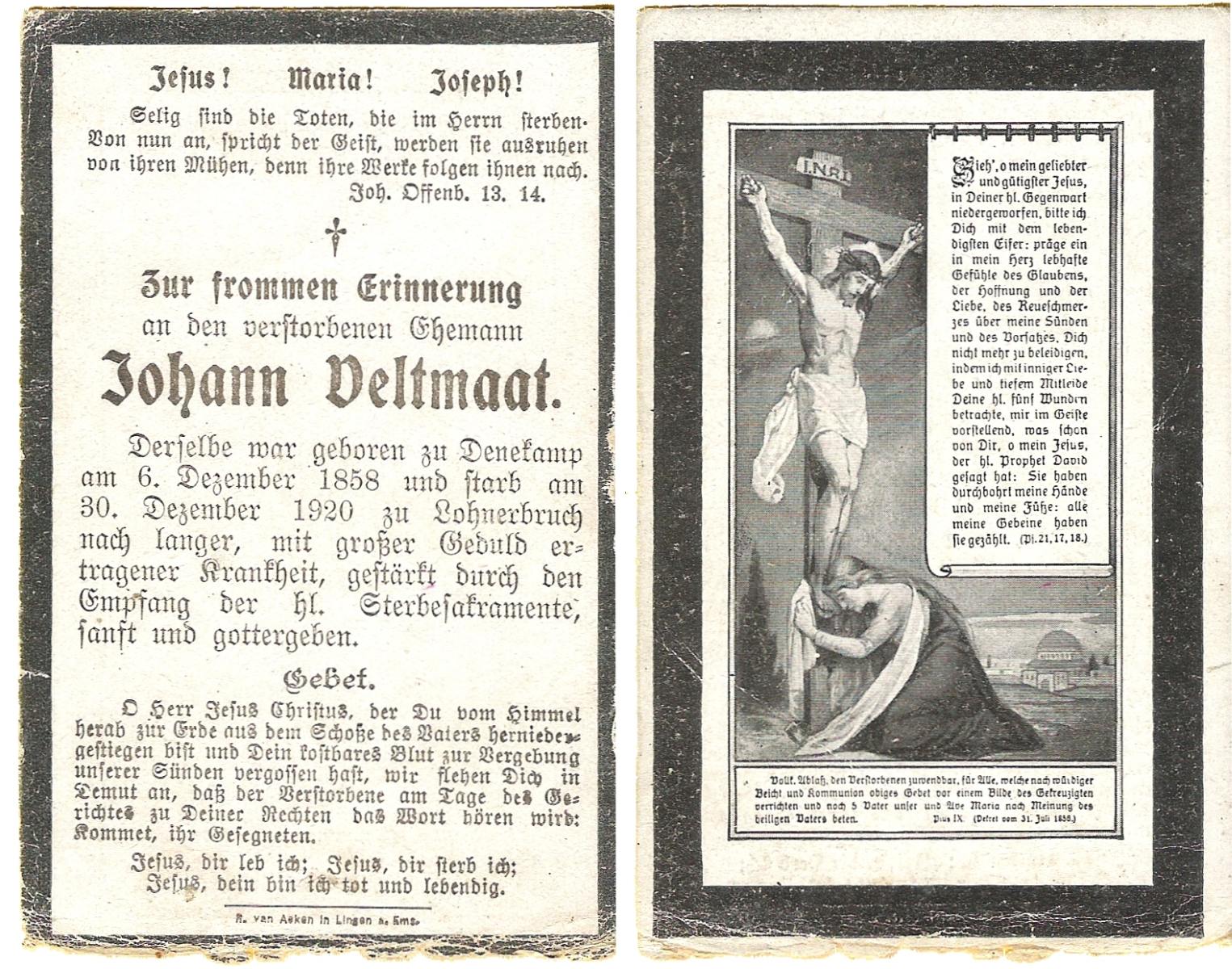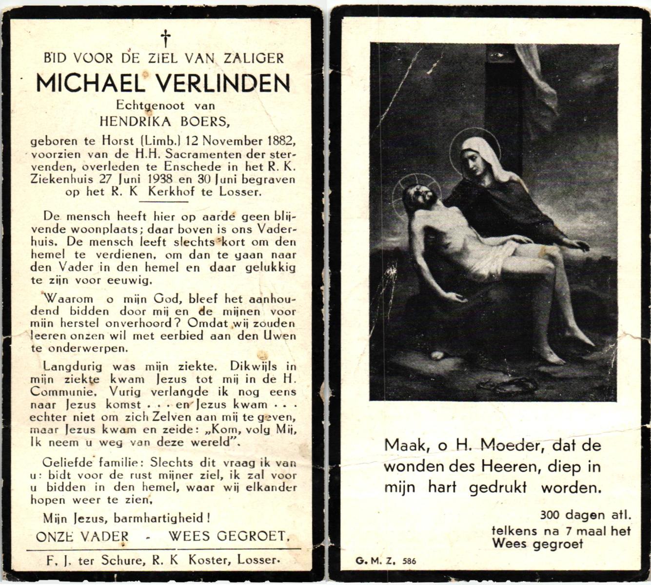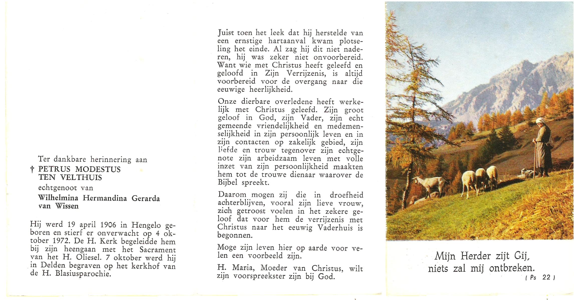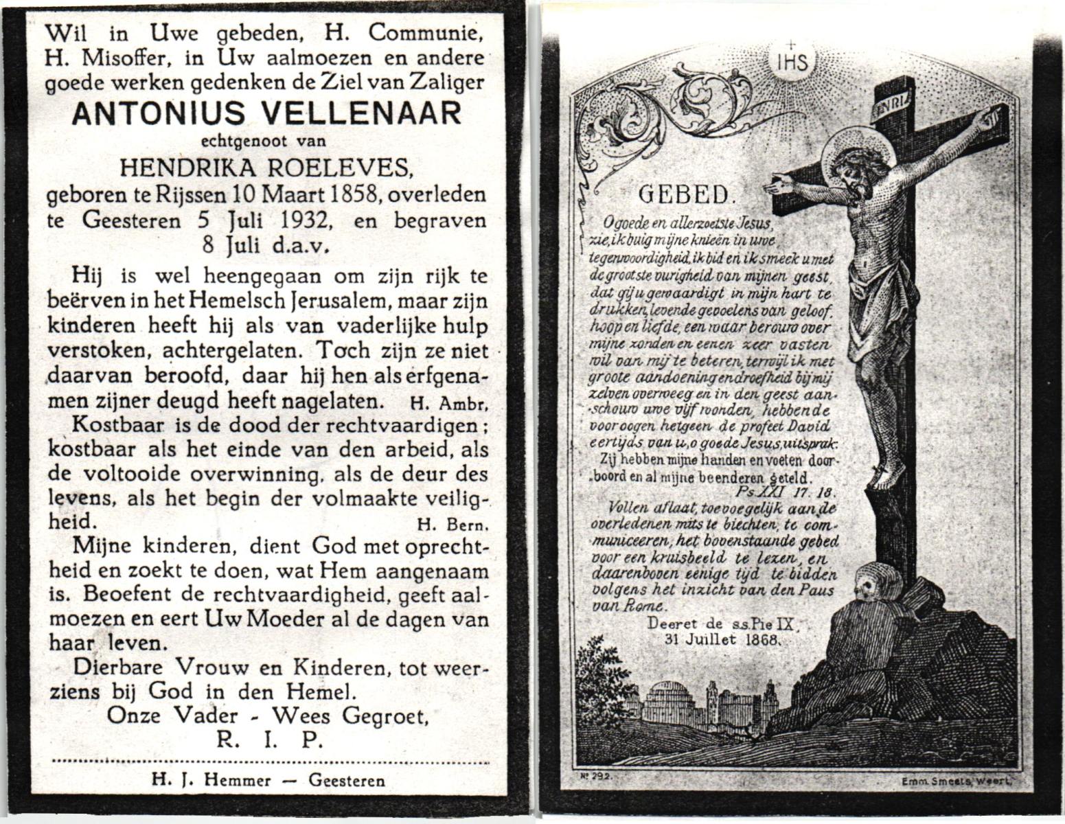 VELDE, ten, Hermanus, geboren op 13-02-1868 te Denekamp, overleden op 18-5-1938 te Mariaparochie op 70-jarige leeftijd, begraven op 23-5-1938 te Mariaparochie.