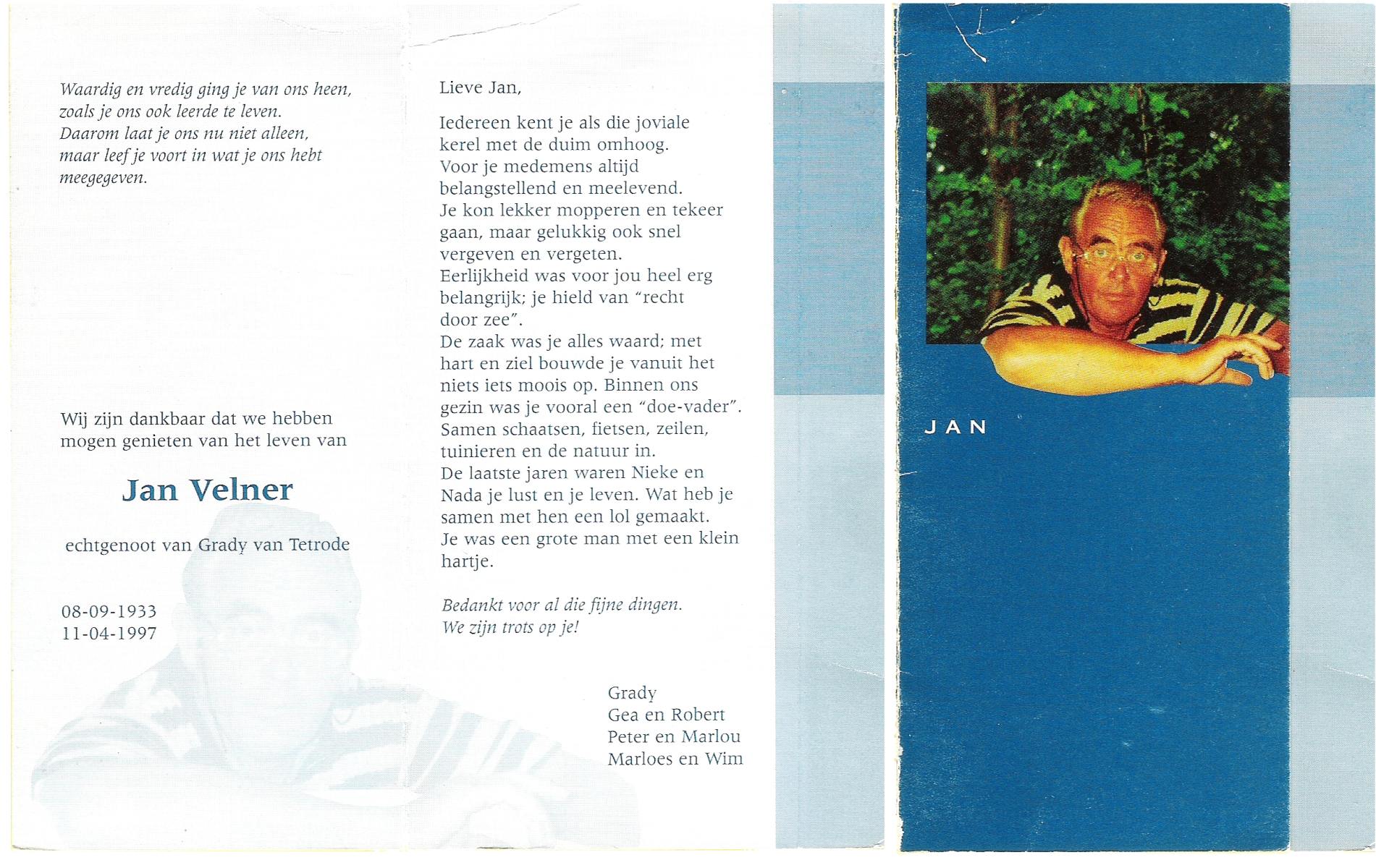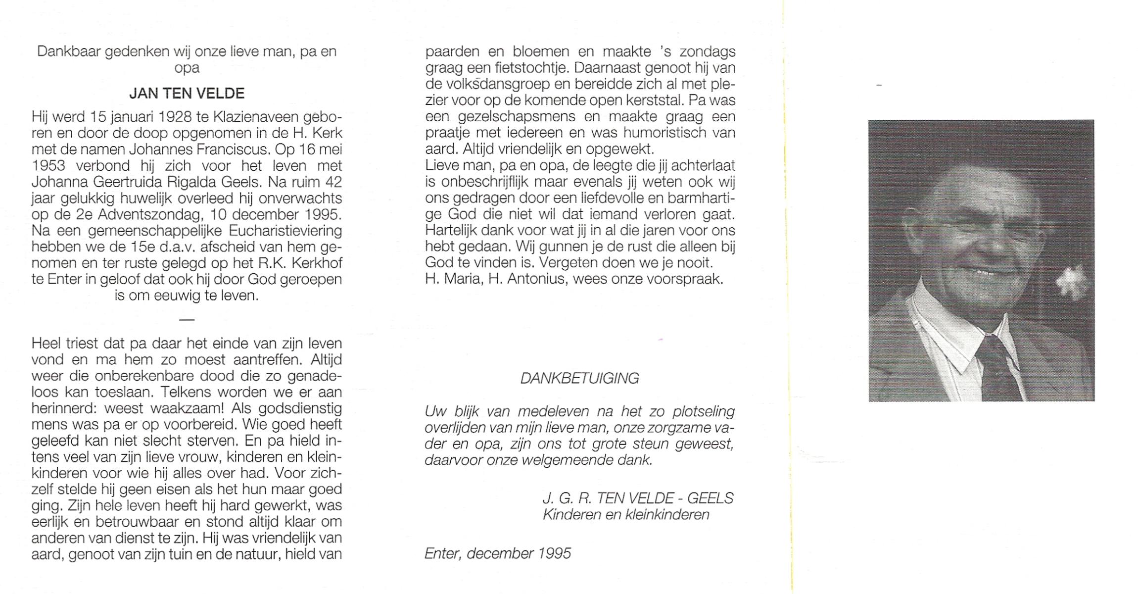 VELDE, ten, Jan (Johannes Franciscus), geboren op 15-1-1928 te Klazienaveen, overleden op 10-12-1995 op 67-jarige leeftijd, begraven op 15-12-1995 te Wierden, Enter.