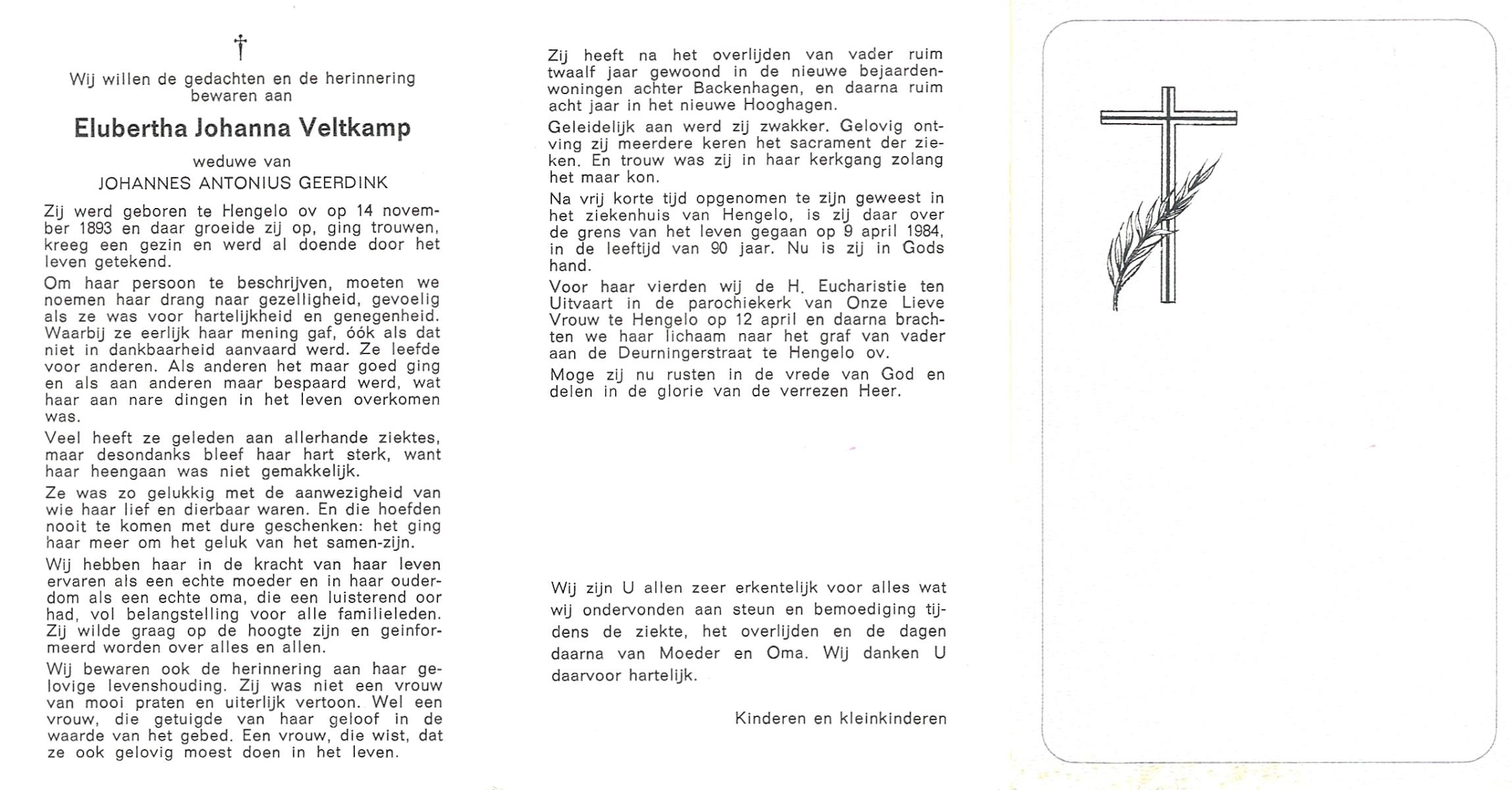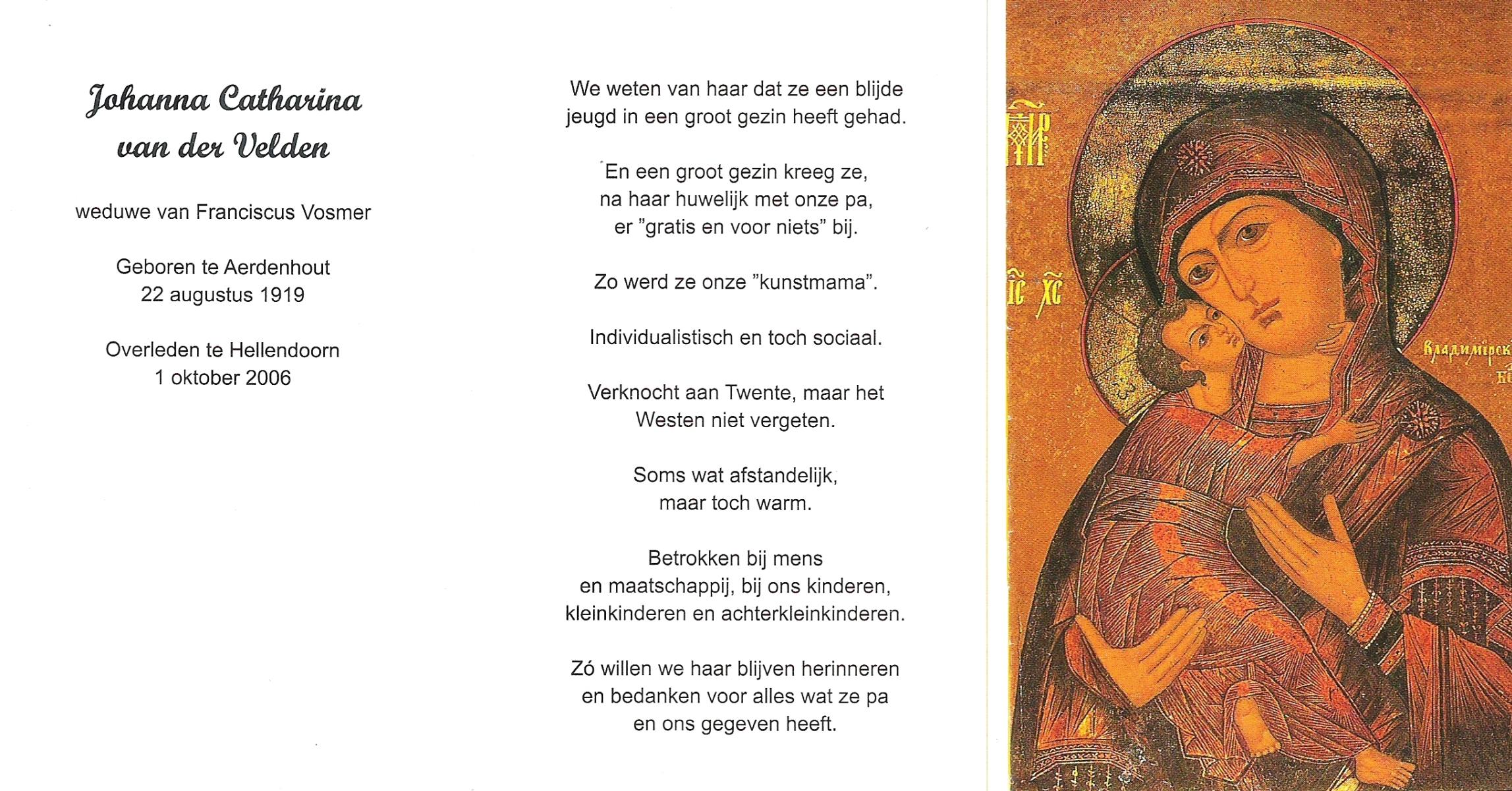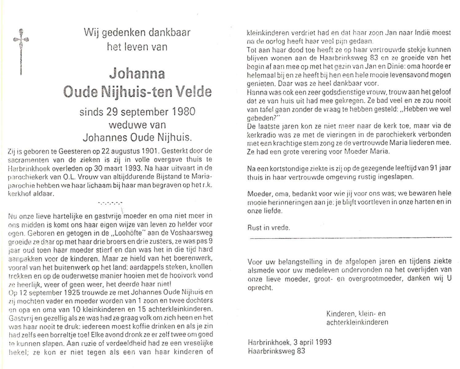 VELDE, ten, Johanna, geboren op 22-8-1901 te Geesteren (Ov.), overleden op 30-3-1993 te Harbrinkhoek op 91-jarige leeftijd, begraven te Mariaparochie.