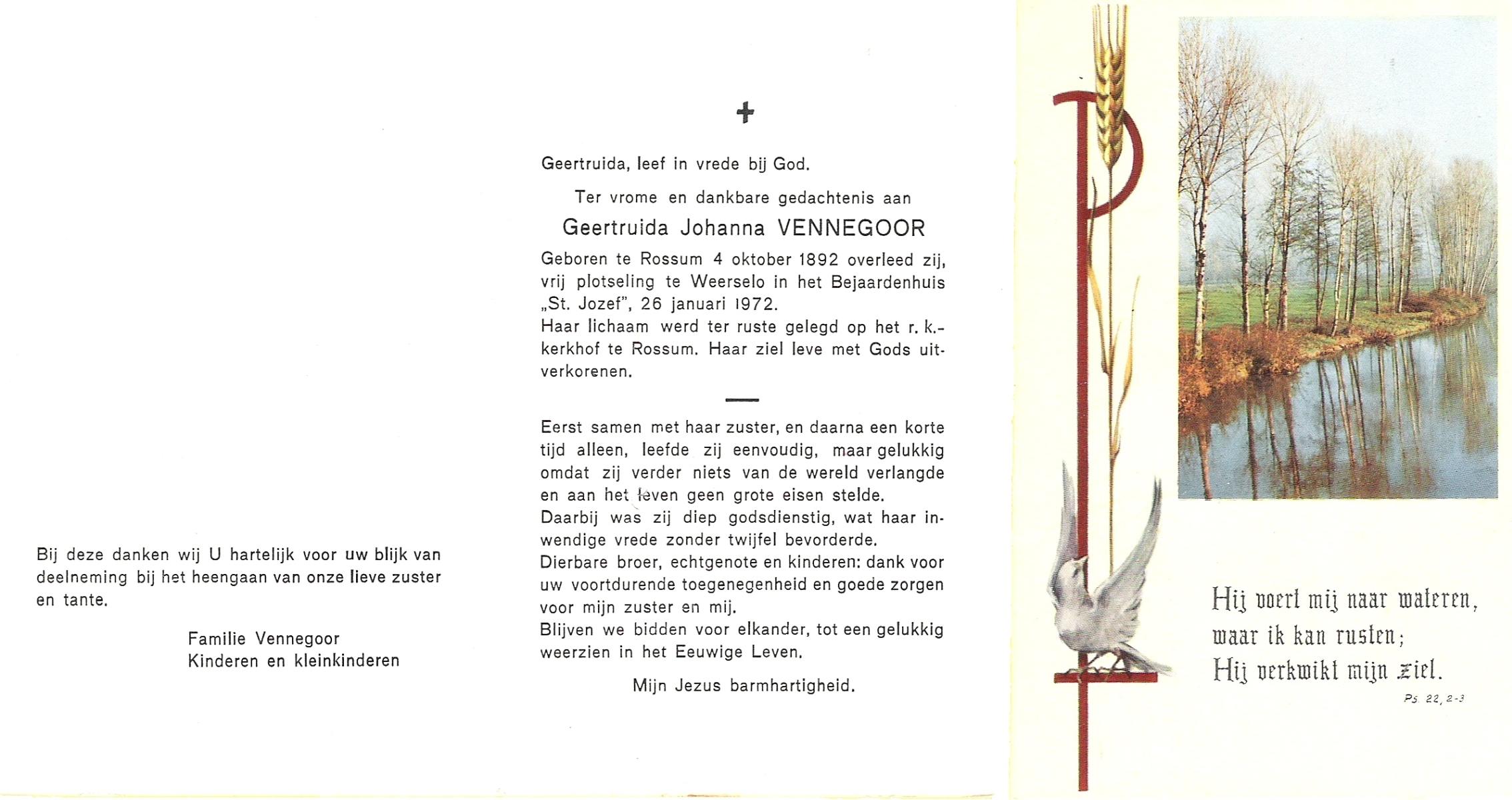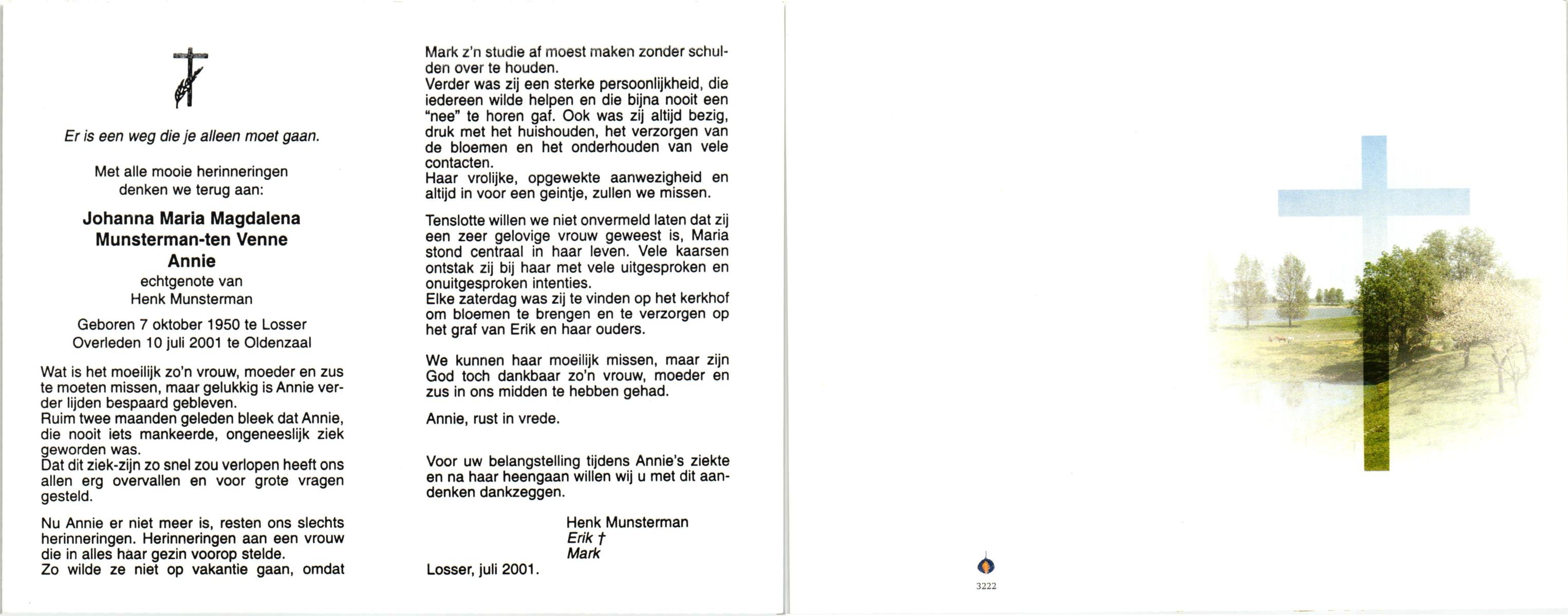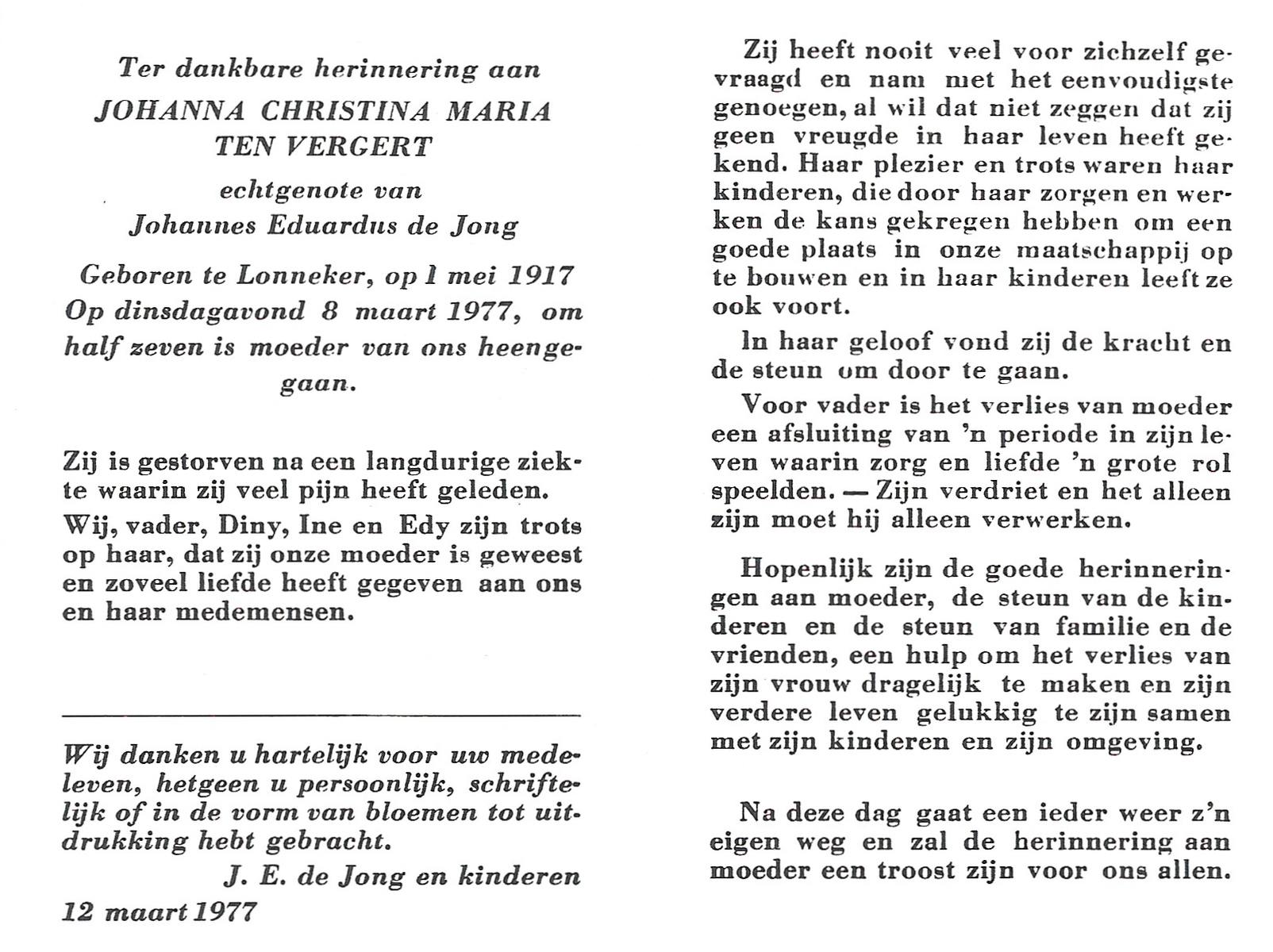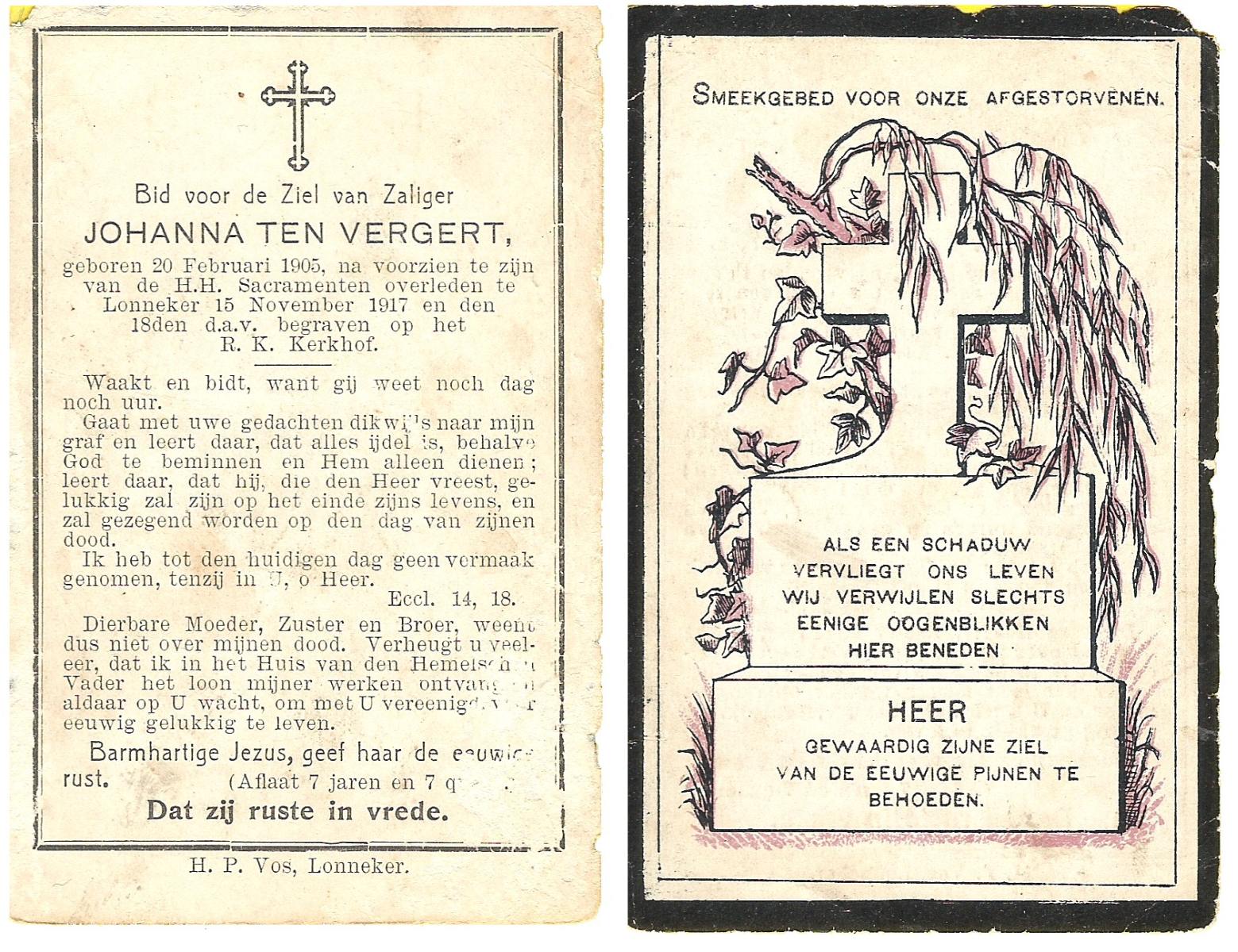 VELDE, ten, Johanna, geboren op 22-8-1901 te Geesteren (Ov.), overleden op 30-3-1993 te Harbrinkhoek op 91-jarige leeftijd, begraven te Mariaparochie.