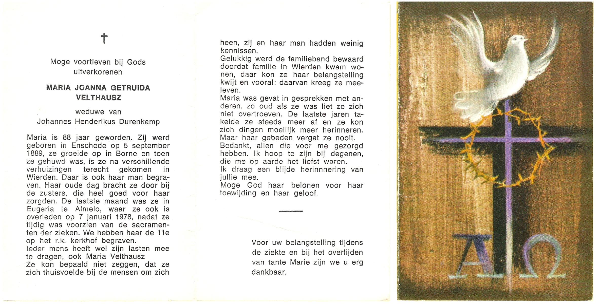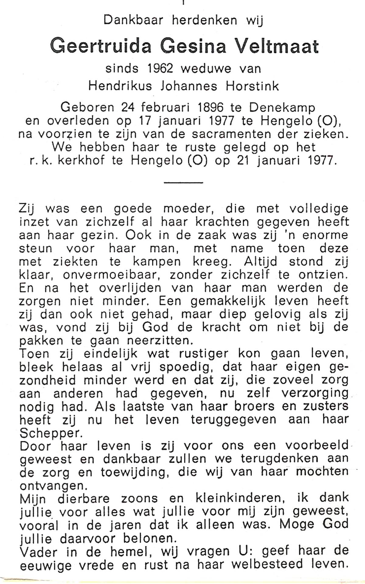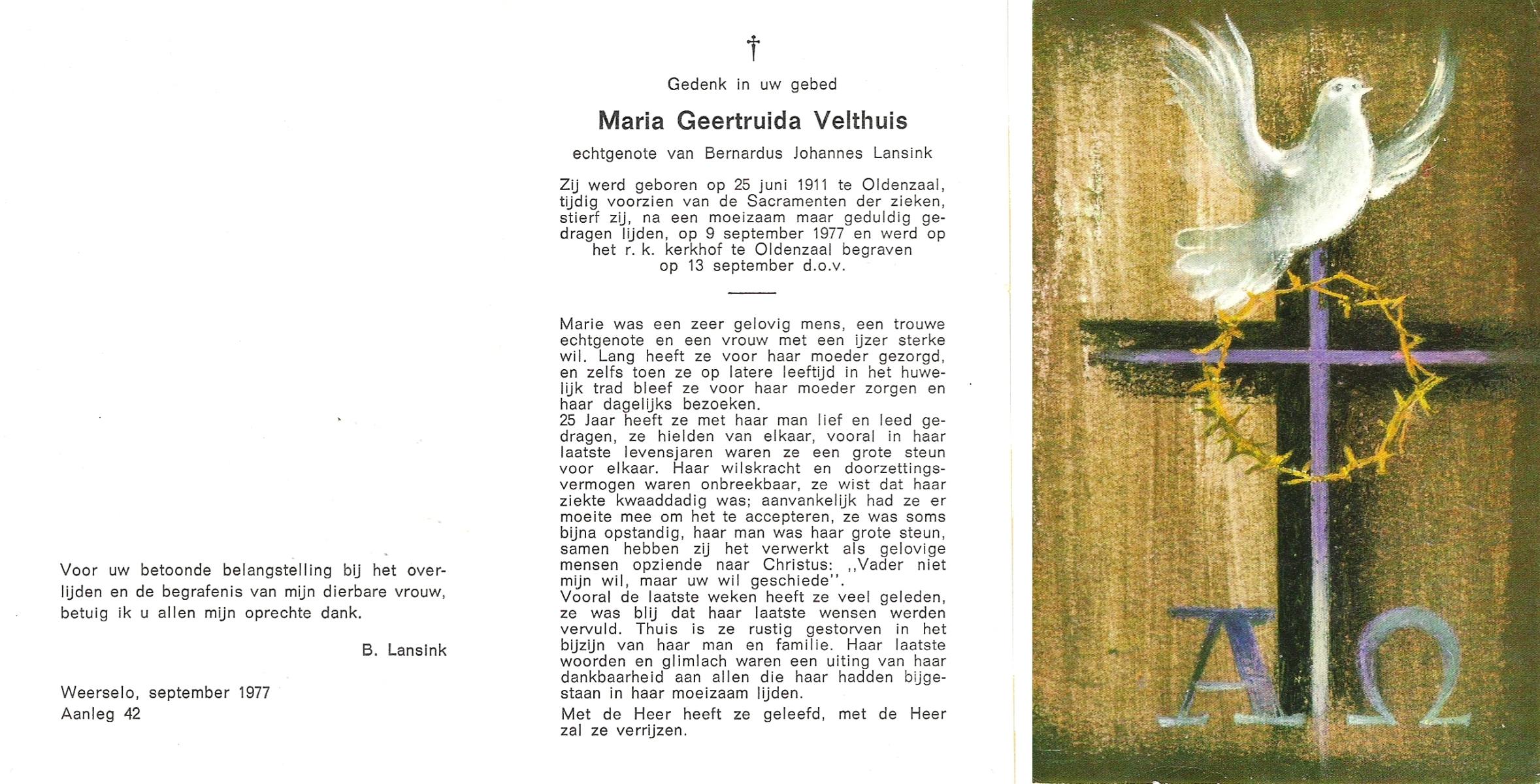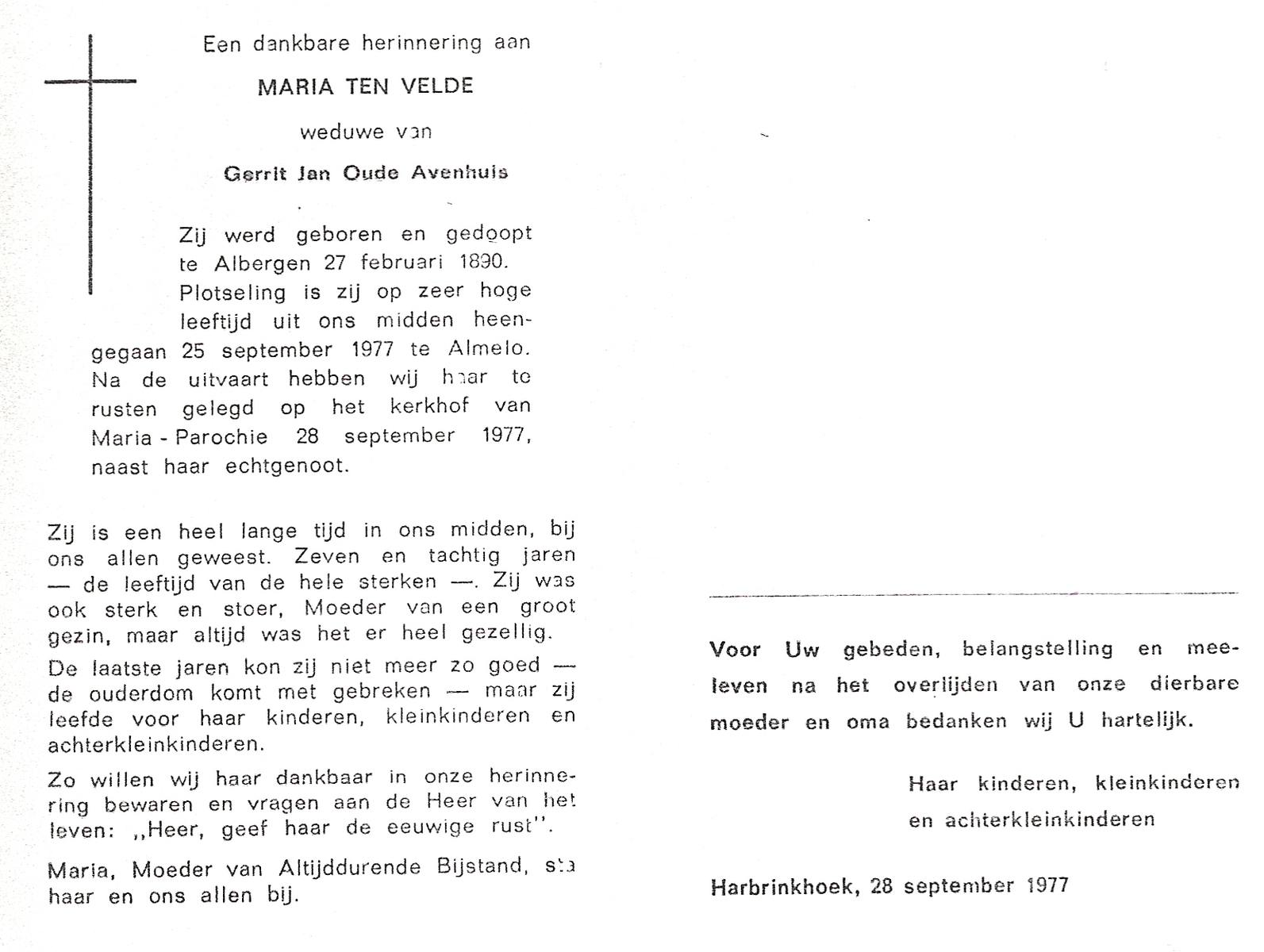 VELDE, ten, Maria, geboren op 27-02-1890 te Albergen, overleden op 25-9-1977 te Almelo op 87-jarige leeftijd, begraven op 28-9-1977 te Mariaparochie.