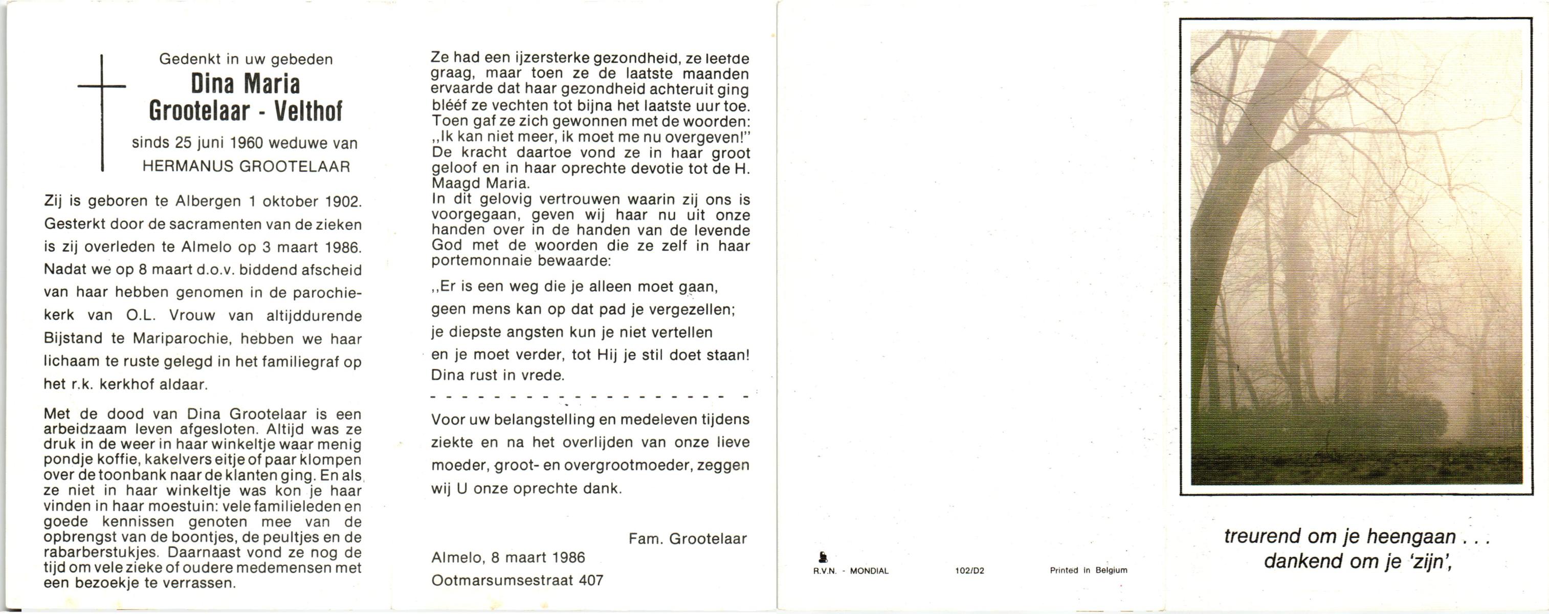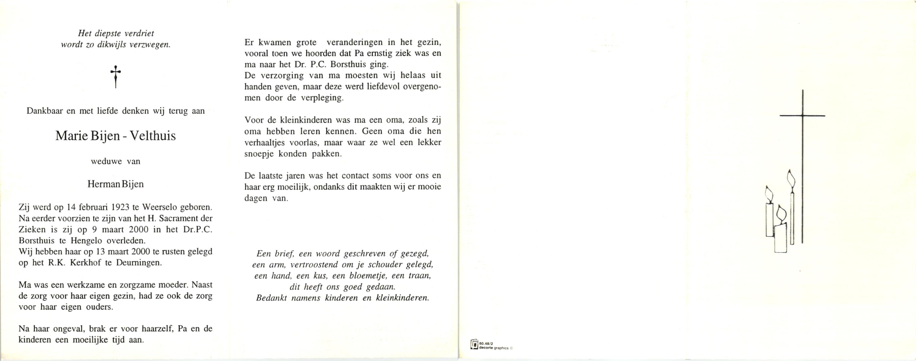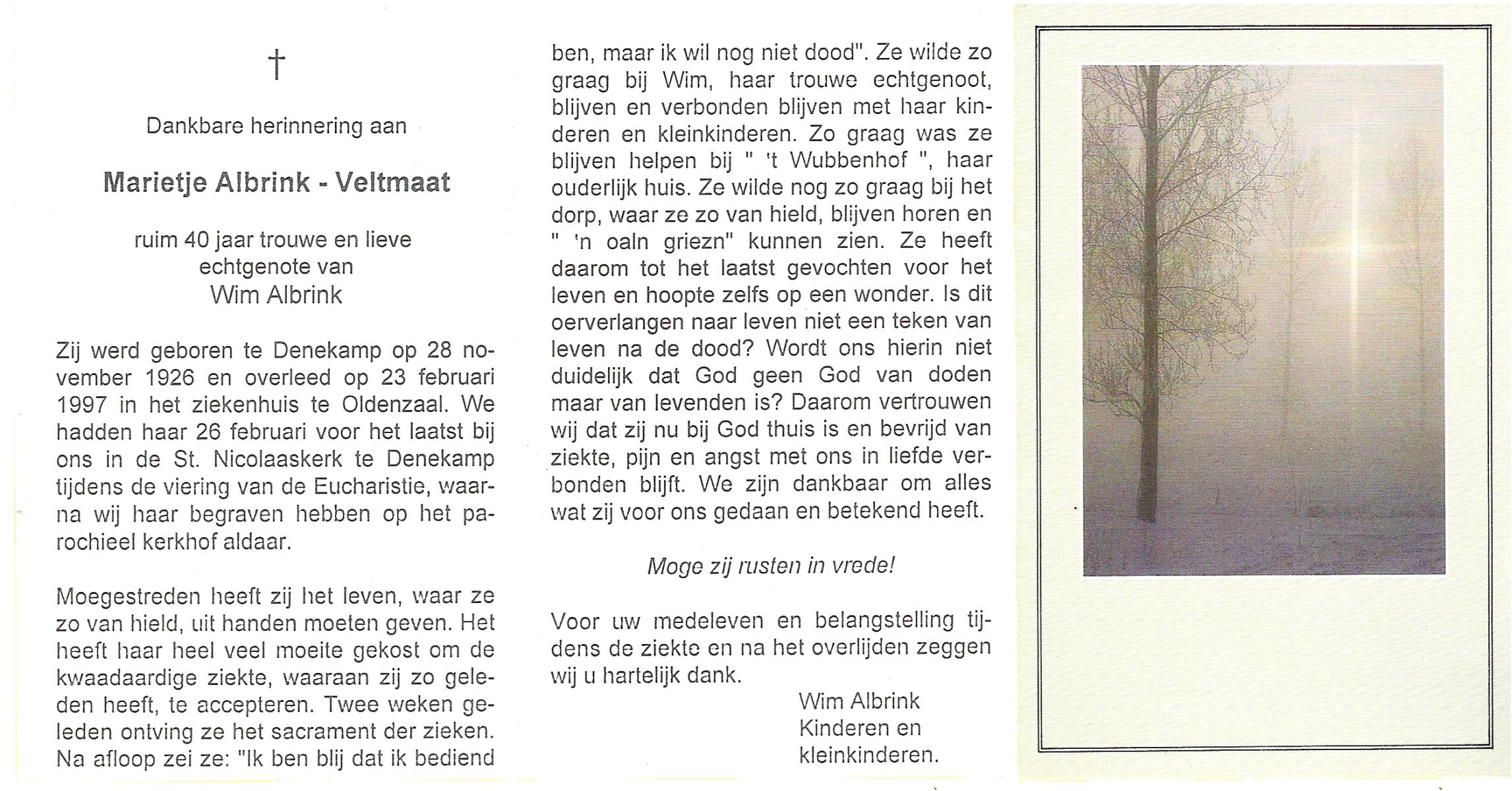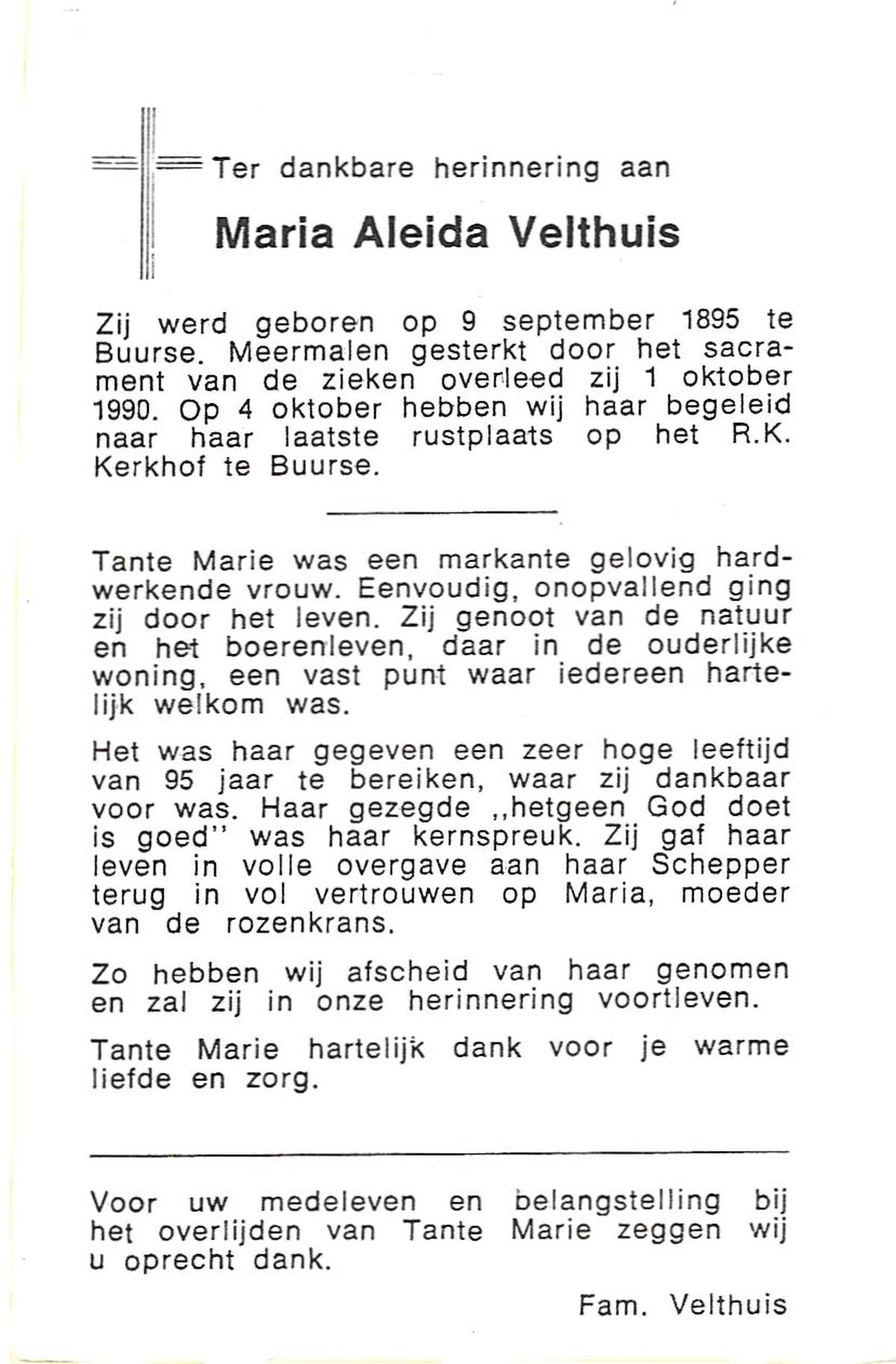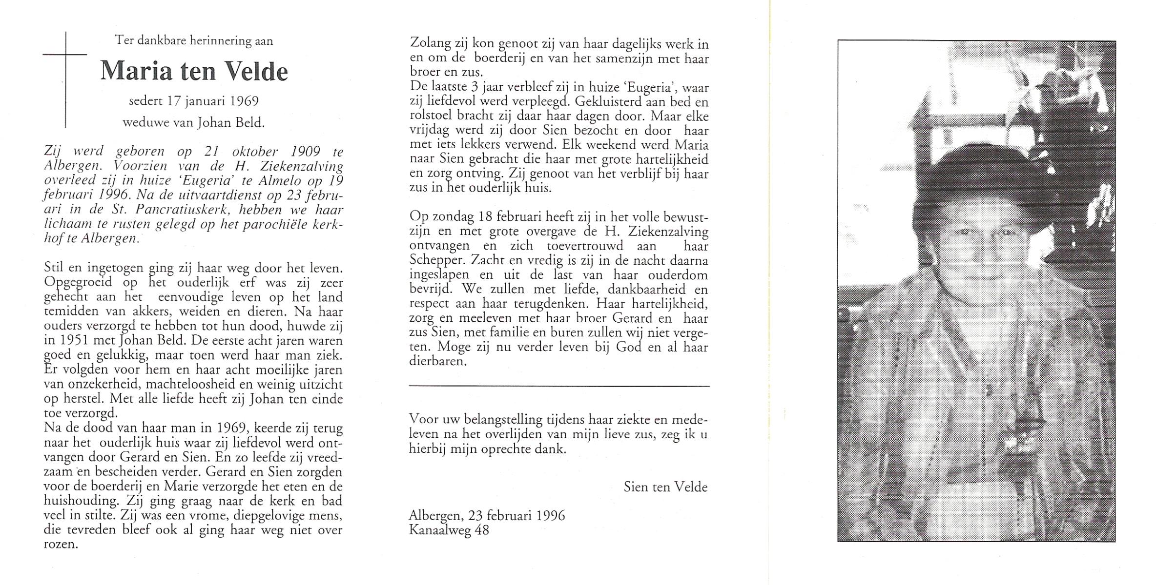 VELDE, ten, Maria, geboren op 21-10-1909 te Albergen, overleden op 19-2-1996 te Almelo op 86-jarige leeftijd, begraven op 23-2-1996 te Albergen.