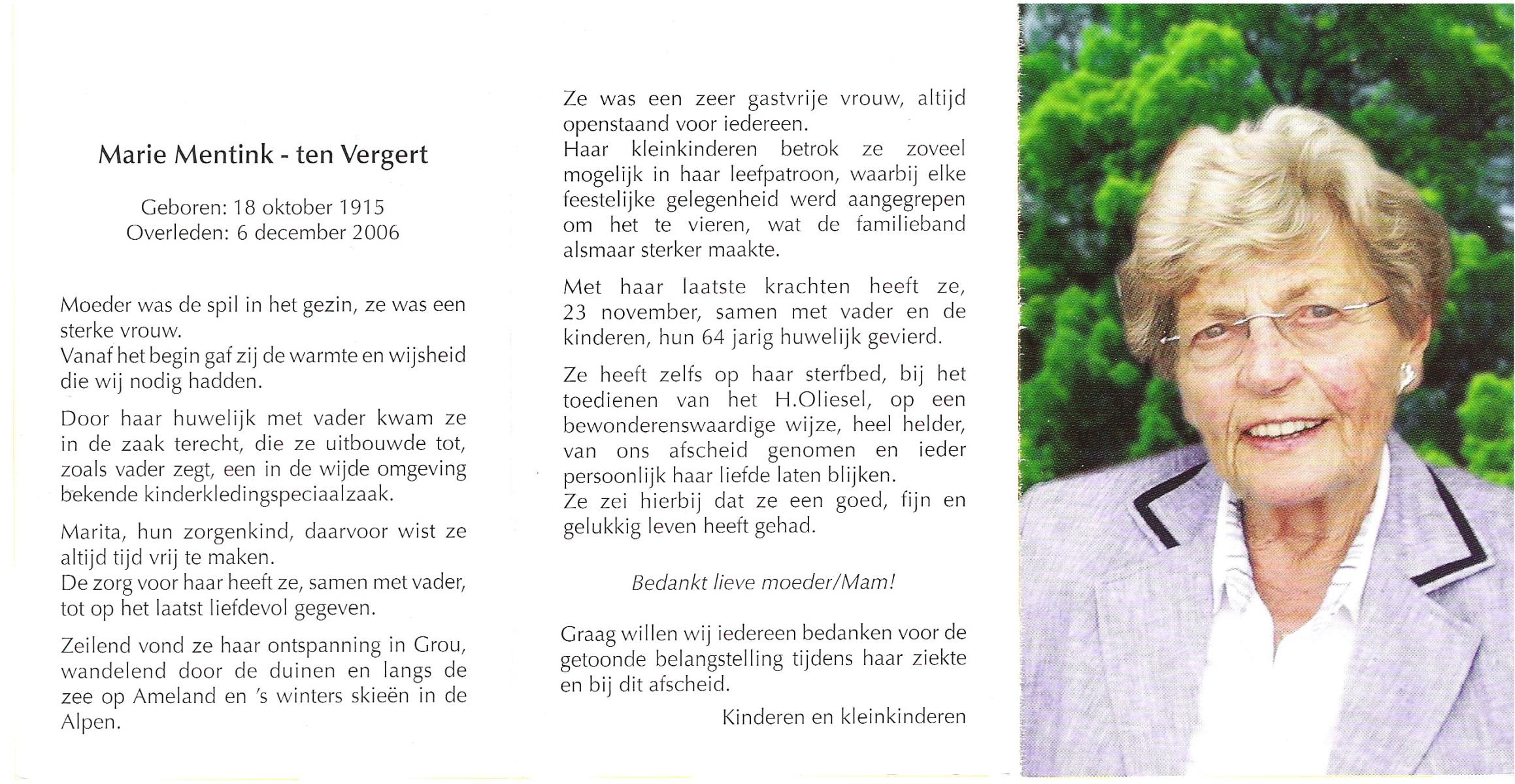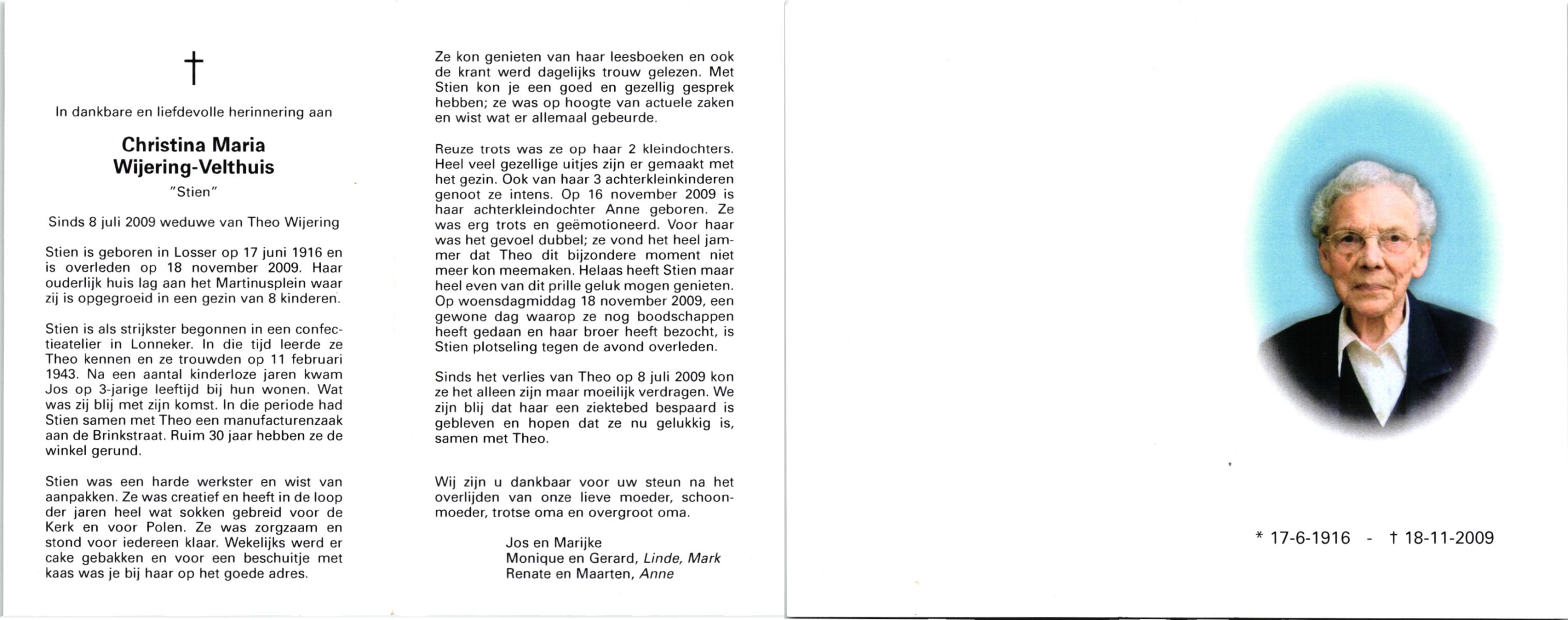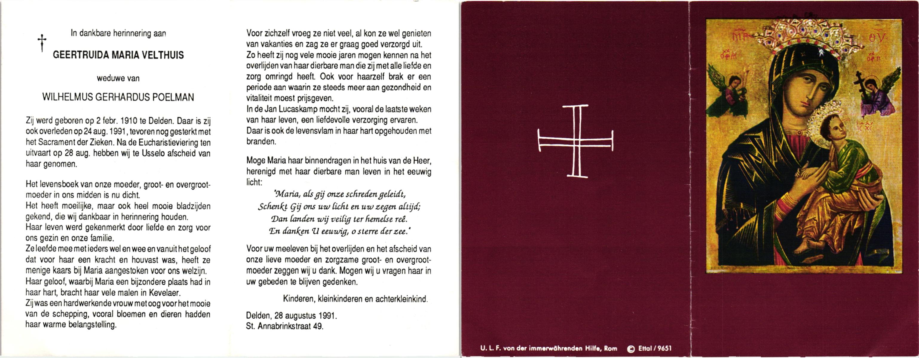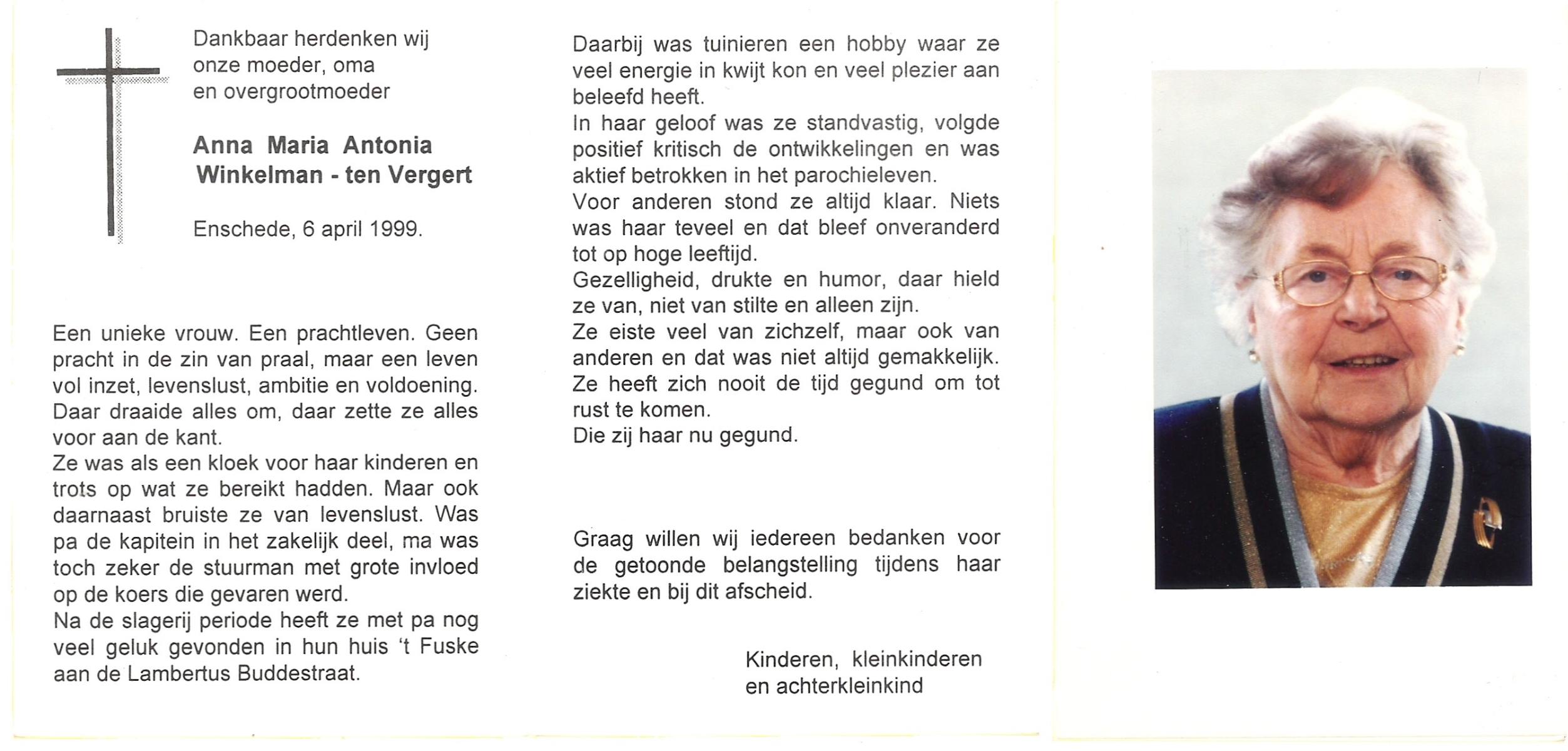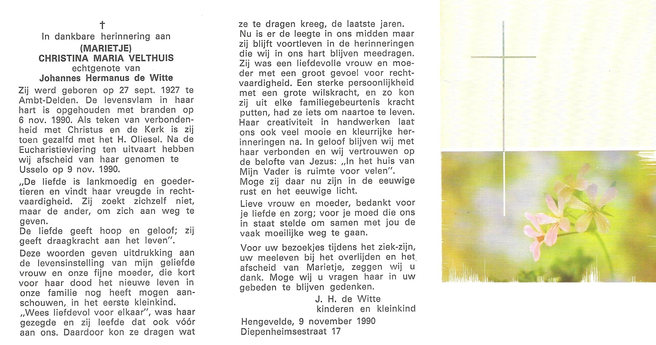 VELDE, ten, Maria, geboren op 21-10-1909 te Albergen, overleden op 19-2-1996 te Almelo op 86-jarige leeftijd, begraven op 23-2-1996 te Albergen.