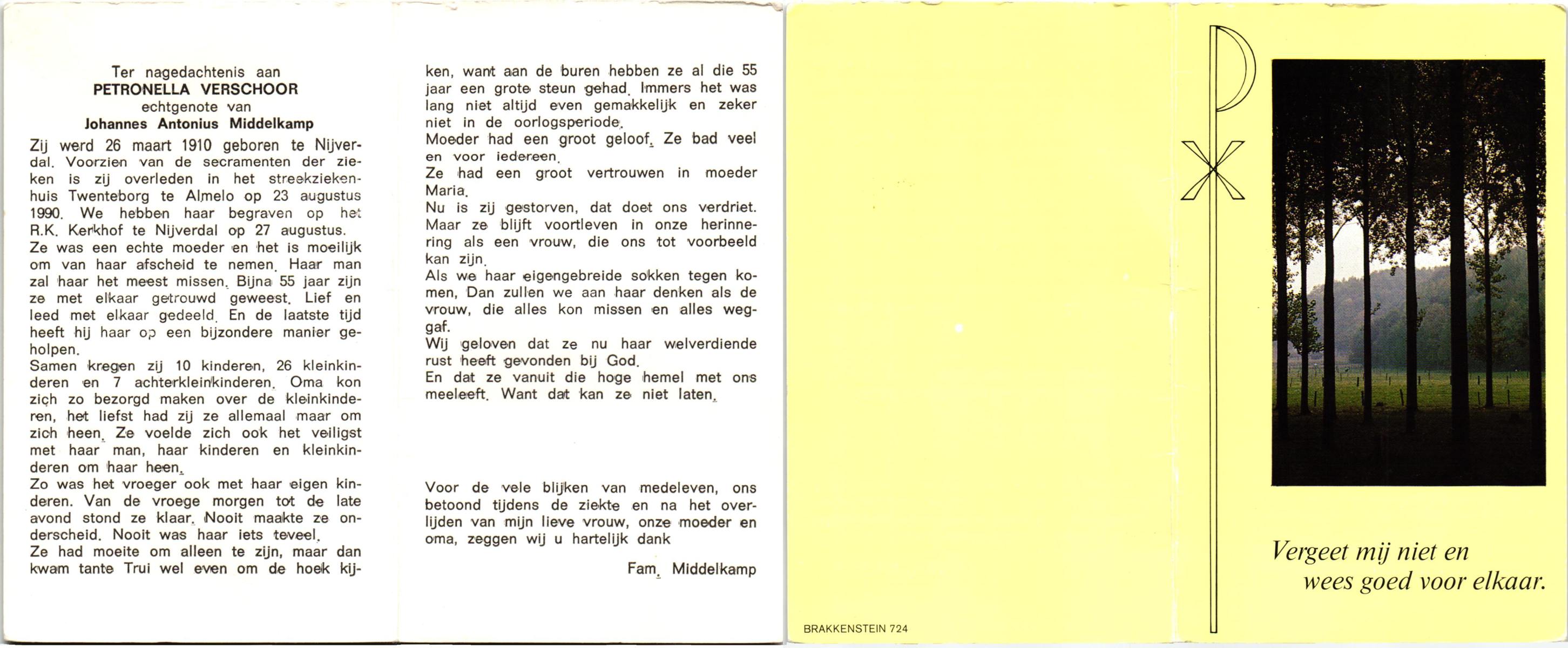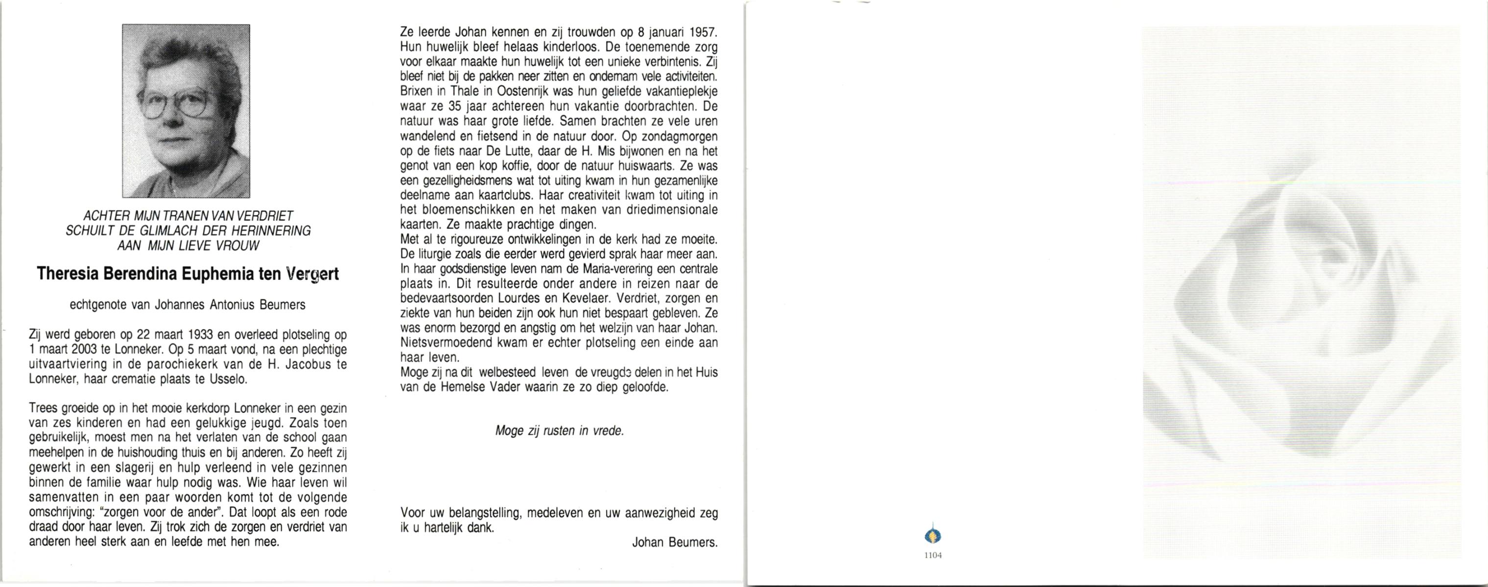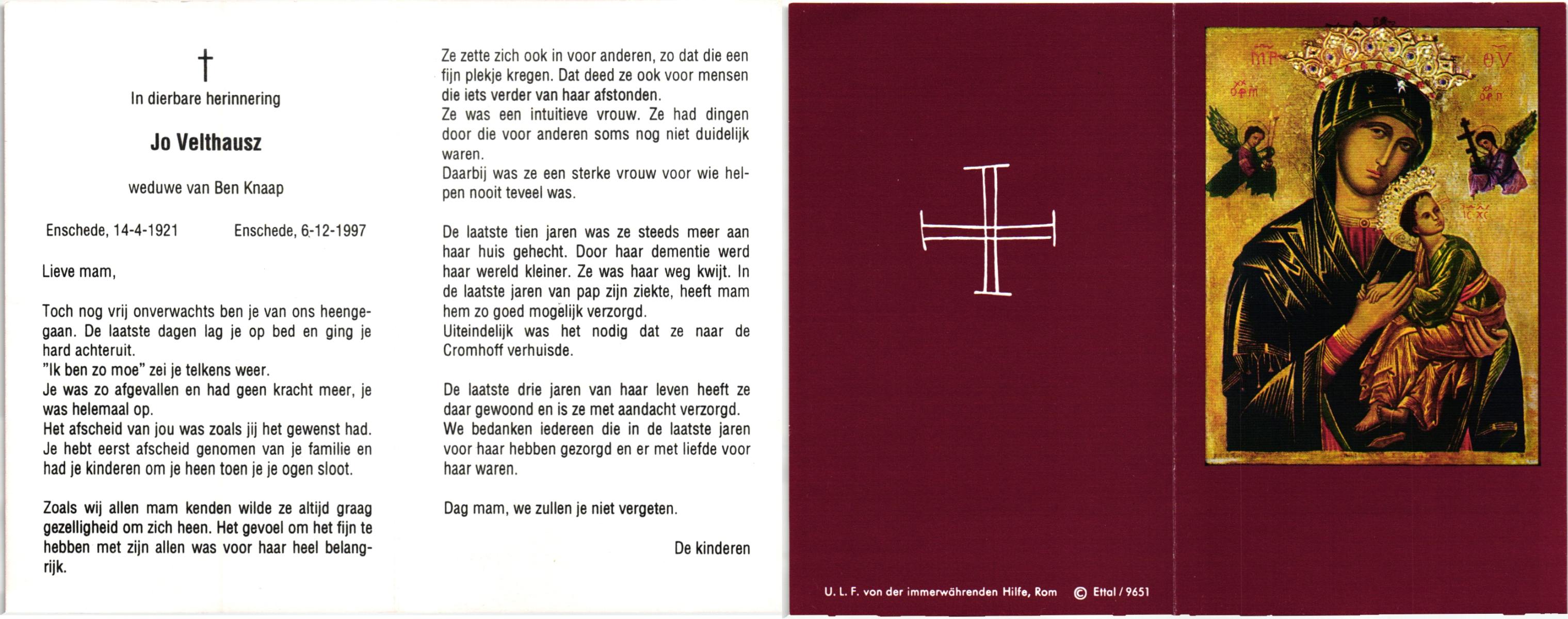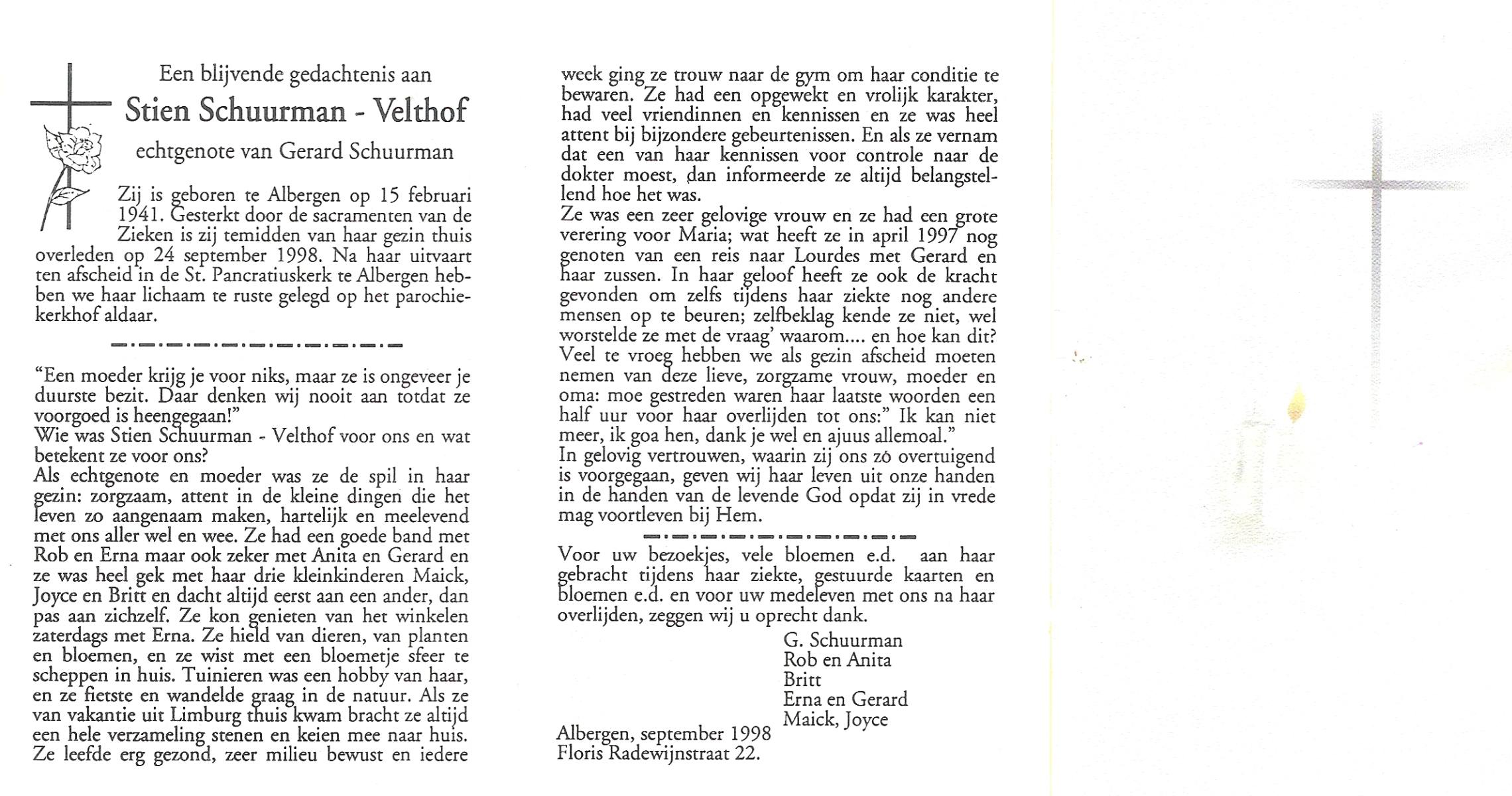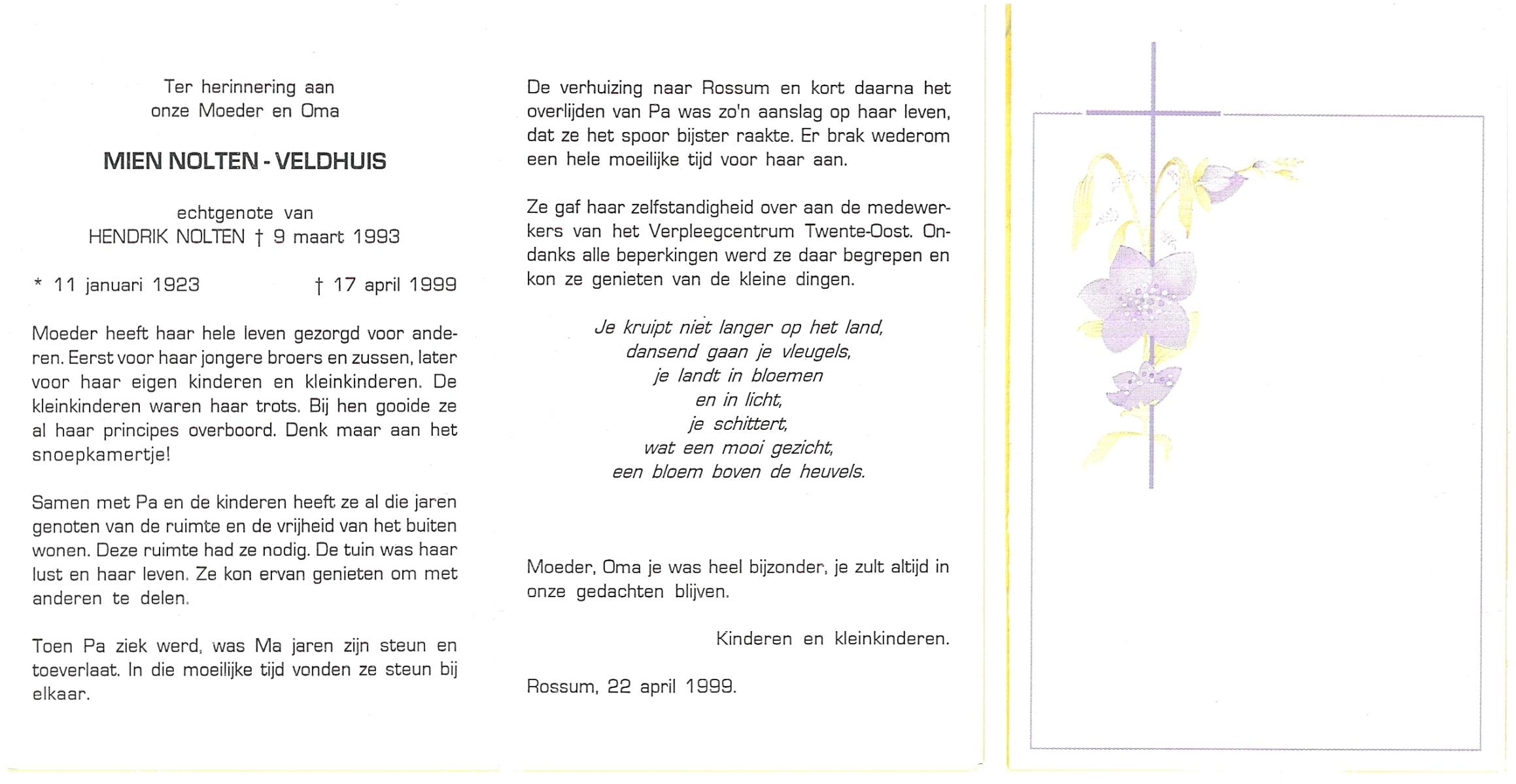 VELDE, ten, Maria, geboren op 21-10-1909 te Albergen, overleden op 19-2-1996 te Almelo op 86-jarige leeftijd, begraven op 23-2-1996 te Albergen.