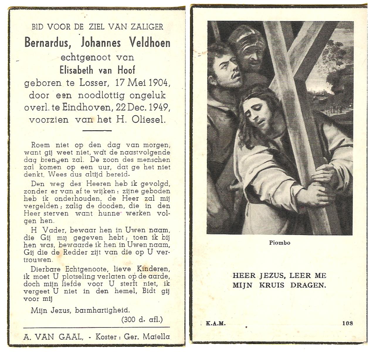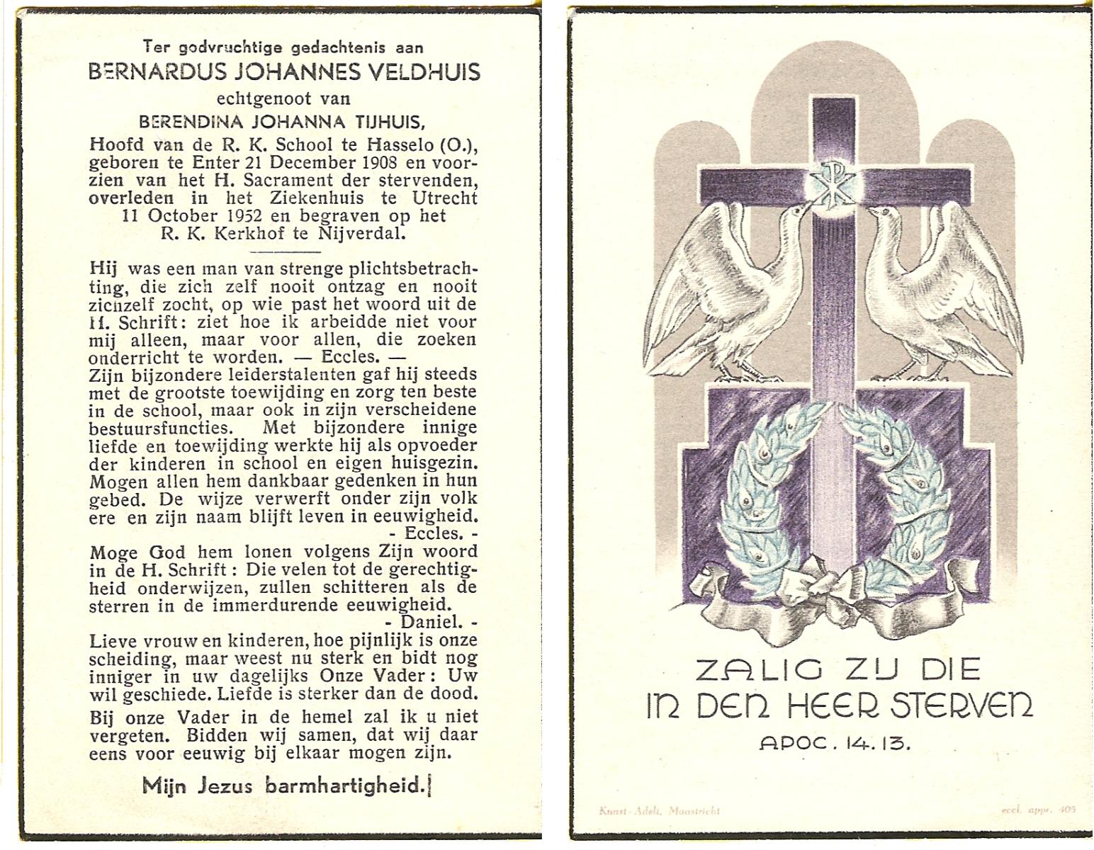 VELDHOEN, Bernardus Johannes, geboren op 17-5-1904 te Losser, overleden op 22-12-1949 te Eindhoven op 45-jarige leeftijd.