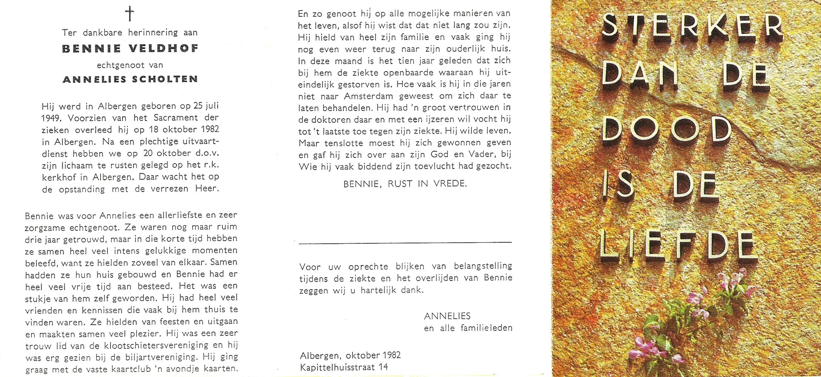 VELDHOF, Bennie, geboren op 25-7-1949 te Albergen, overleden op 18-10-1982 te Albergen op 33-jarige leeftijd, begraven op 20-10-1982 te Albergen.
