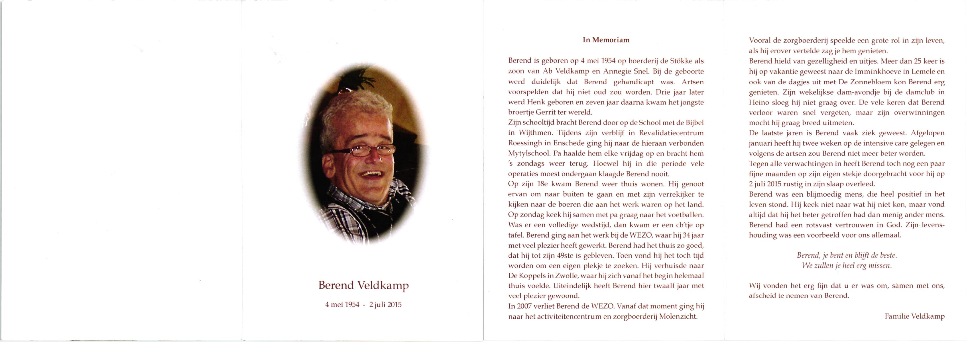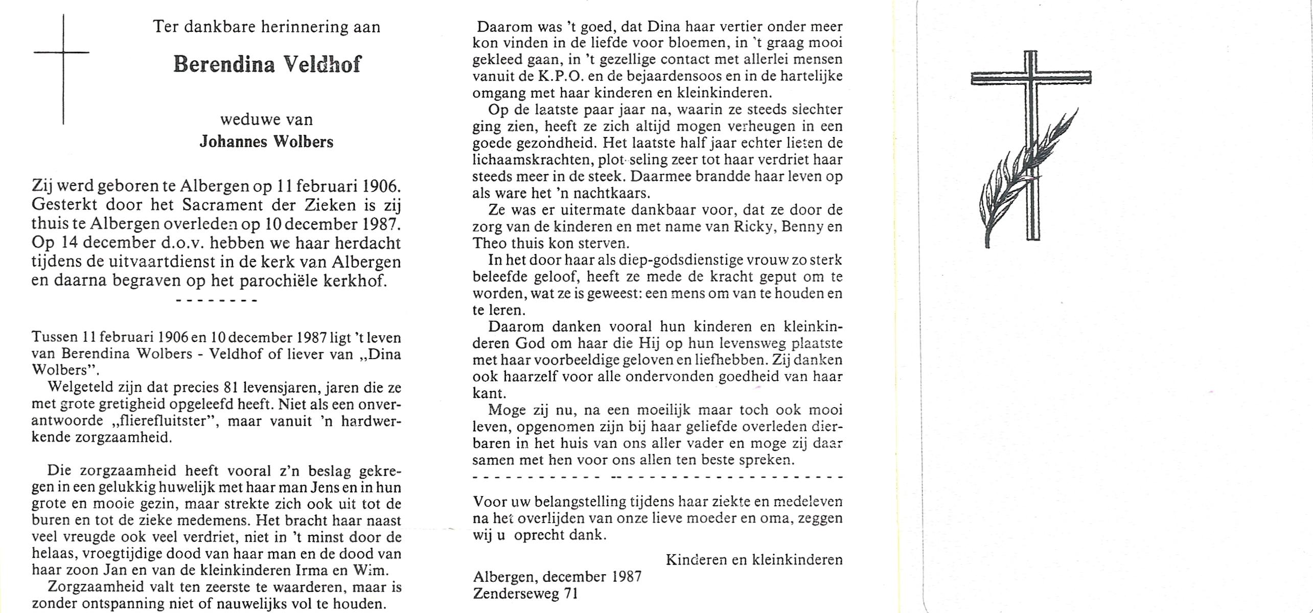 VELDHOF, Berendina, geboren op 11-2-1906 te Albergen, overleden op 10-12-1987 te Albergen op 81-jarige leeftijd, begraven op 14-12-1987 te Albergen.