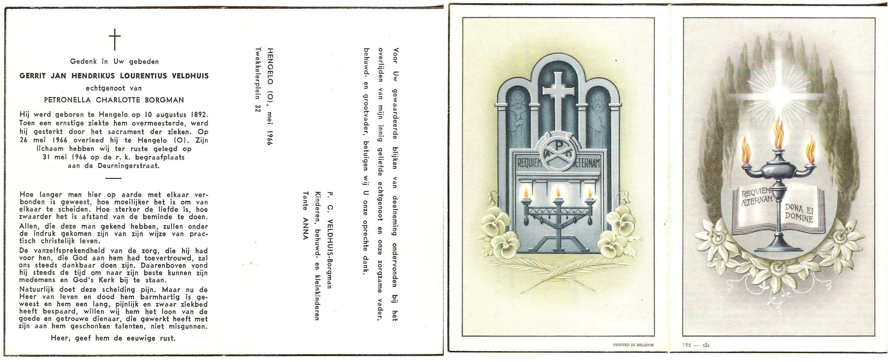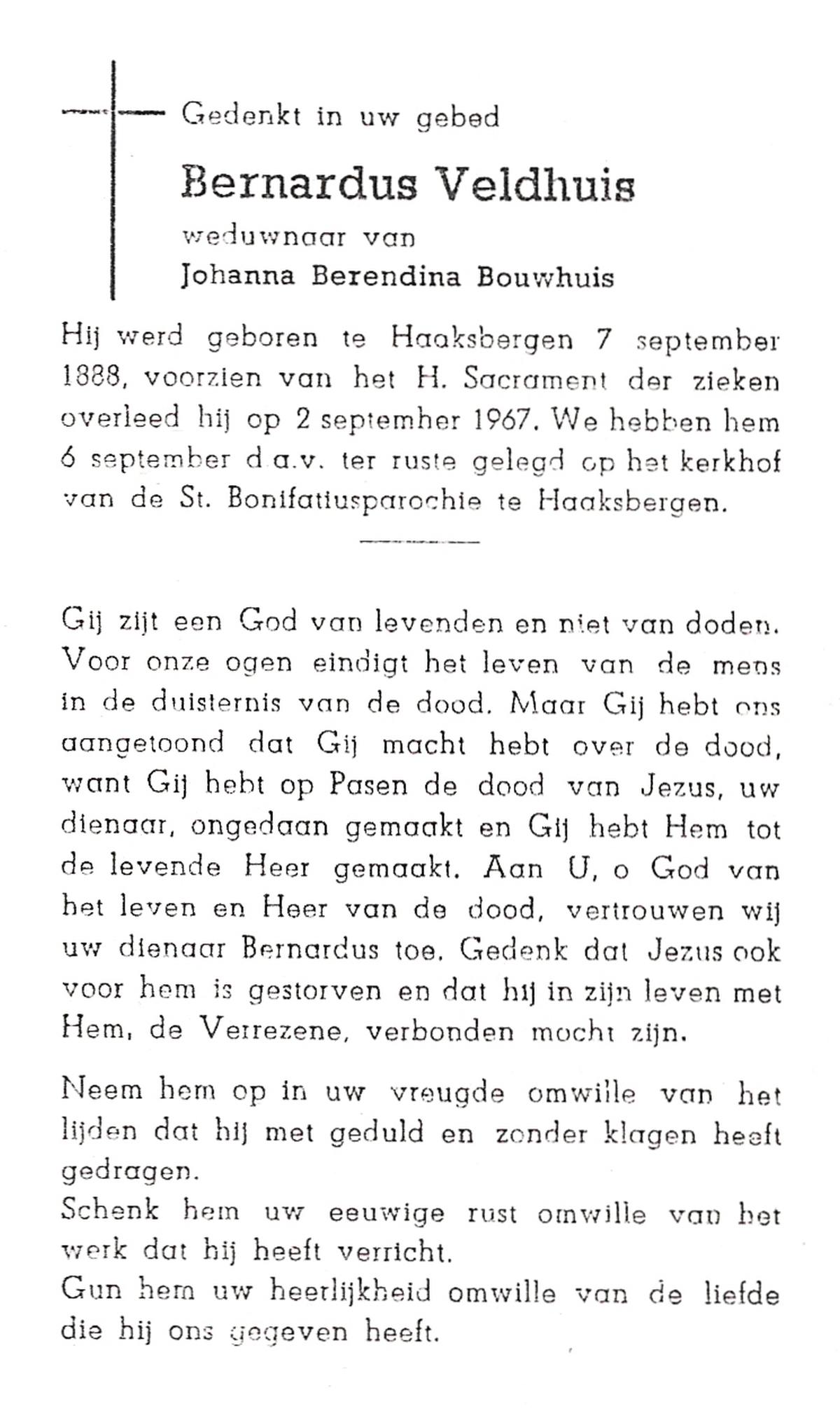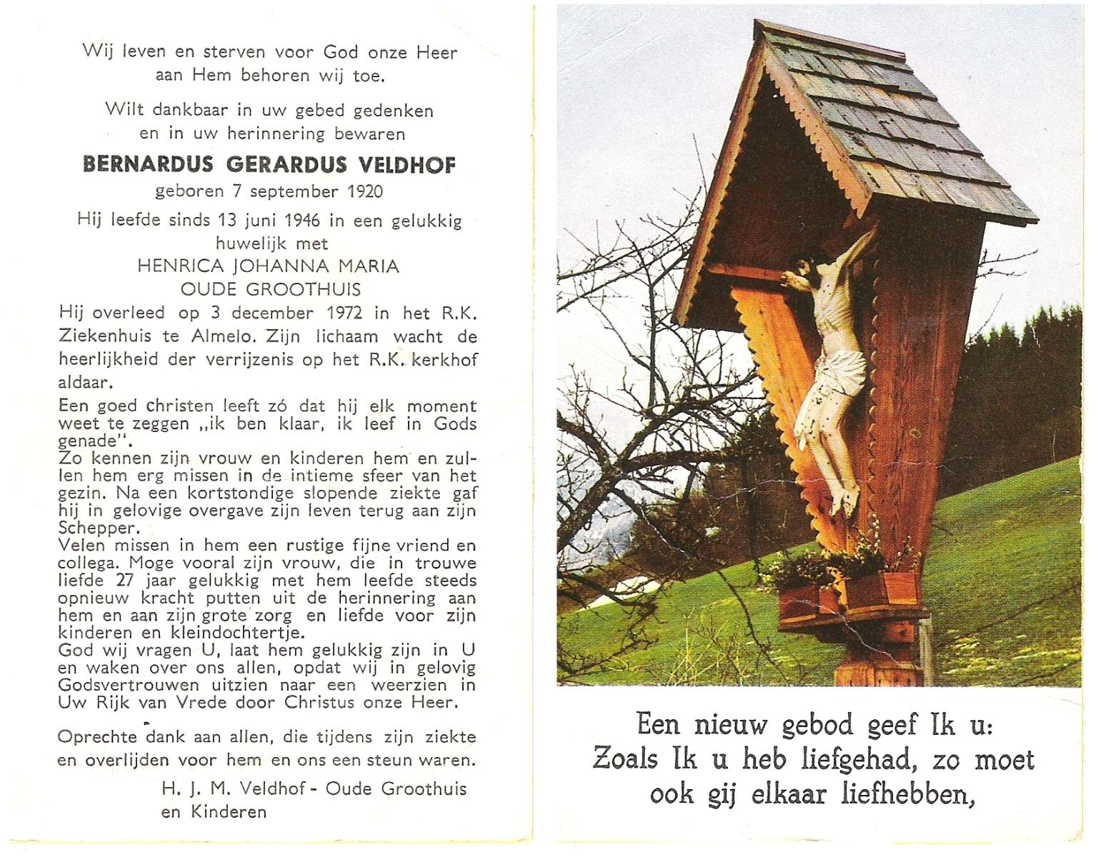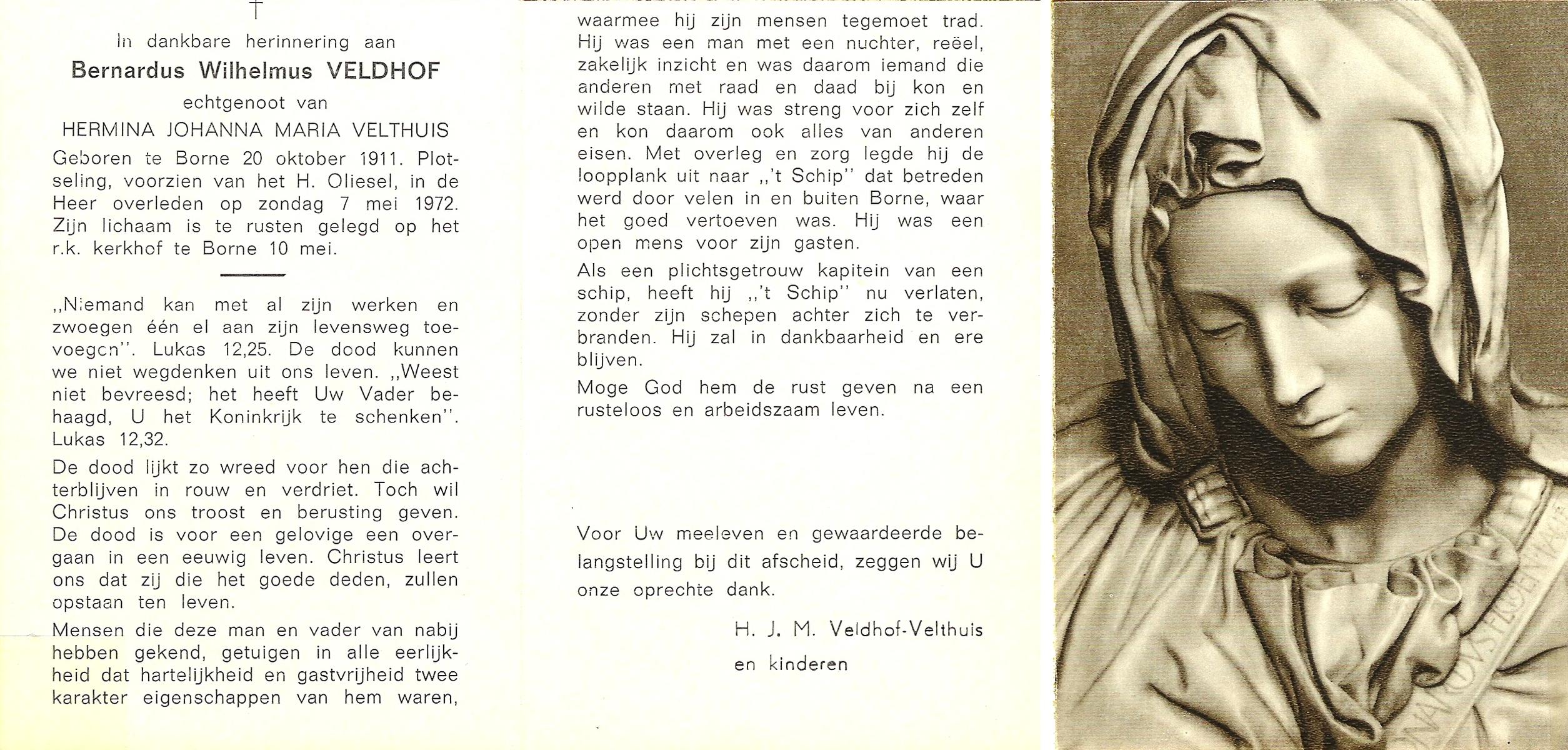VELDHOF, Bernardus Wilhelmus, geboren op 20-10-1911 te Borne, overleden op 7-5-1972 op 60-jarige leeftijd, begraven op 10-5-1972 te Borne.