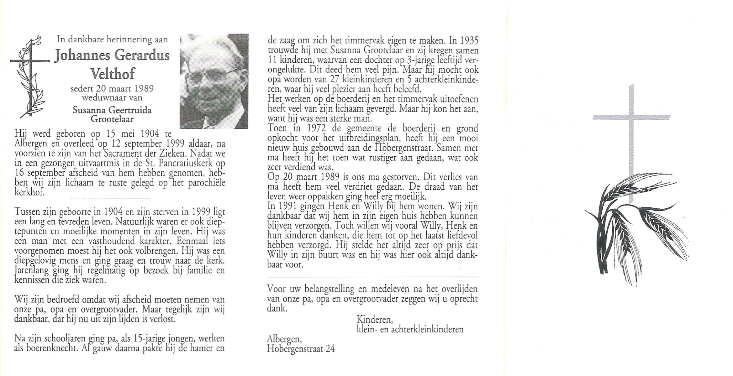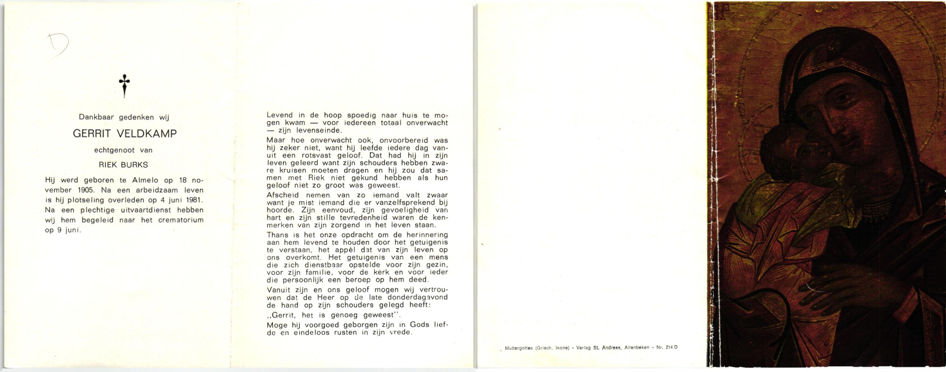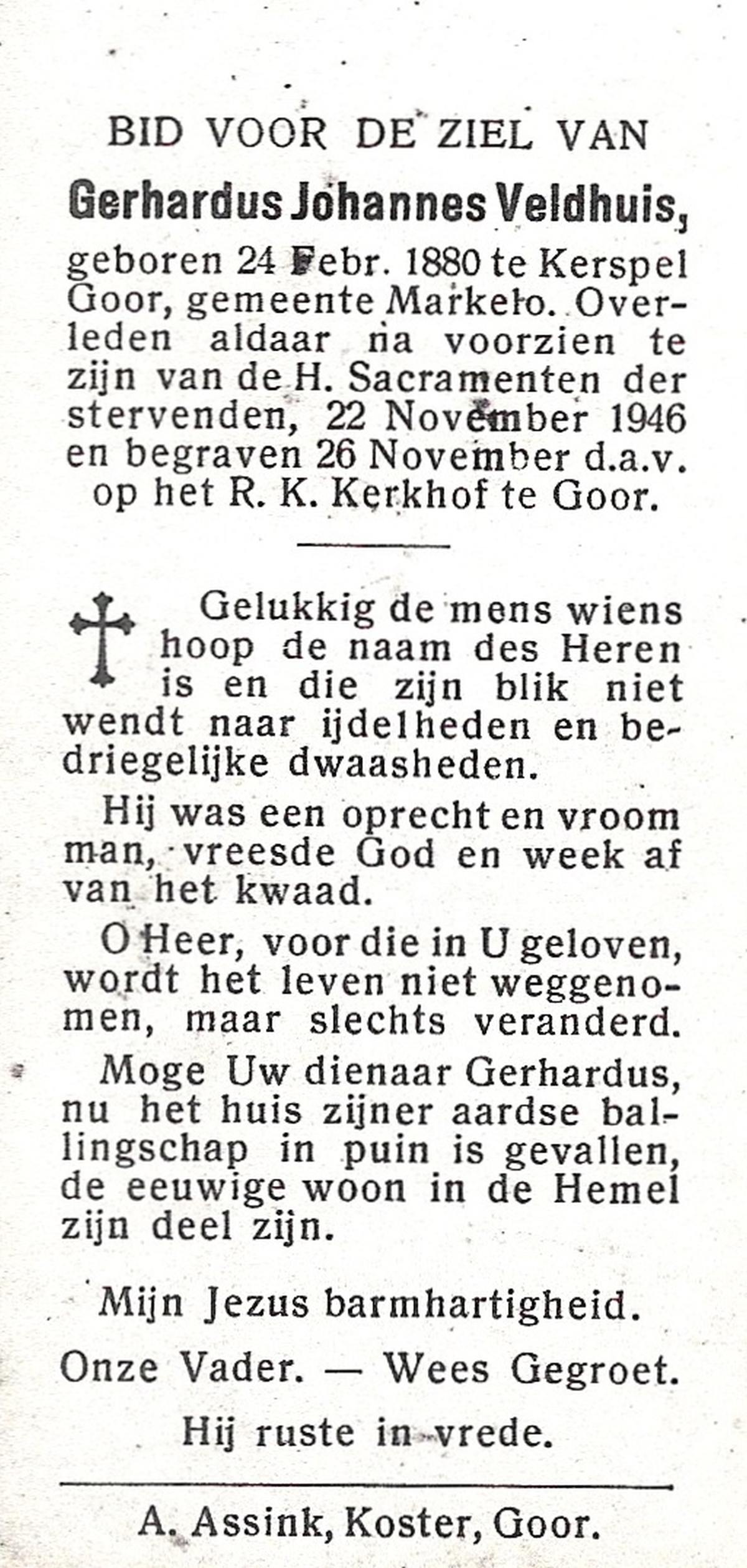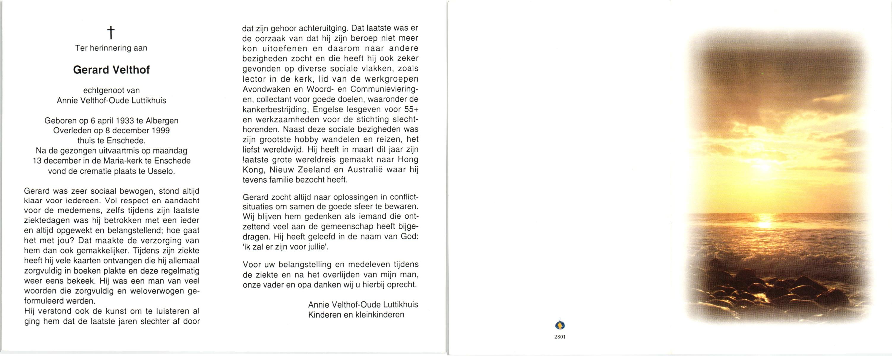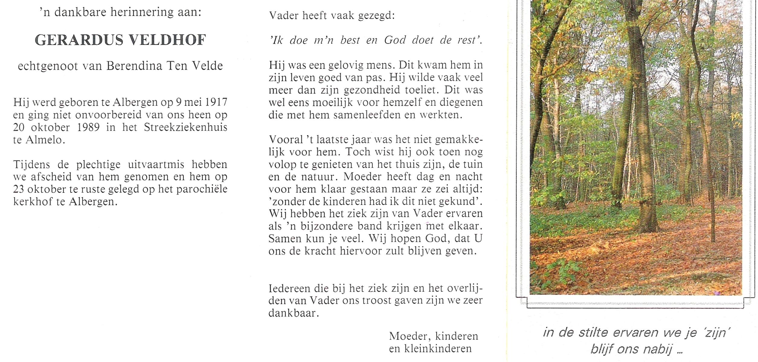 VELDHOF, Gerardus, geboren op 9-5-1917 te Albergen, overleden op 20-10-1989 te Almelo op 71-jarige leeftijd, begraven op 23-10-1989 te Albergen.