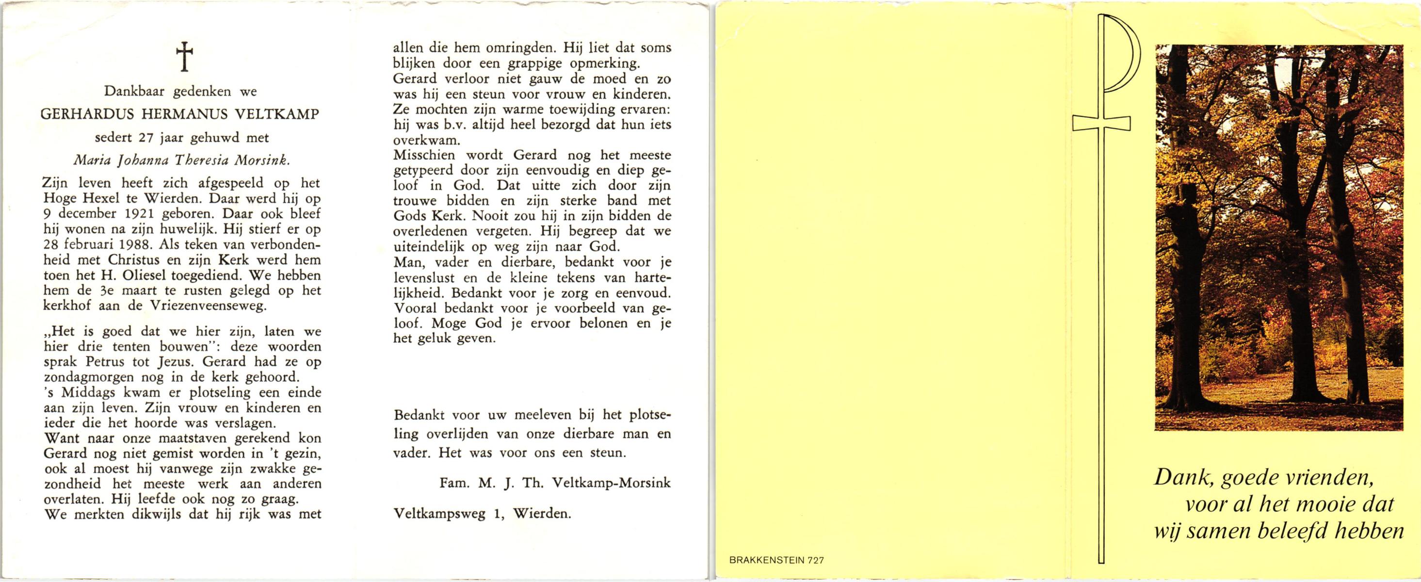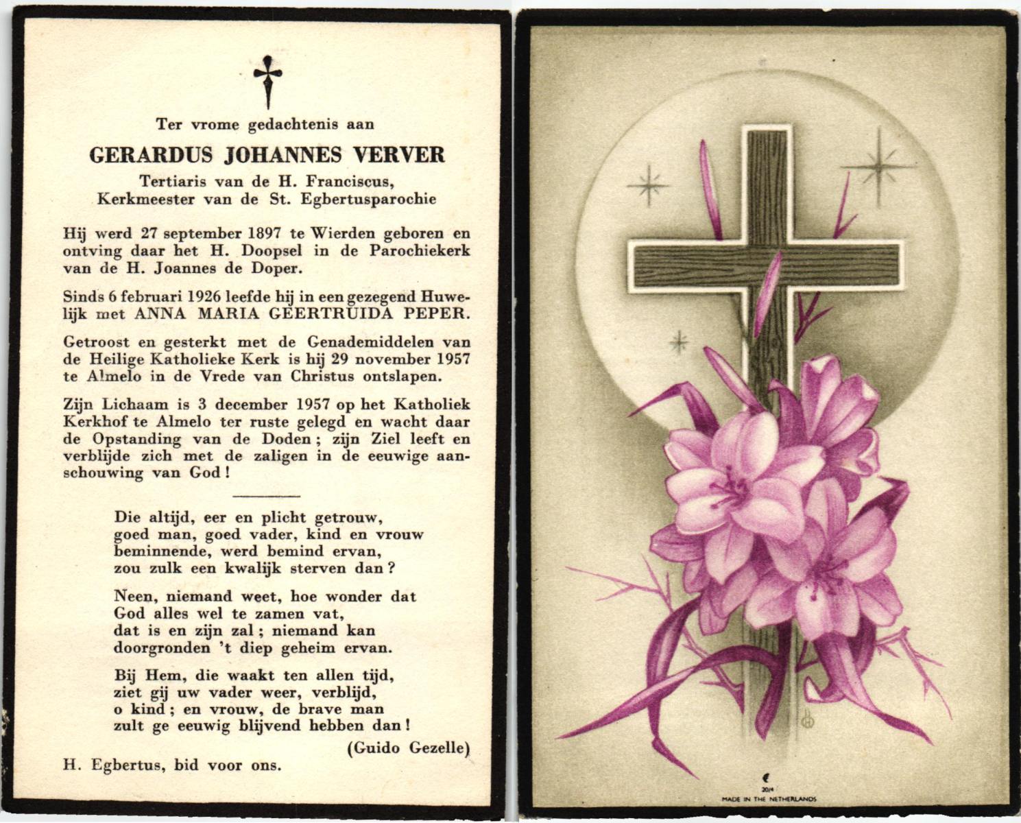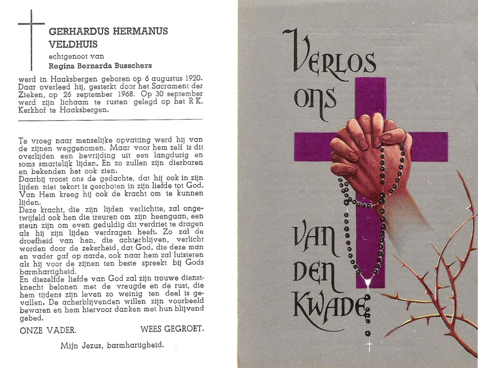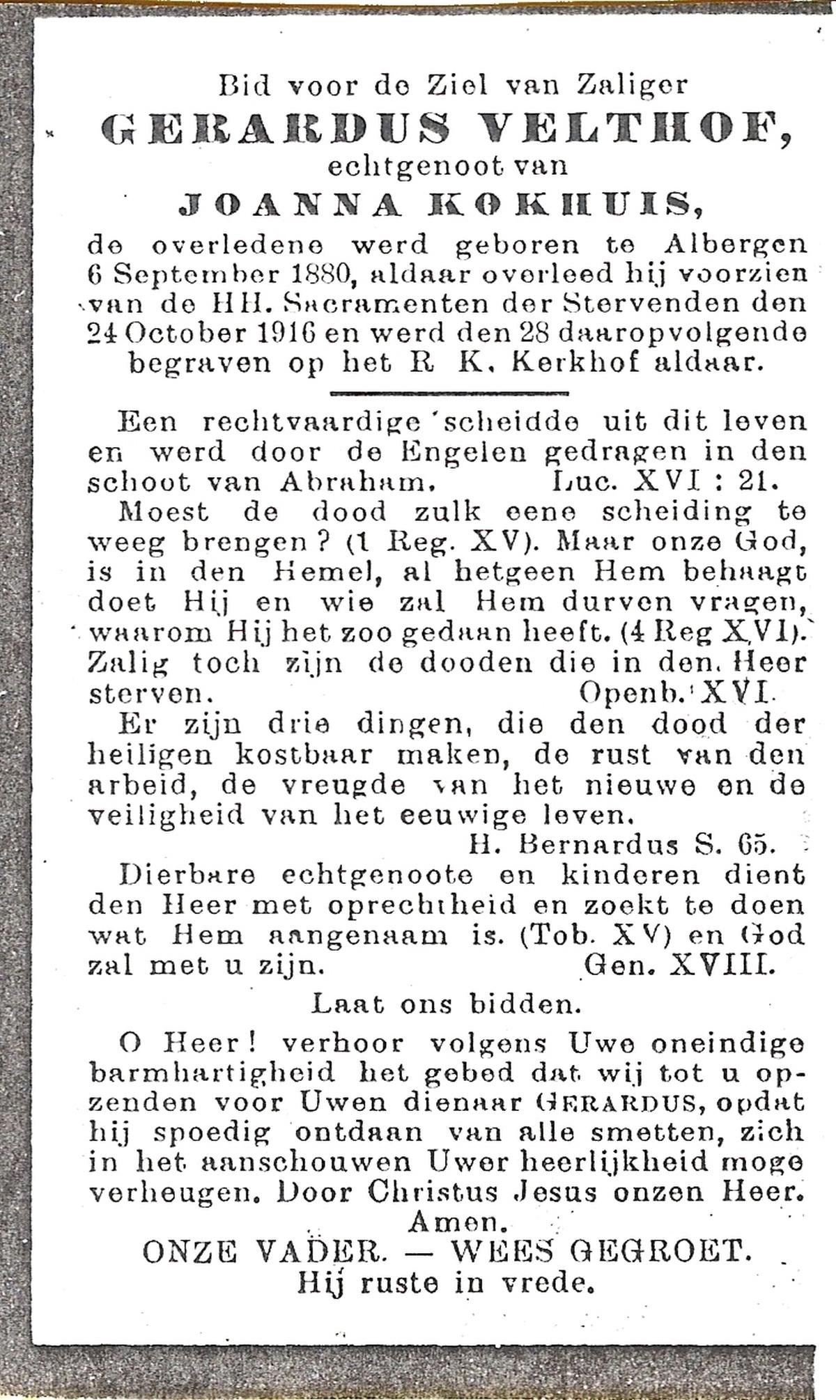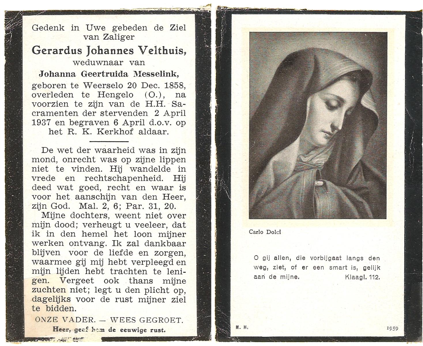 VELDHOF, Gerardus, geboren op 9-5-1917 te Albergen, overleden op 20-10-1989 te Almelo op 71-jarige leeftijd, begraven op 23-10-1989 te Albergen.
