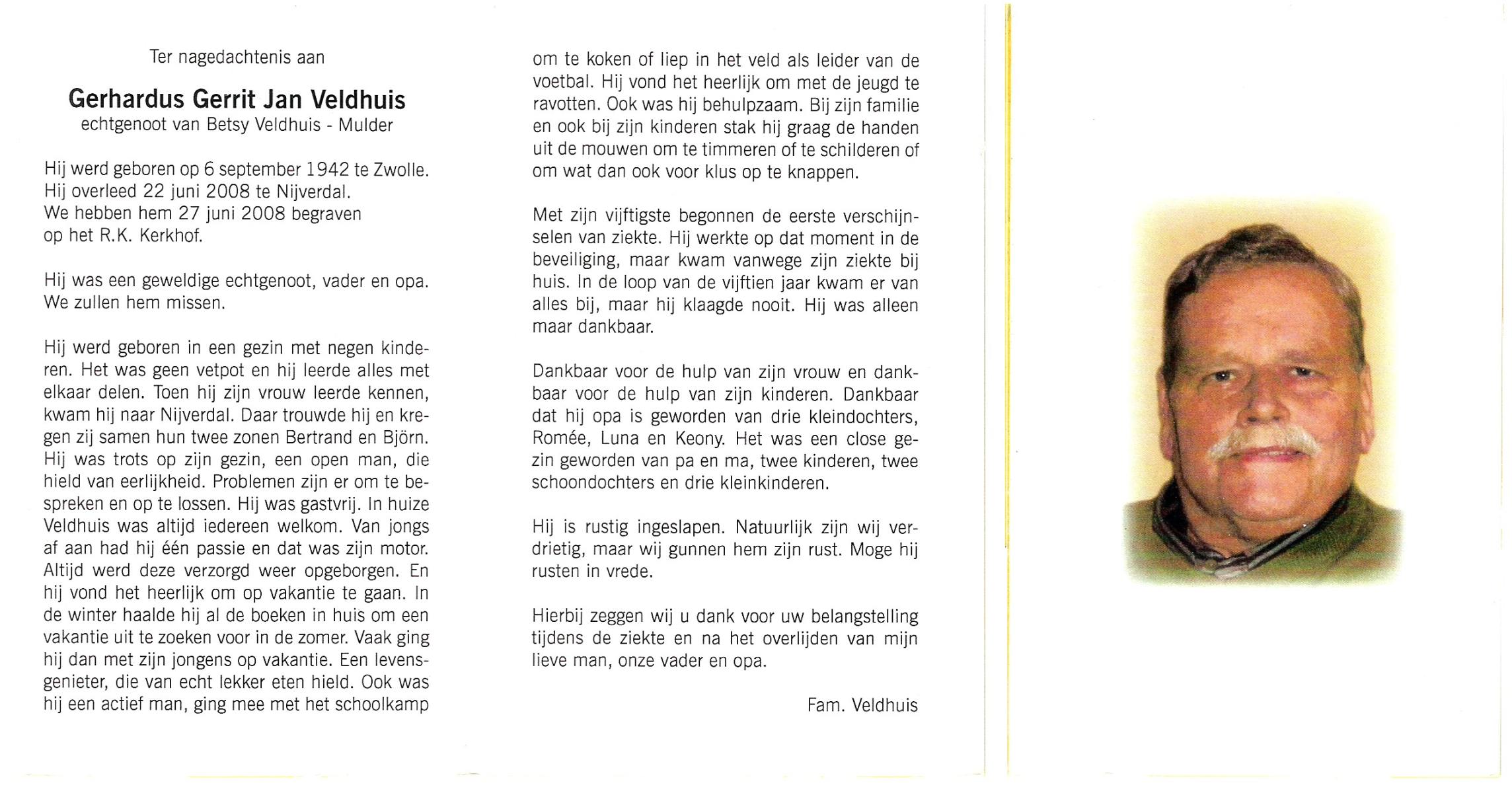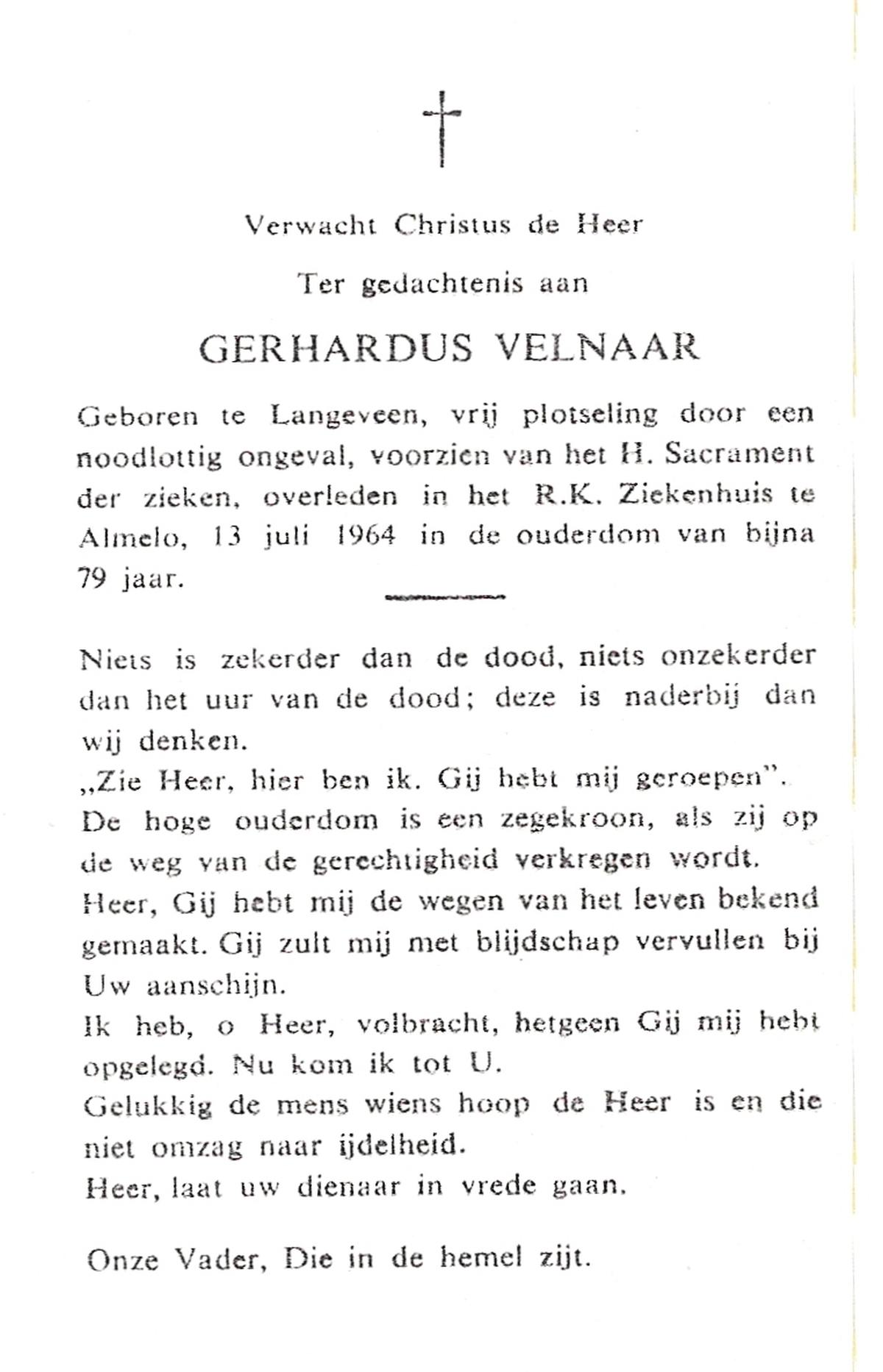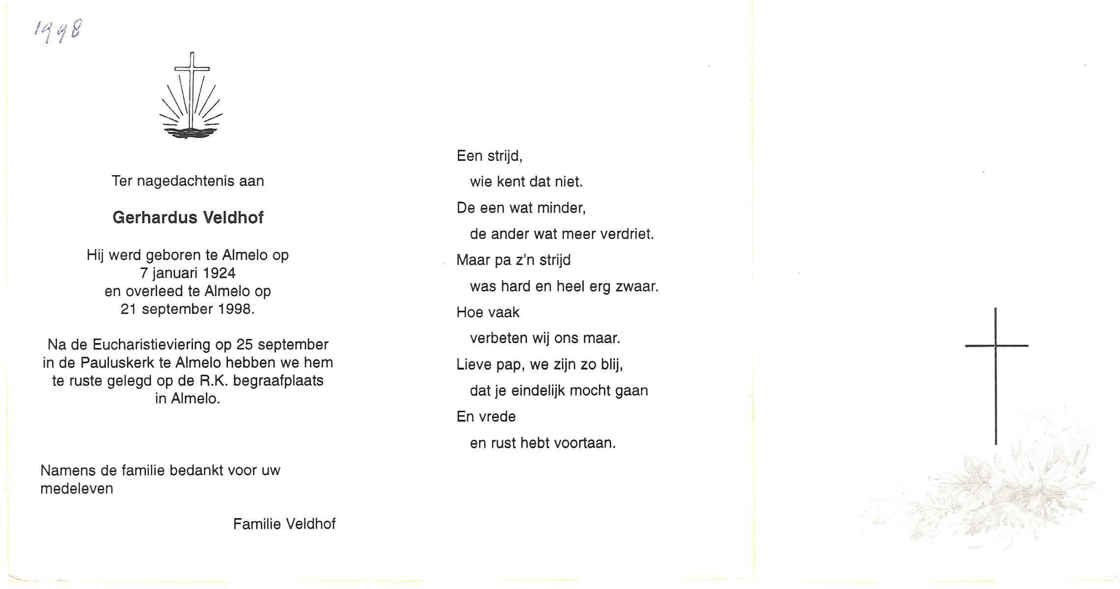 VELDHOF, Gerhardus, geboren op 7-1-1924 te Almelo, overleden op 21-9-1998 te Almelo op 74-jarige leeftijd, begraven op 25-9-1998 te Almelo.