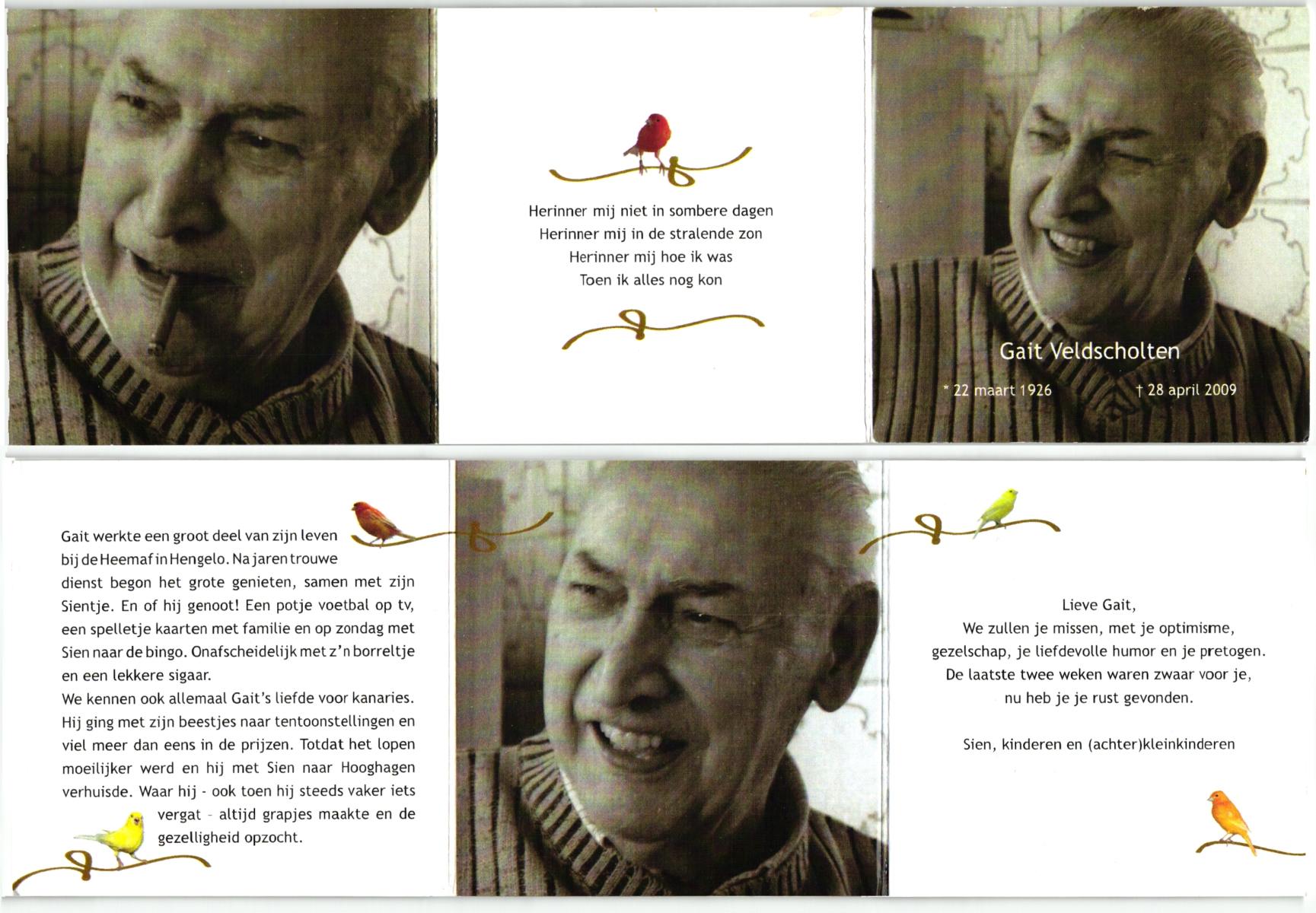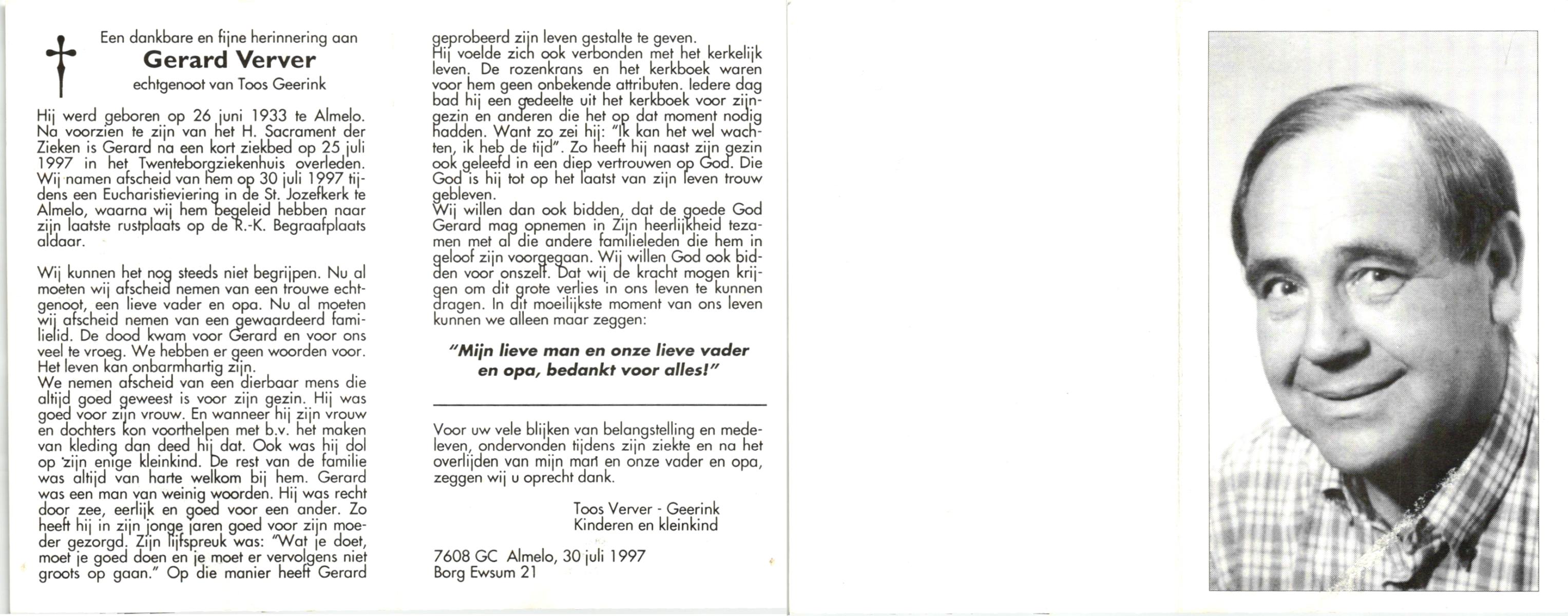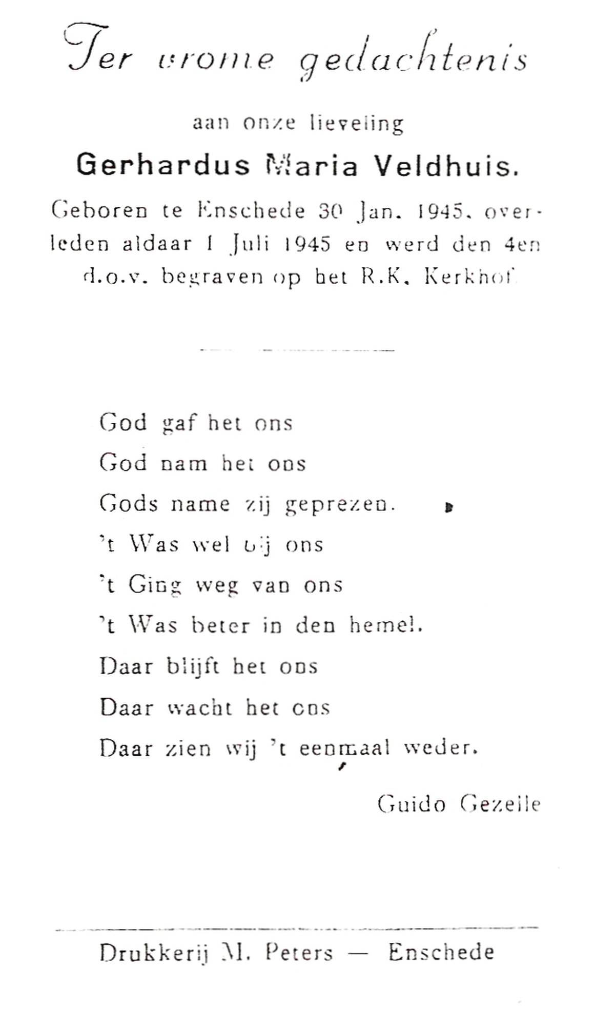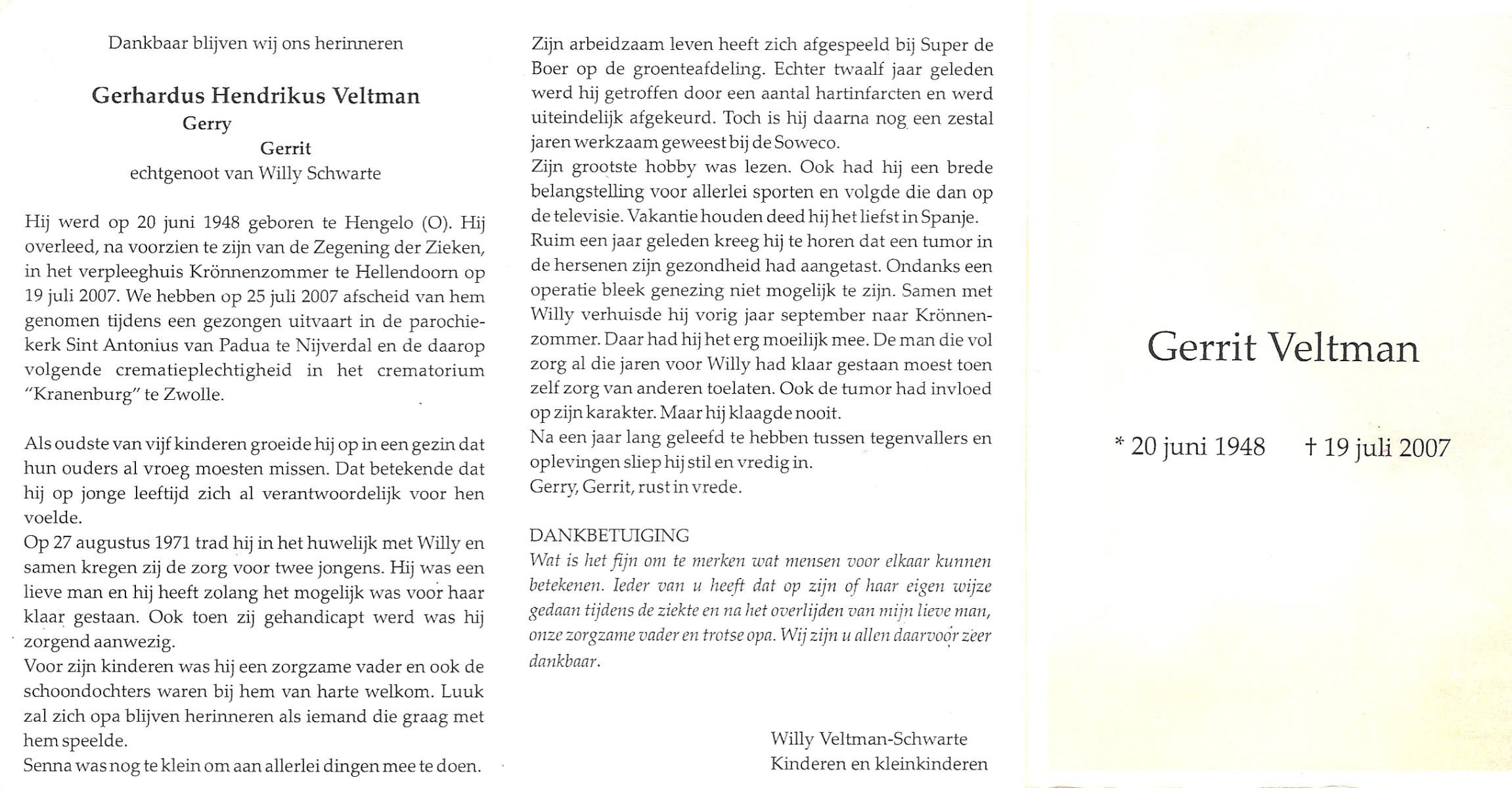 VELDHOF, Gerhardus, geboren op 7-1-1924 te Almelo, overleden op 21-9-1998 te Almelo op 74-jarige leeftijd, begraven op 25-9-1998 te Almelo.