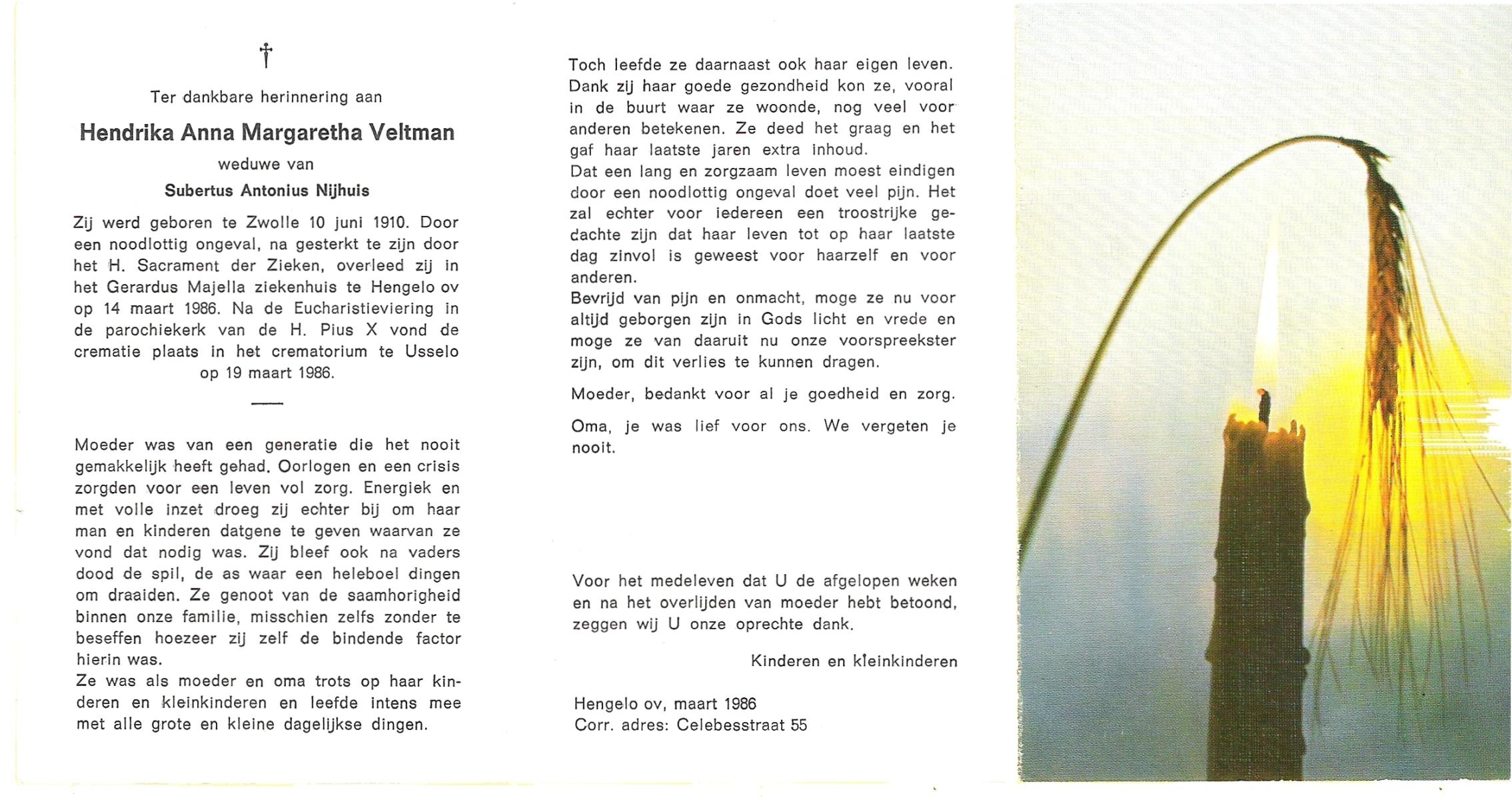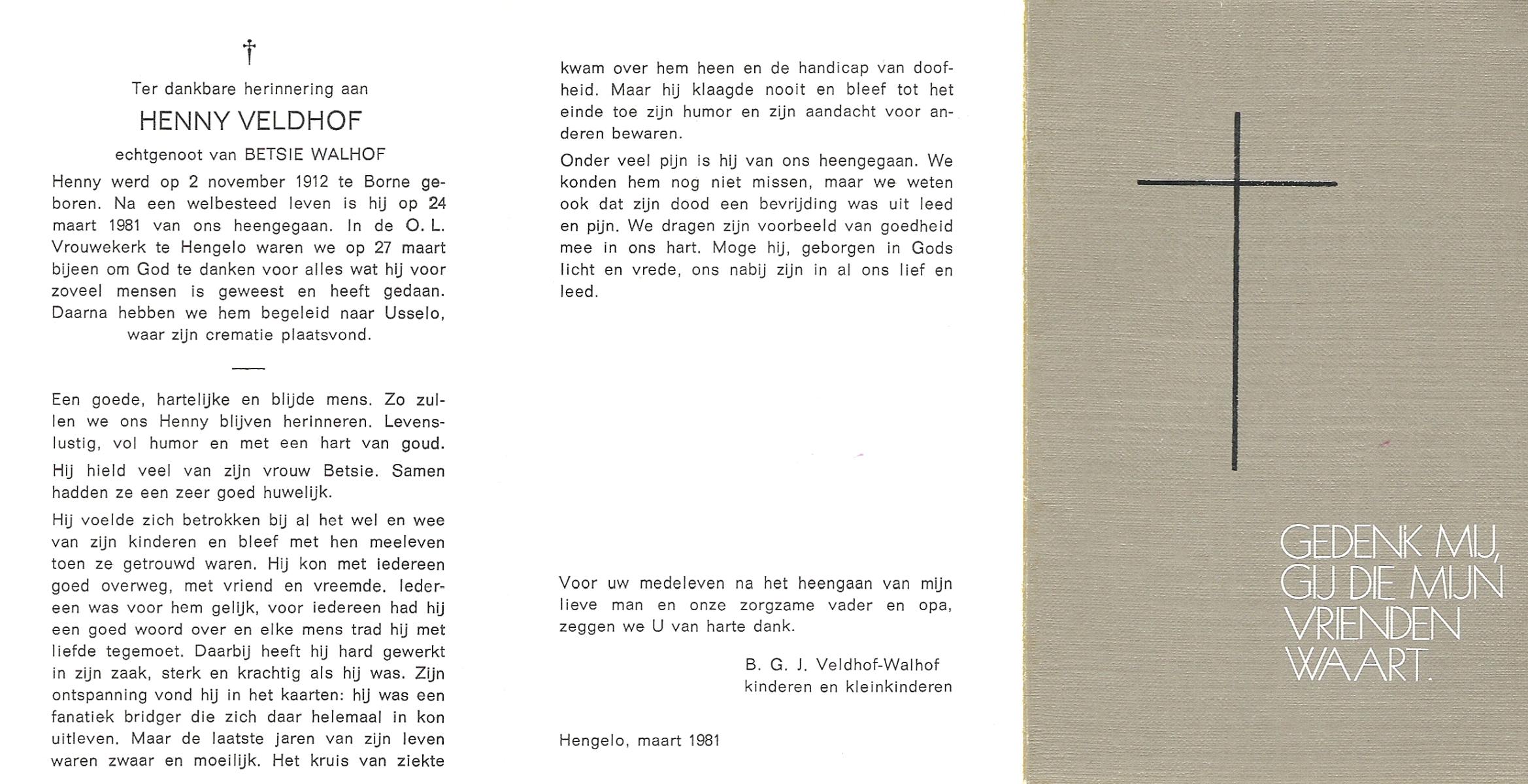 VELDHOF, Henny, geboren op 2-11-1912 te Borne, overleden op 24-3-1981 op 68-jarige leeftijd, gecremeerd op 27-3-1981 te Usselo.