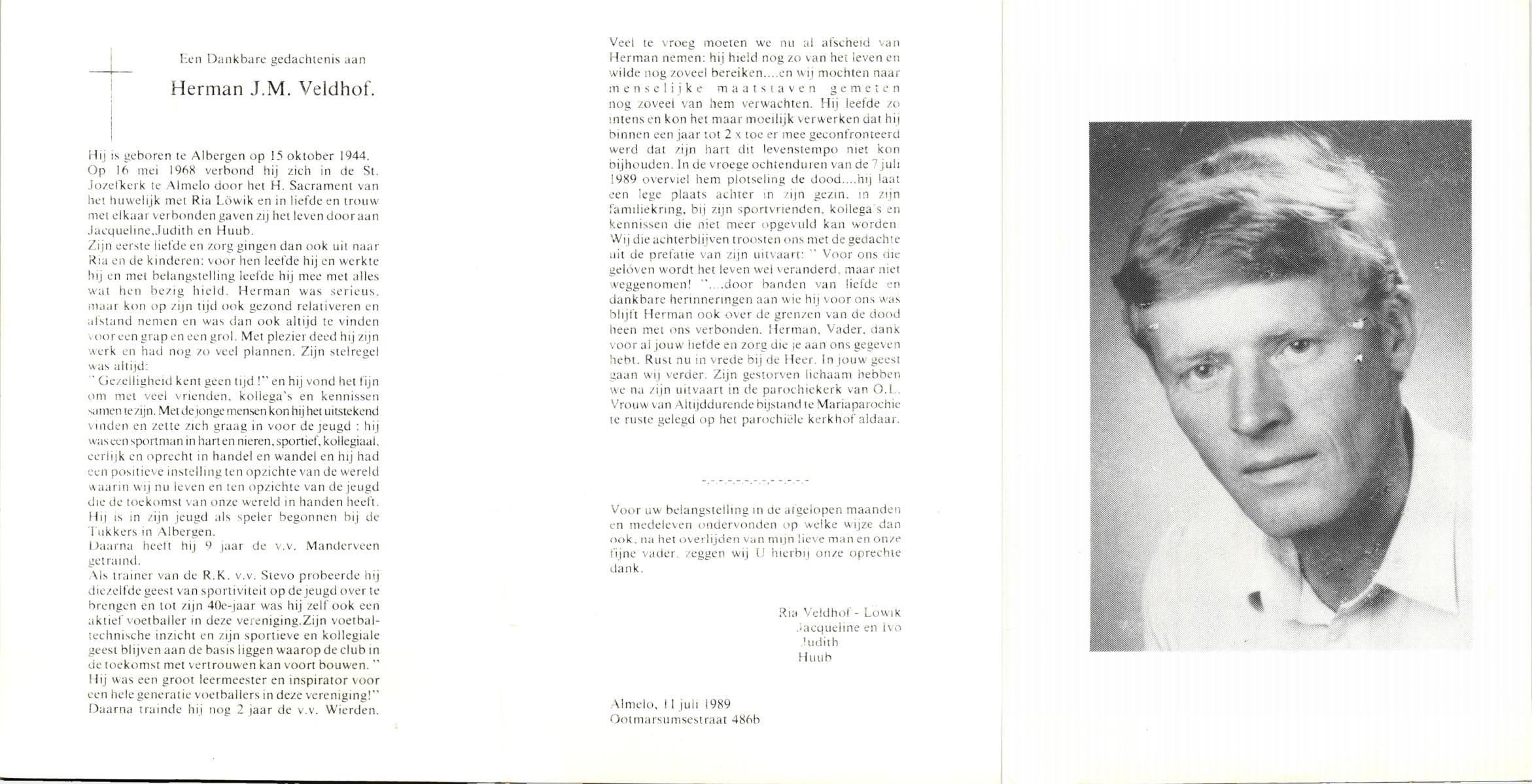 VELDHOF, Hermann J.M., geboren op 15-10-1944 te Albergen, overleden op 7-7-1989 op 44-jarige leeftijd, begraven op 11-7-1989 te Mariaparochie.