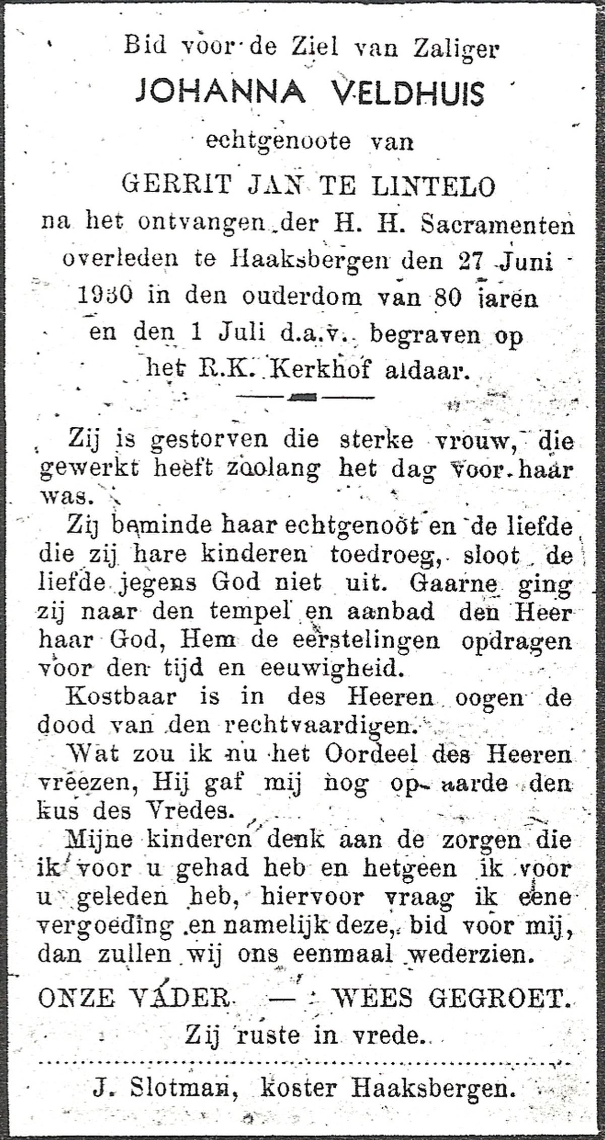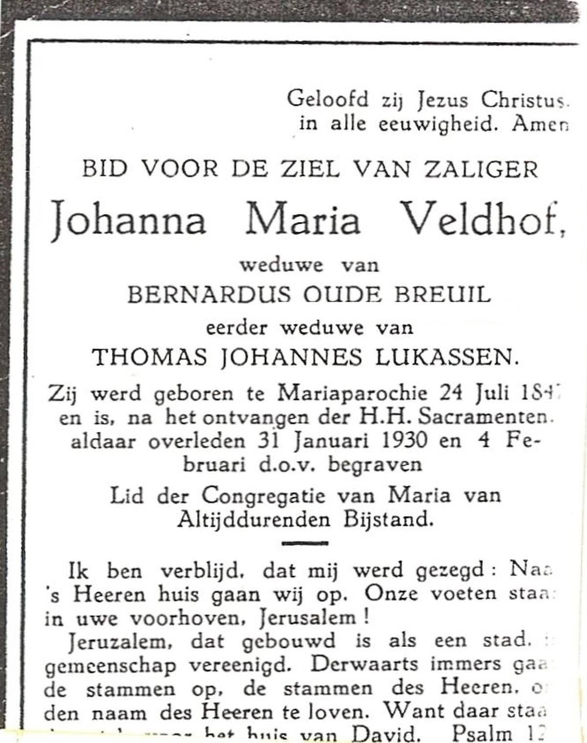VELDHOF, JOhanna Maria, geboren op 24-07-1847 te Mariaparochie, overleden op 31-1-1930 te Mariaparochie op 82-jarige leeftijd, begraven op 4-2-1930 te Mariaparochie.