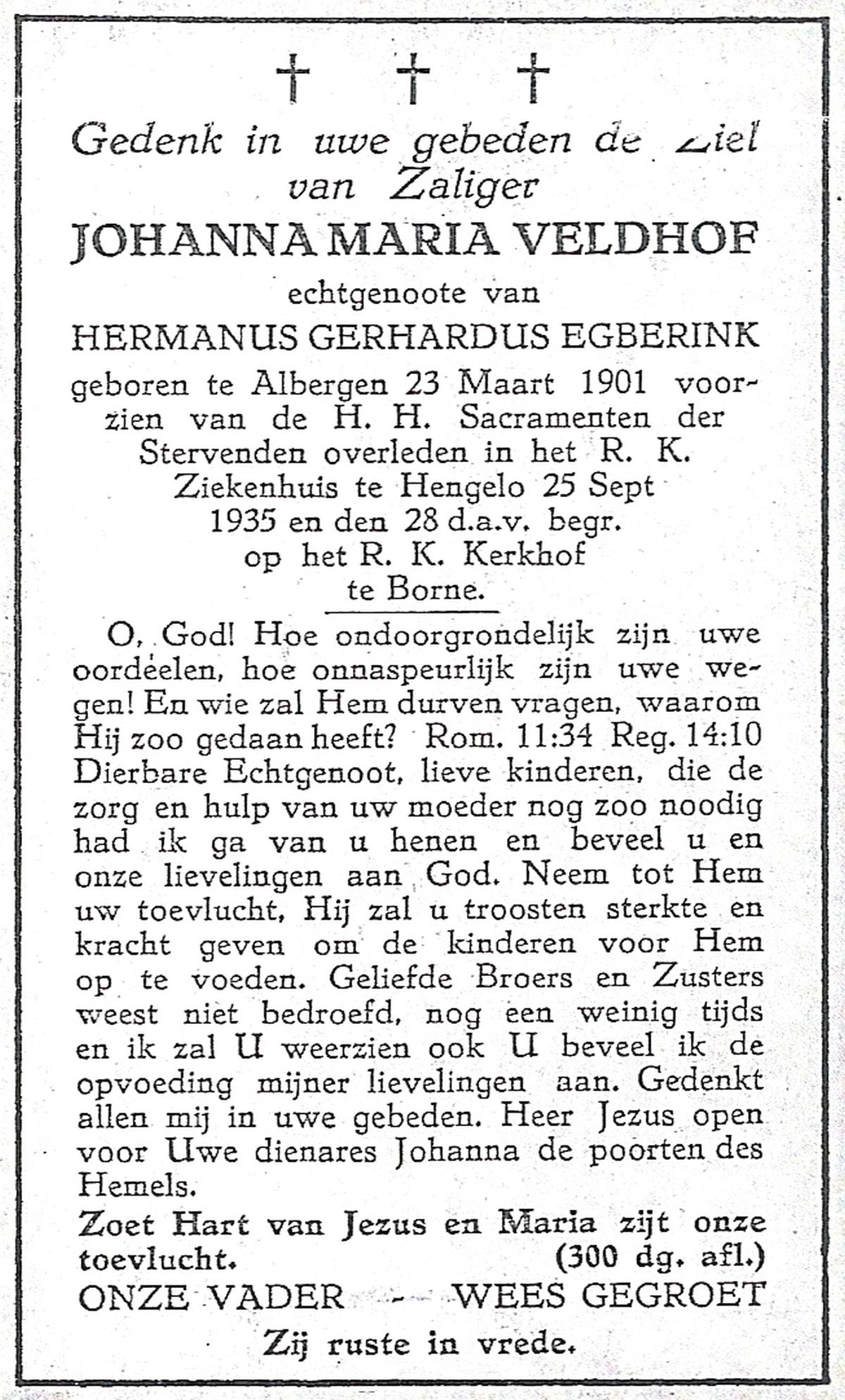 VELDHOF, Johanna Maria, geboren op 23-3-1901 te Albergen, overleden op 25-9-1935 te Hengelo (Ov.) op 34-jarige leeftijd, begraven op 28-9-1935 te Borne.