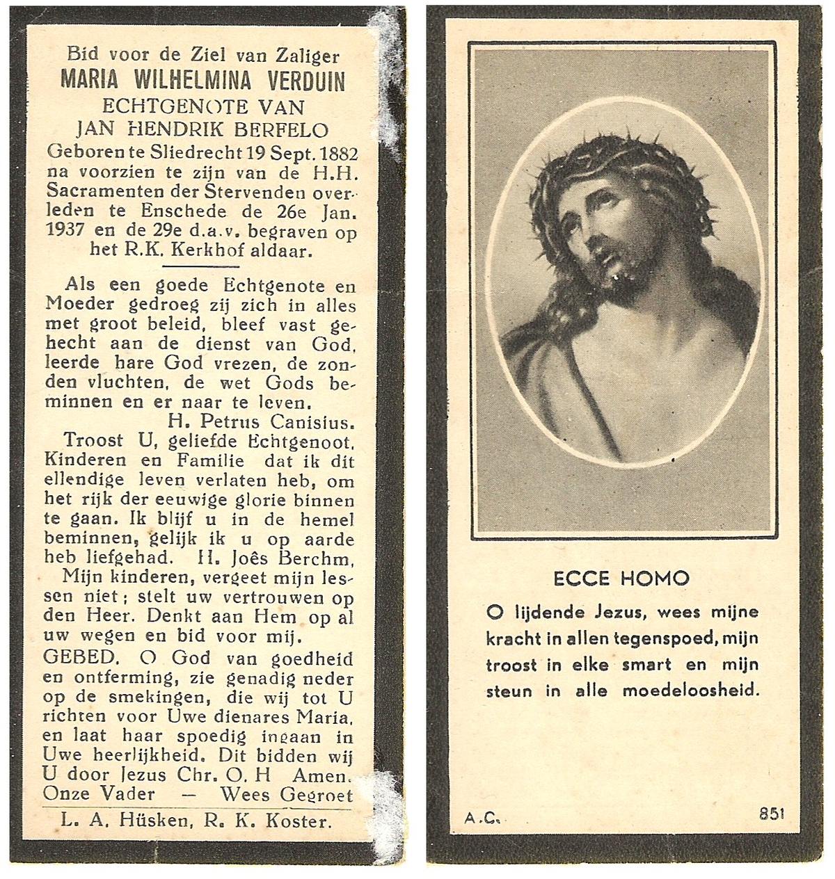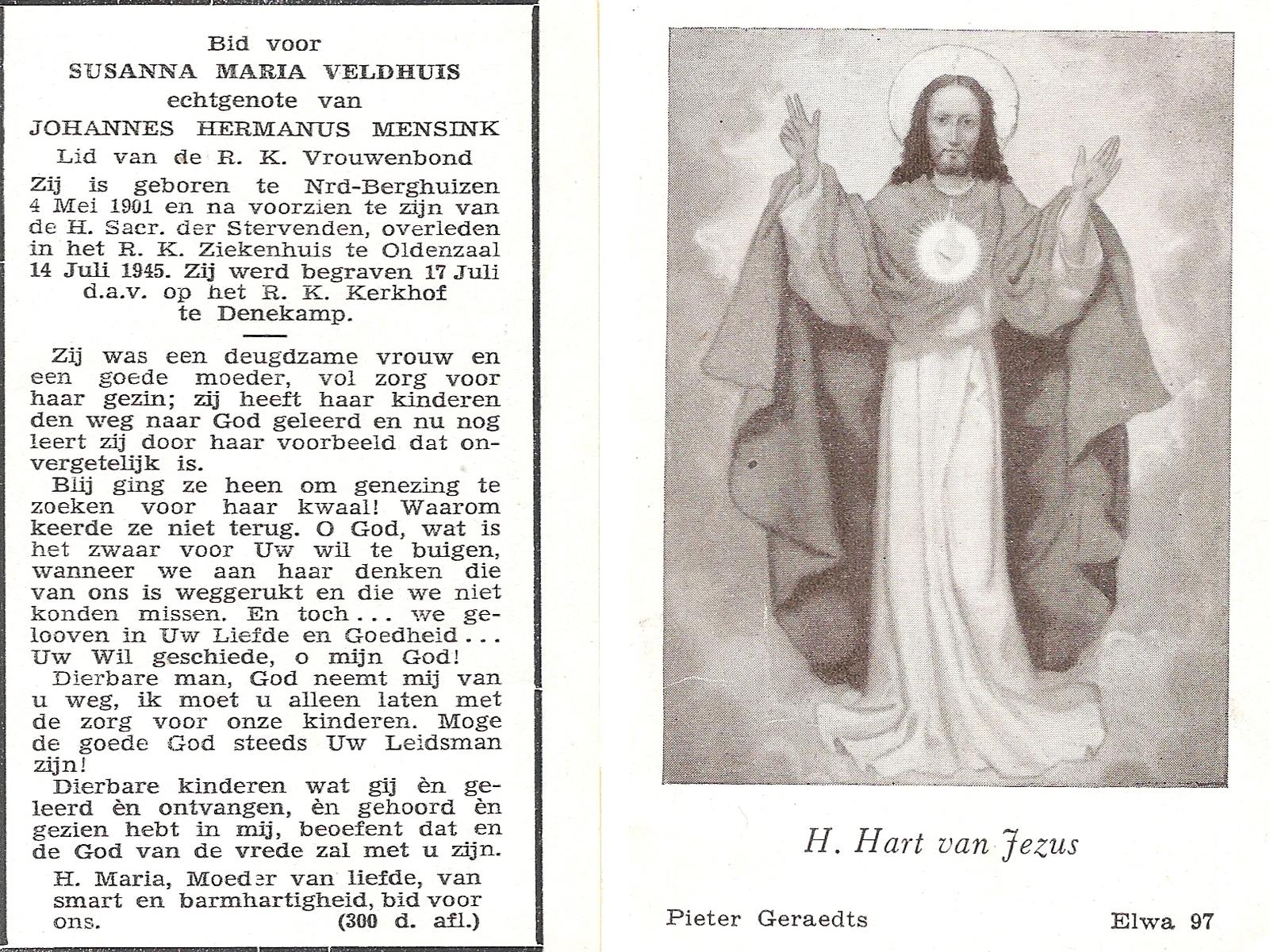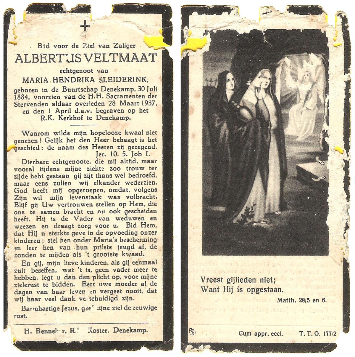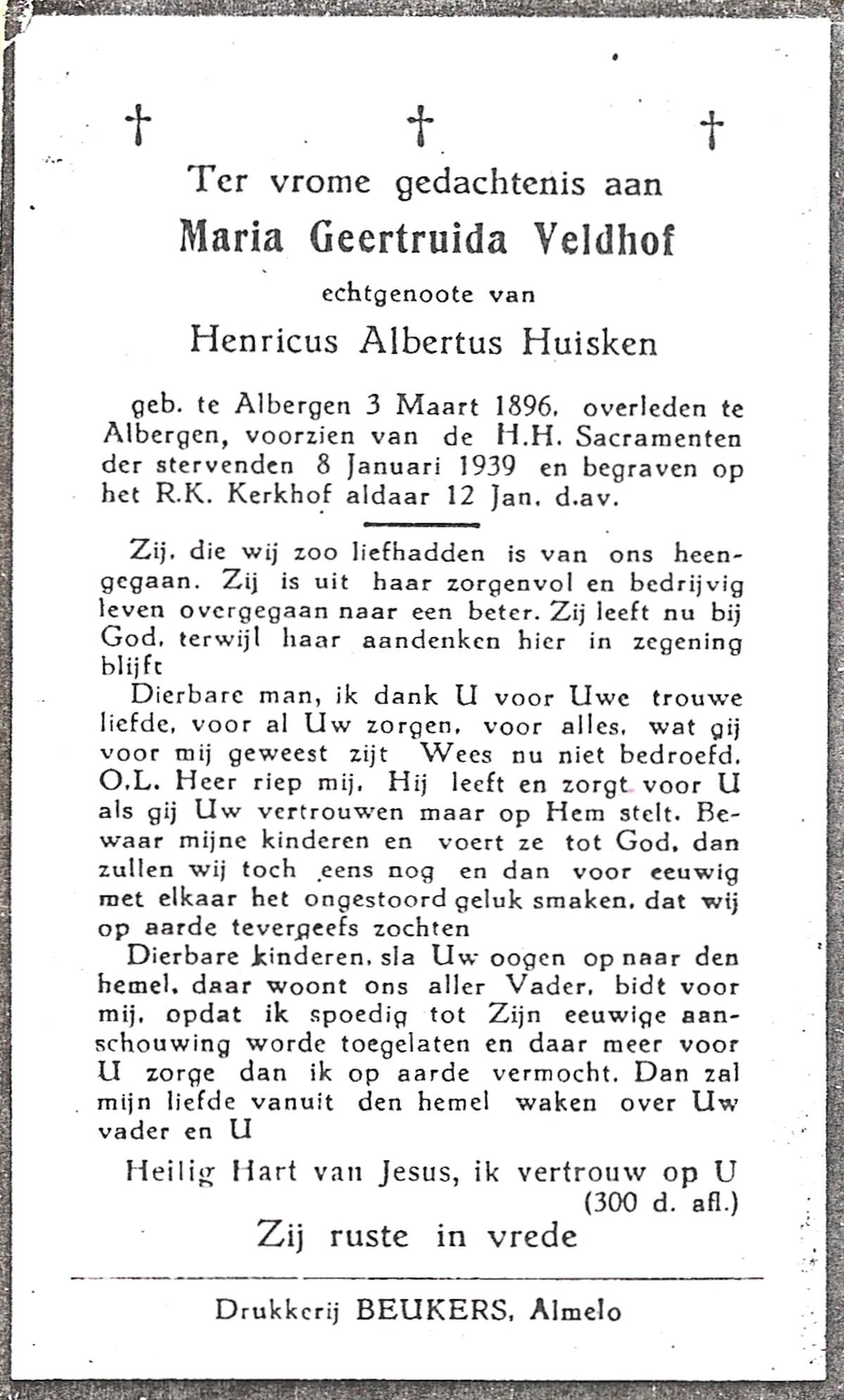 VELDHOF, Maria Geertruida, geboren op 03-03-1896 te Albergen, overleden op 8-1-1939 te Albergen op 42-jarige leeftijd, begraven op 12-1-1939 te Albergen.