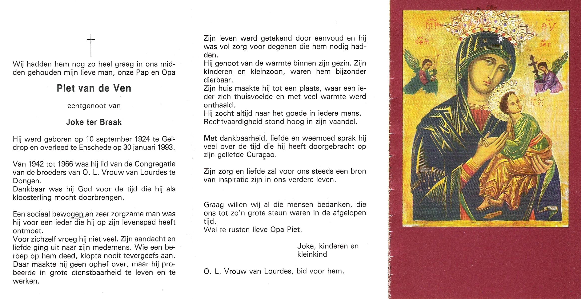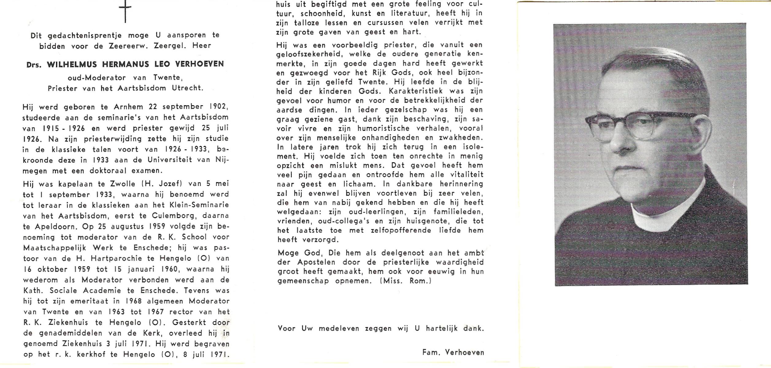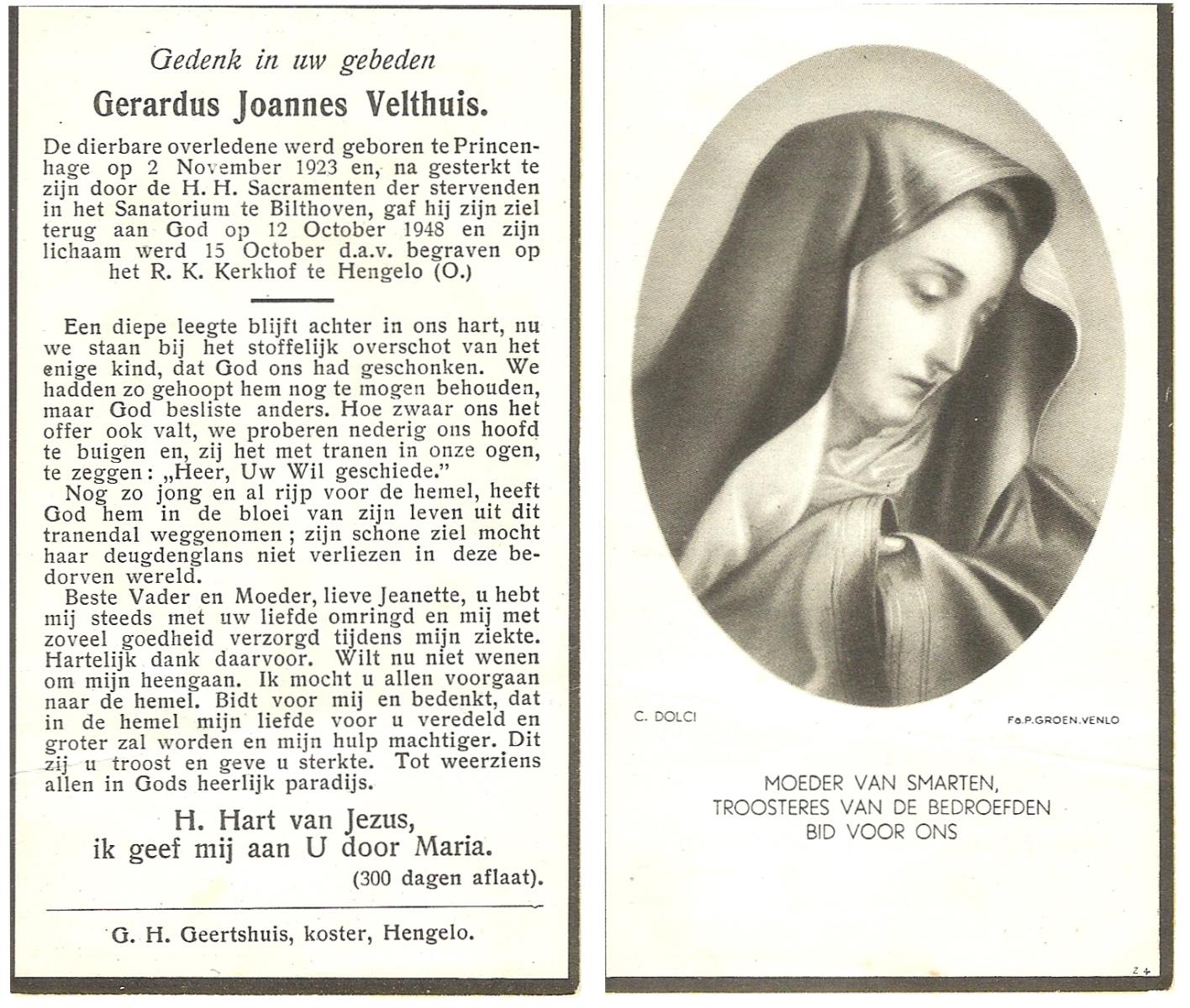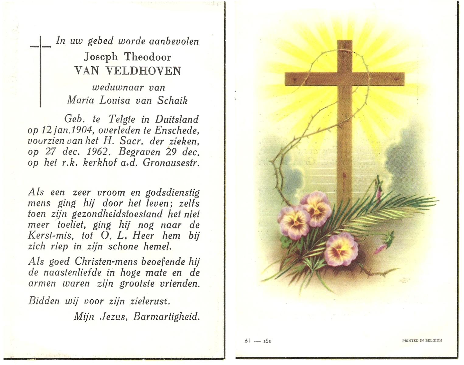 VELDHOVEN, van, Joseph Theodoor, geboren op 12-1-1904 te Telgte (Ddl.), overleden op 27-12-1962 te Enschede op 58-jarige leeftijd, begraven op 29-12-1962 te Enschede R.K.Kerhof Gronausestraat.