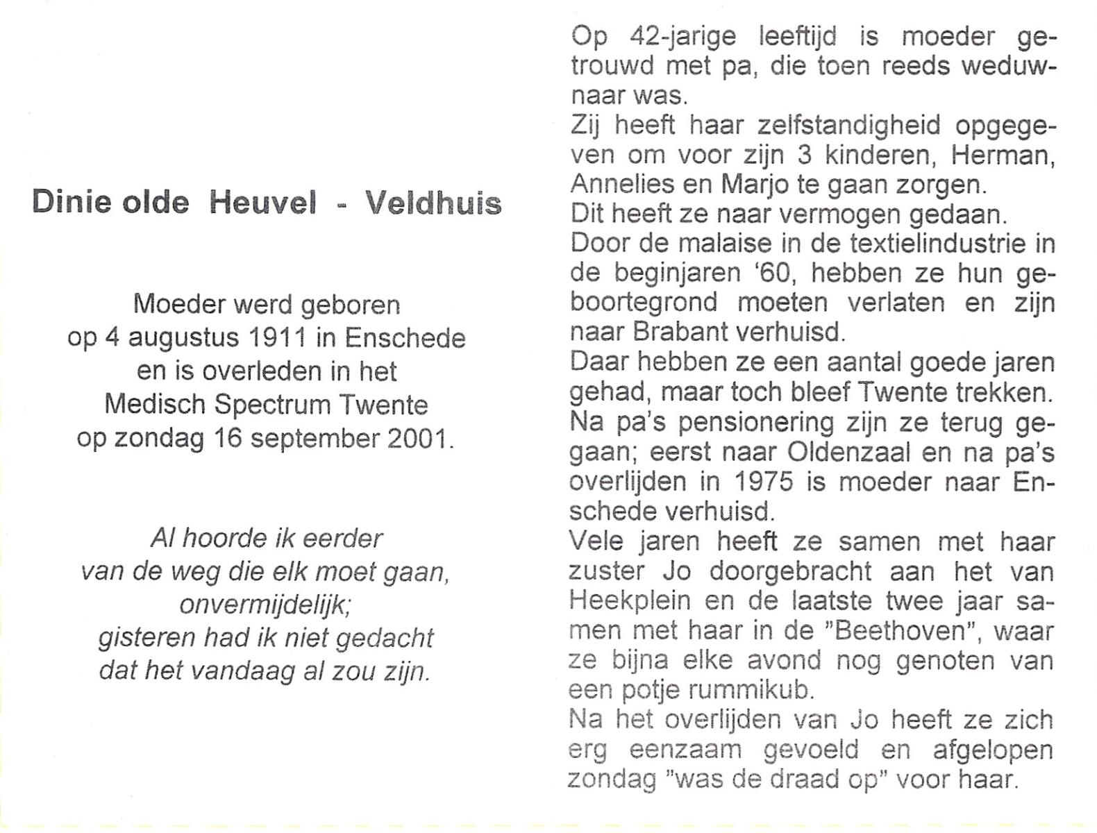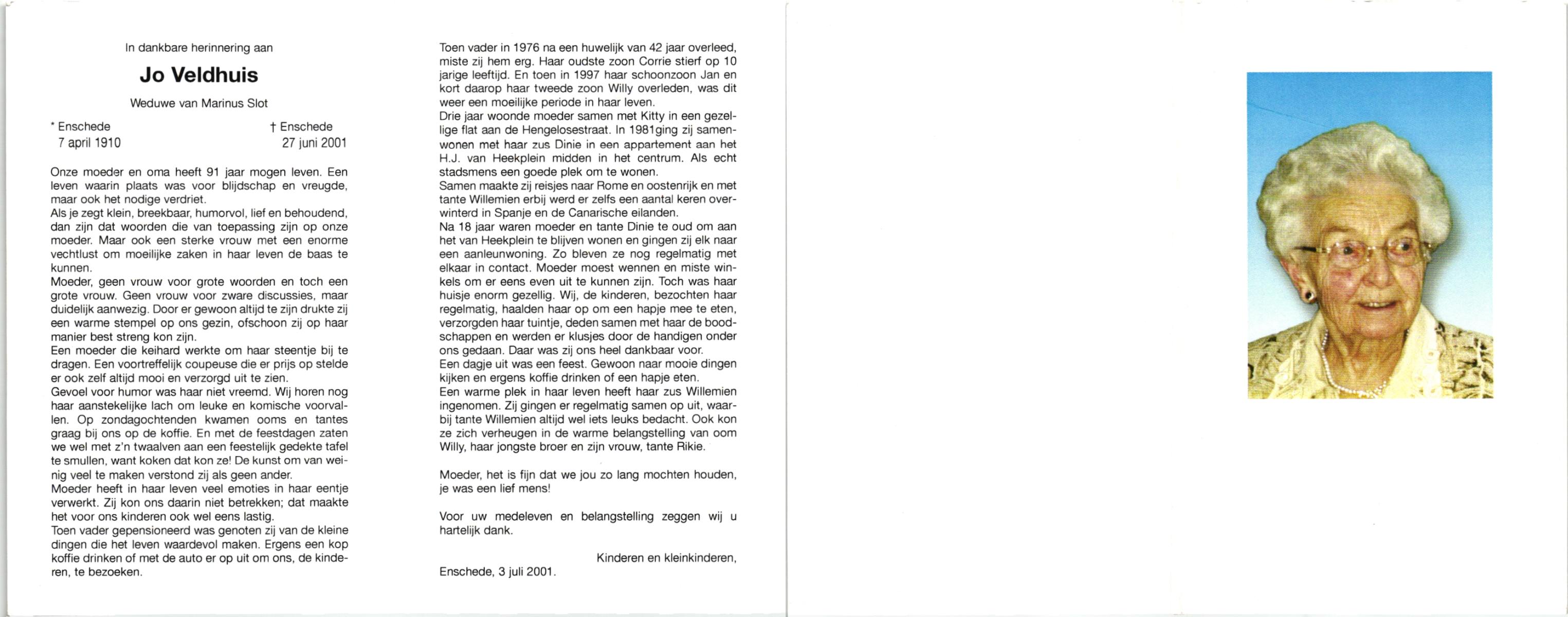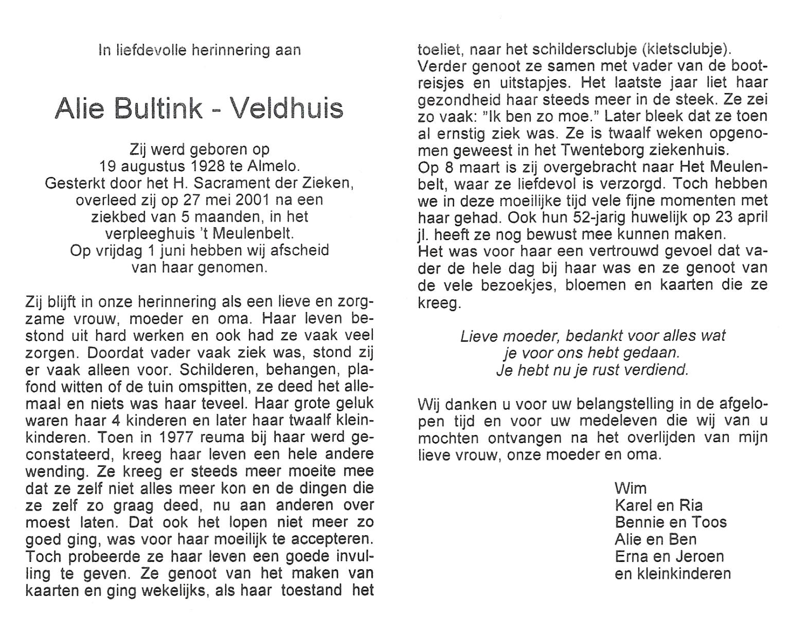 VELDHUIS, Alie, geboren op 19-8-1928 te Almelo, overleden op 27-5-2001 te Almelo op 72-jarige leeftijd.