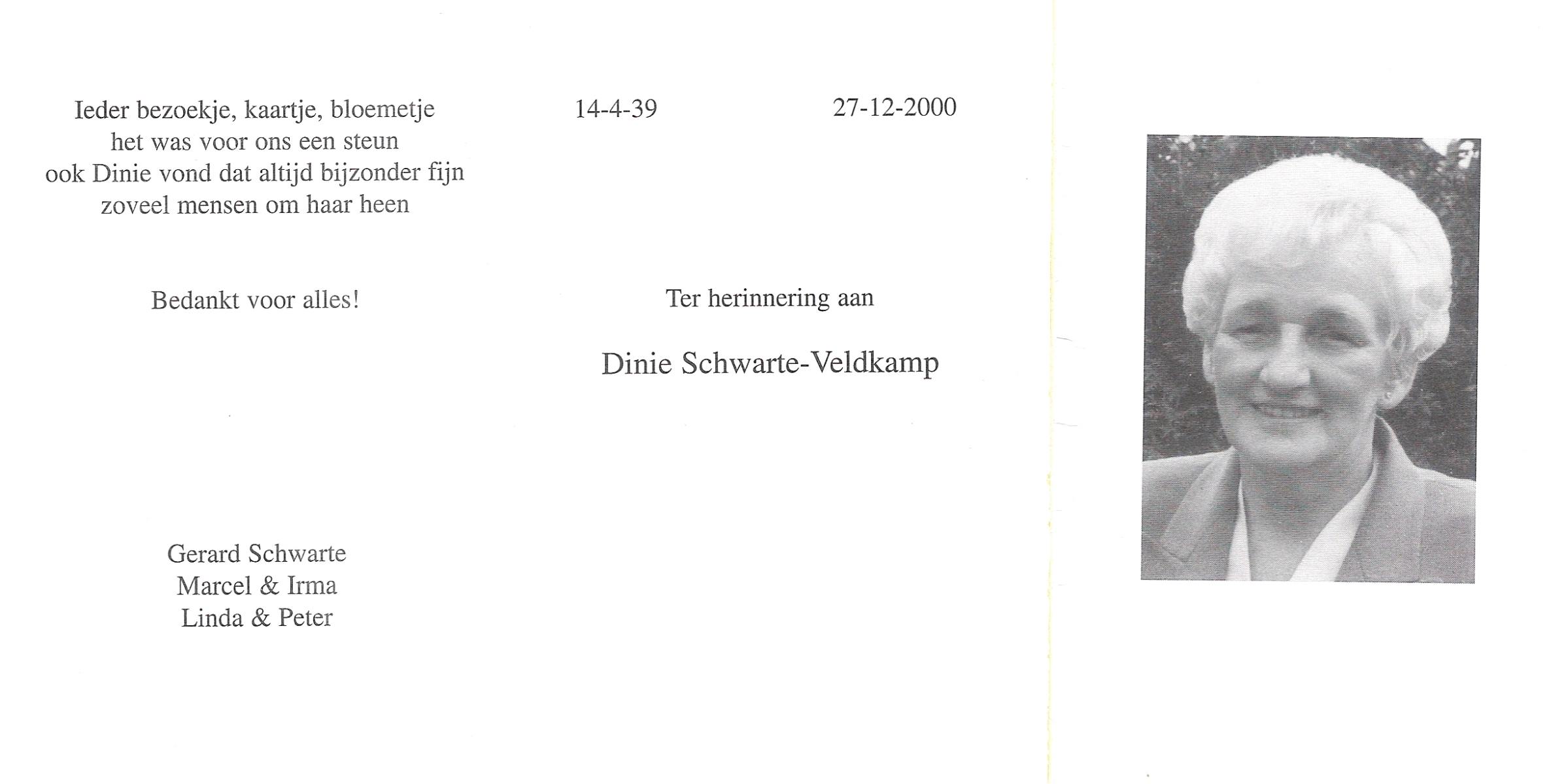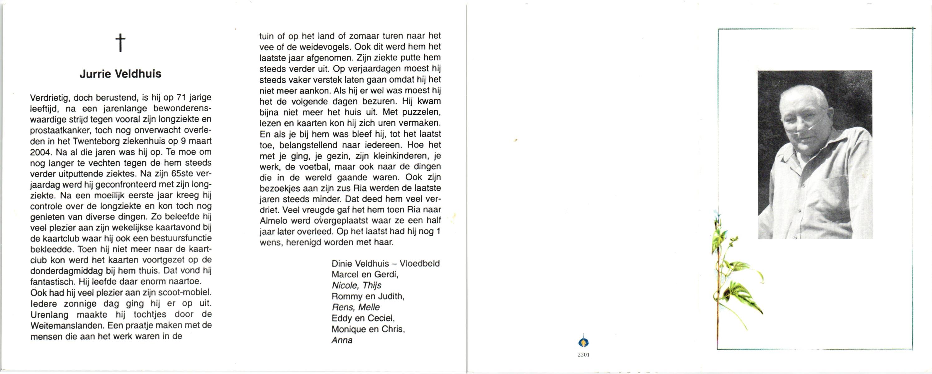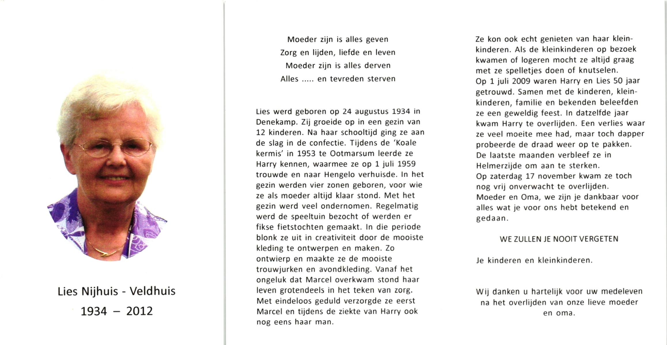 VELDHUIS, Alie, geboren op 19-8-1928 te Almelo, overleden op 27-5-2001 te Almelo op 72-jarige leeftijd.