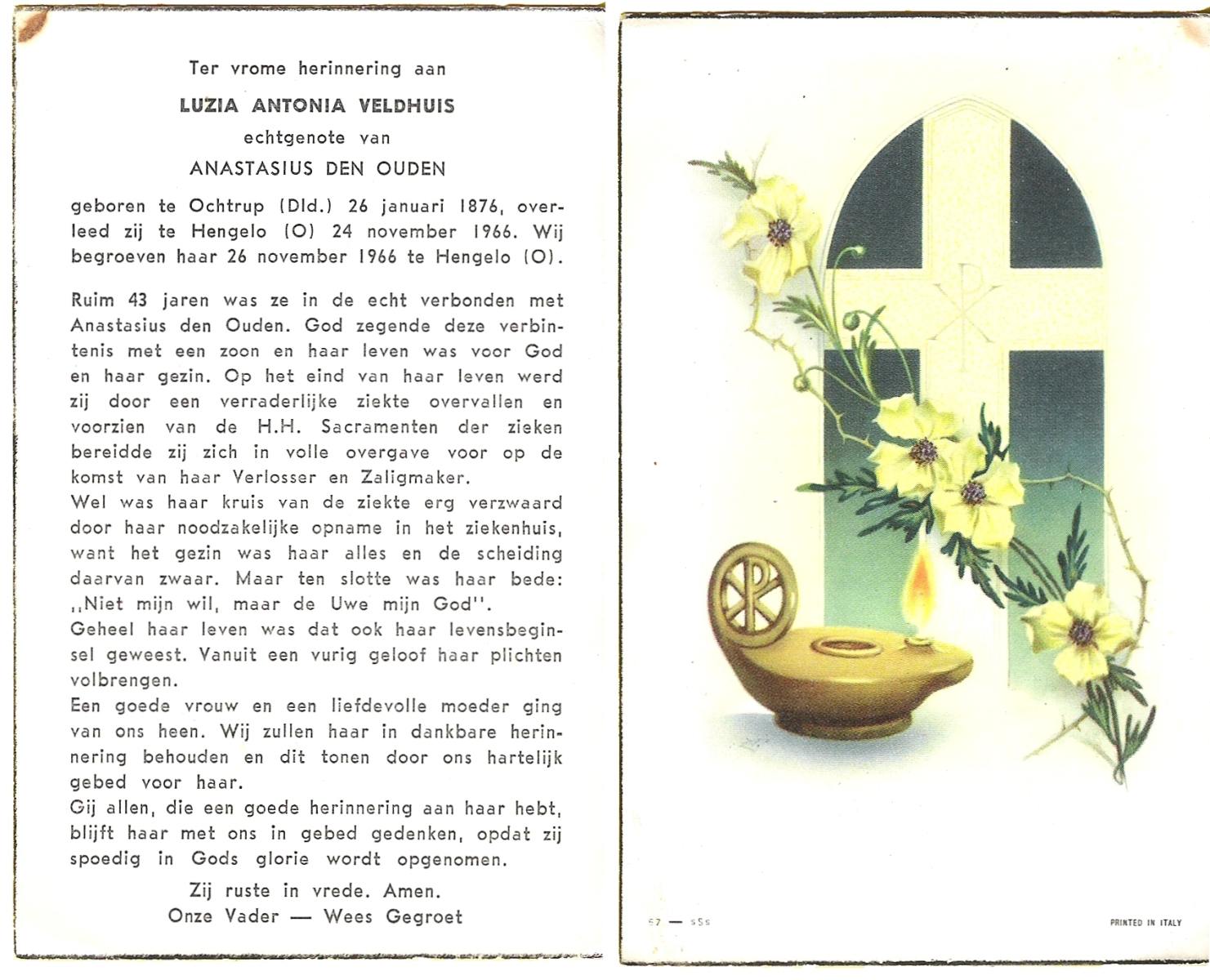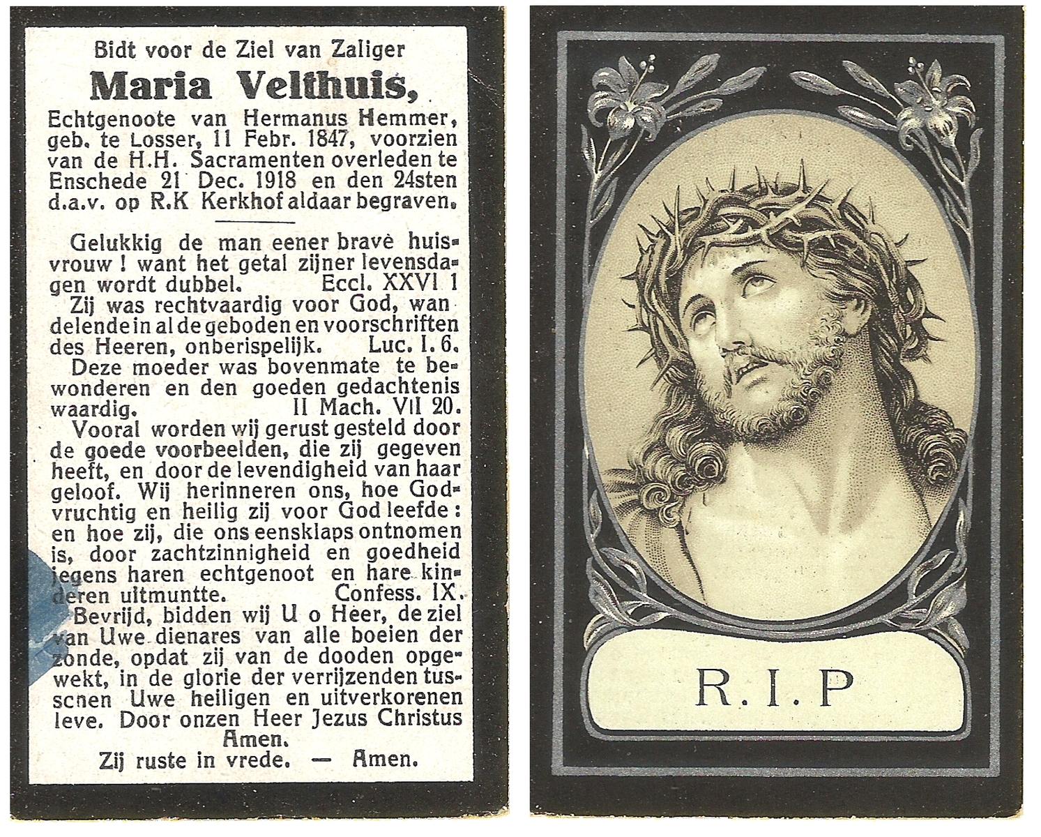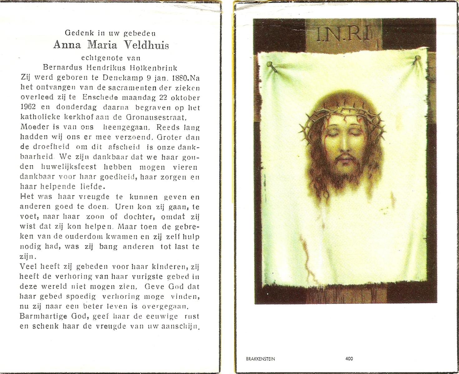 VELDHUIS, Anna Maria, geboren op 09-01-1880 te Denekamp, overleden op 22-10-1962 te Enschede op 82-jarige leeftijd, begraven te Enschede R.K.Kerhof.