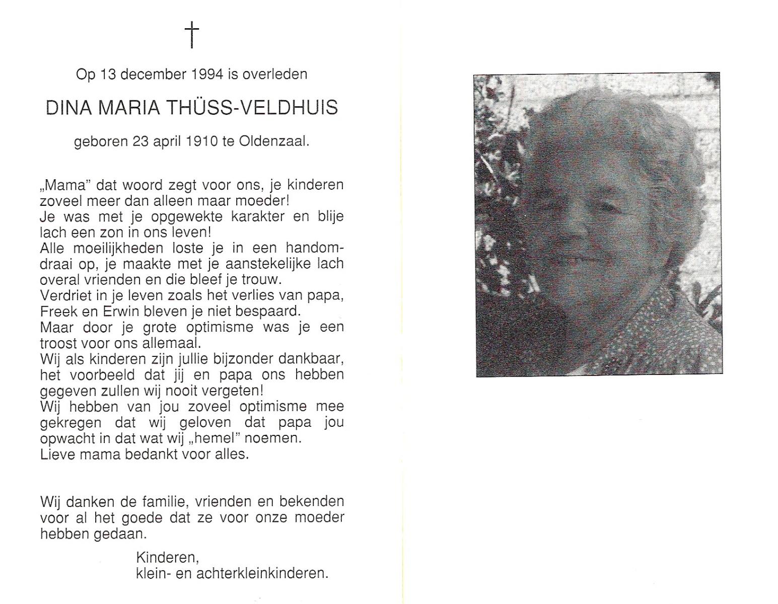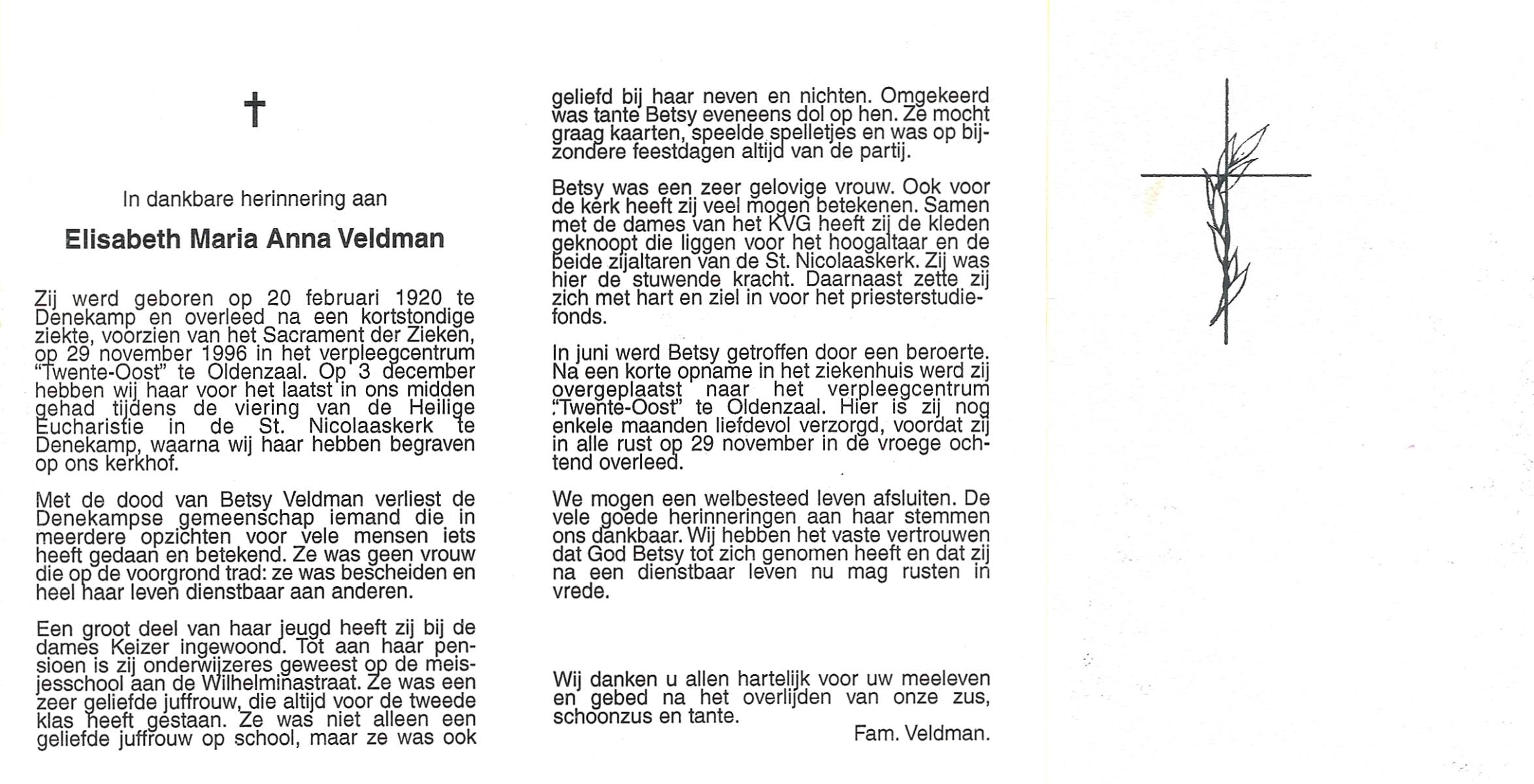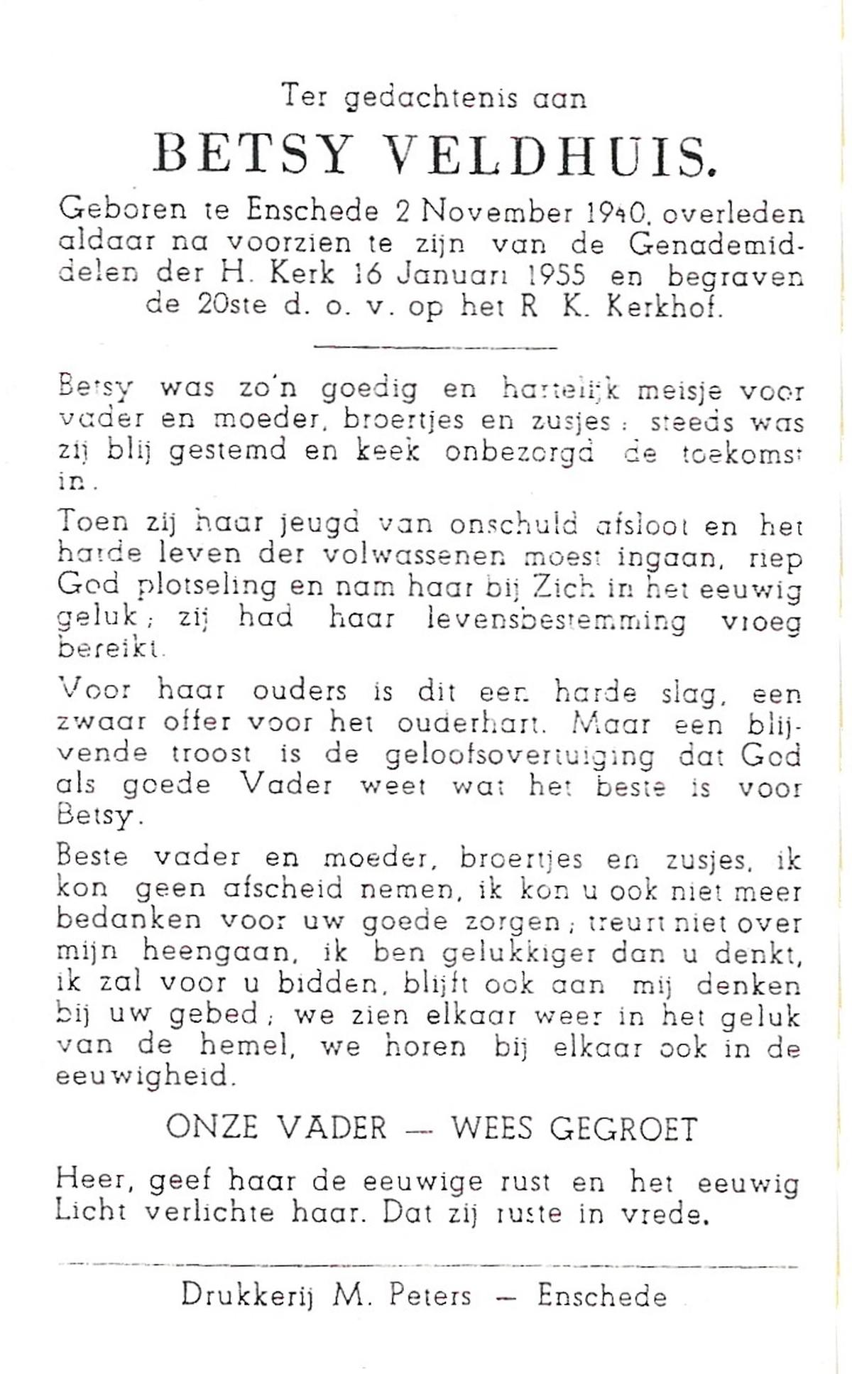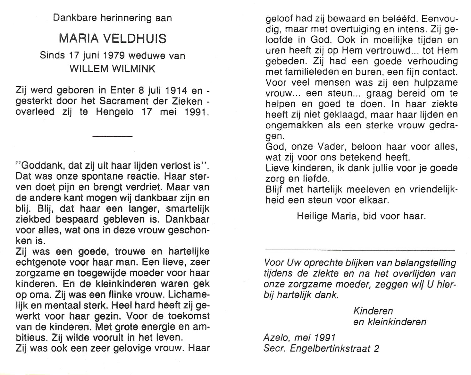 VELDHUIS, Anna Maria, geboren op 09-01-1880 te Denekamp, overleden op 22-10-1962 te Enschede op 82-jarige leeftijd, begraven te Enschede R.K.Kerhof.