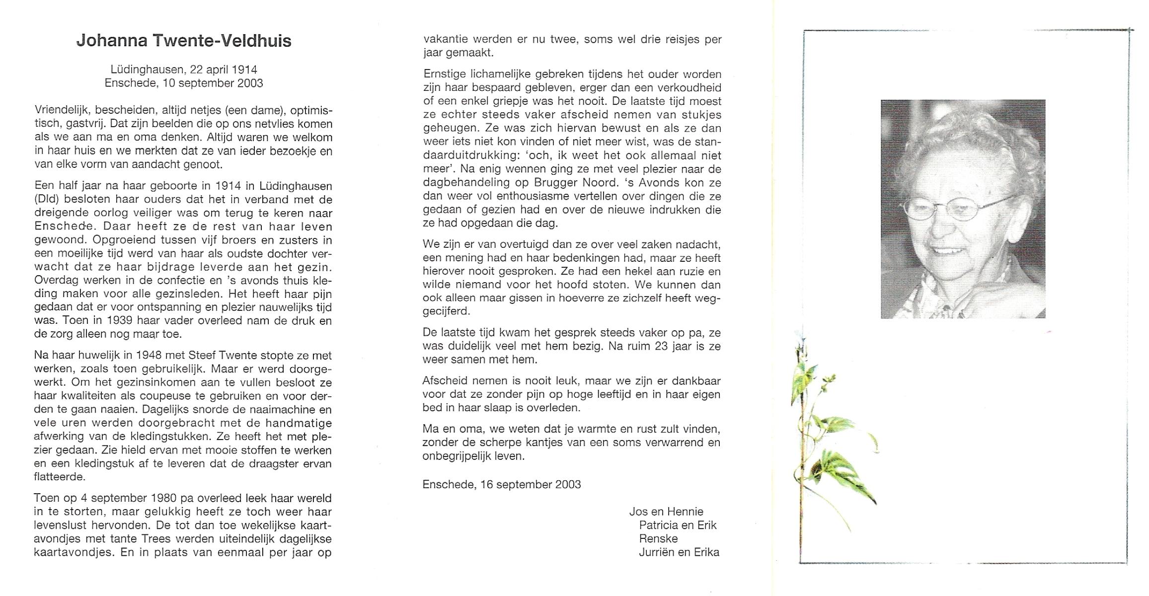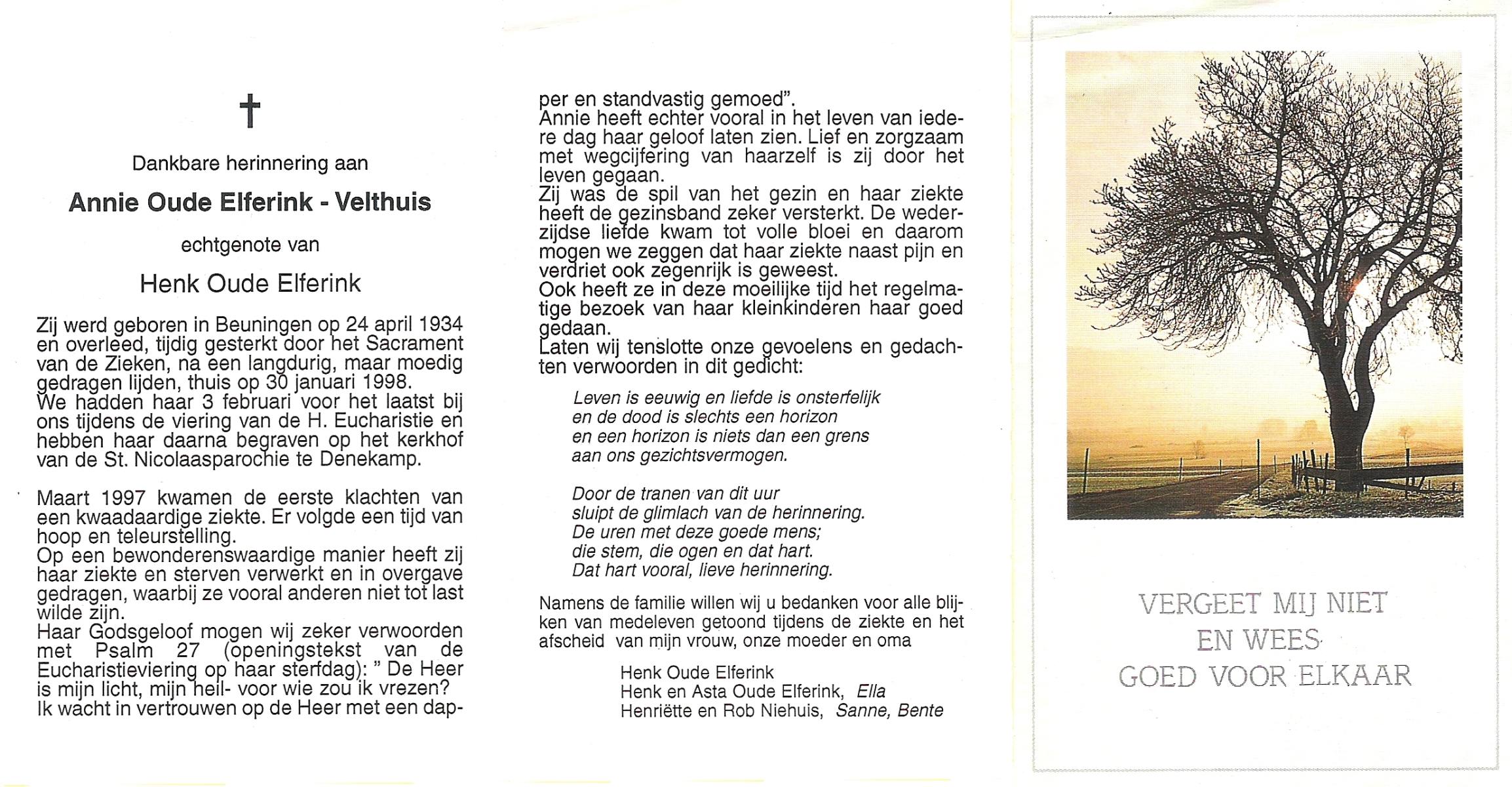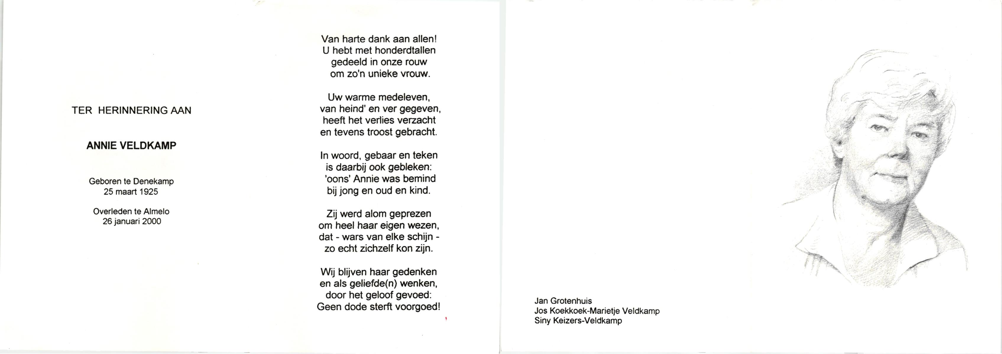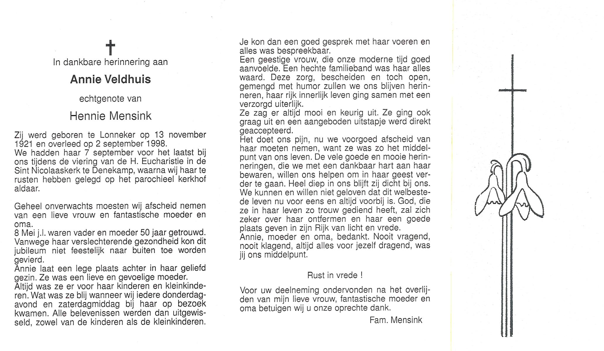 VELDHUIS, Annie, geboren op 13-11-1921 te Lonneker, overleden op 2-9-1998 op 76-jarige leeftijd, begraven op 7-9-1998 te Denekamp.