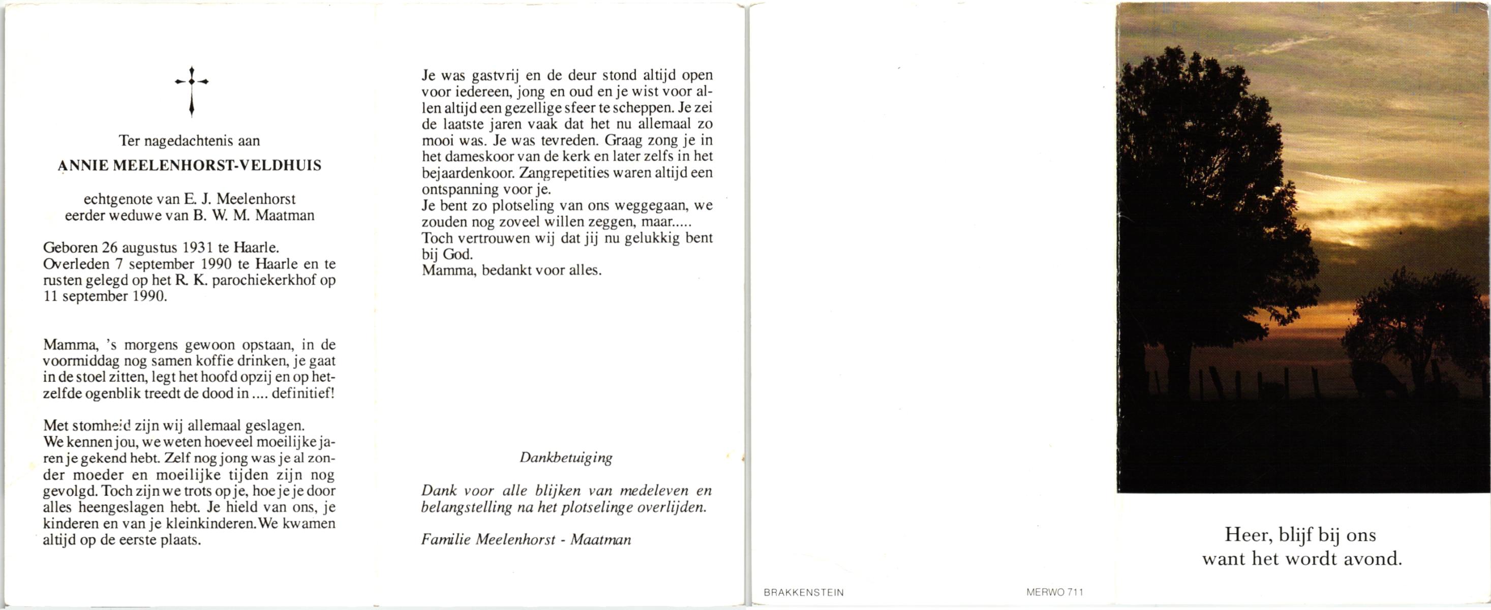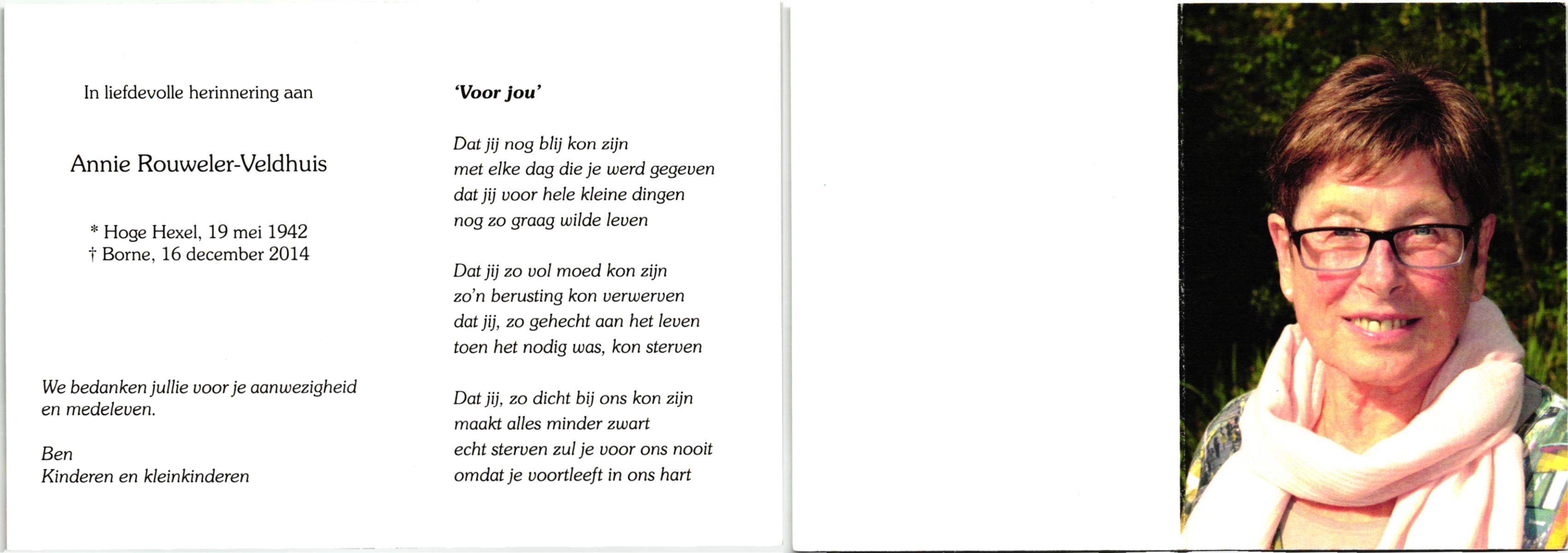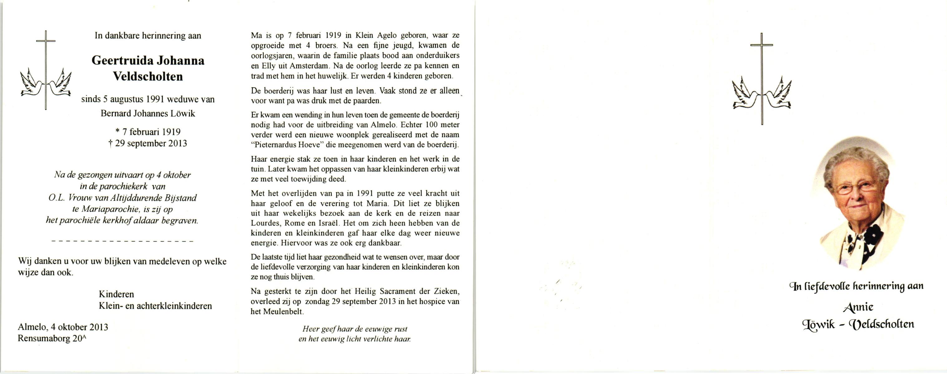 VELDHUIS, Annie, geboren op 13-11-1921 te Lonneker, overleden op 2-9-1998 op 76-jarige leeftijd, begraven op 7-9-1998 te Denekamp.