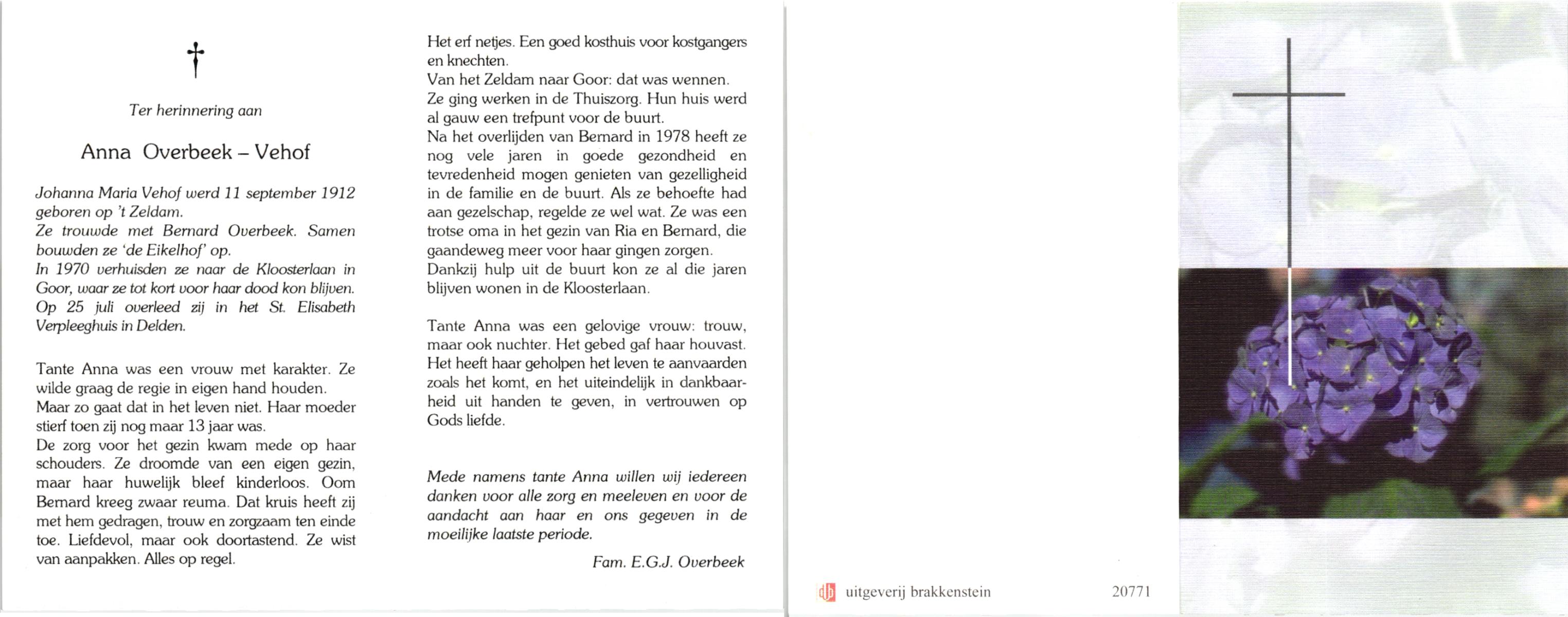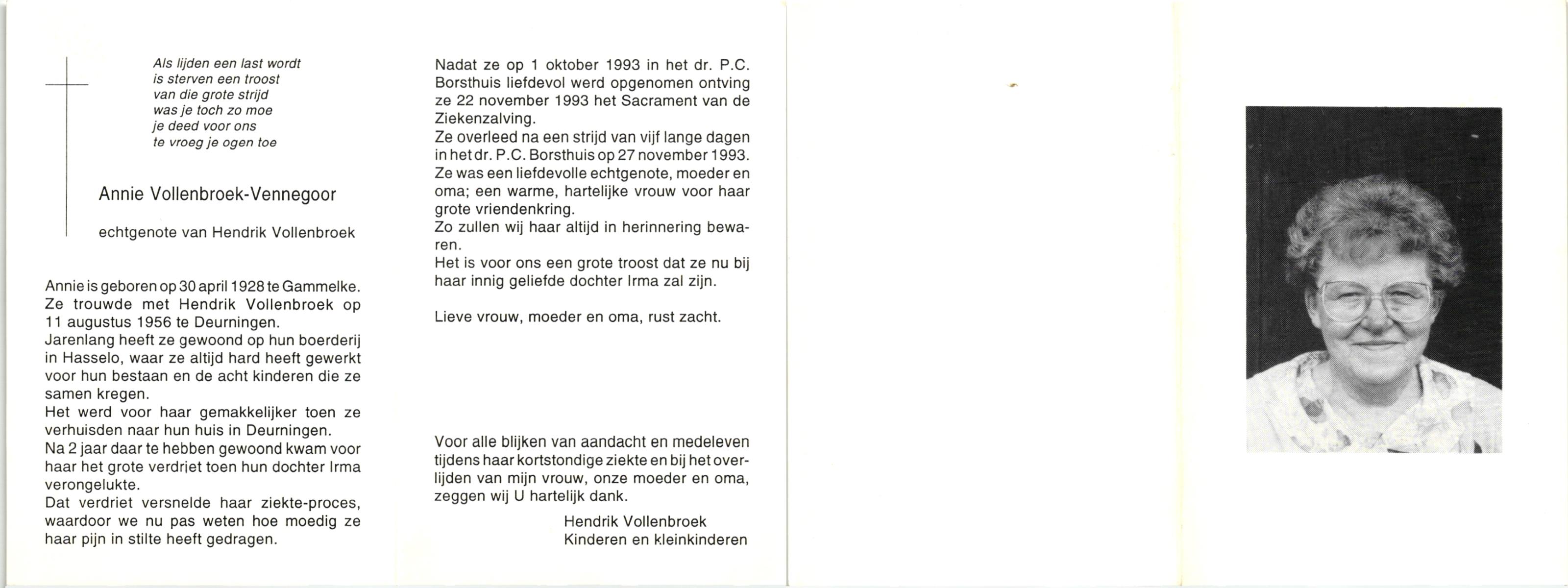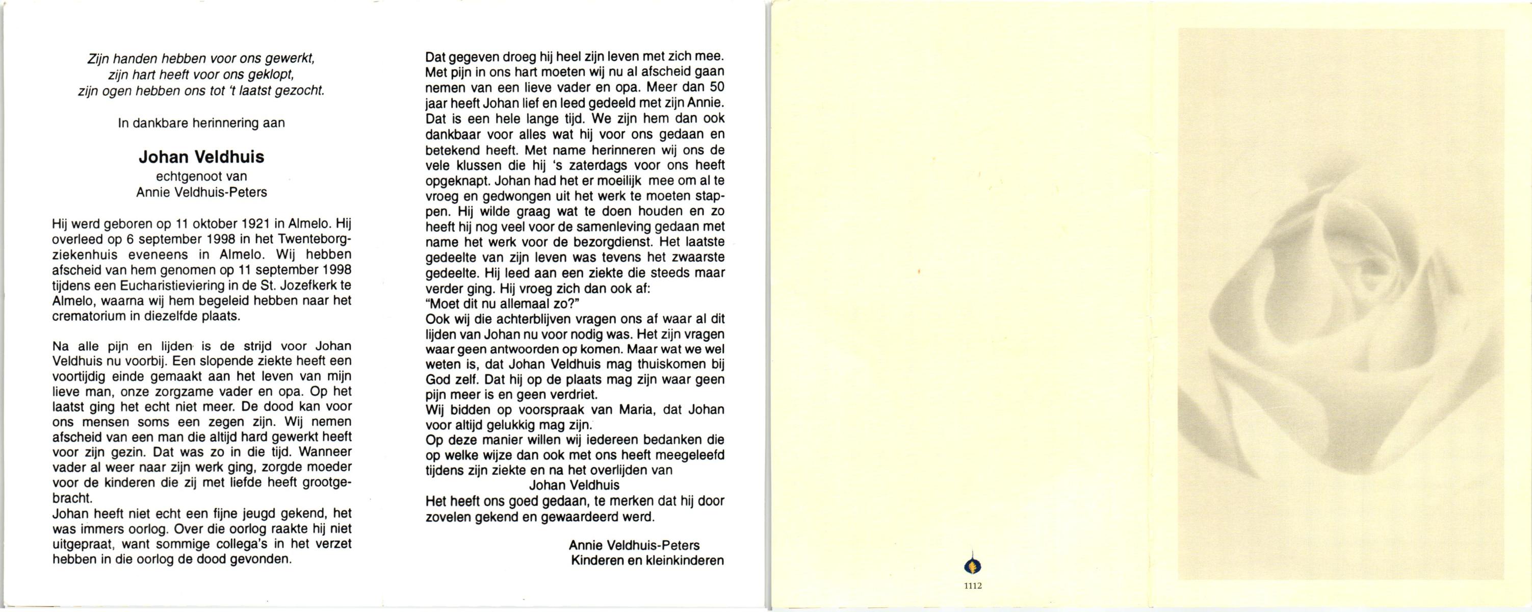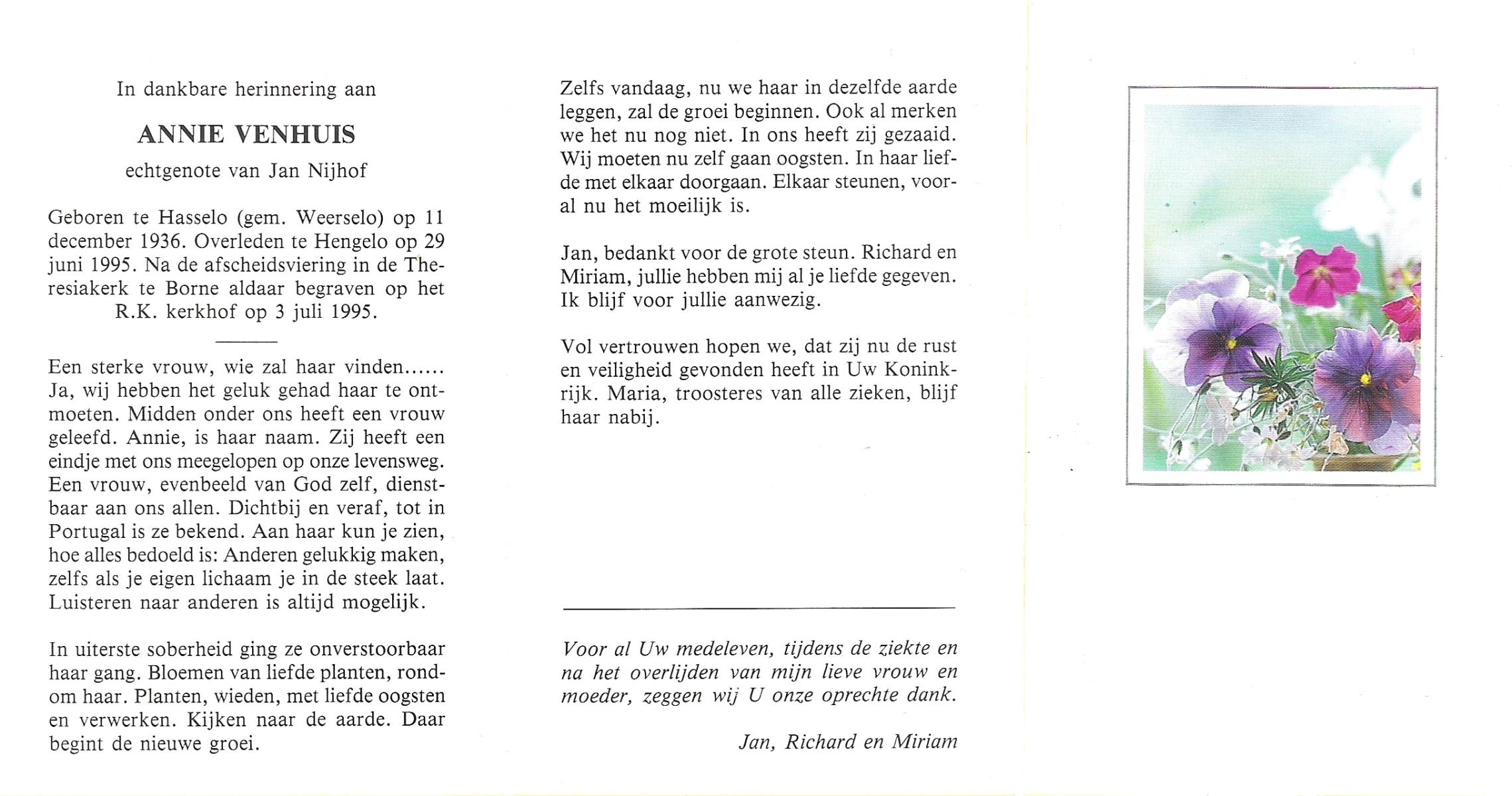 VELDHUIS, Annie, geboren op 13-11-1921 te Lonneker, overleden op 2-9-1998 op 76-jarige leeftijd, begraven op 7-9-1998 te Denekamp.