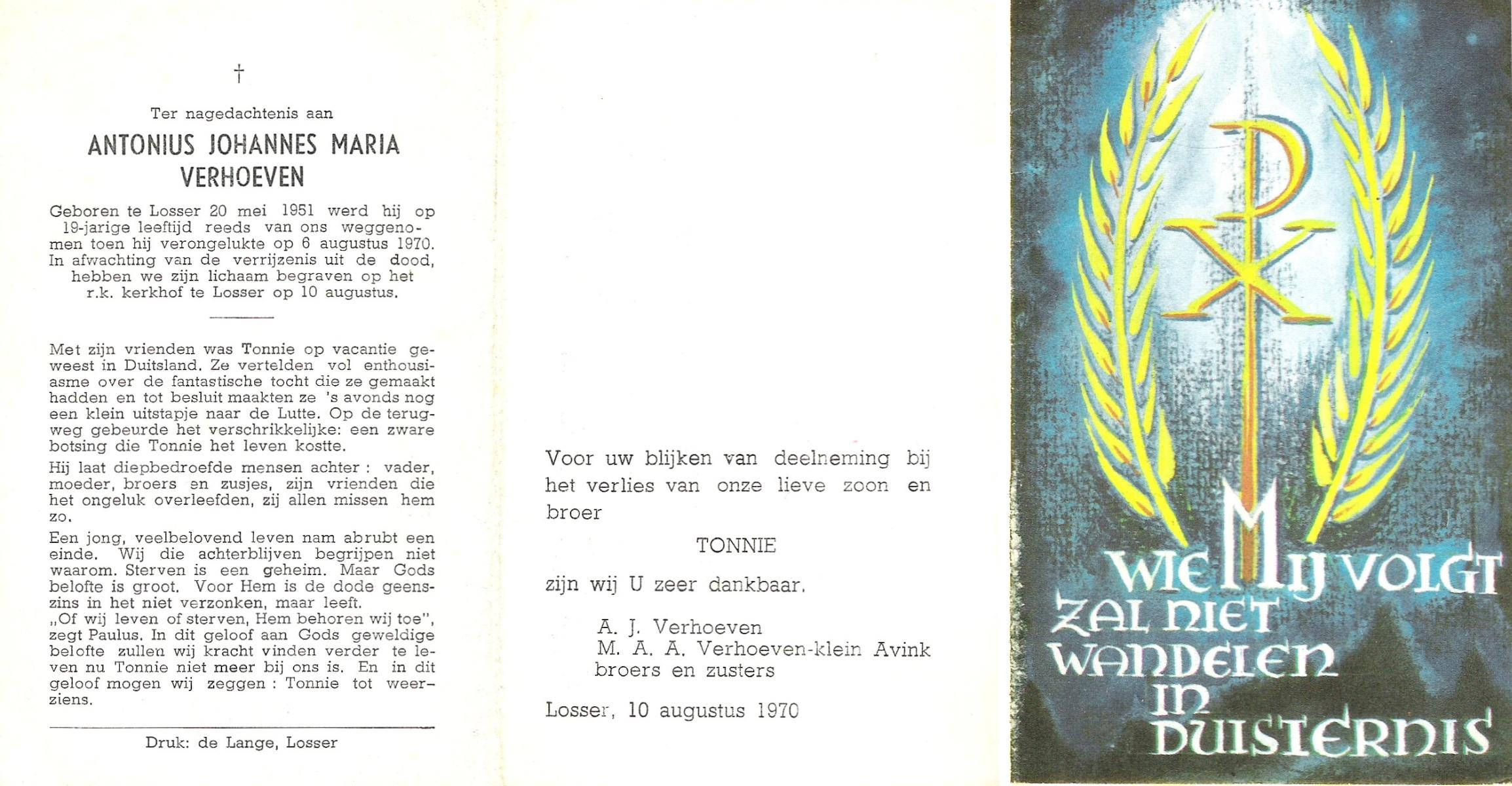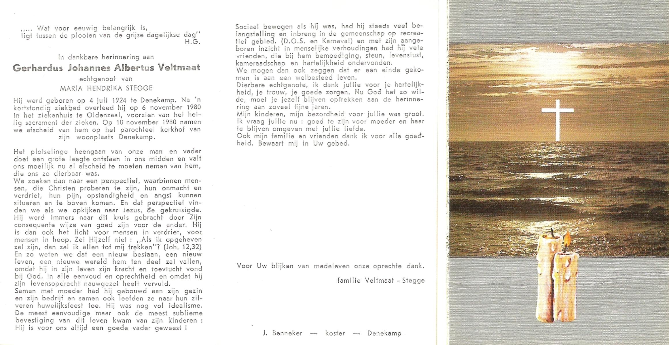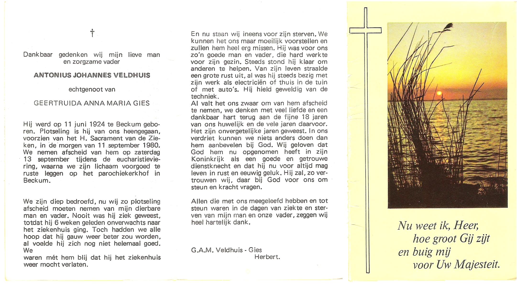 VELDHUIS, Antonius Johannes, geboren op 11-6-1924 te Beckum, overleden op 11-9-1980 op 56-jarige leeftijd, begraven op 13-9-1980 te Beckum.