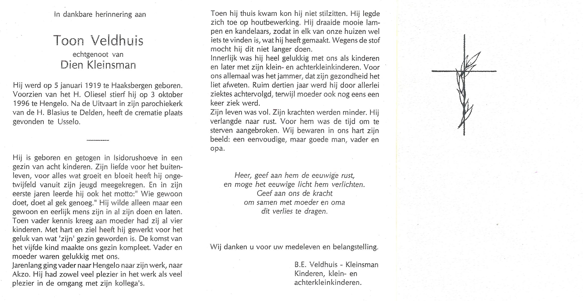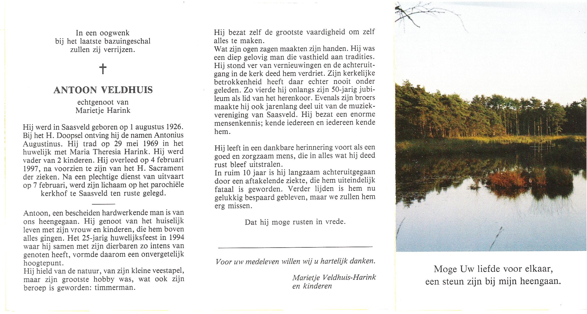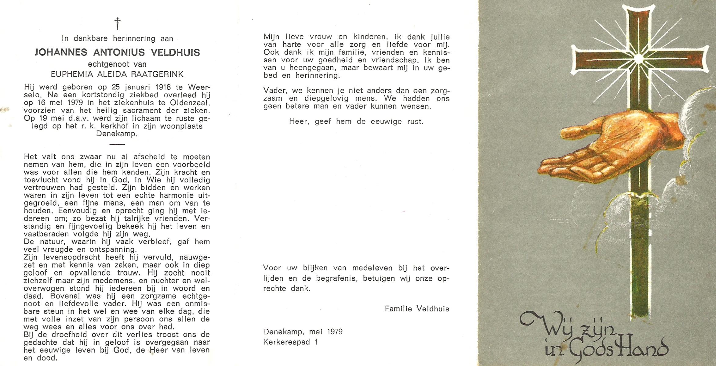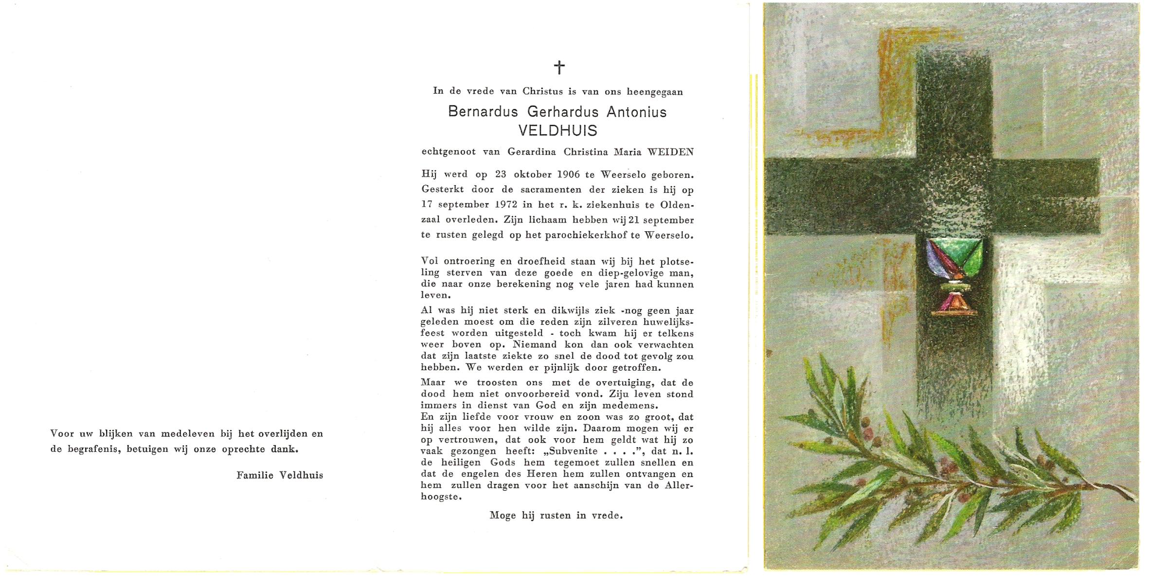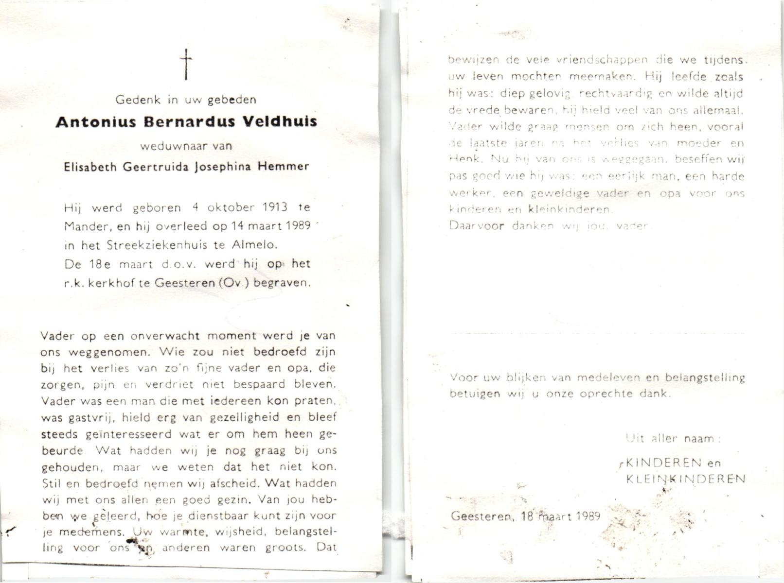 VELDHUIS, Antonius Bernardus, geboren op 4-10-1913 te Mander, overleden op 14-3-1989 te Almelo, ziekenhuis op 75-jarige leeftijd, begraven op 18-3-1989 te Geesteren.