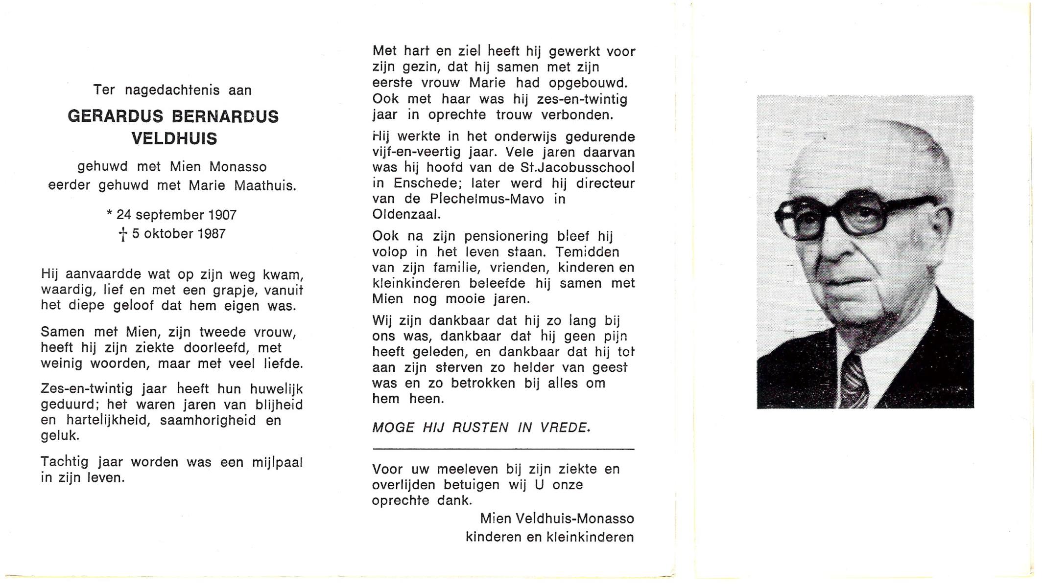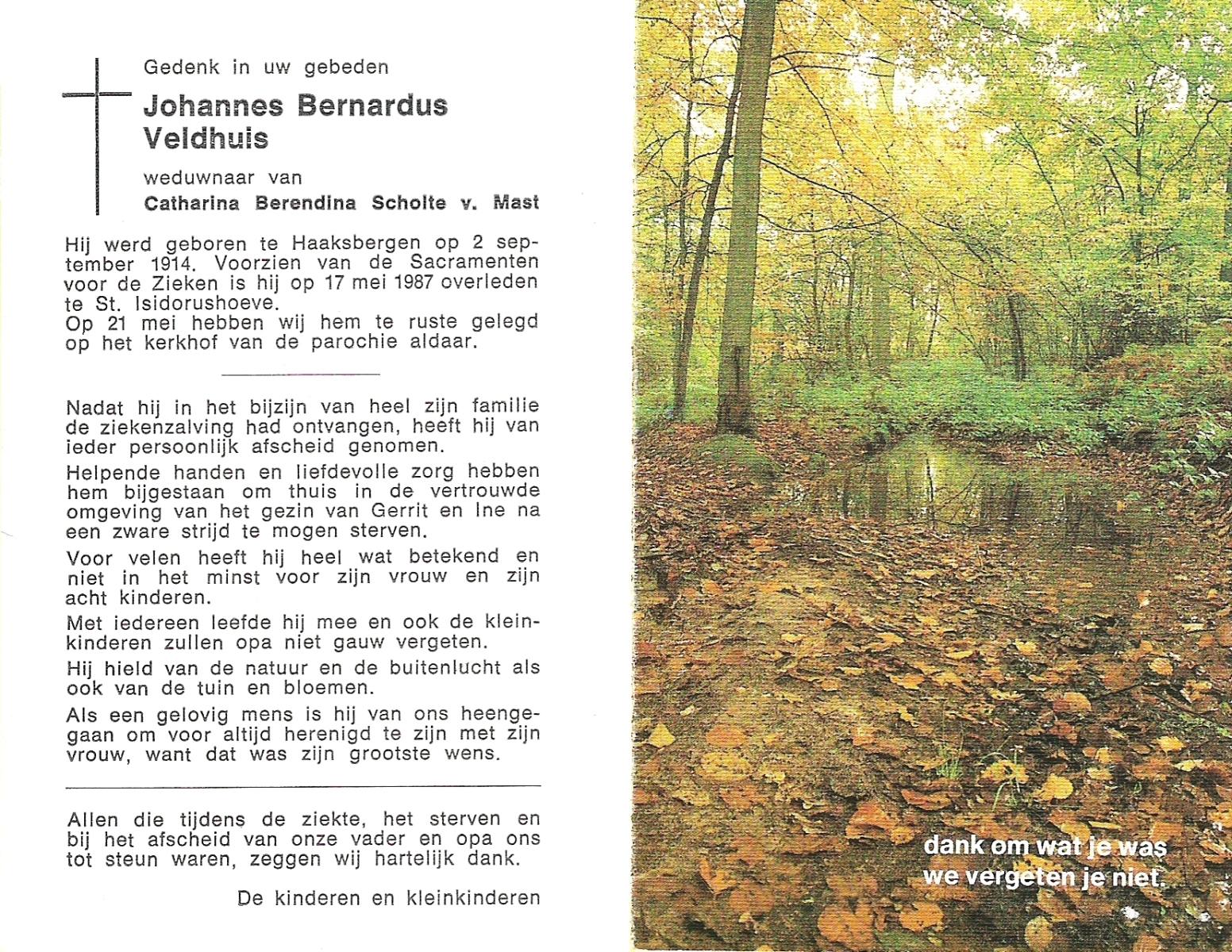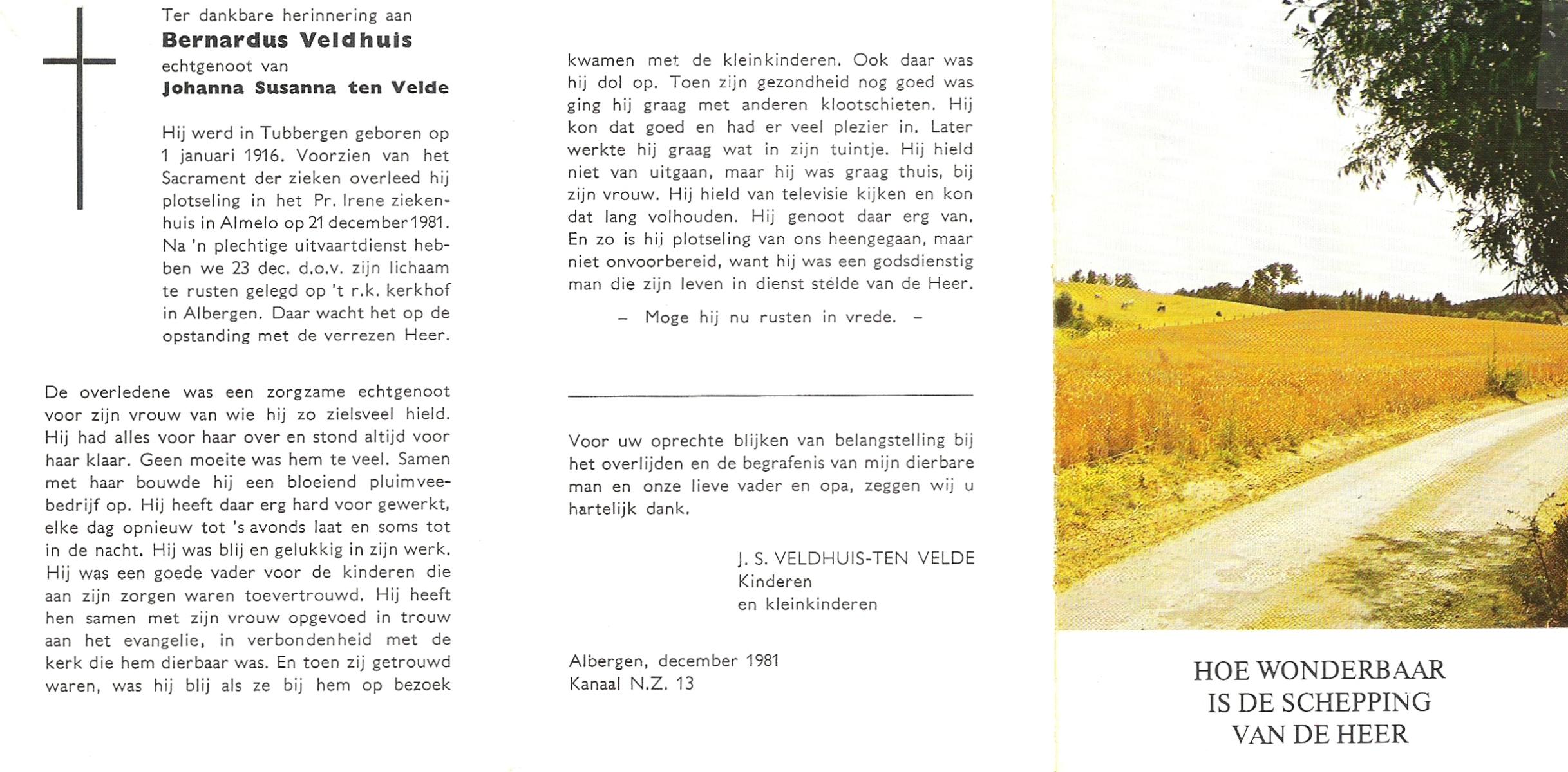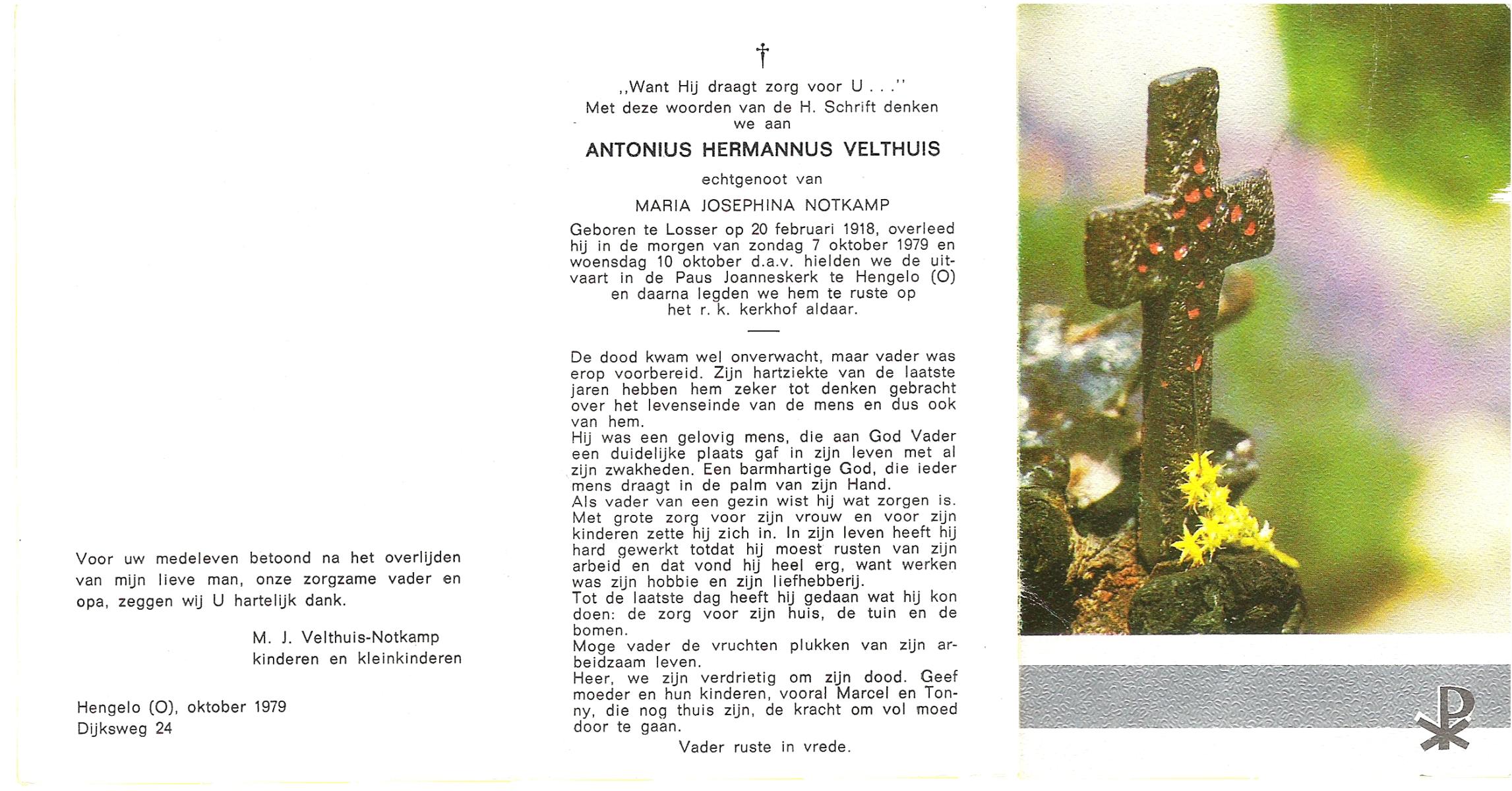 VELDHUIS, Antonius Bernardus, geboren op 4-10-1913 te Mander, overleden op 14-3-1989 te Almelo, ziekenhuis op 75-jarige leeftijd, begraven op 18-3-1989 te Geesteren.