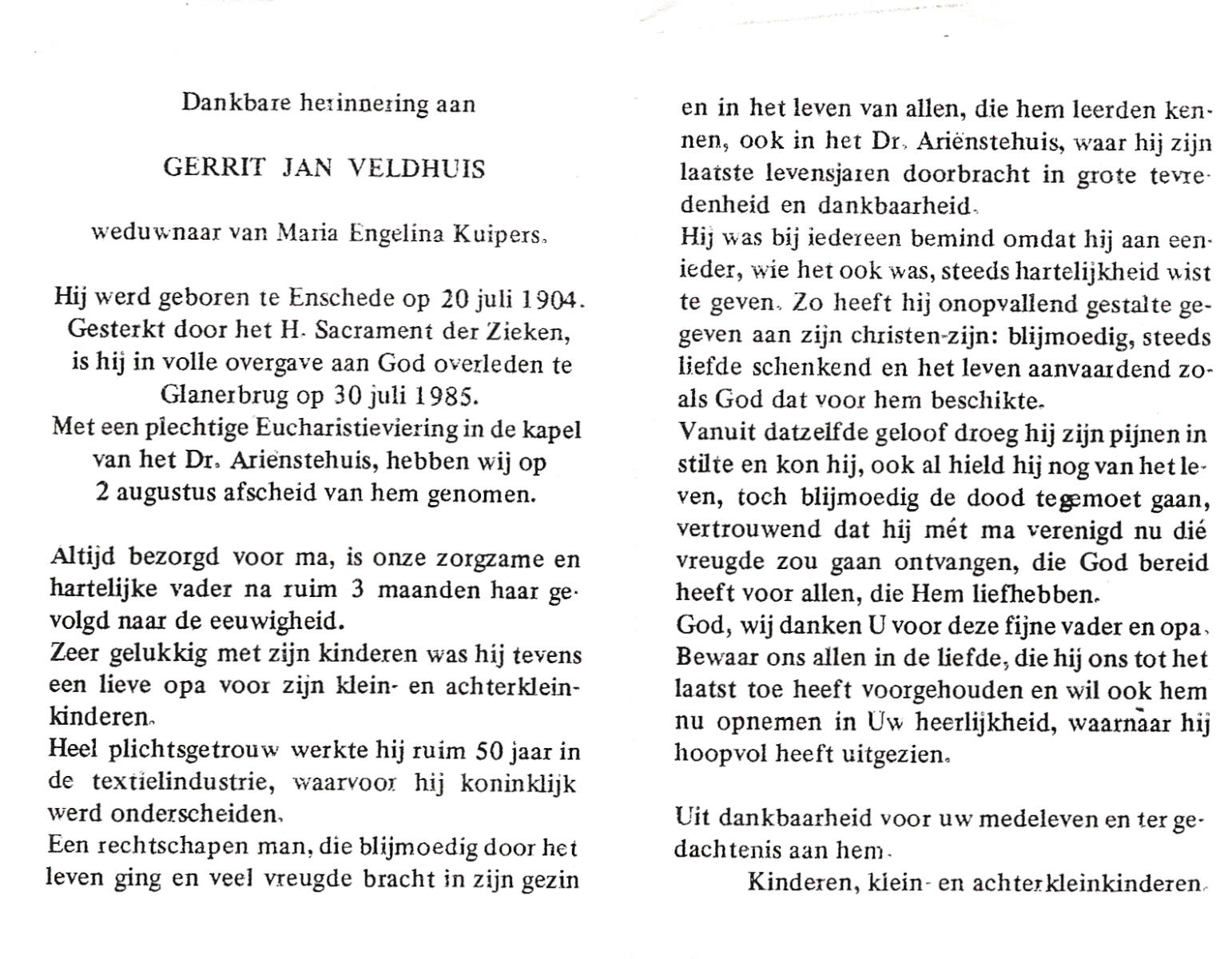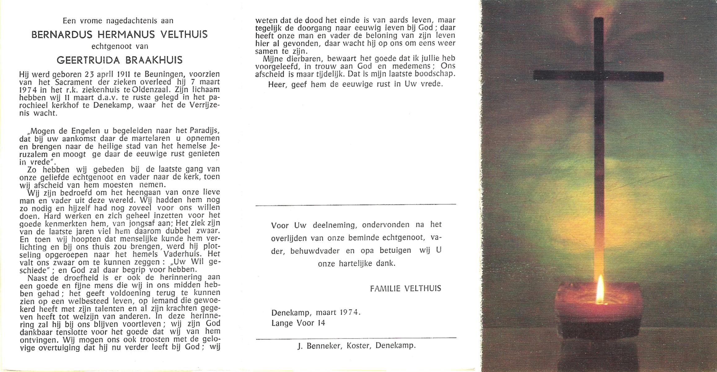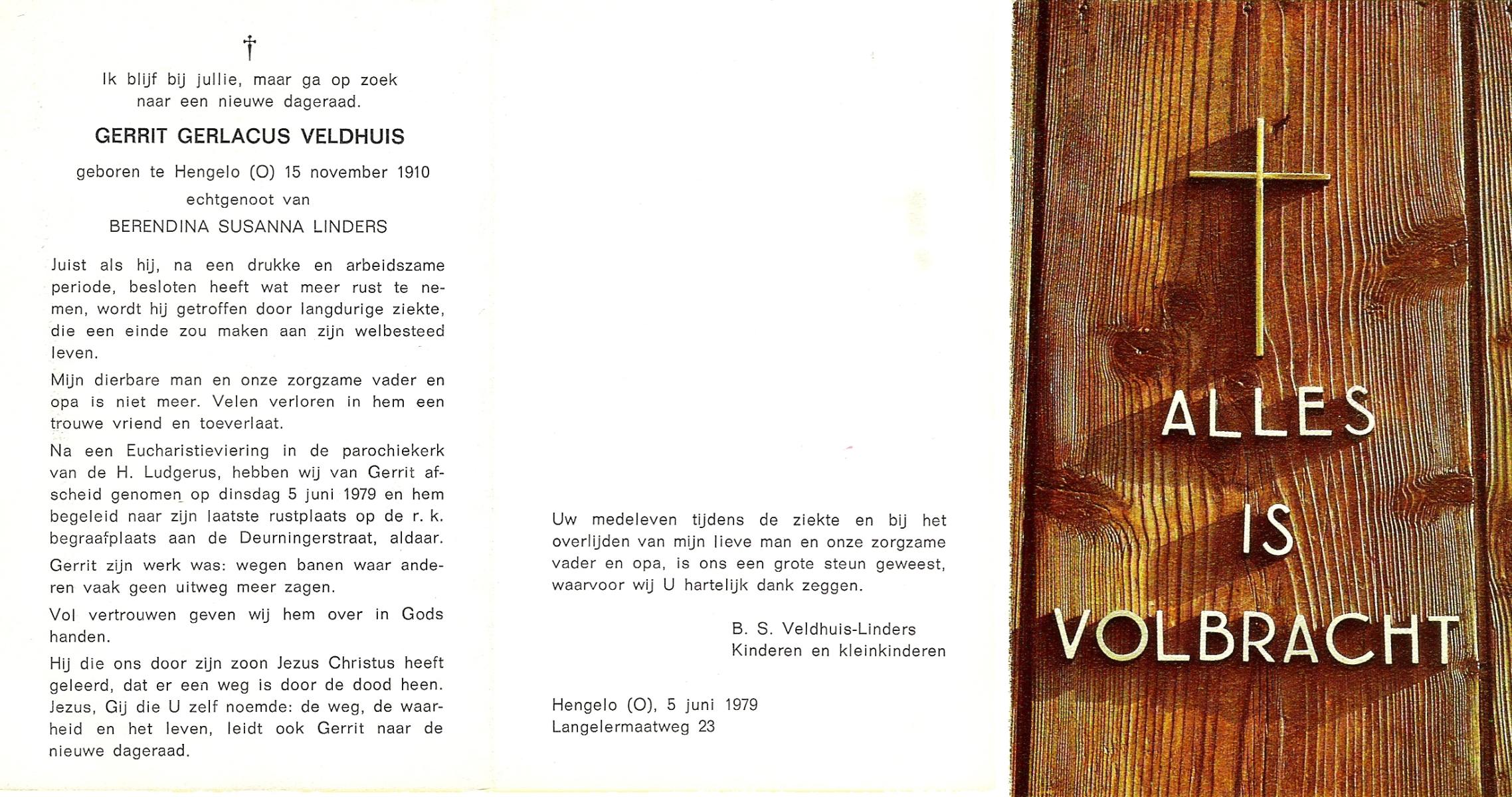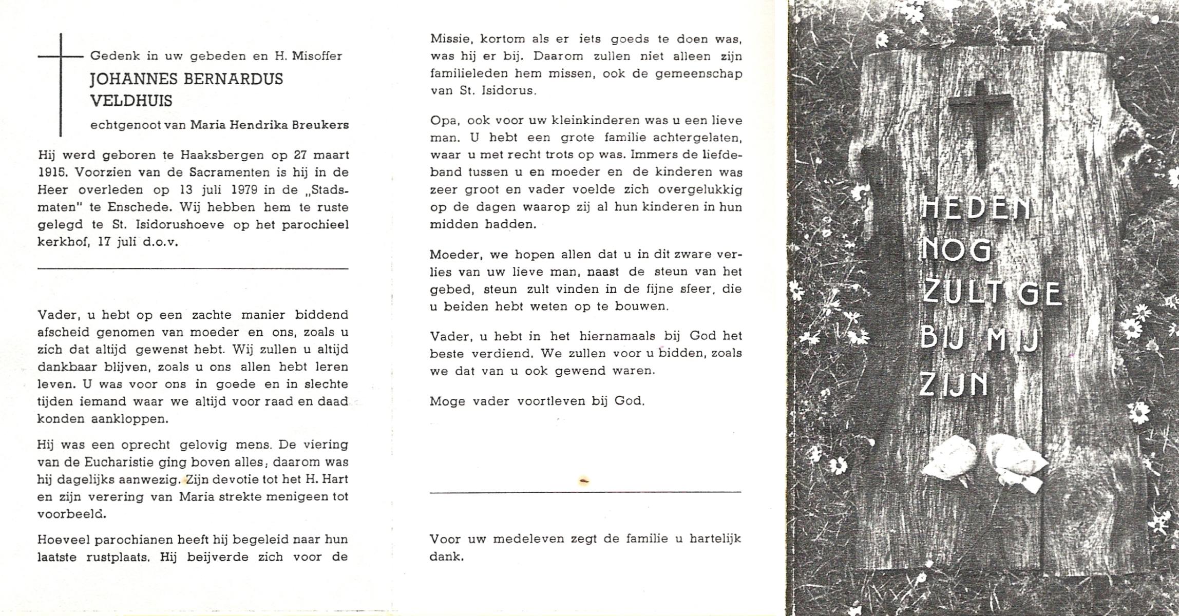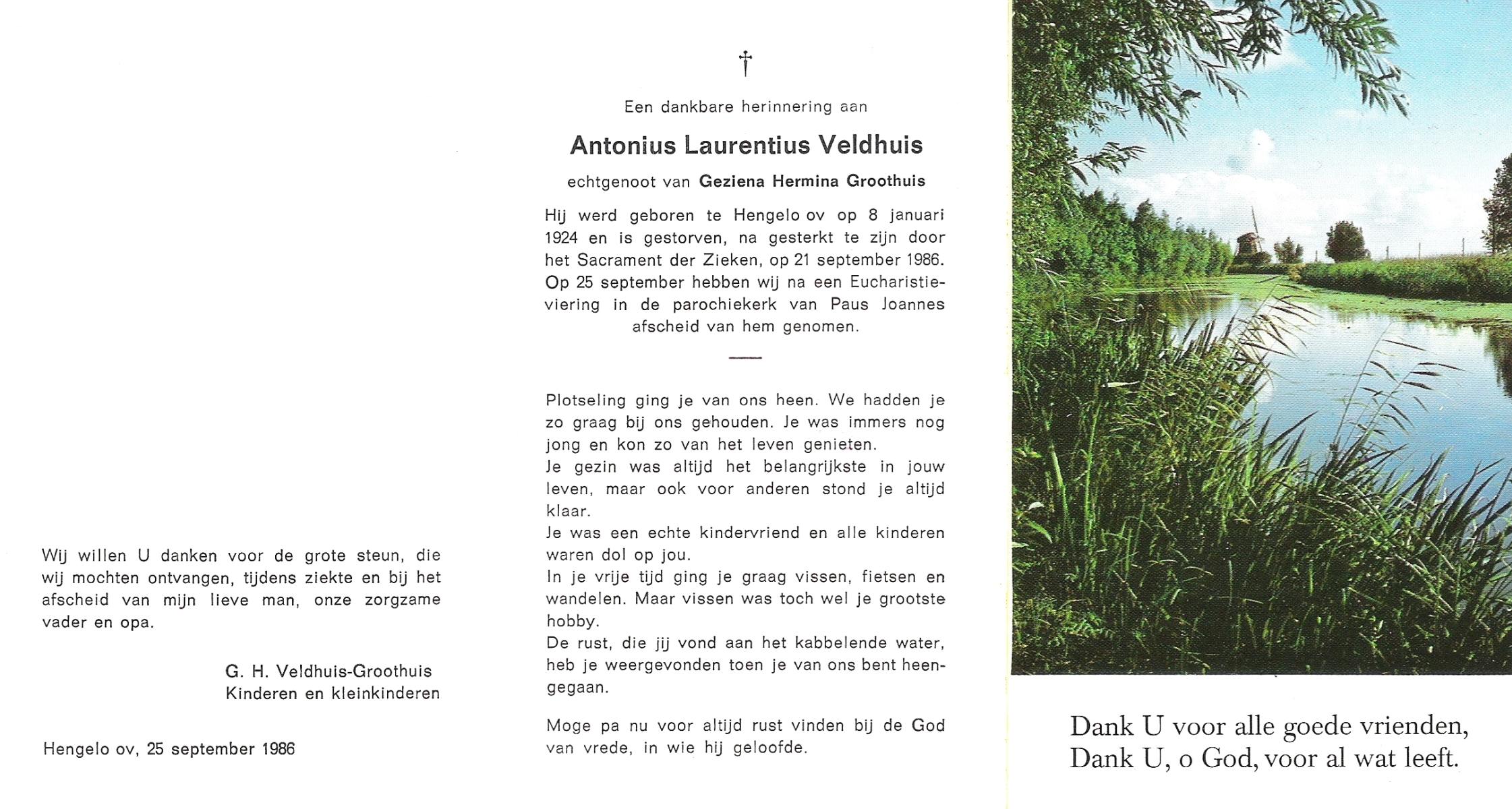 VELDHUIS, Antonius Bernardus, geboren op 4-10-1913 te Mander, overleden op 14-3-1989 te Almelo, ziekenhuis op 75-jarige leeftijd, begraven op 18-3-1989 te Geesteren.
