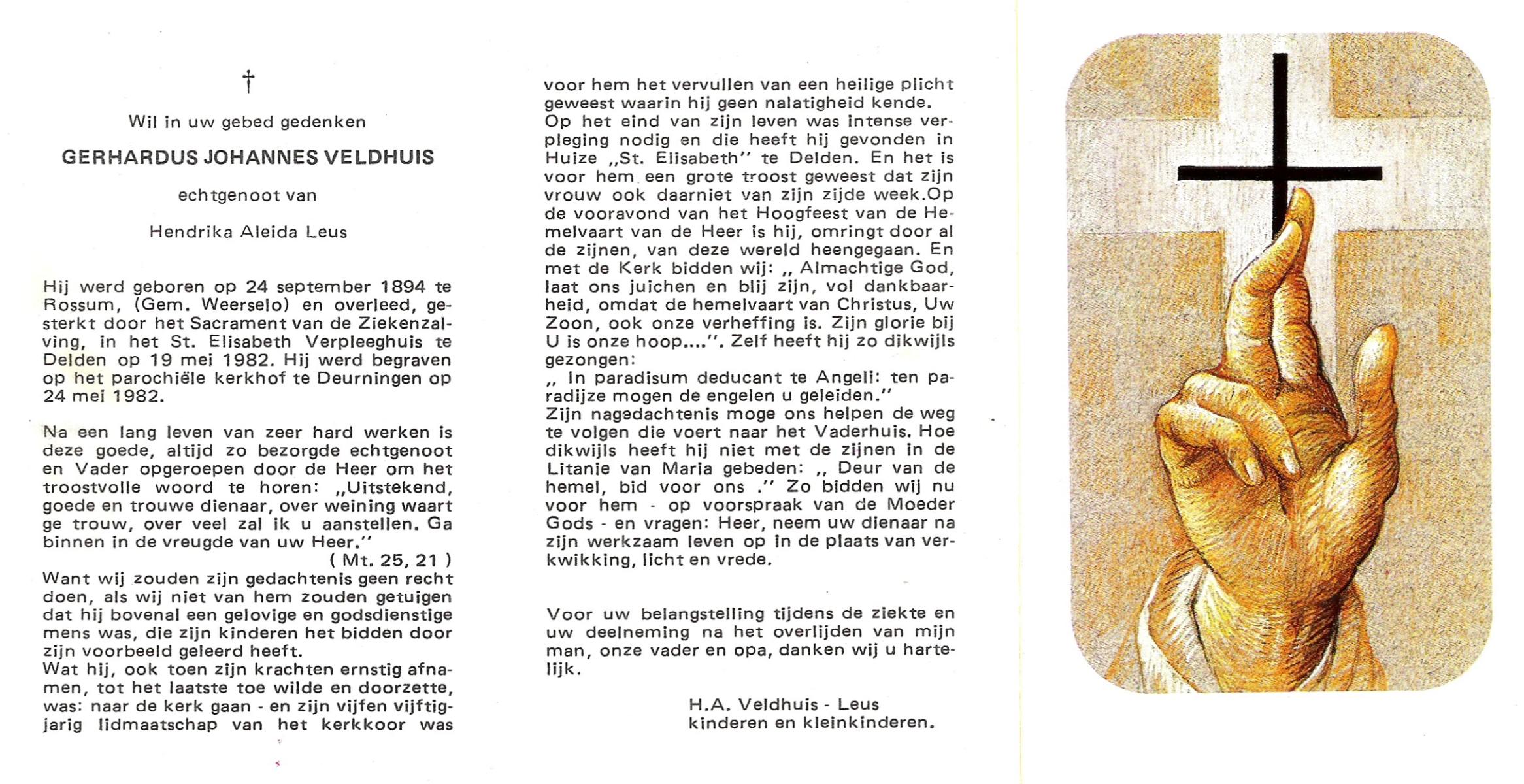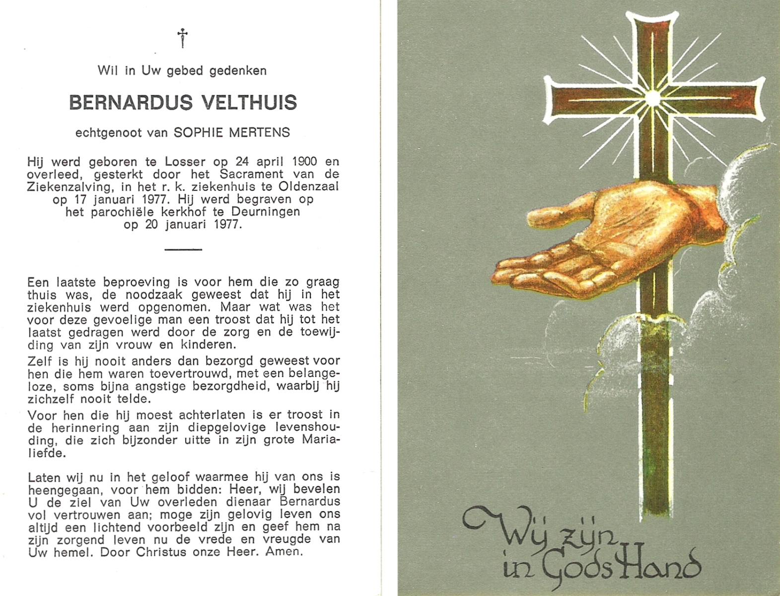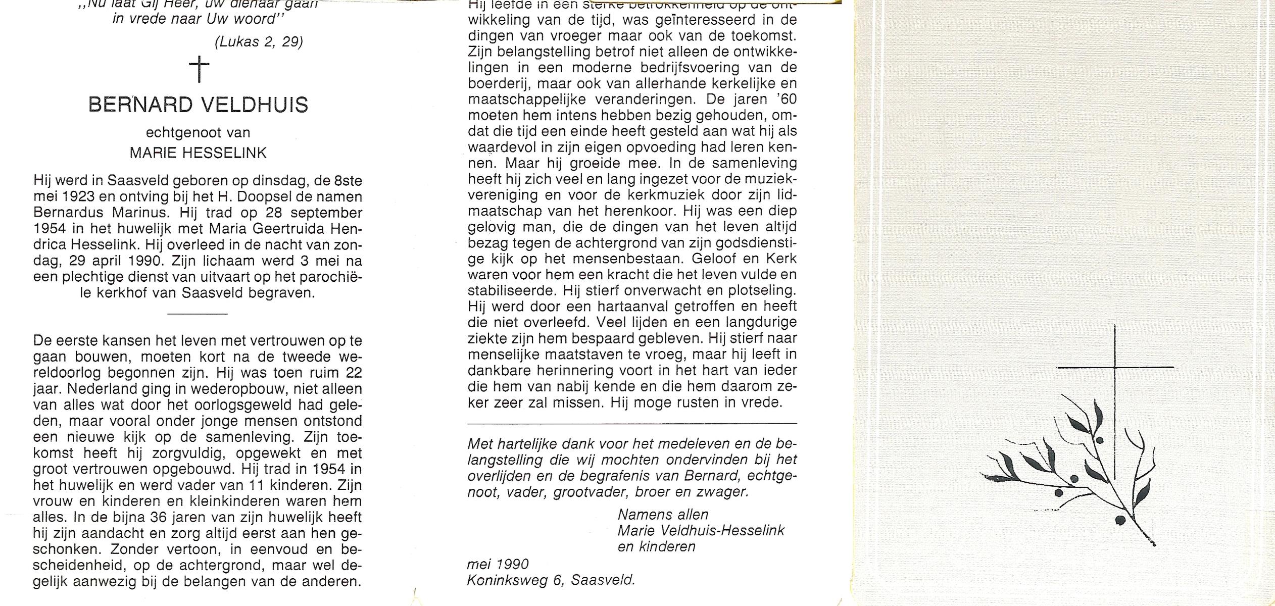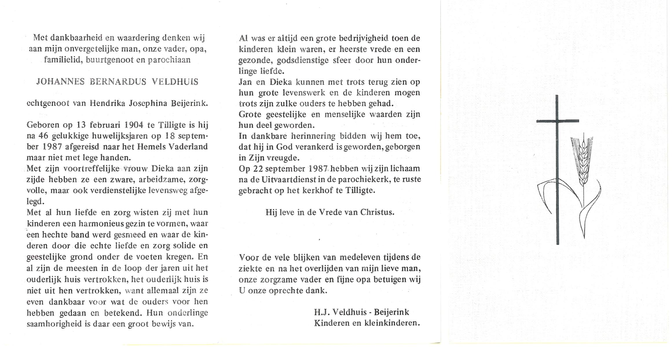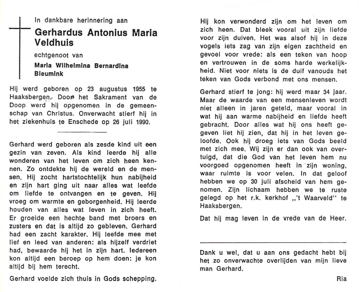 VELDHUIS, Antonius Bernardus, geboren op 4-10-1913 te Mander, overleden op 14-3-1989 te Almelo, ziekenhuis op 75-jarige leeftijd, begraven op 18-3-1989 te Geesteren.