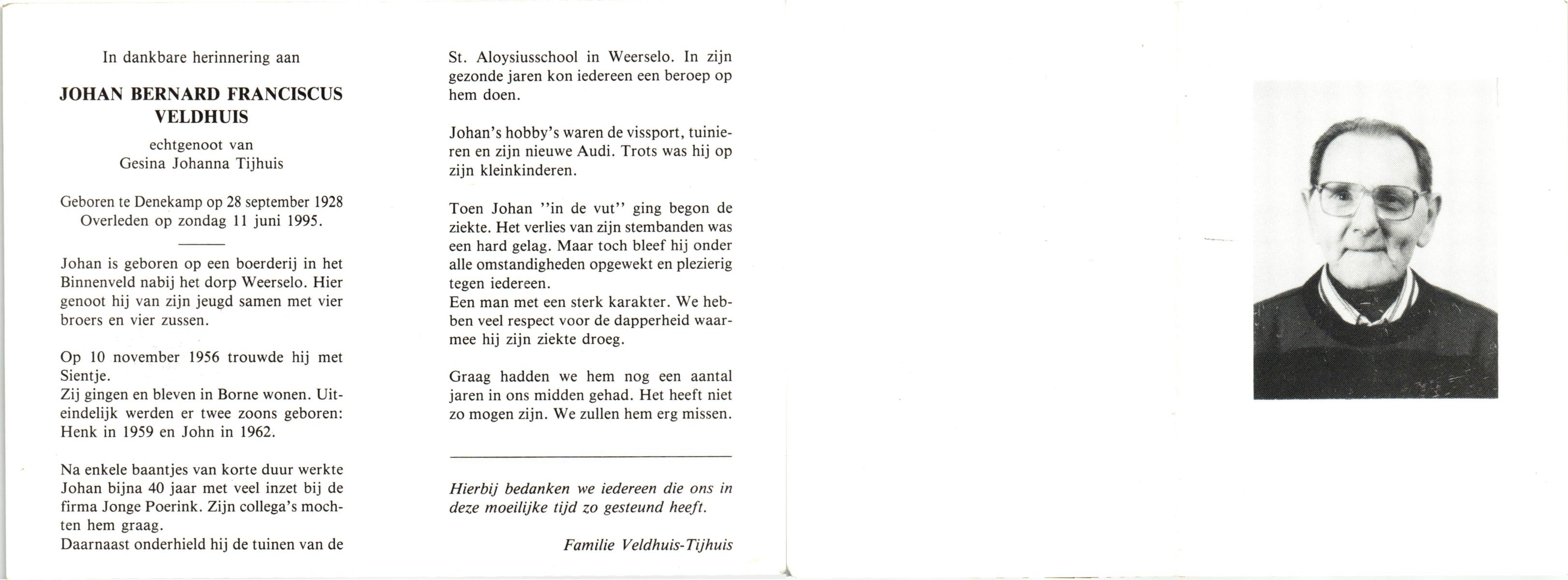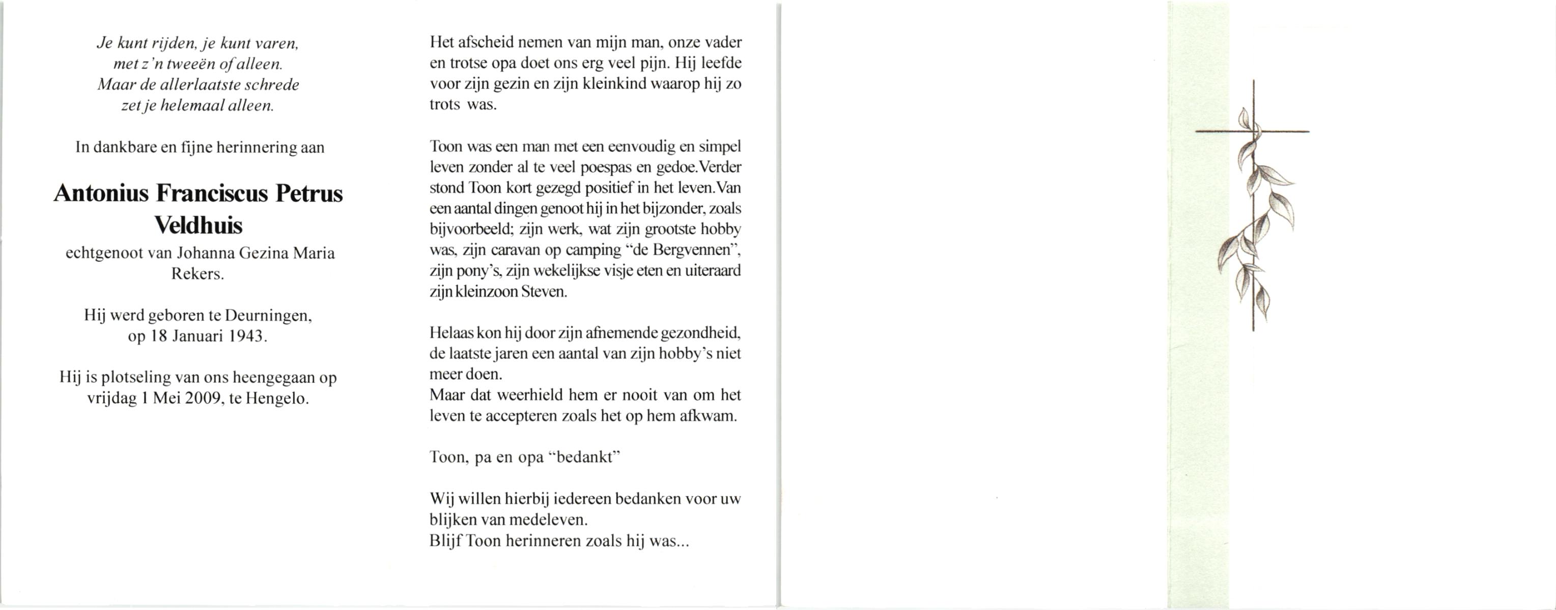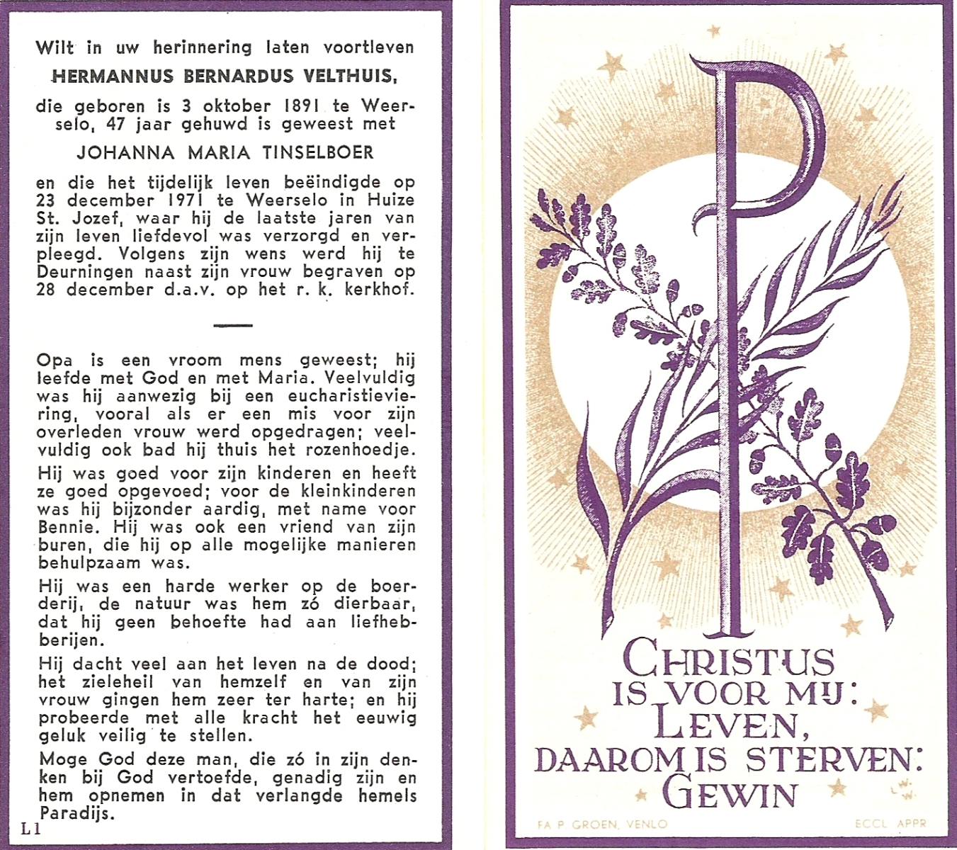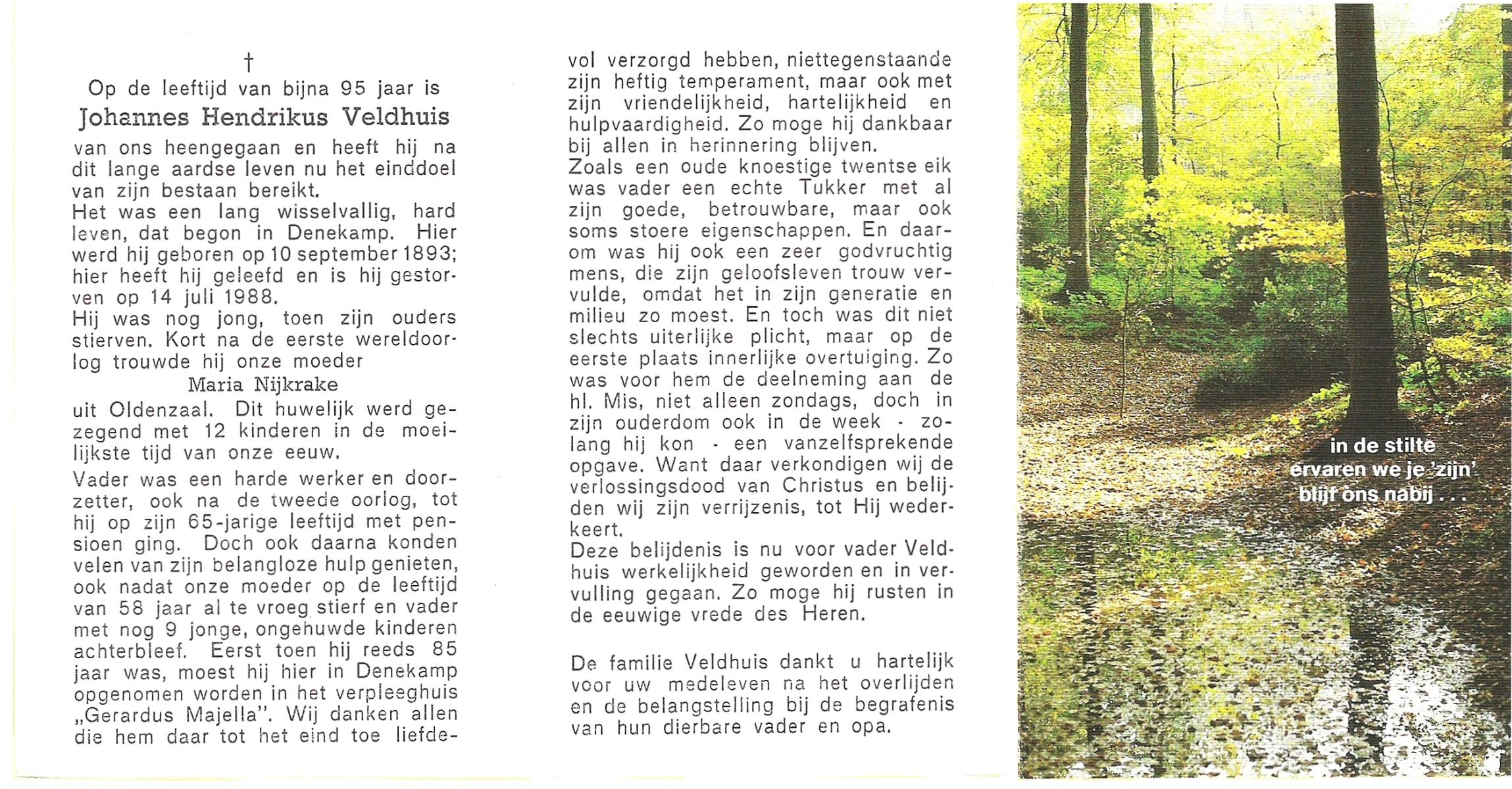 VELDHUIS, Antonius Bernardus, geboren op 4-10-1913 te Mander, overleden op 14-3-1989 te Almelo, ziekenhuis op 75-jarige leeftijd, begraven op 18-3-1989 te Geesteren.