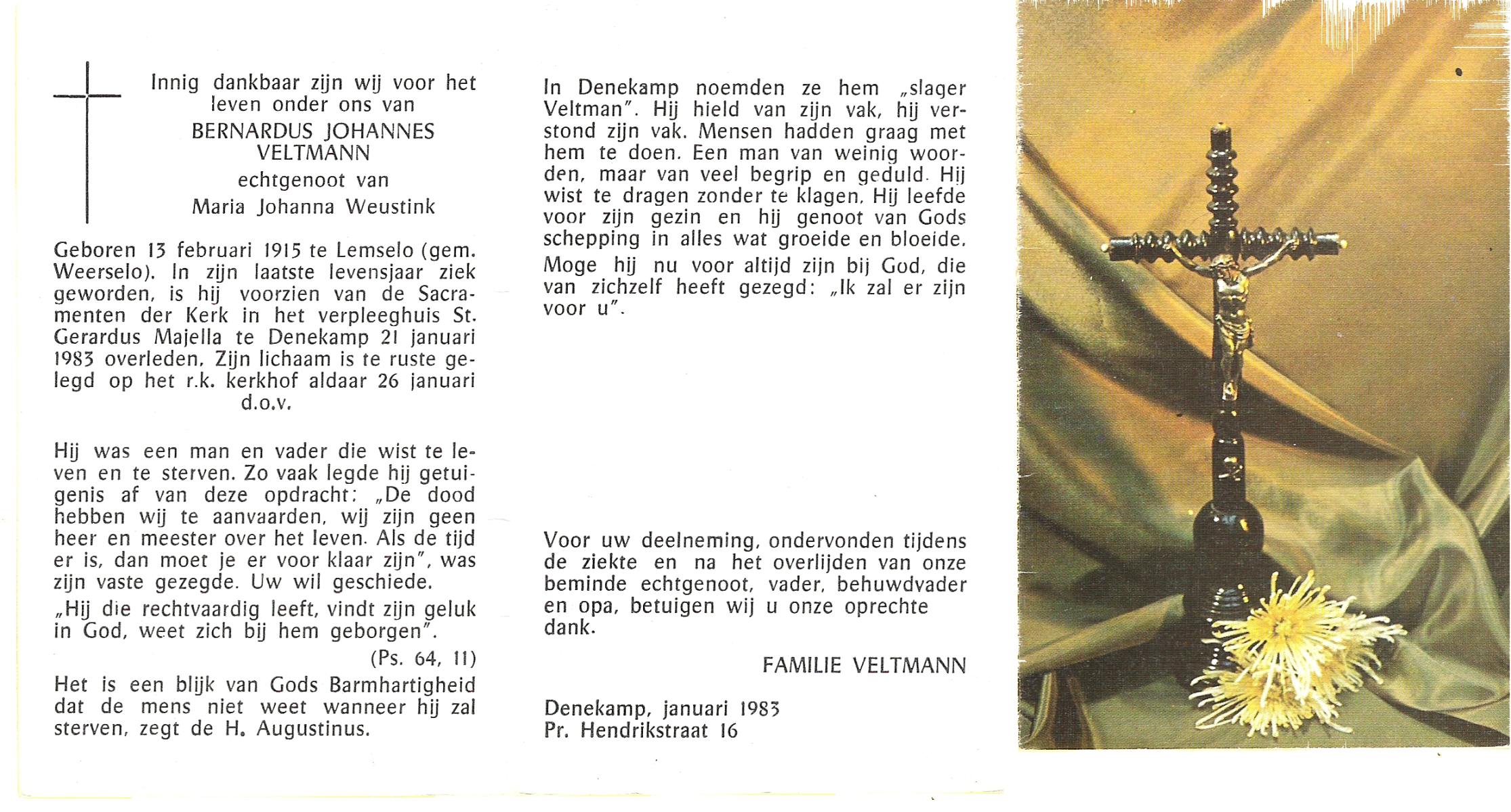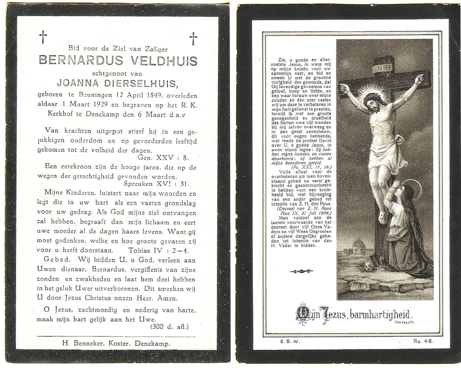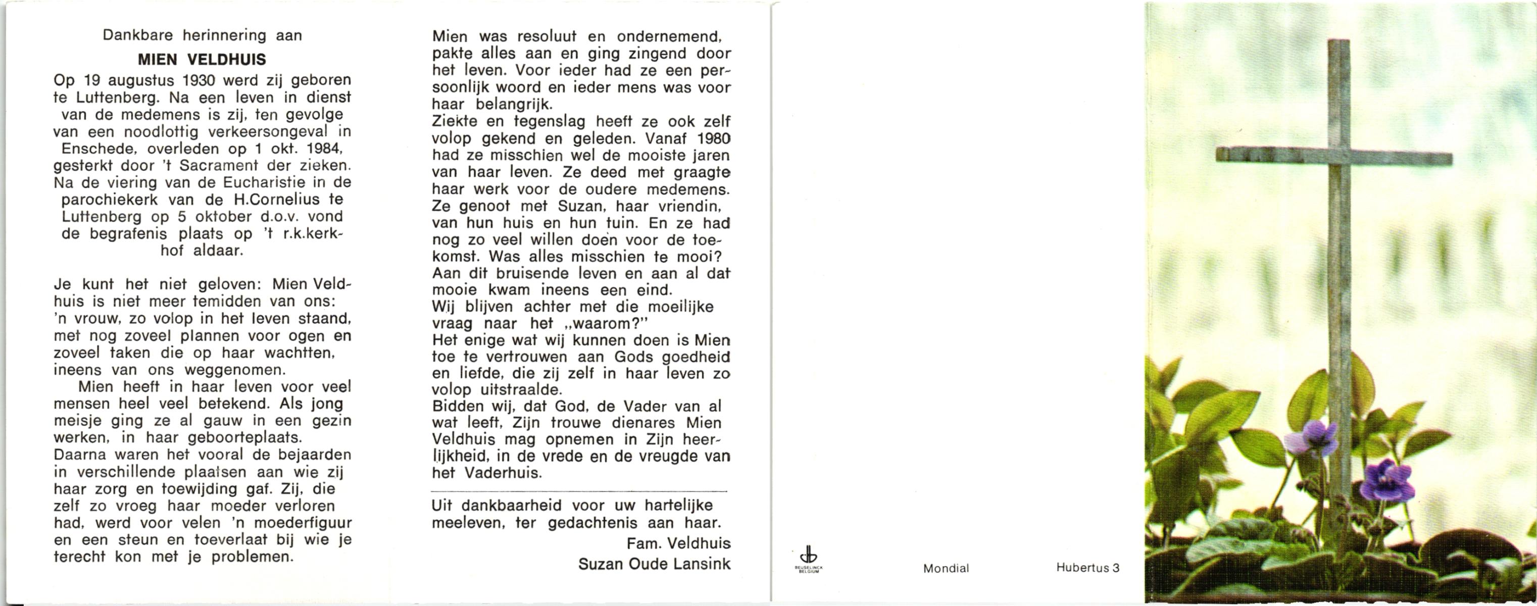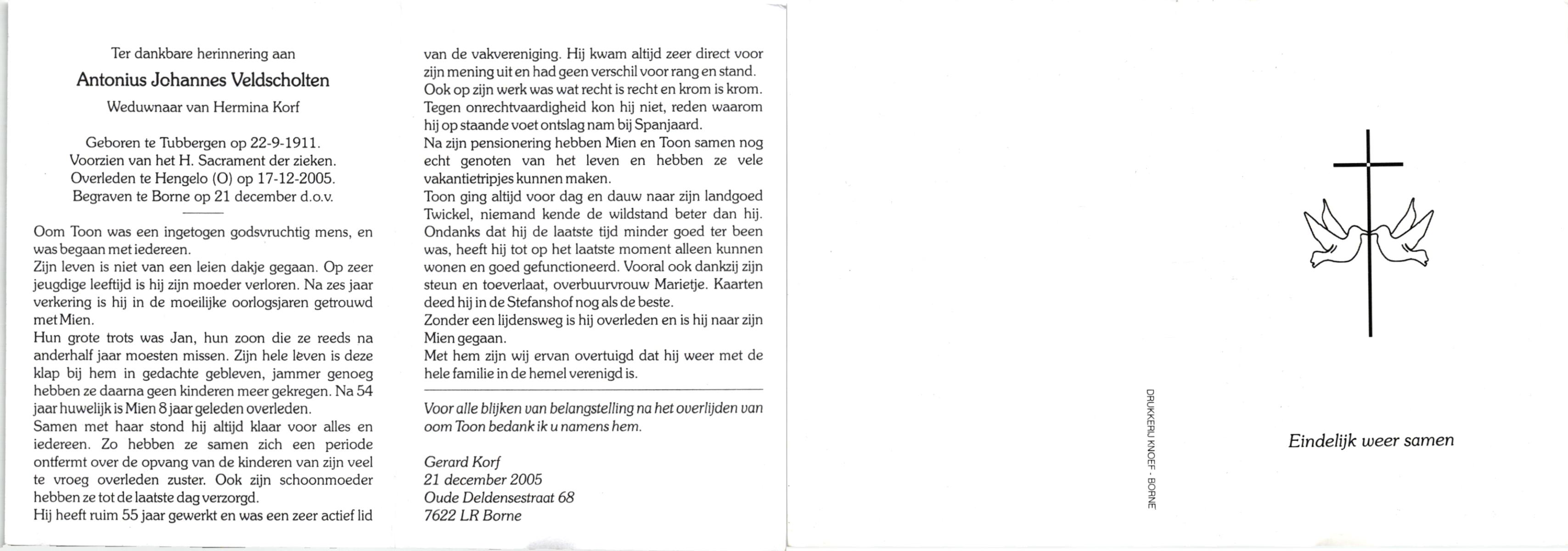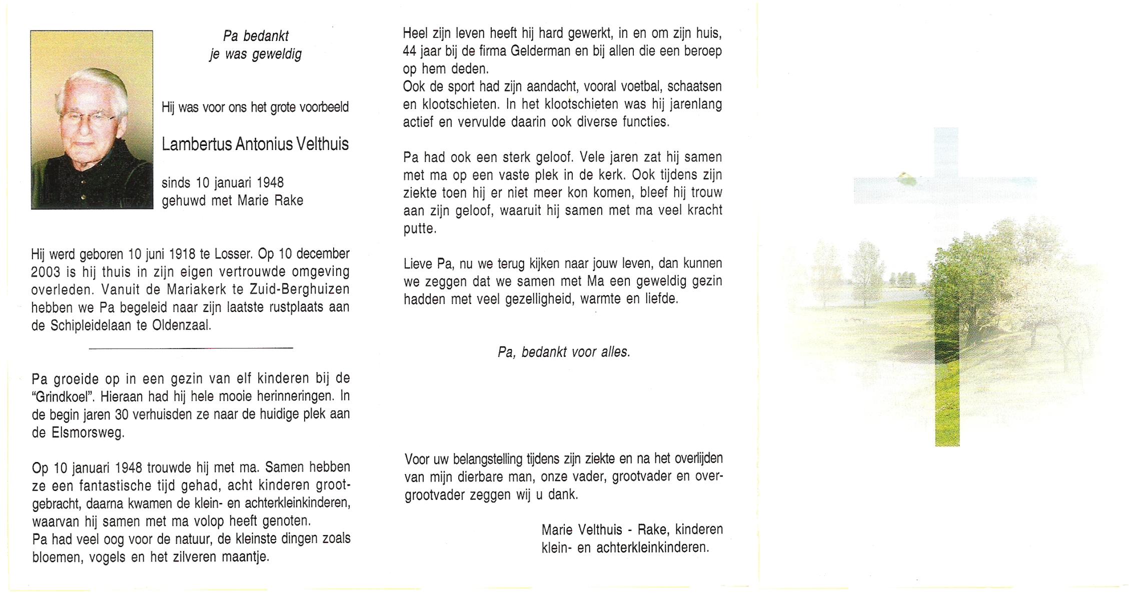 VELDHUIS, Antonius Bernardus, geboren op 4-10-1913 te Mander, overleden op 14-3-1989 te Almelo, ziekenhuis op 75-jarige leeftijd, begraven op 18-3-1989 te Geesteren.