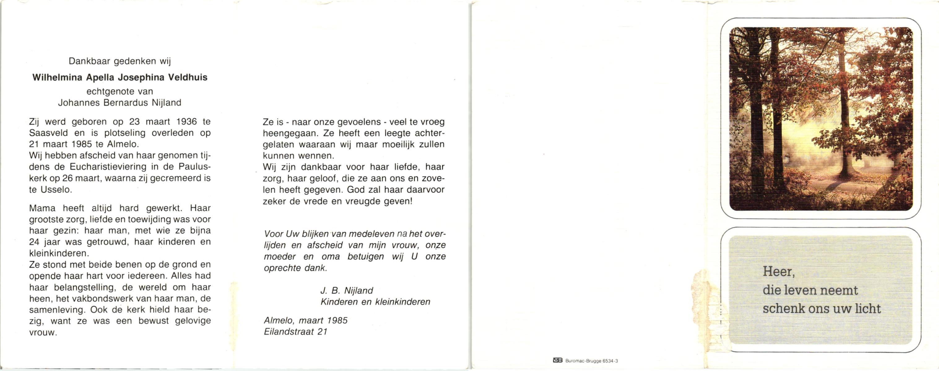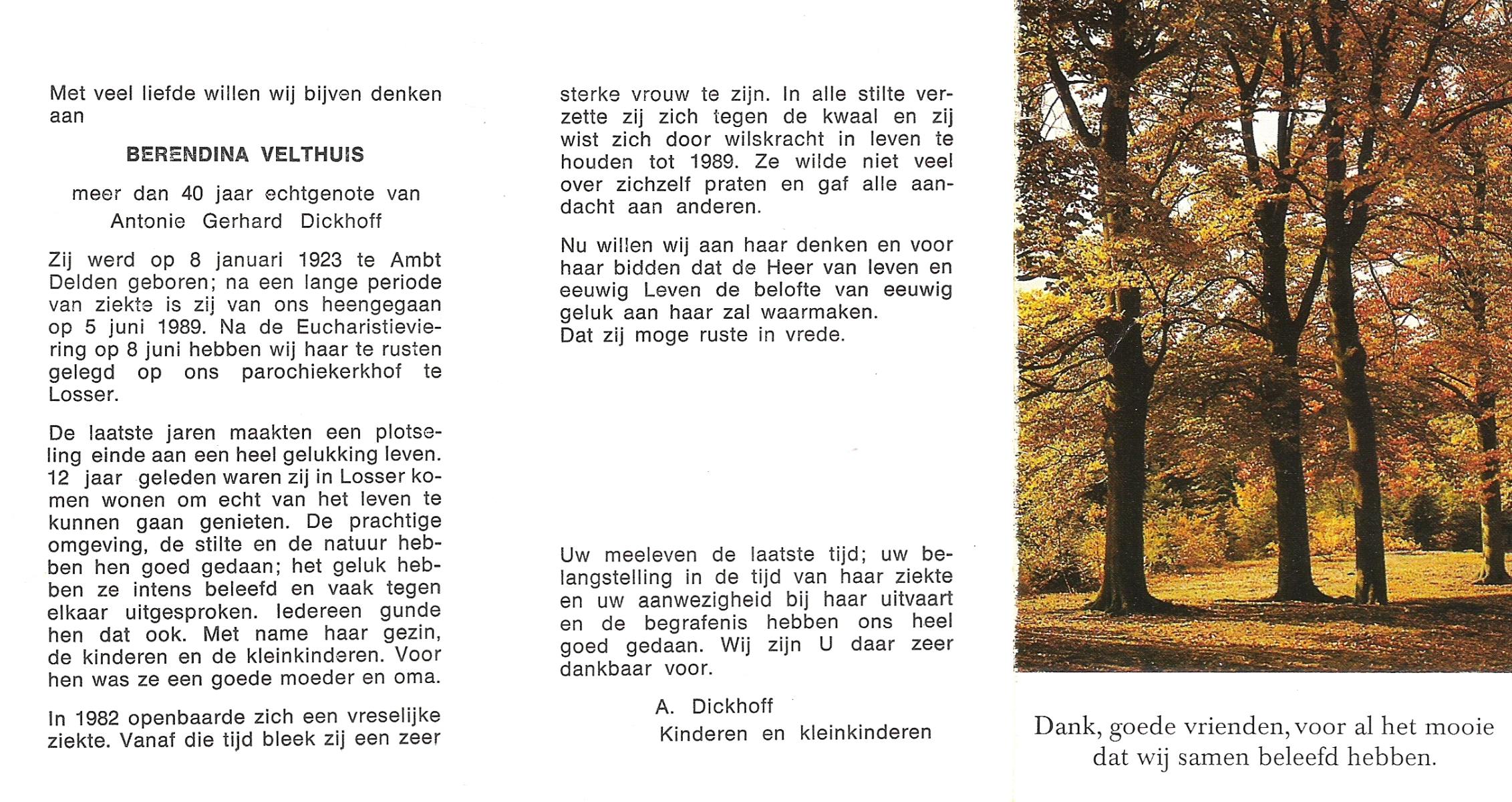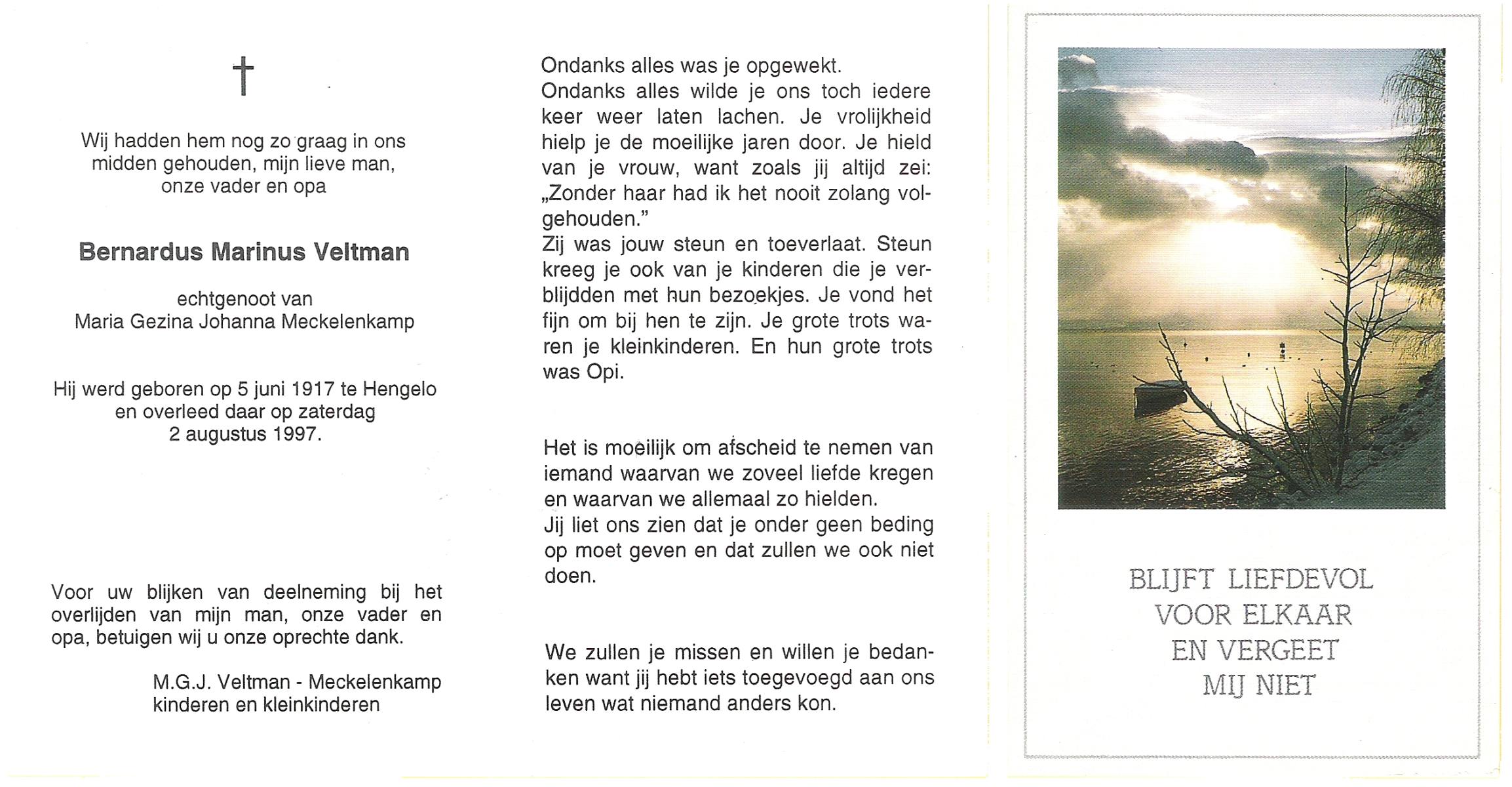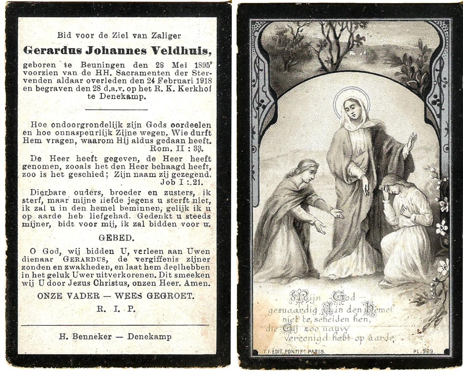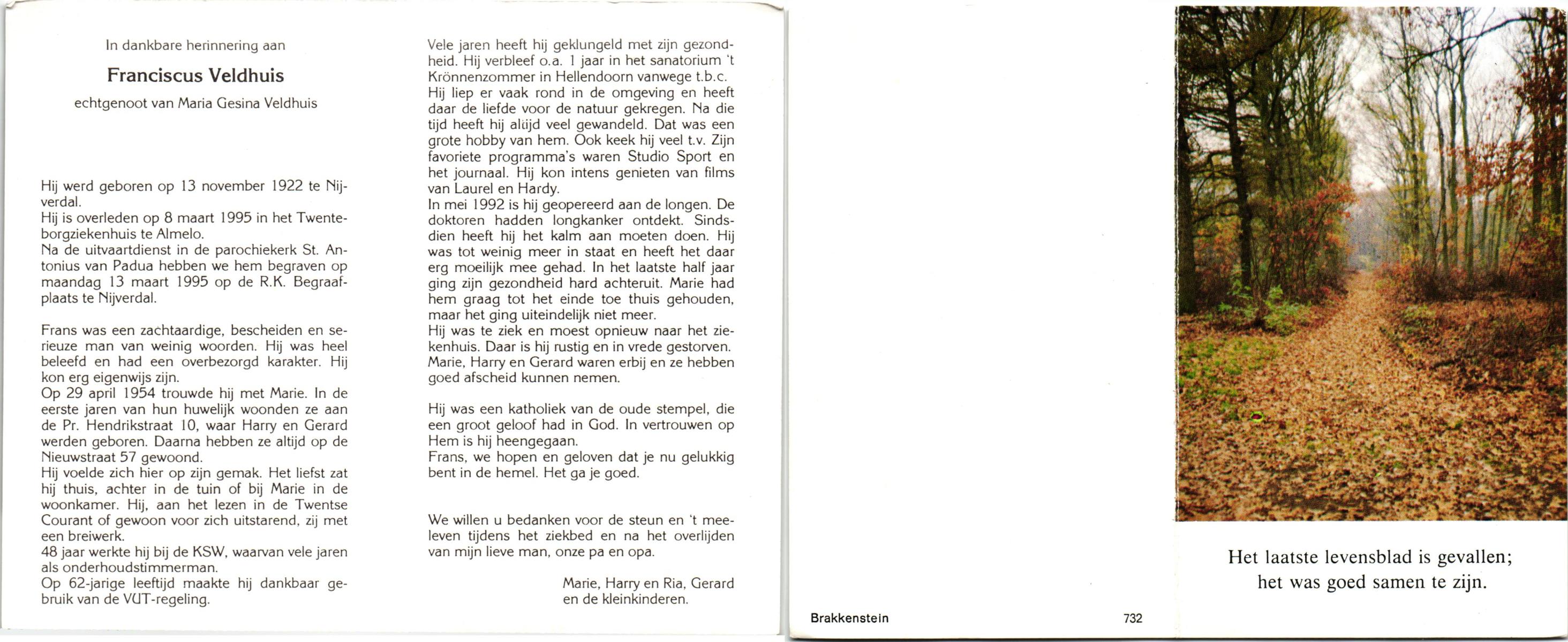VELDHUIS, Antonius Bernardus, geboren op 4-10-1913 te Mander, overleden op 14-3-1989 te Almelo, ziekenhuis op 75-jarige leeftijd, begraven op 18-3-1989 te Geesteren.