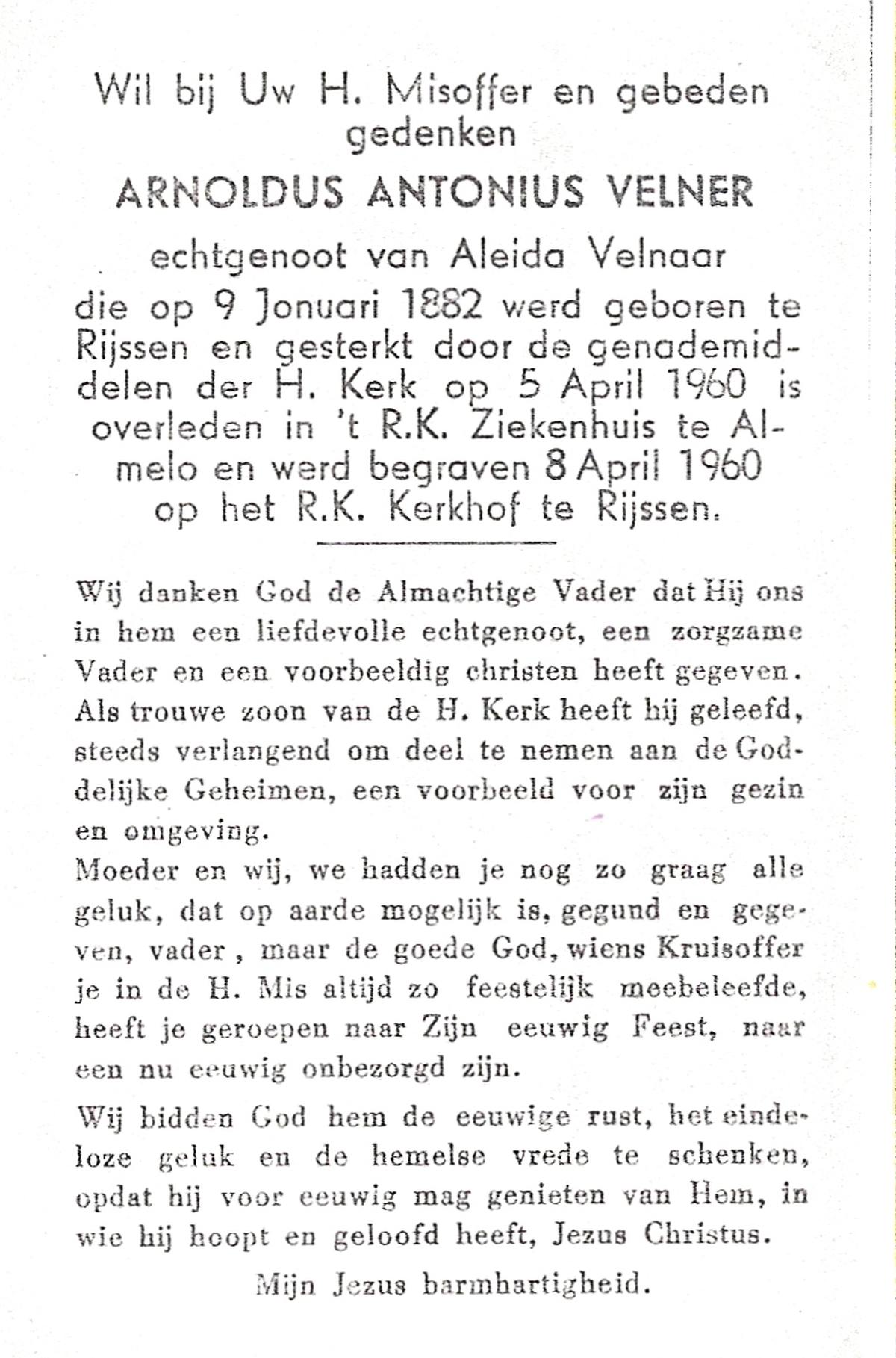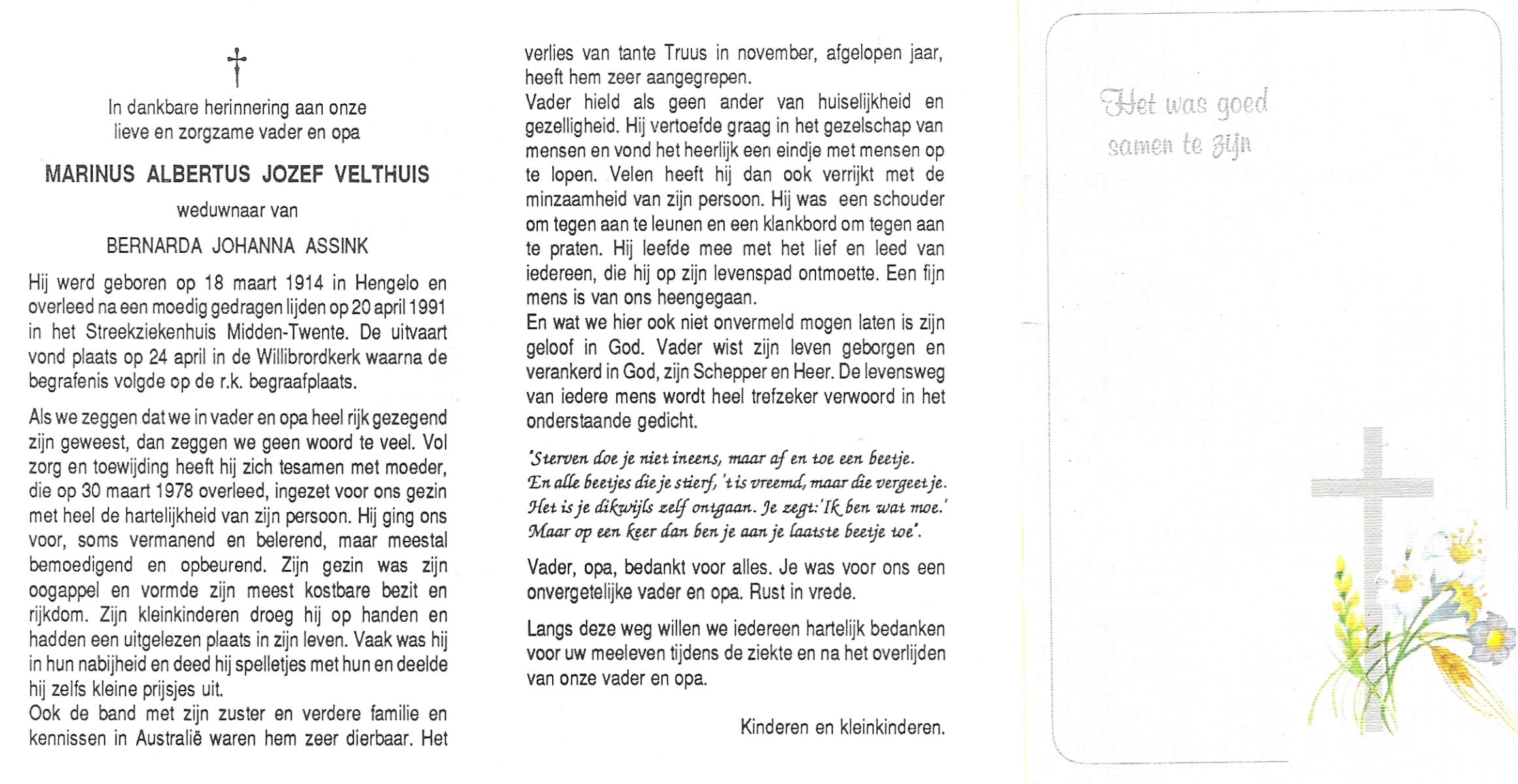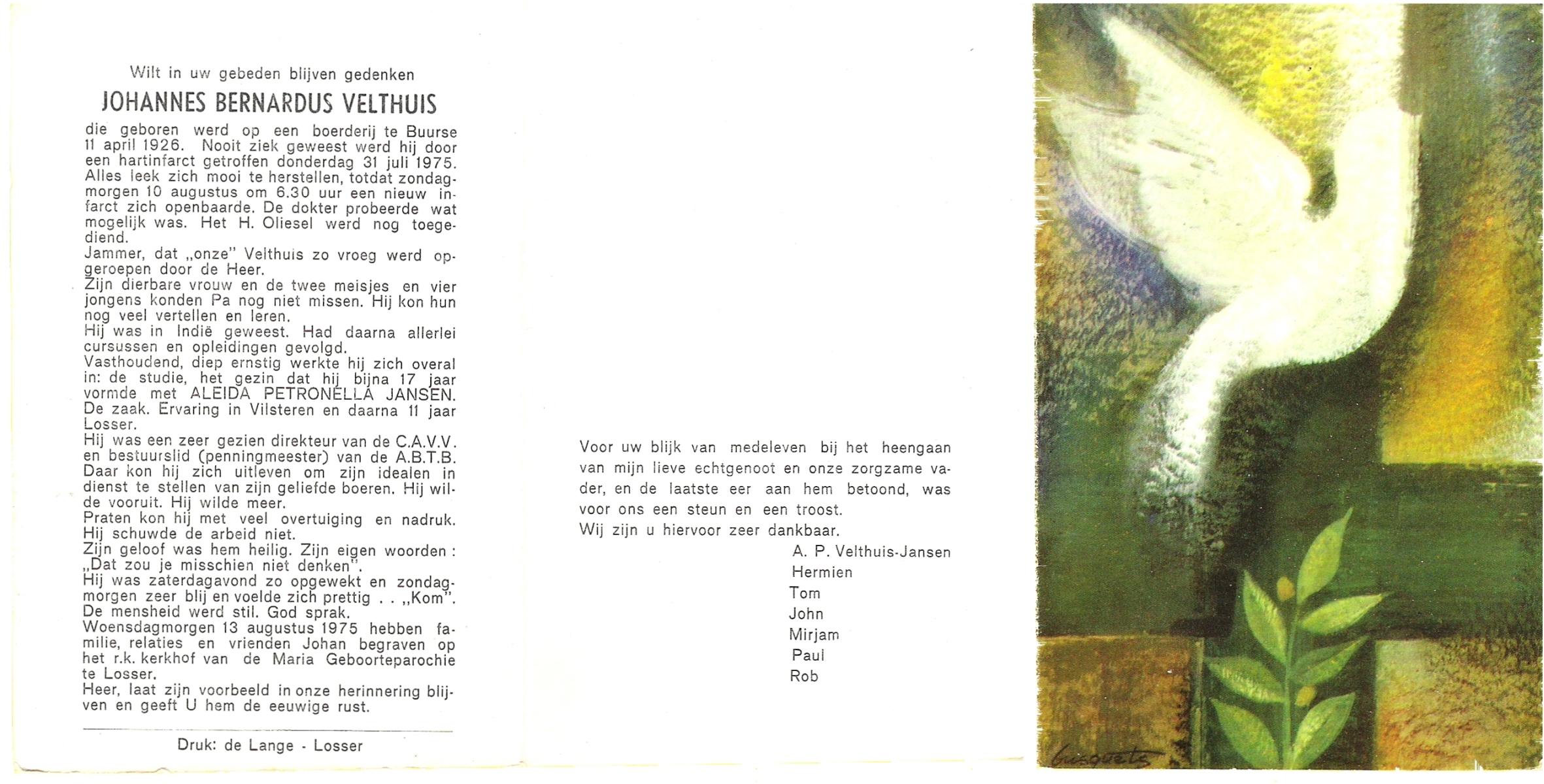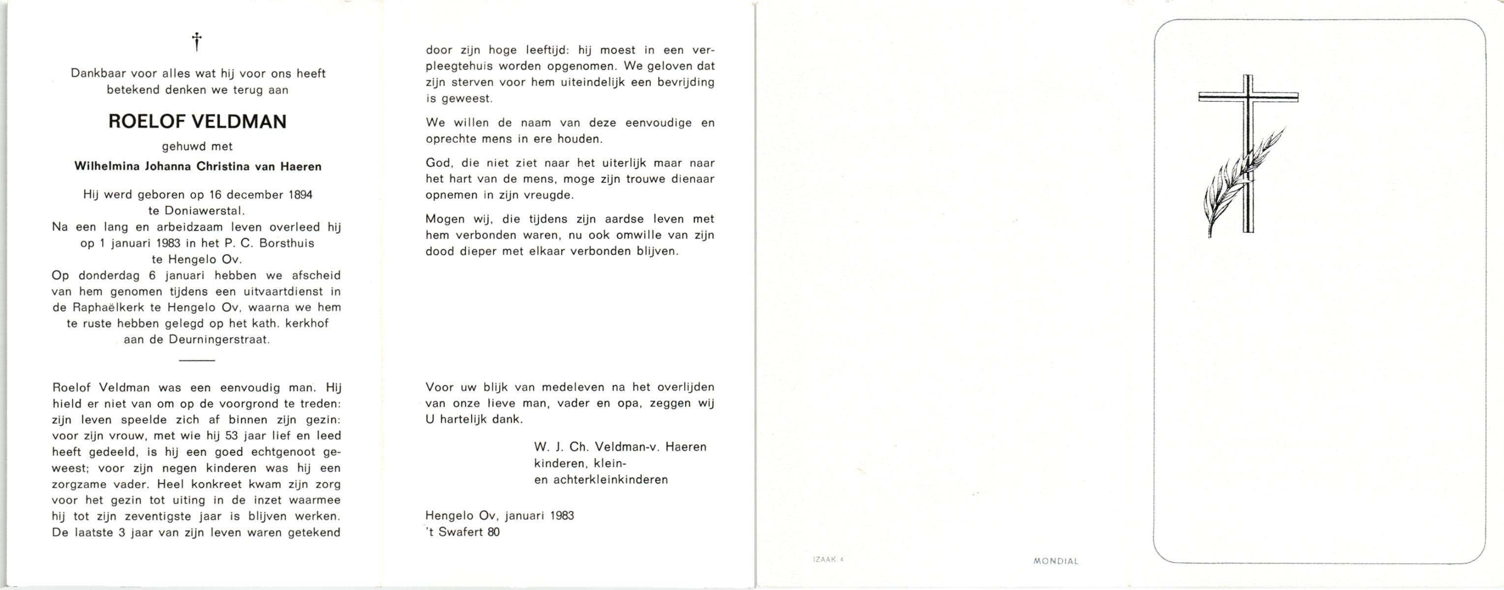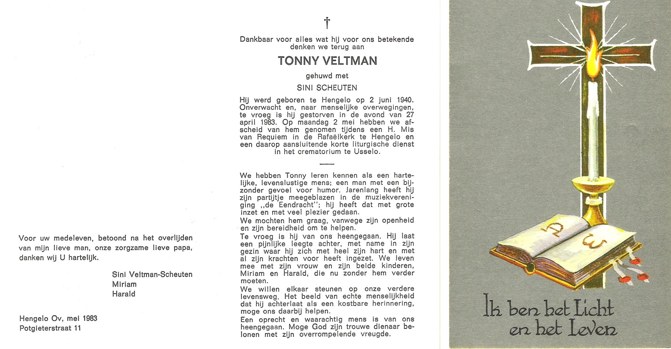 VELDHUIS, Antonius Bernardus, geboren op 4-10-1913 te Mander, overleden op 14-3-1989 te Almelo, ziekenhuis op 75-jarige leeftijd, begraven op 18-3-1989 te Geesteren.