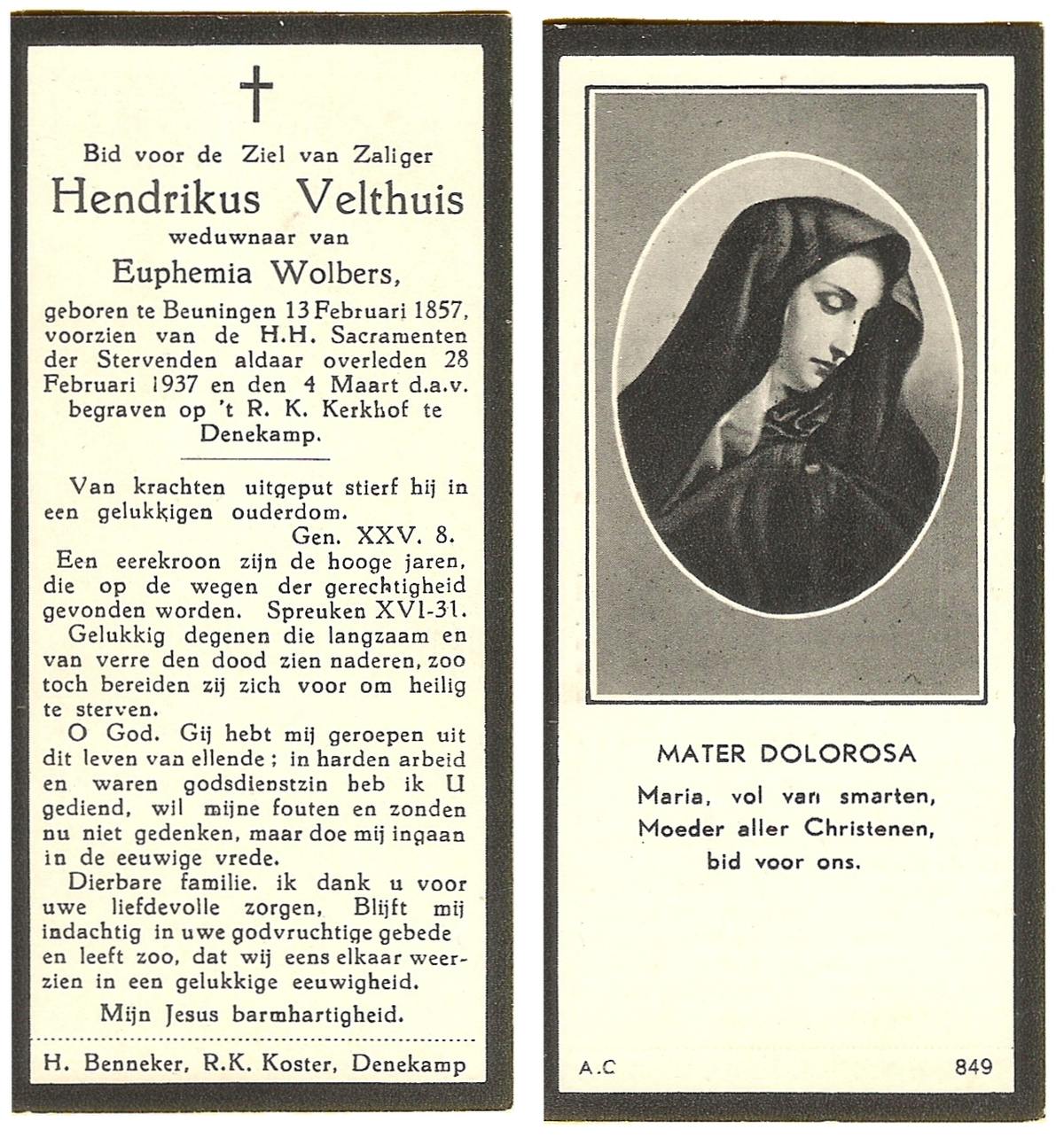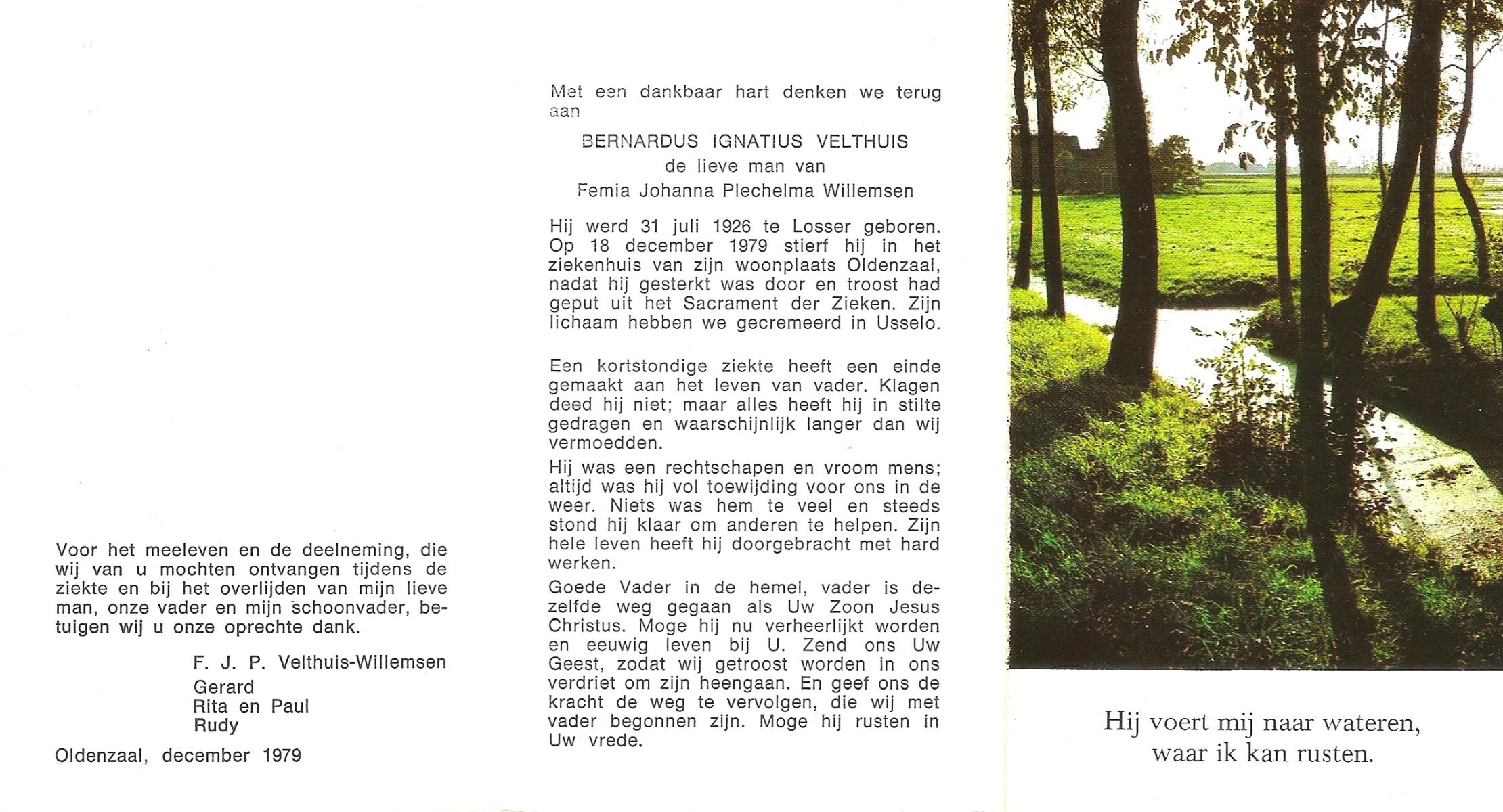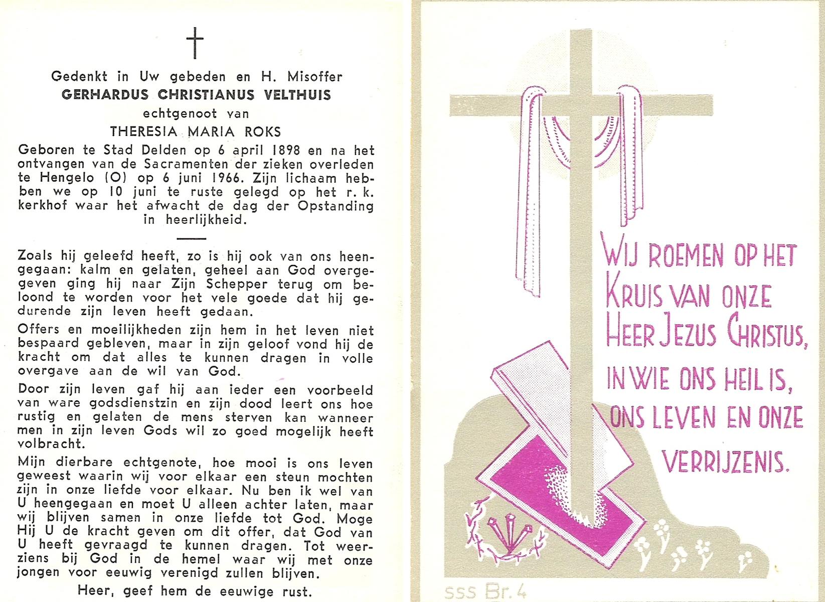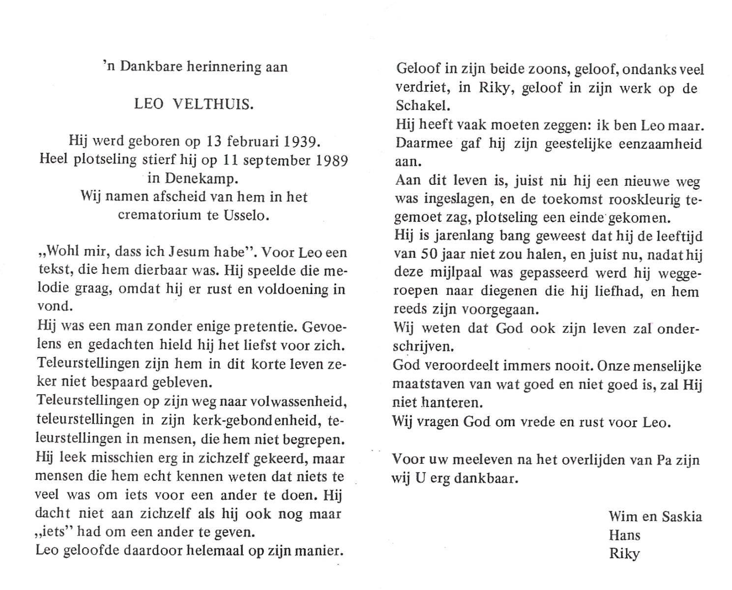 VELDHUIS, Antonius Bernardus, geboren op 4-10-1913 te Mander, overleden op 14-3-1989 te Almelo, ziekenhuis op 75-jarige leeftijd, begraven op 18-3-1989 te Geesteren.