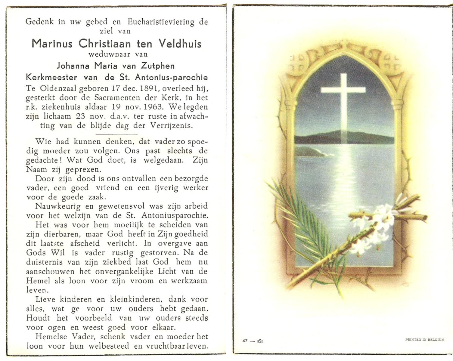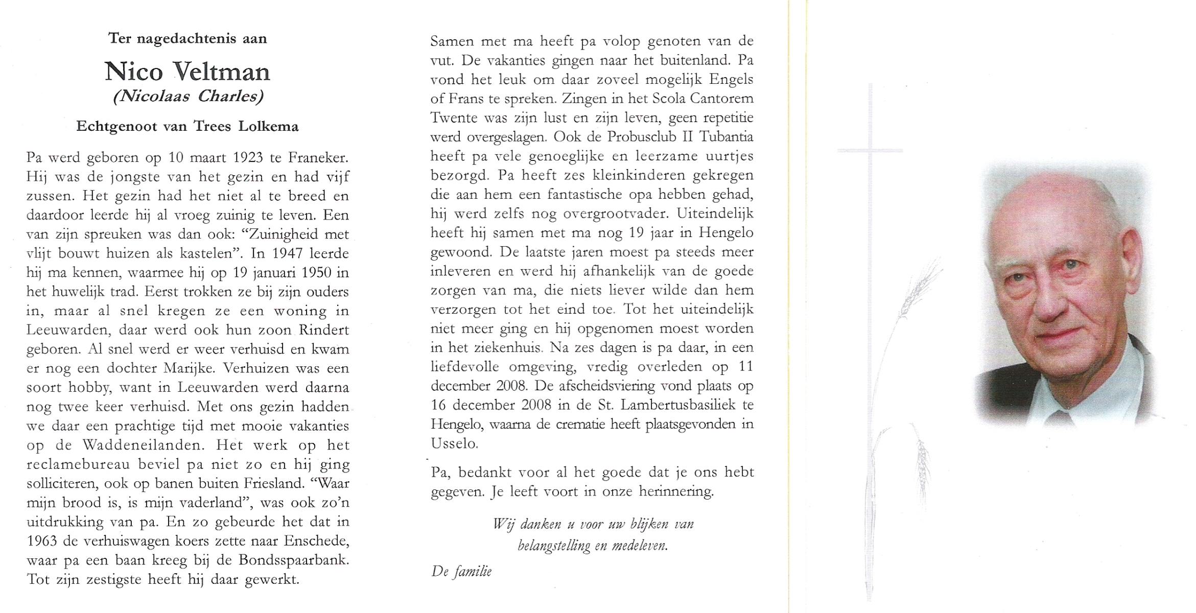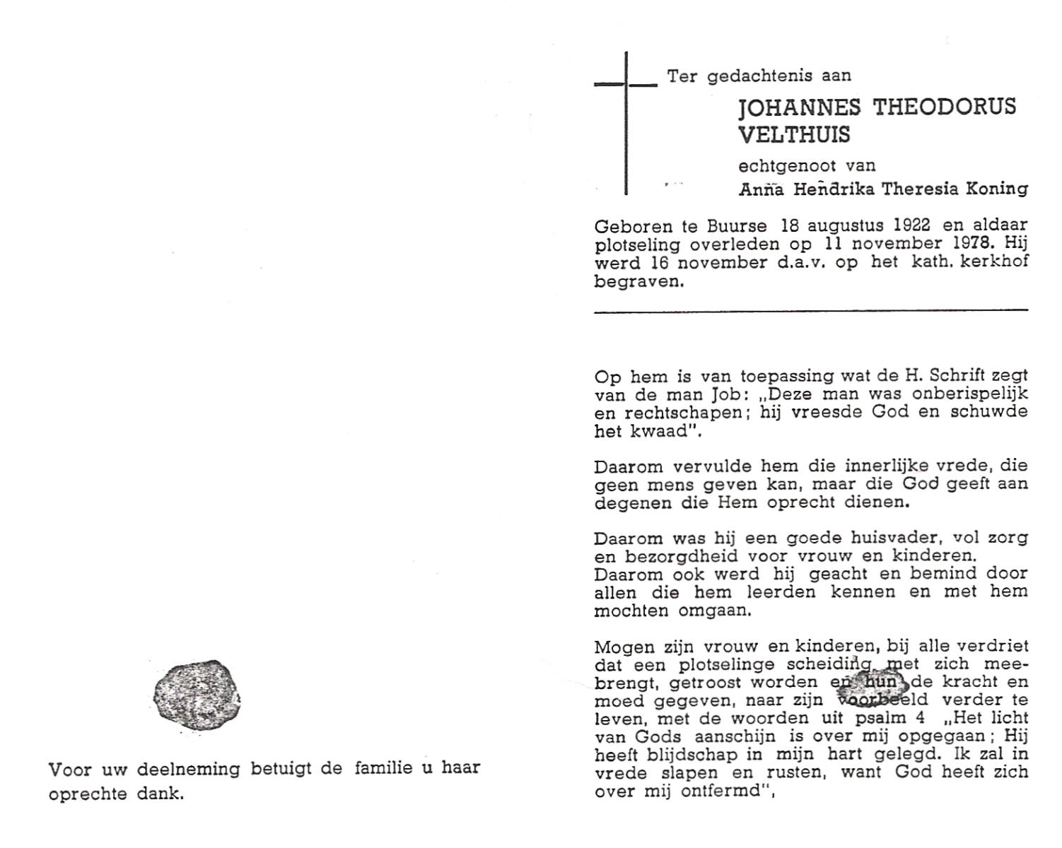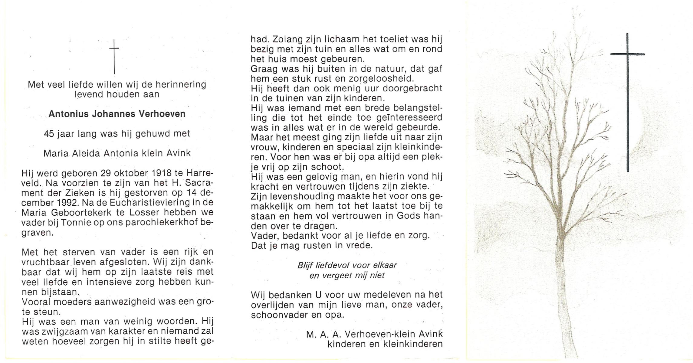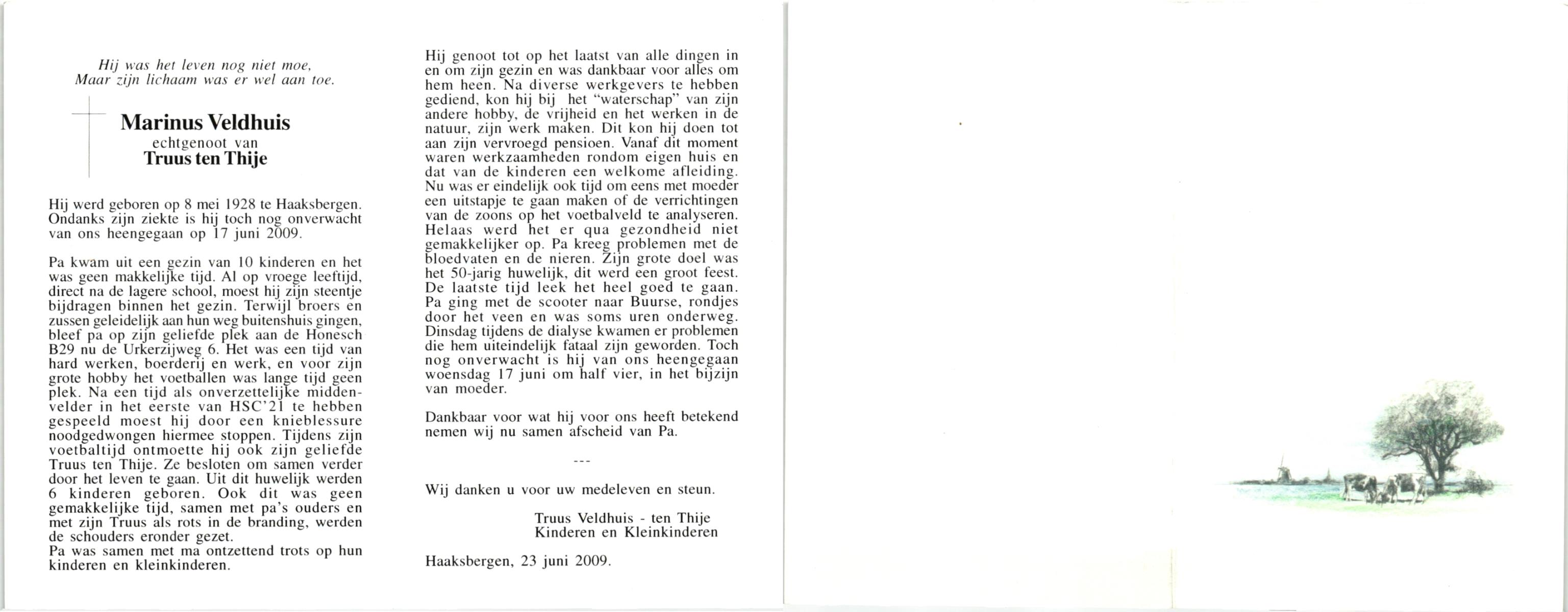 VELDHUIS, Antonius Bernardus, geboren op 4-10-1913 te Mander, overleden op 14-3-1989 te Almelo, ziekenhuis op 75-jarige leeftijd, begraven op 18-3-1989 te Geesteren.