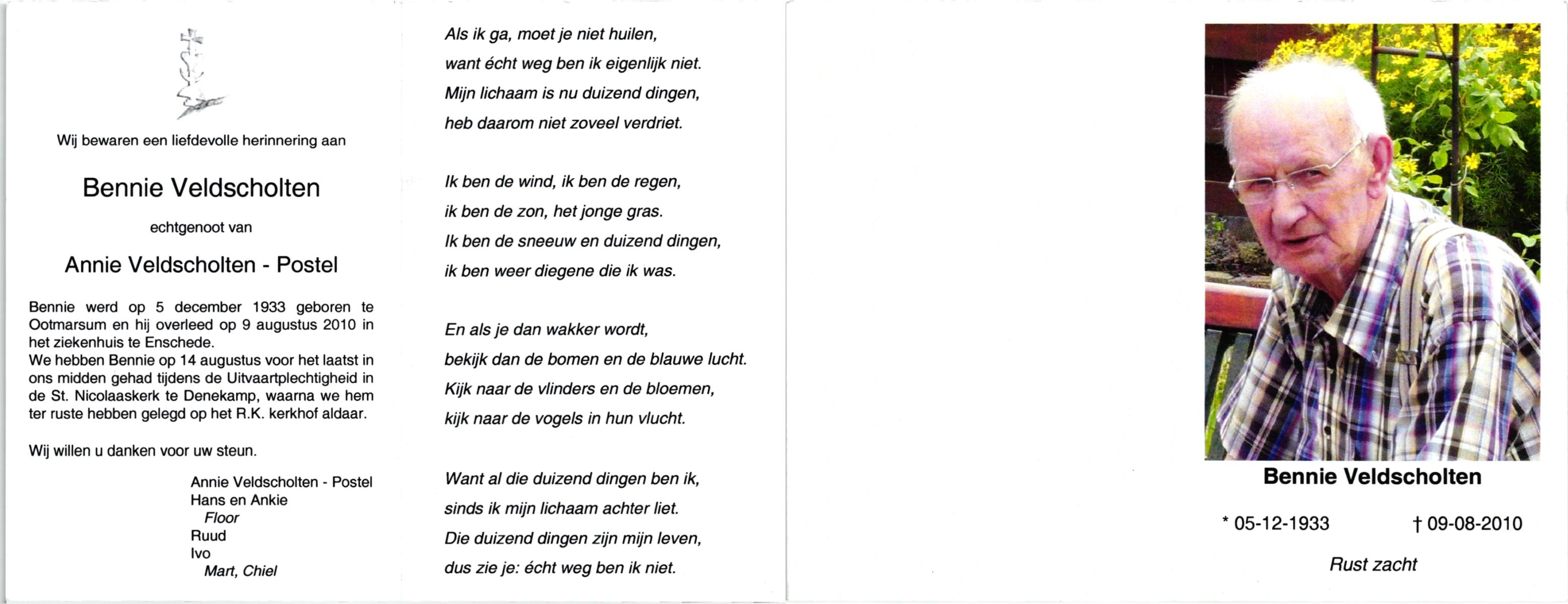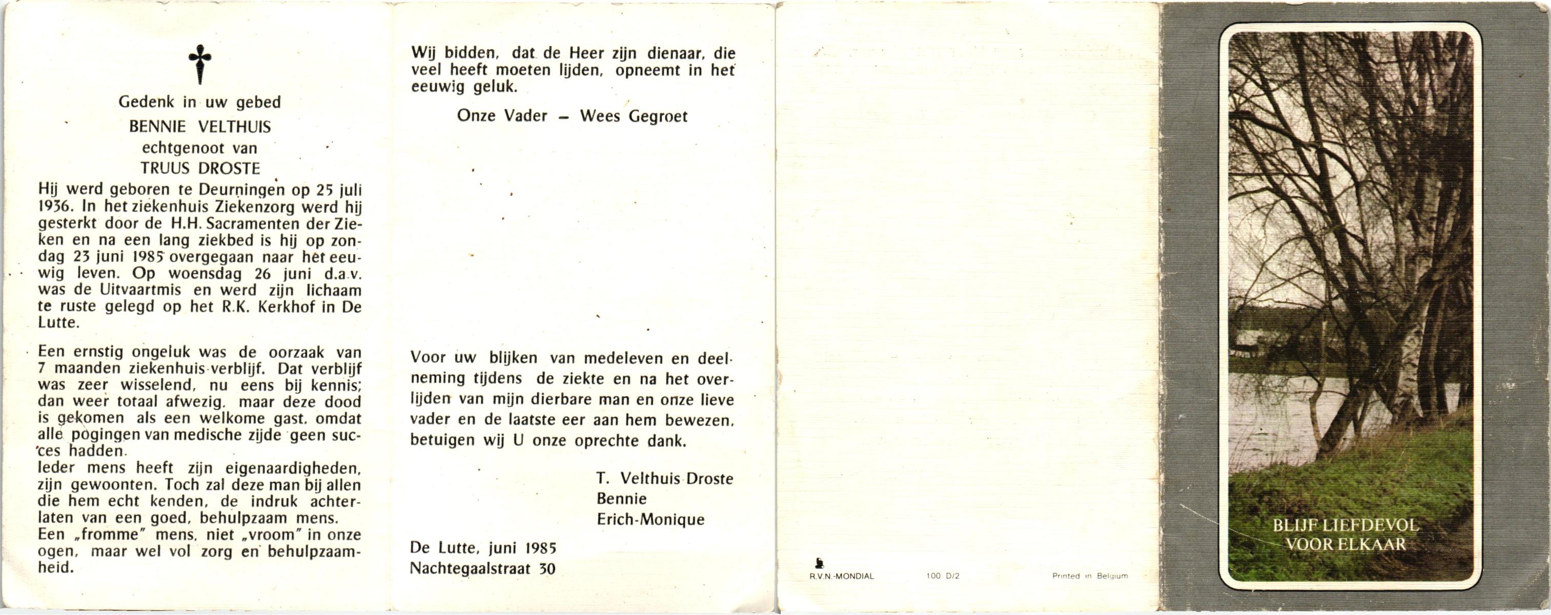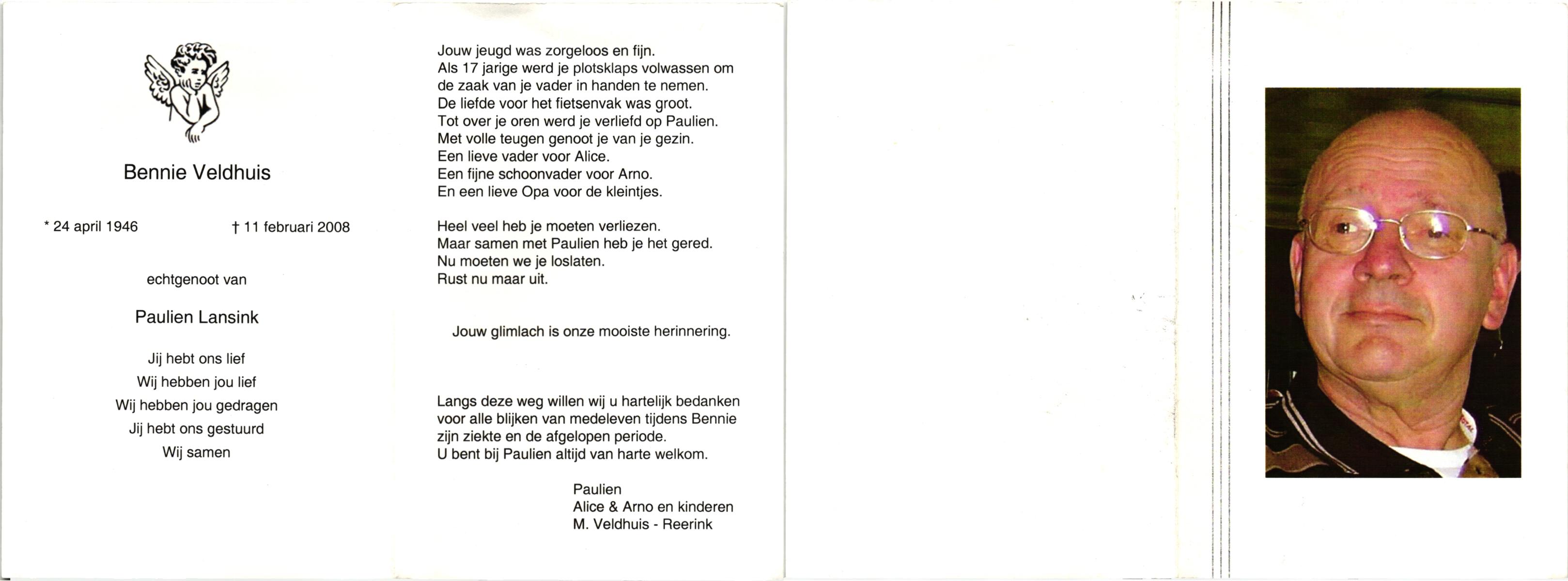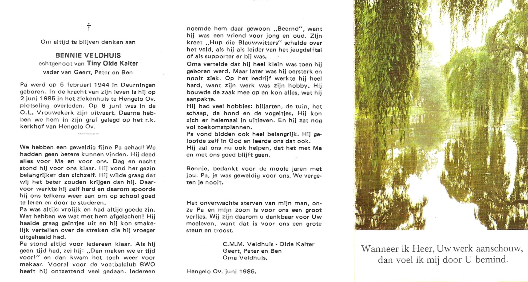 VELDHUIS, Bennie, geboren op 5-2-1944 te Deurningen, overleden op 2-6-1985 te Hengelo (Ov.) op 41-jarige leeftijd, begraven op 6-6-1985 te Hengelo (Ov.).
