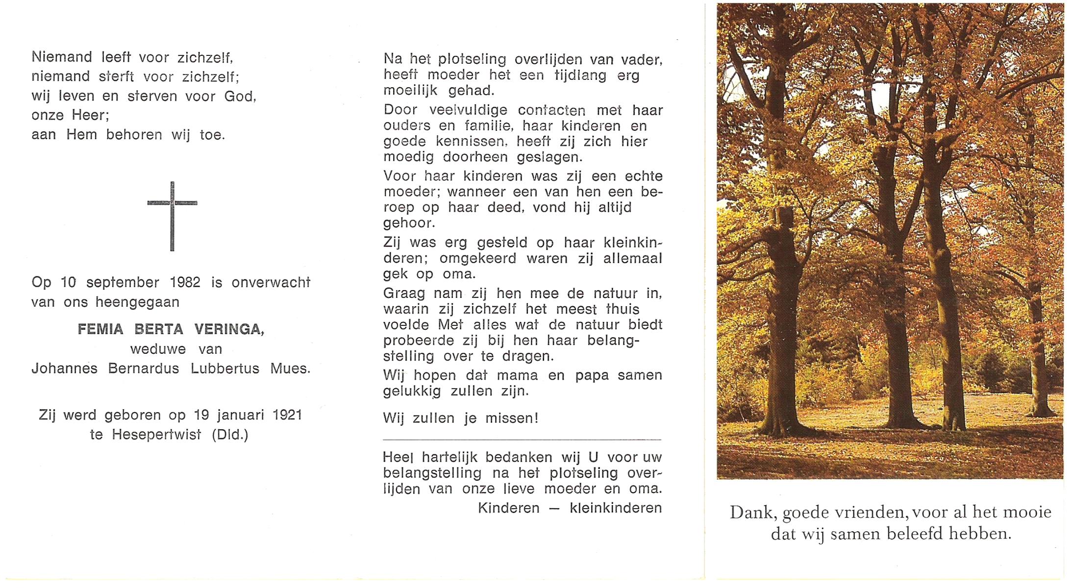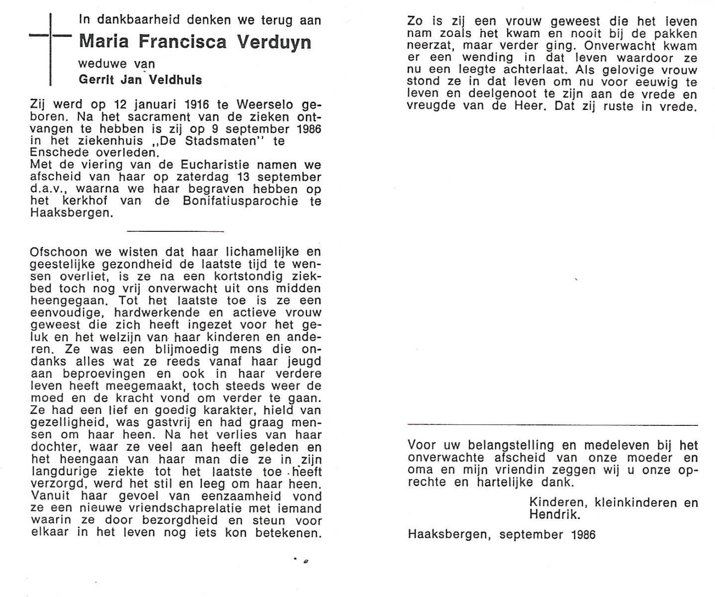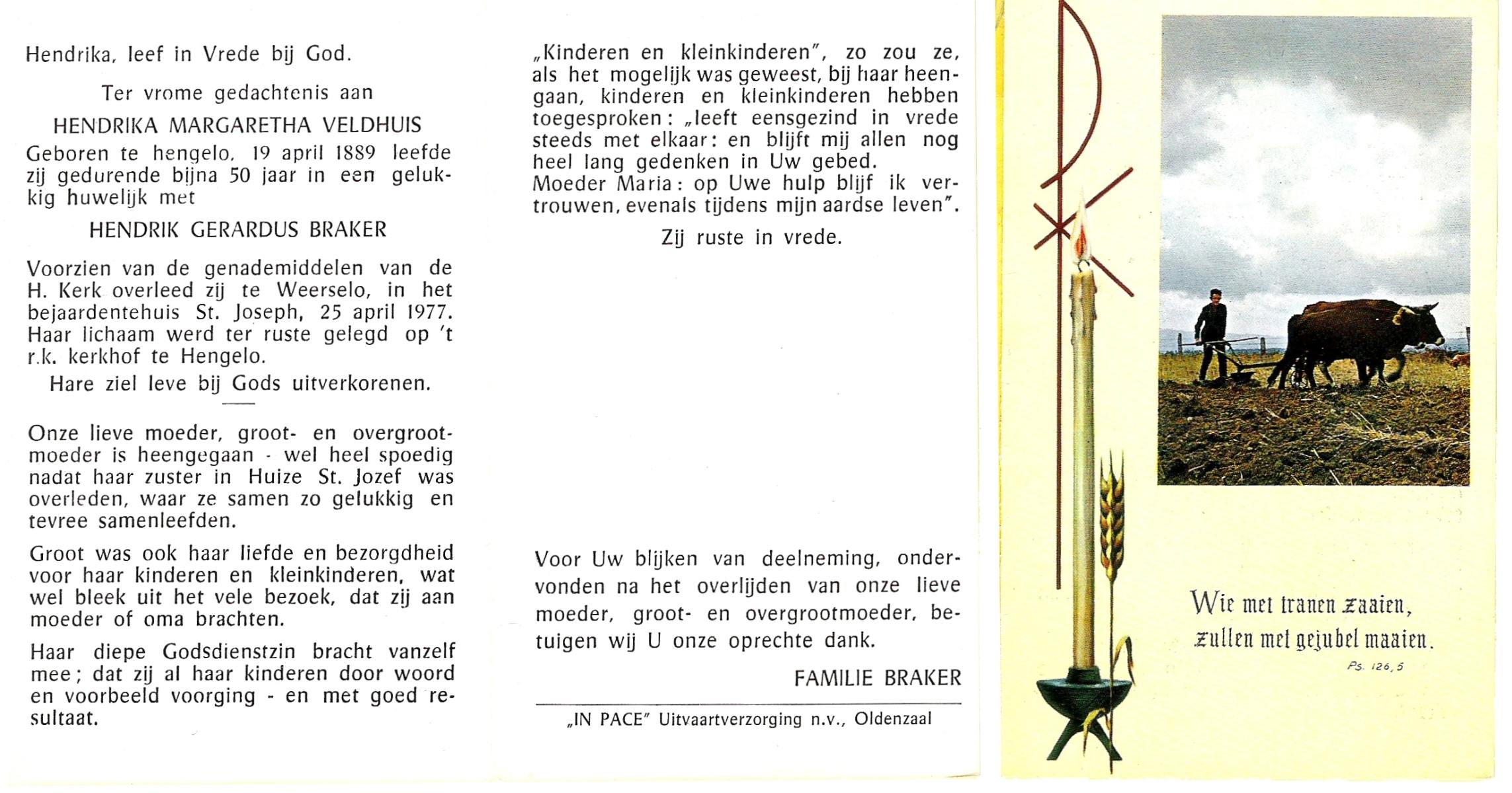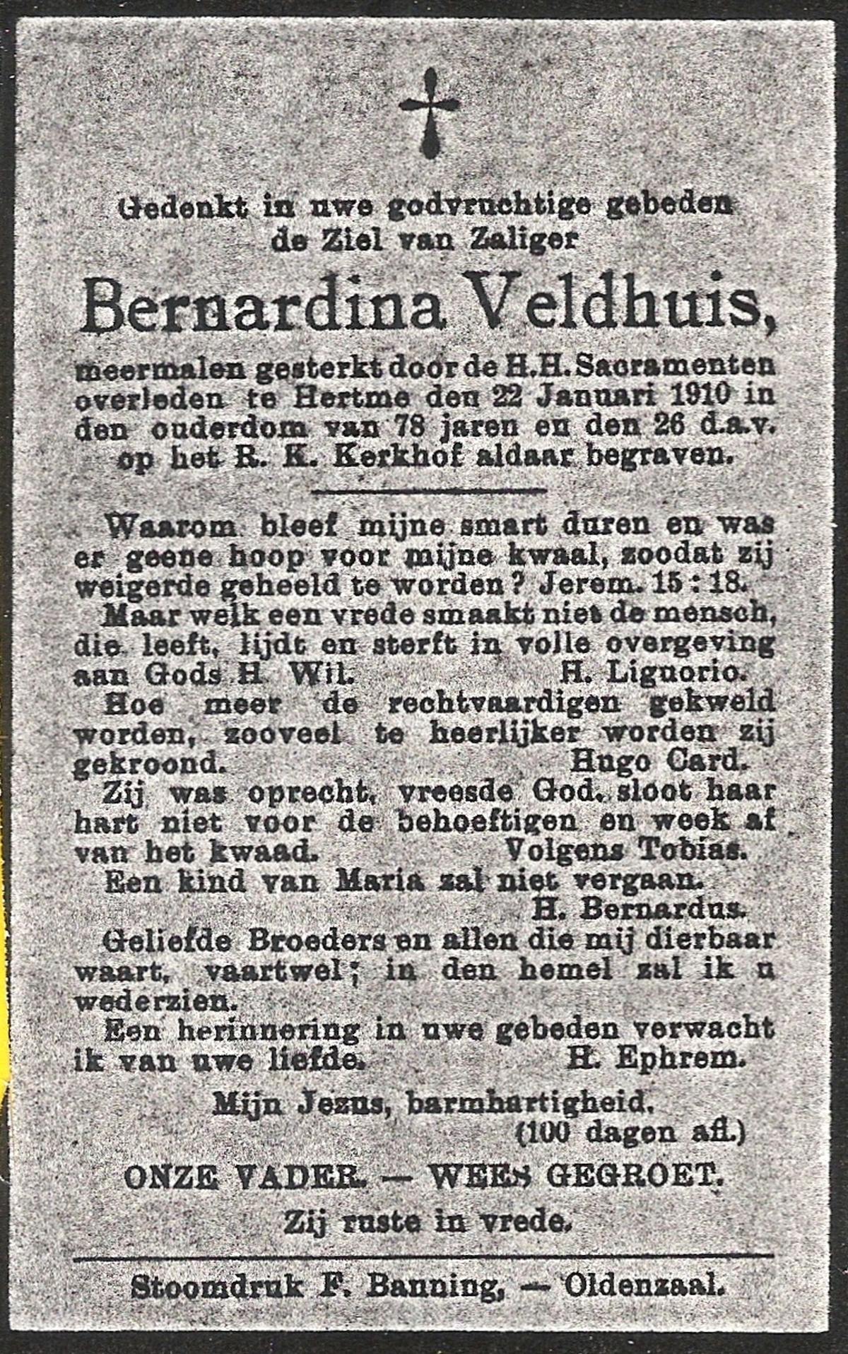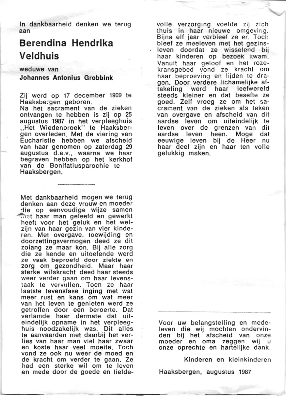 VELDHUIS, Berendina Hendrika, geboren op 17-12-1909 te Haaksbergen, overleden op 25-8-1987 te Haaksbergen op 77-jarige leeftijd, begraven op 29-8-1987 te Haaksbergen.