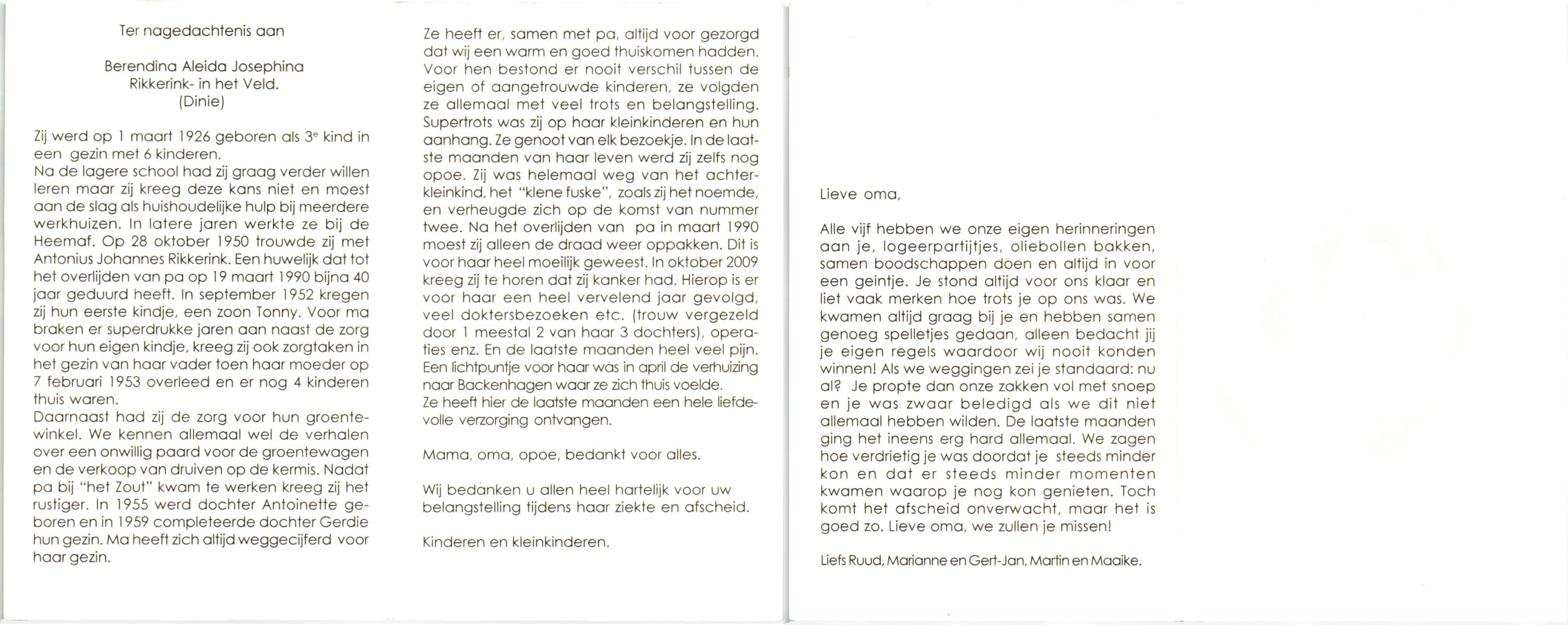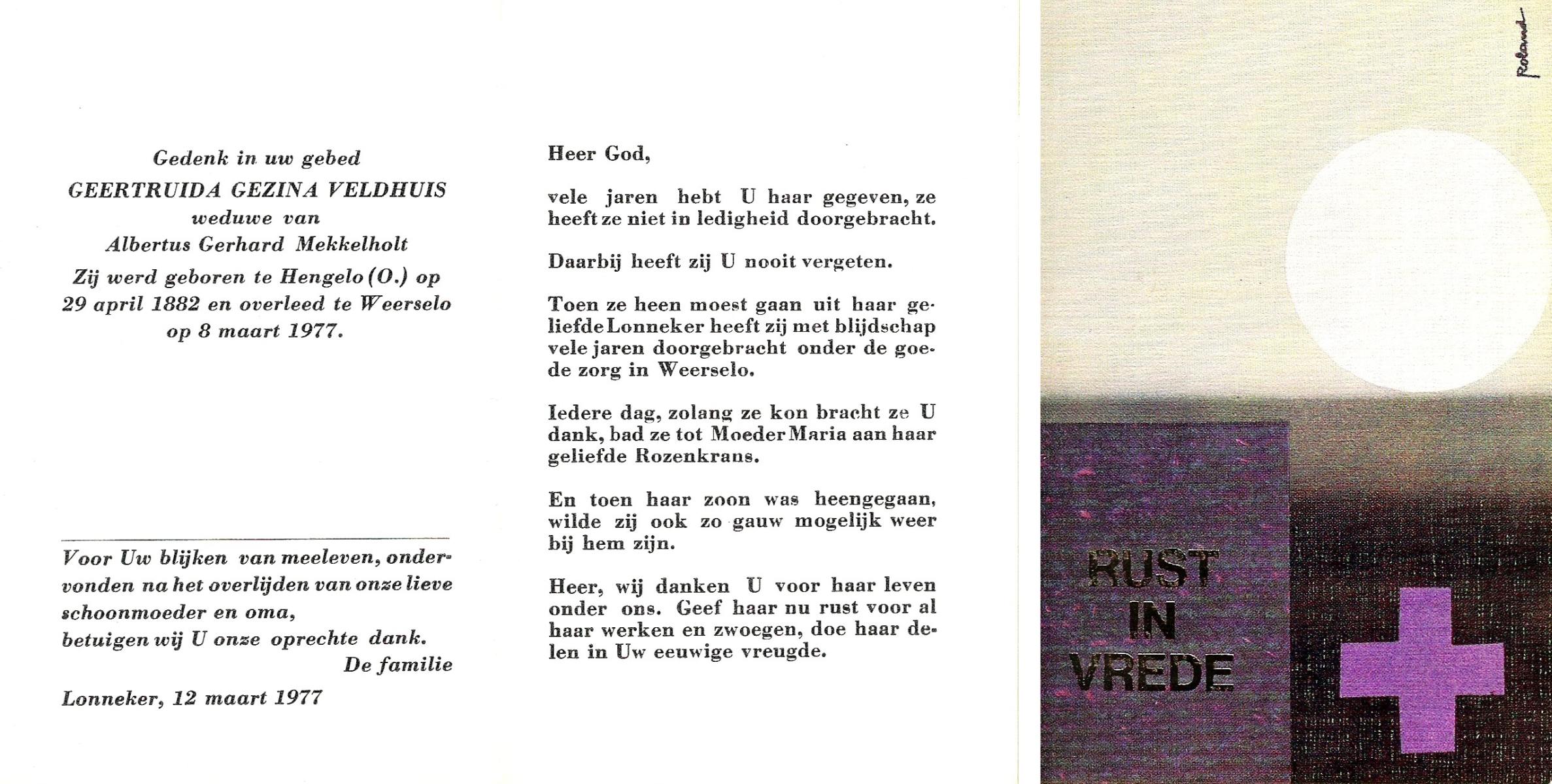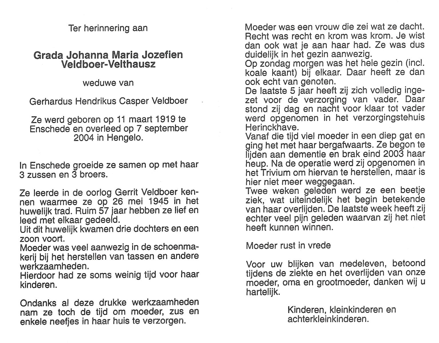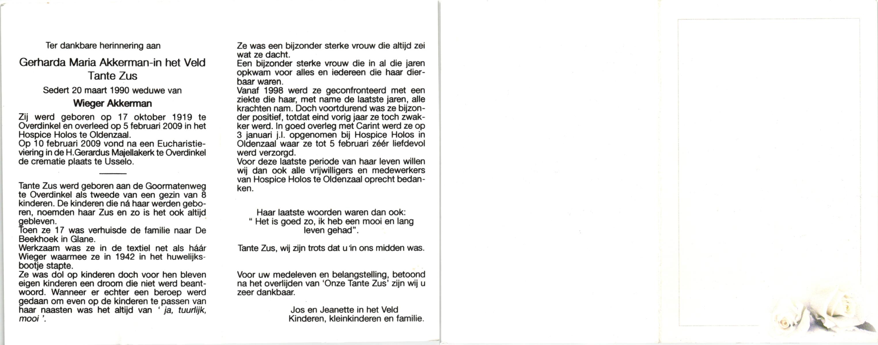 VELD, in het, Gerharda Maria, geboren op 17-10-1919 te Overdinkel, overleden op 5-2-2009 te Oldenzaal op 89-jarige leeftijd, gecremeerd op 10-2-2009 te Usselo.