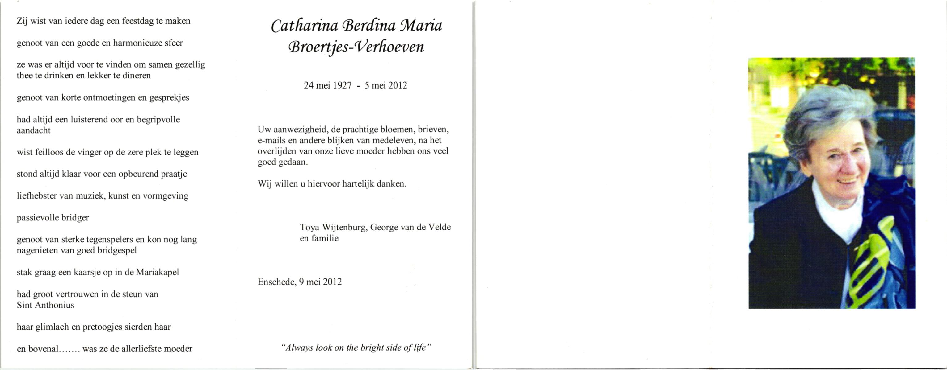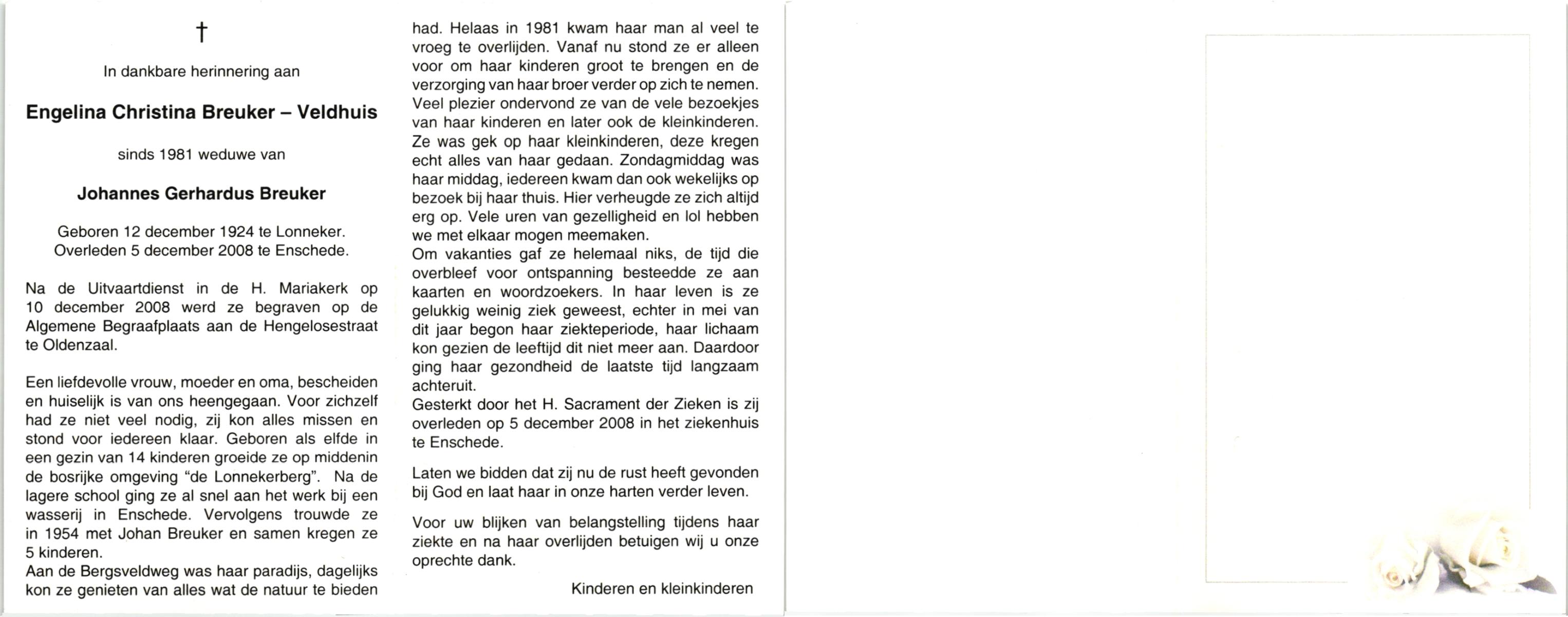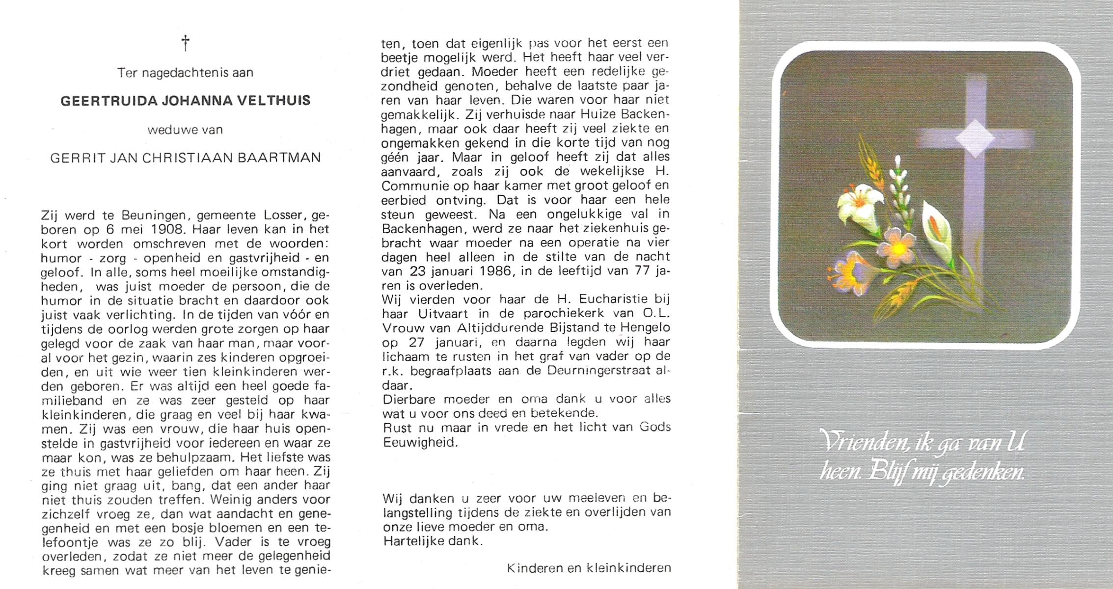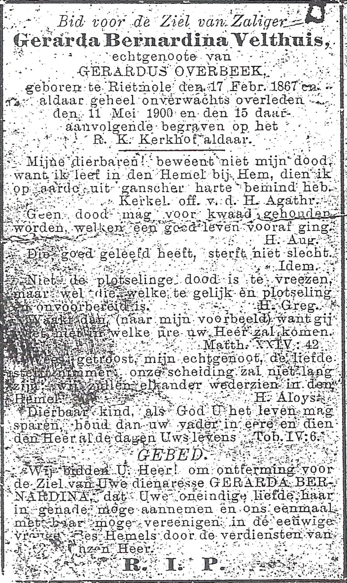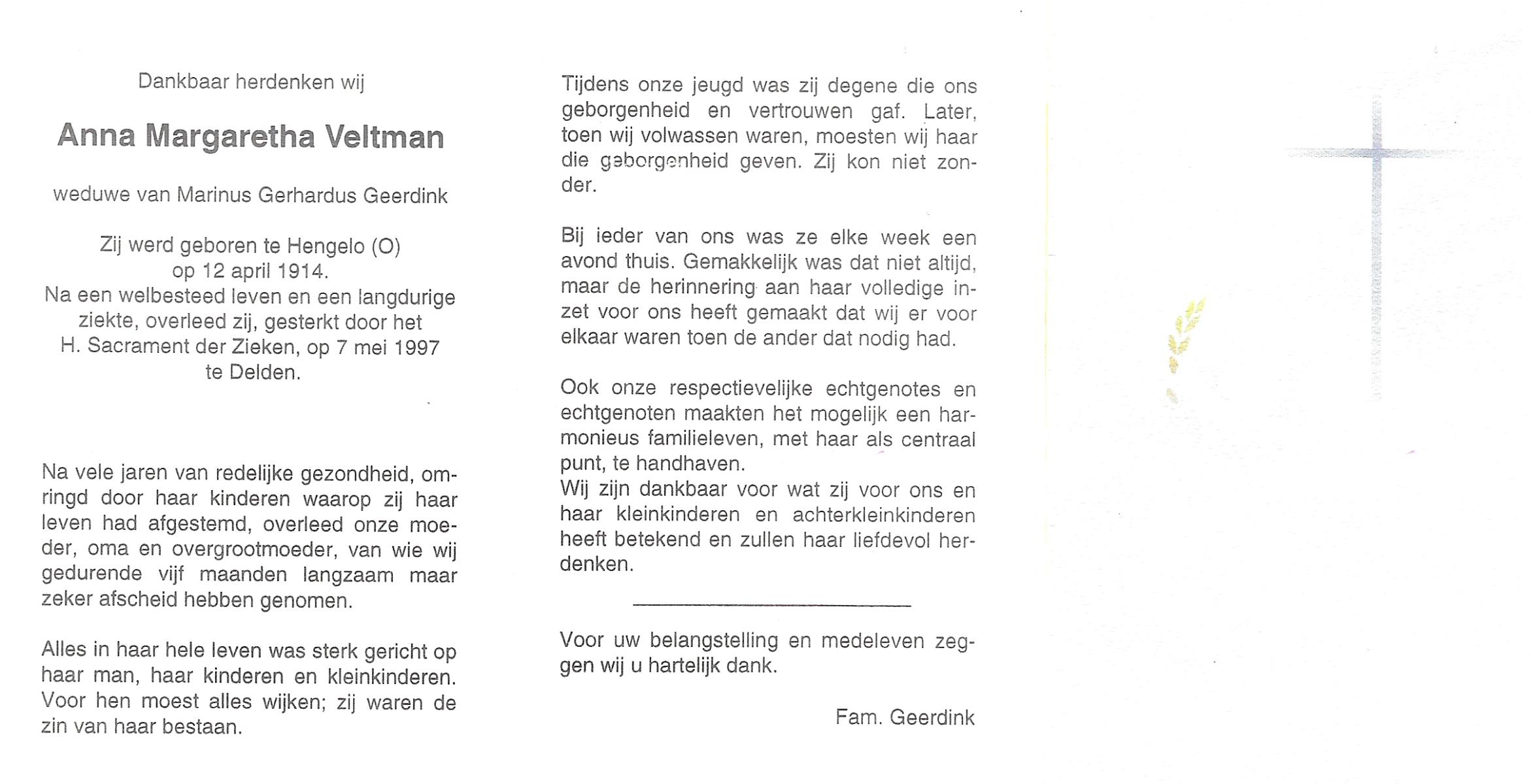 VELD, in het, Gerharda Maria, geboren op 17-10-1919 te Overdinkel, overleden op 5-2-2009 te Oldenzaal op 89-jarige leeftijd, gecremeerd op 10-2-2009 te Usselo.