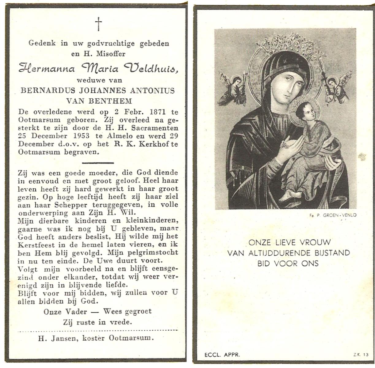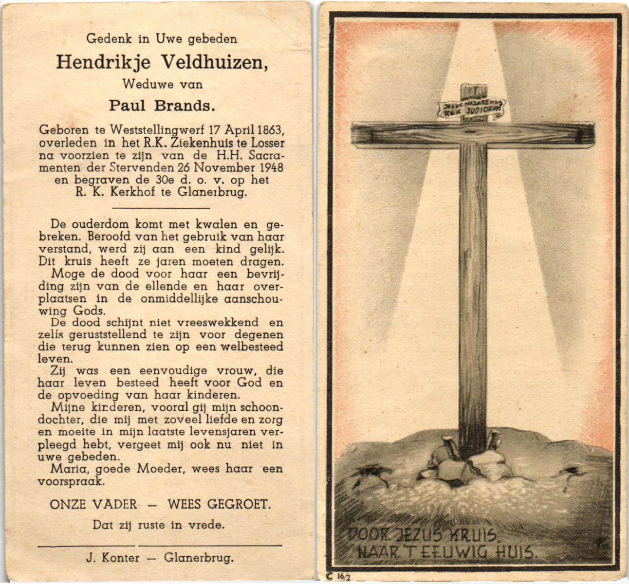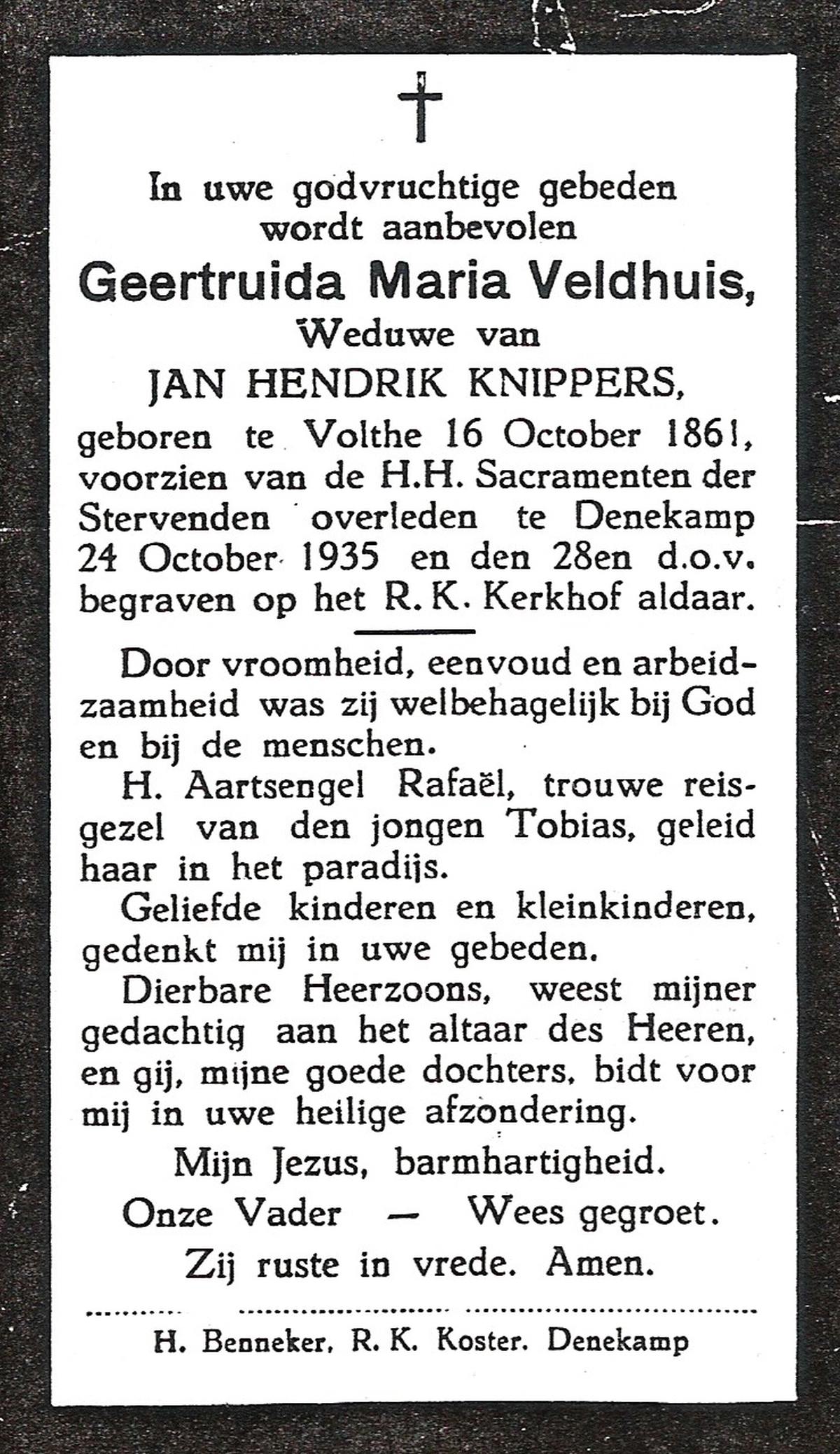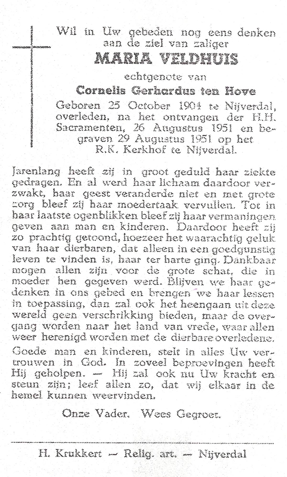VELD, in het, Maria, geboren op 11-12-1873 te Weerselo, overleden op 16-2-1951 te Nijmegen op 77-jarige leeftijd, begraven op 20-2-1951 te Glanerbrug.