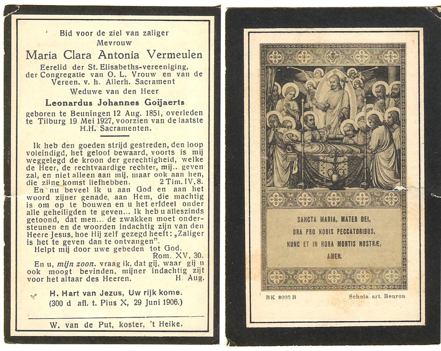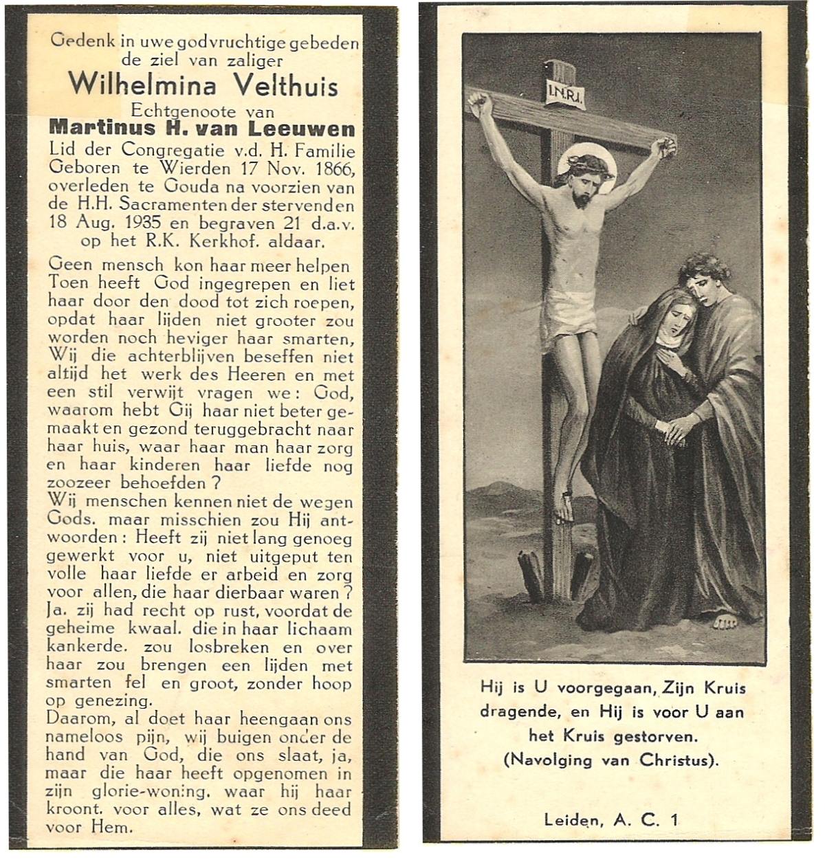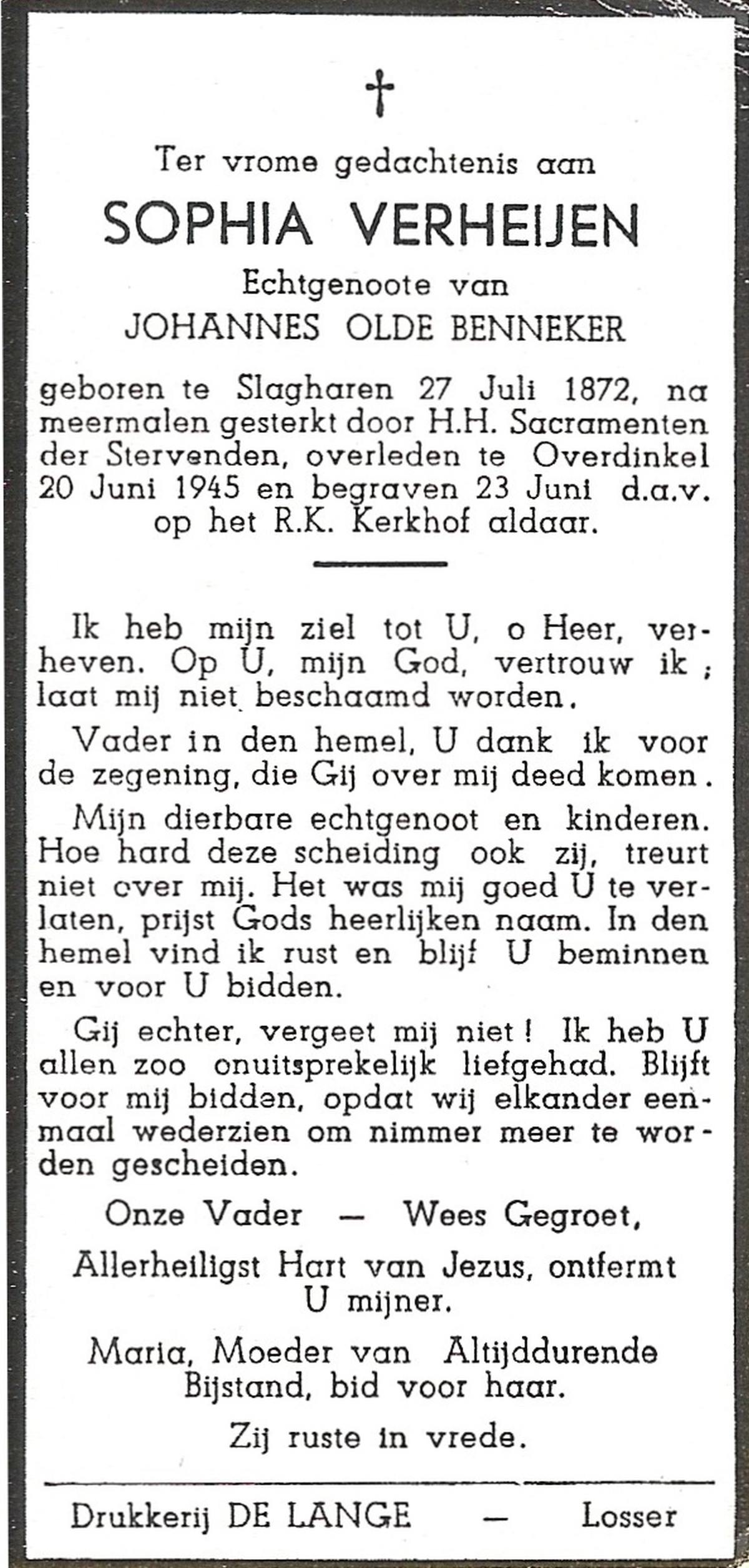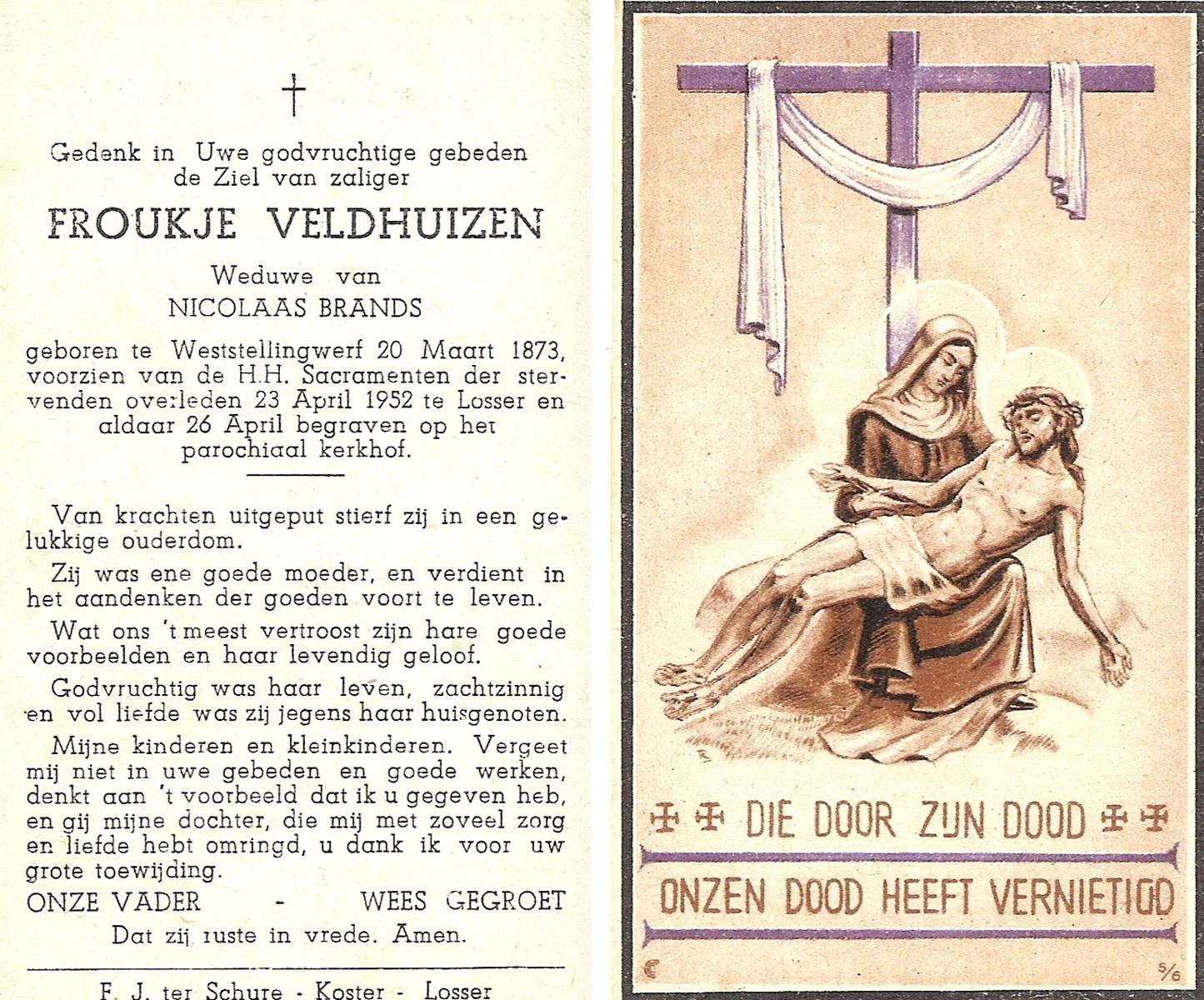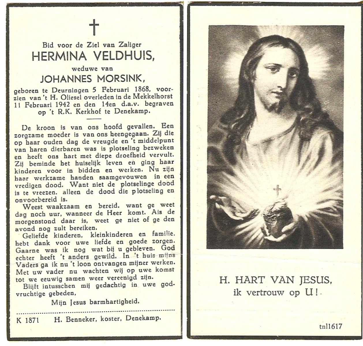 VELD, in het, Maria, geboren op 11-12-1873 te Weerselo, overleden op 16-2-1951 te Nijmegen op 77-jarige leeftijd, begraven op 20-2-1951 te Glanerbrug.