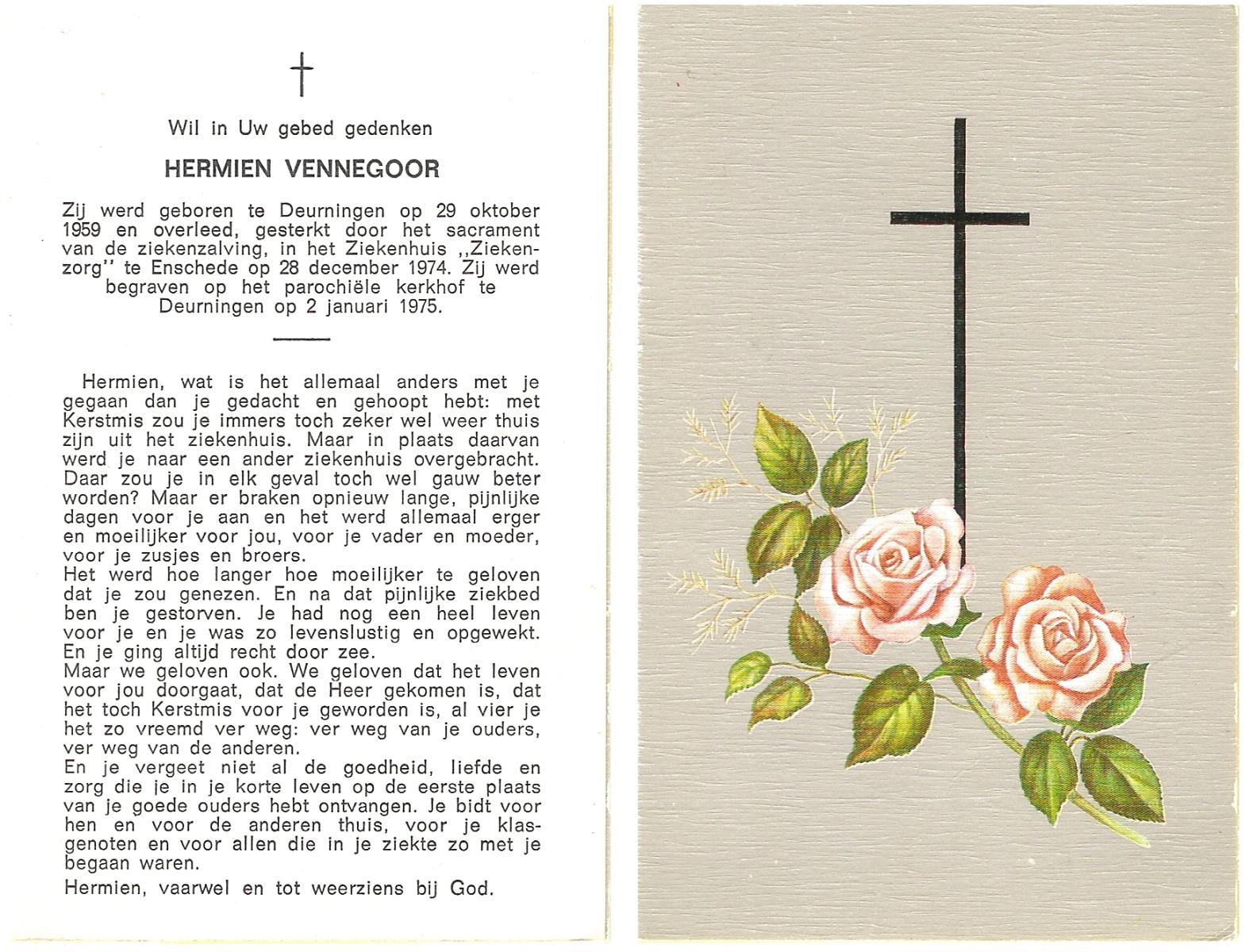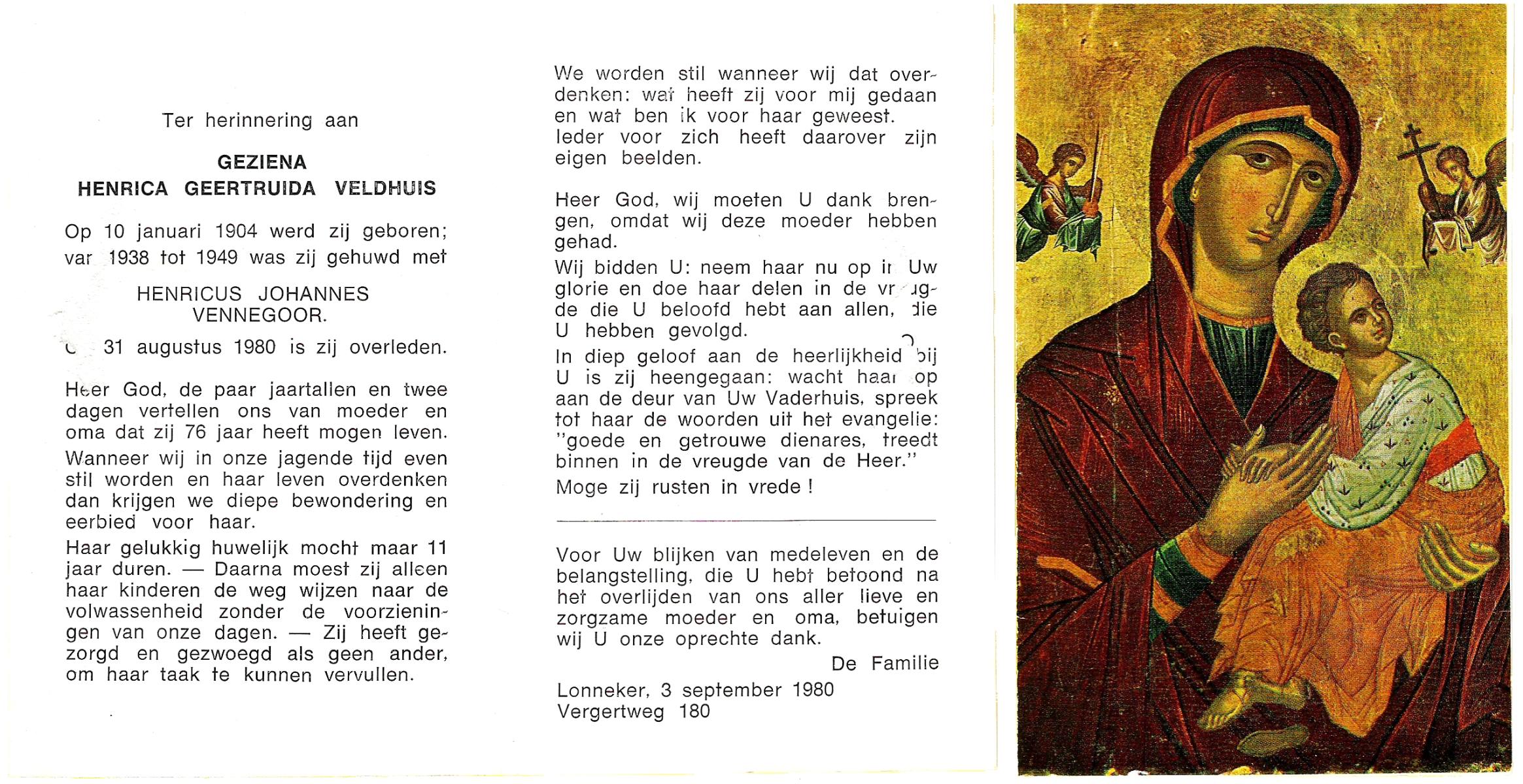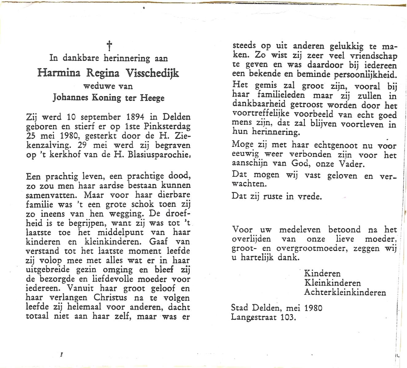 VISSCHEDIJK, Harmina Regina, geboren op 10-09-1894 te Delden, overleden op 25-5-1980 te Delden op 85-jarige leeftijd, begraven op 29-5-1980 te Delden.