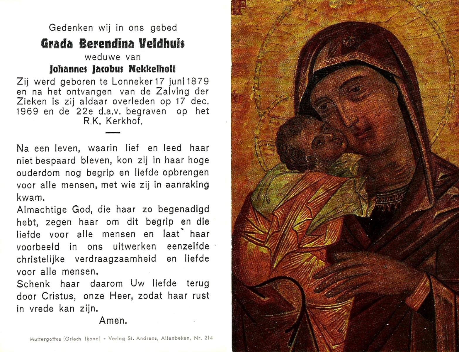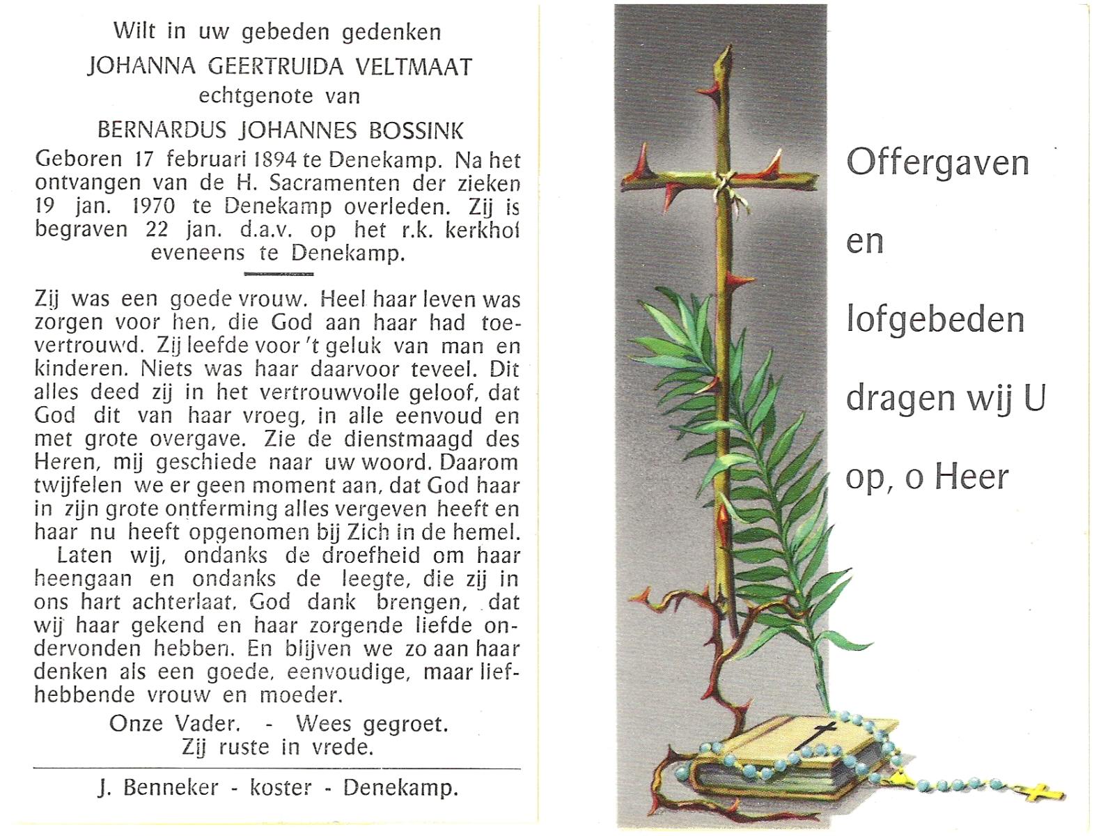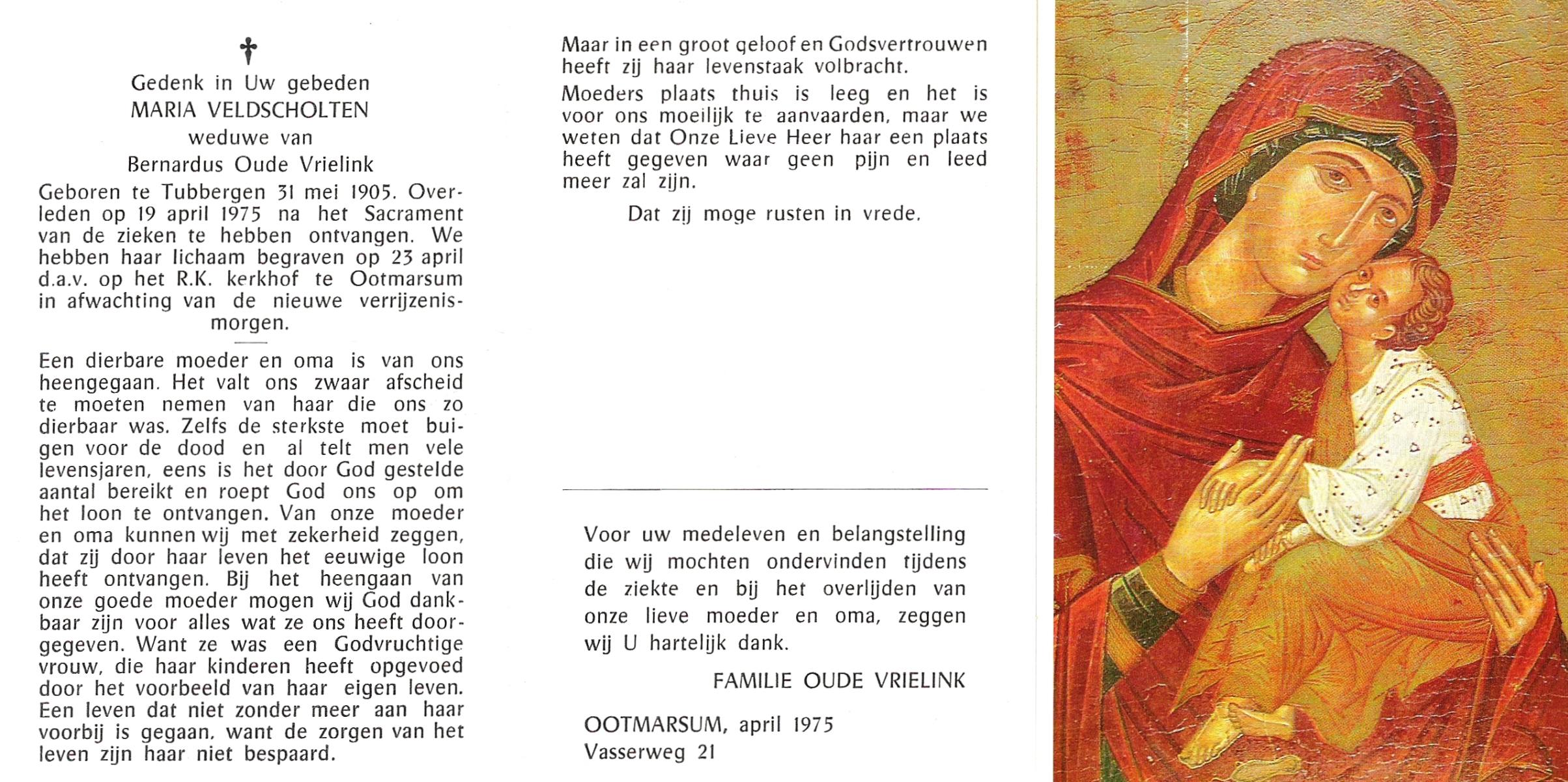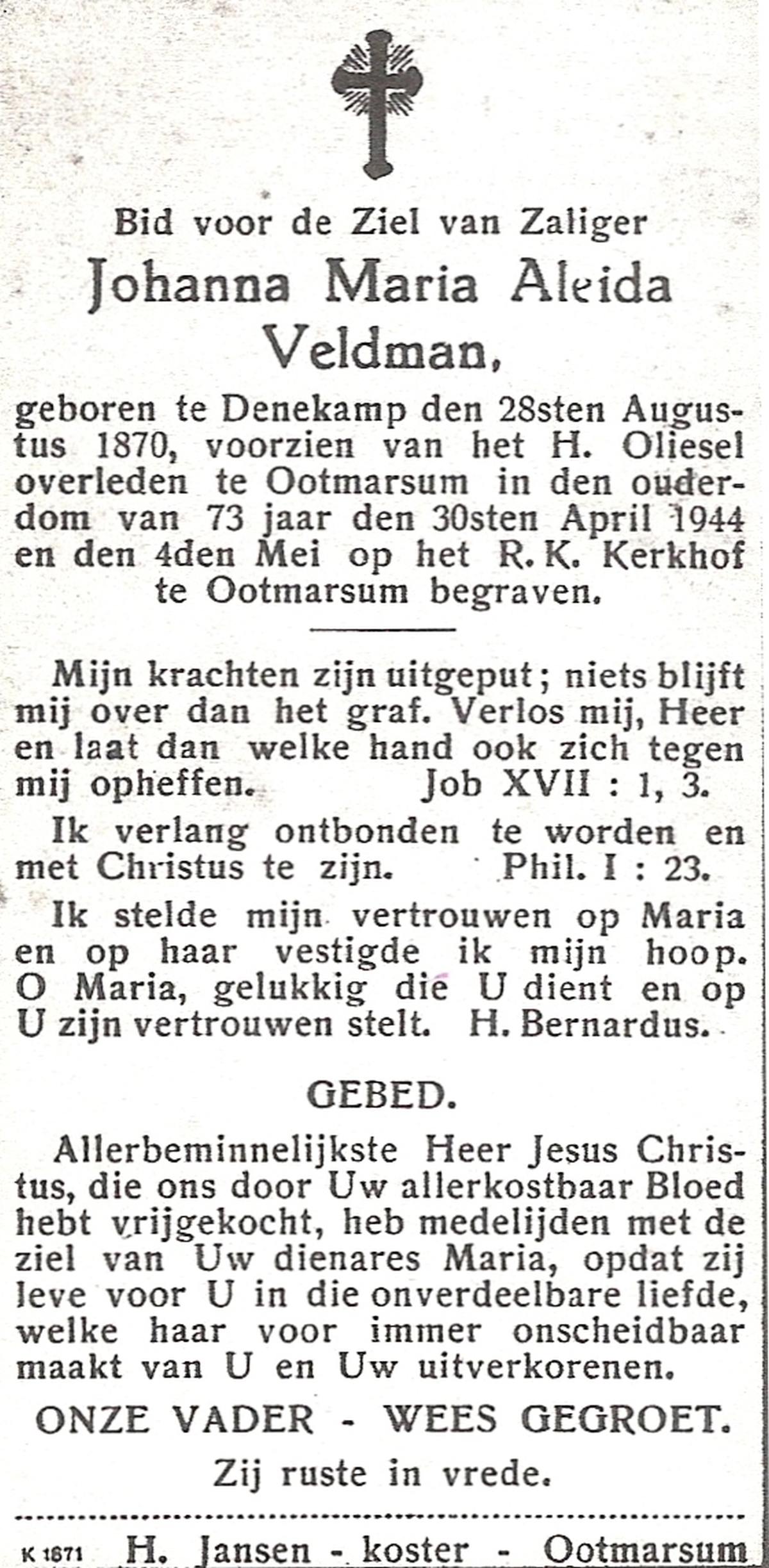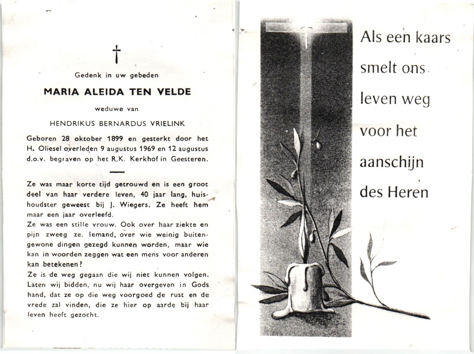 VELDE, ten, Maria Aleida, geboren op 28-10-1899, overleden op 9-8-1969 te Geesteren op 69-jarige leeftijd, begraven op 12-8-1969 te Geesteren.
