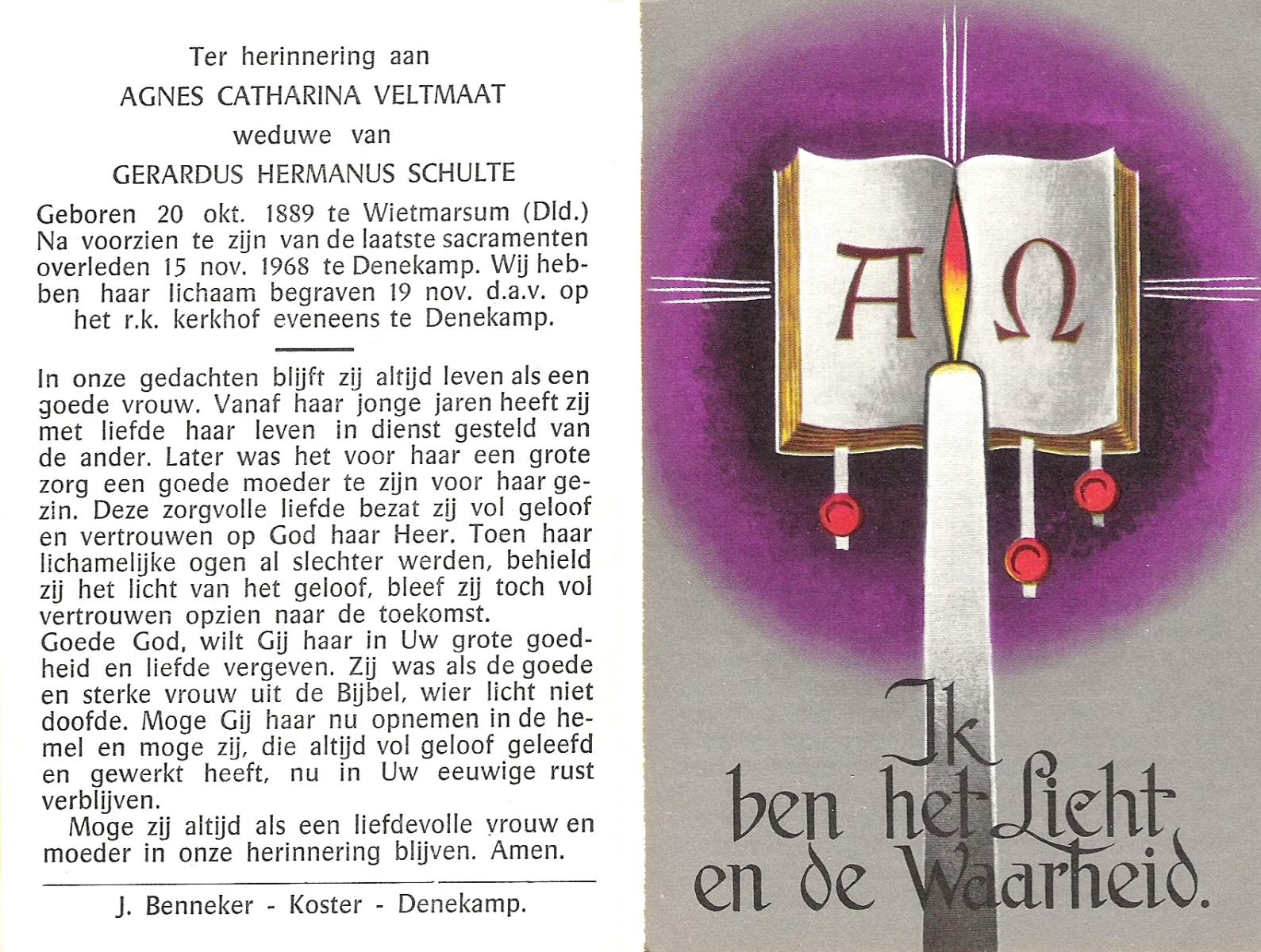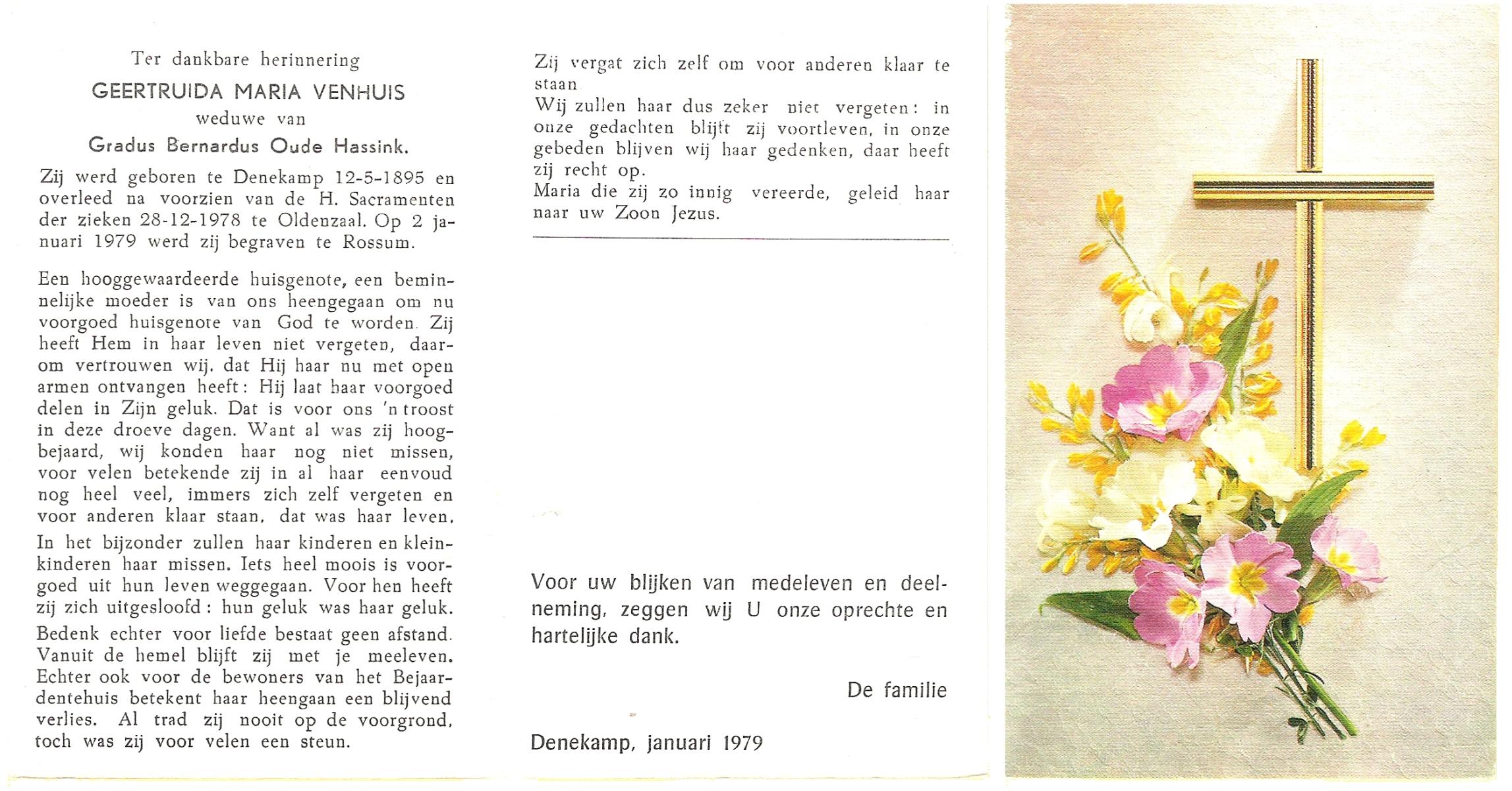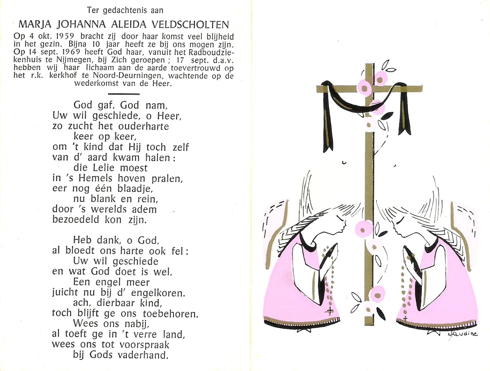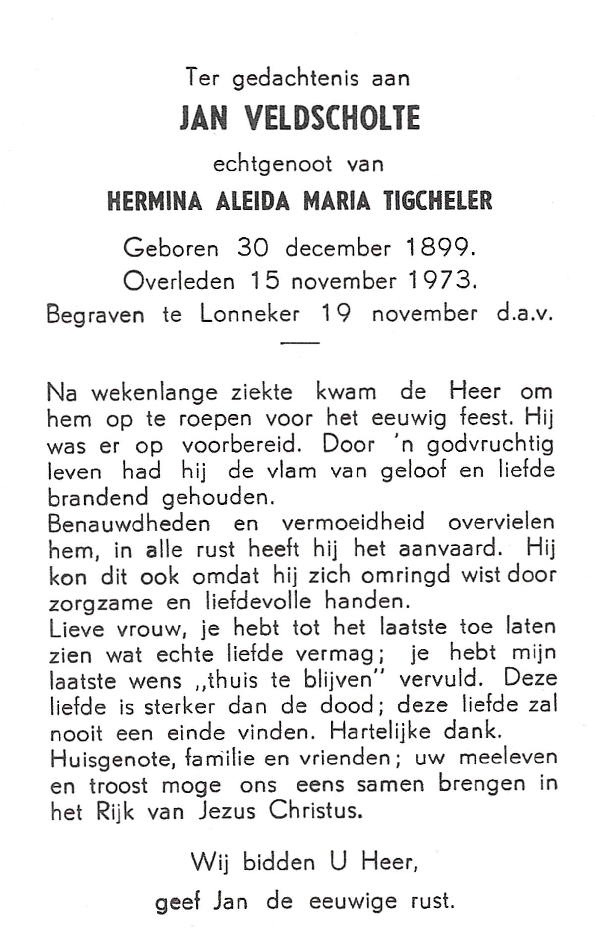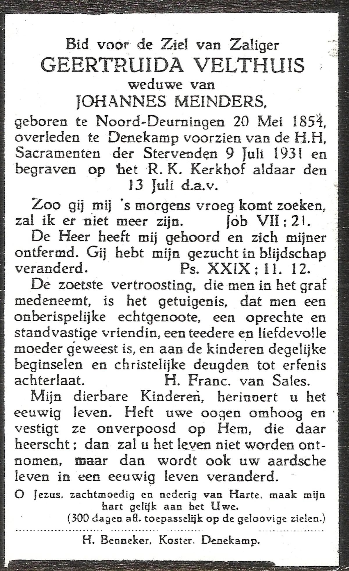 VELDE, ten, Maria Aleida, geboren op 28-10-1899, overleden op 9-8-1969 te Geesteren op 69-jarige leeftijd, begraven op 12-8-1969 te Geesteren.